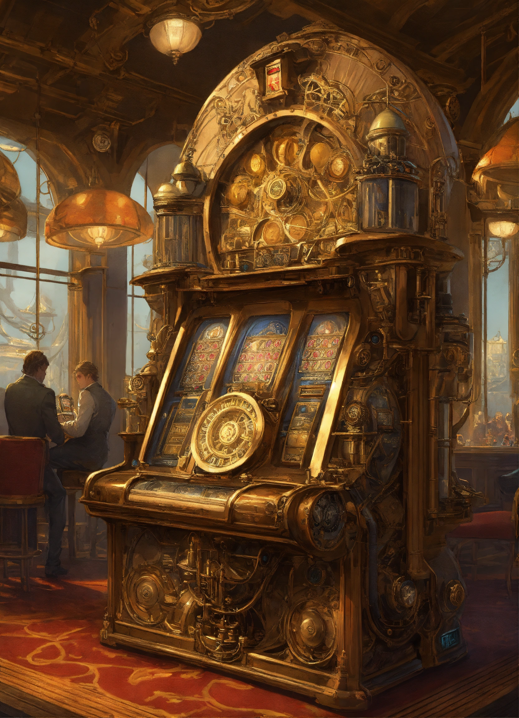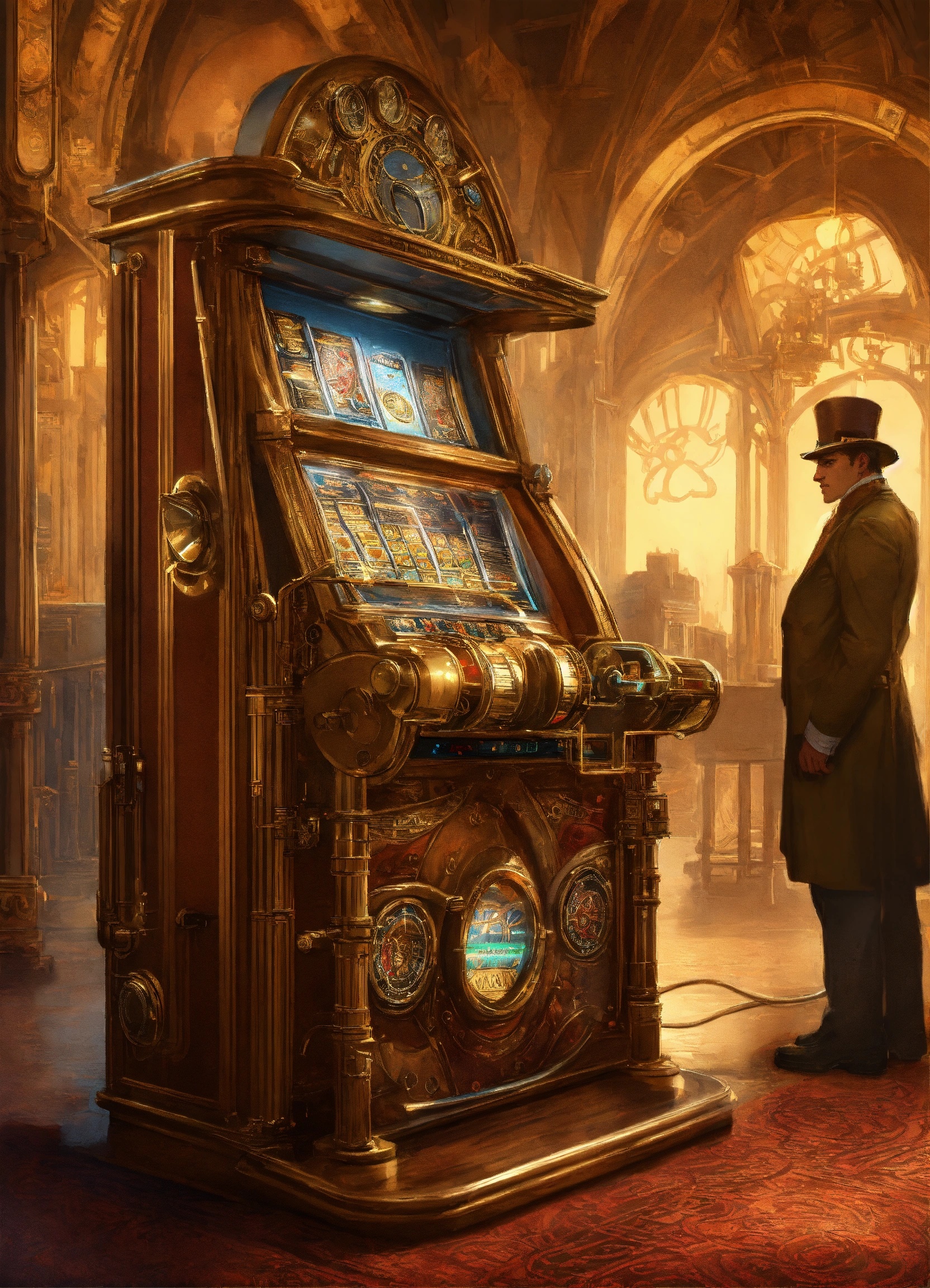 Steampunk casino slot machine, close view. concept art, intricate details, highly detailed by greg rutkowski, michael whelan, and gustave dore, alphonso mucha . full body, no hat, mystra