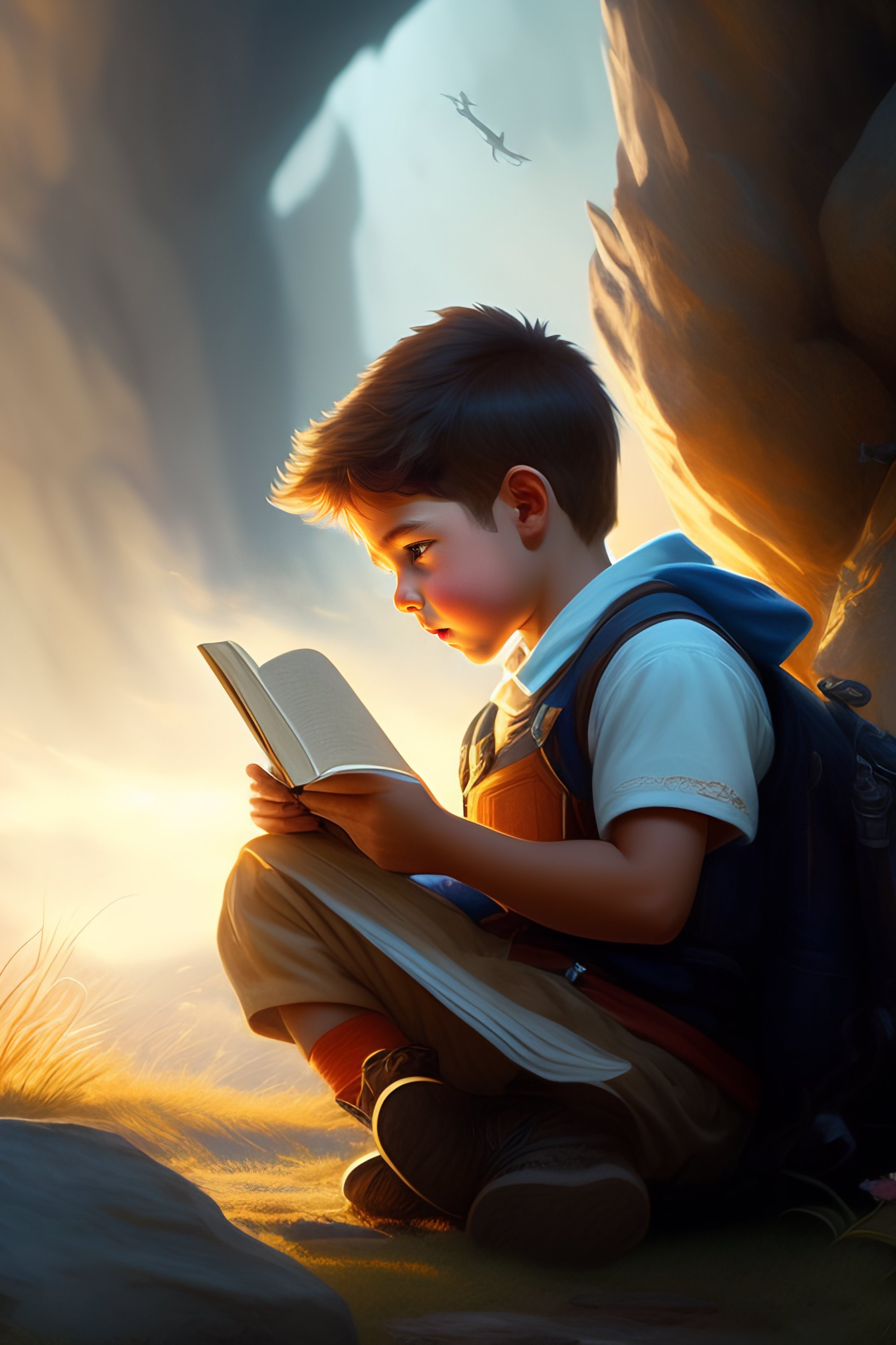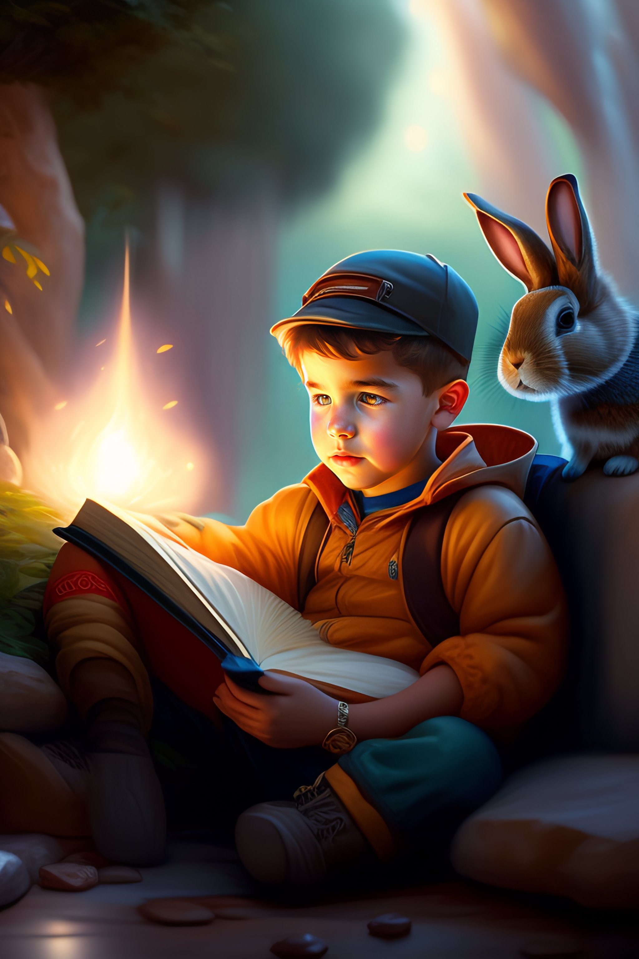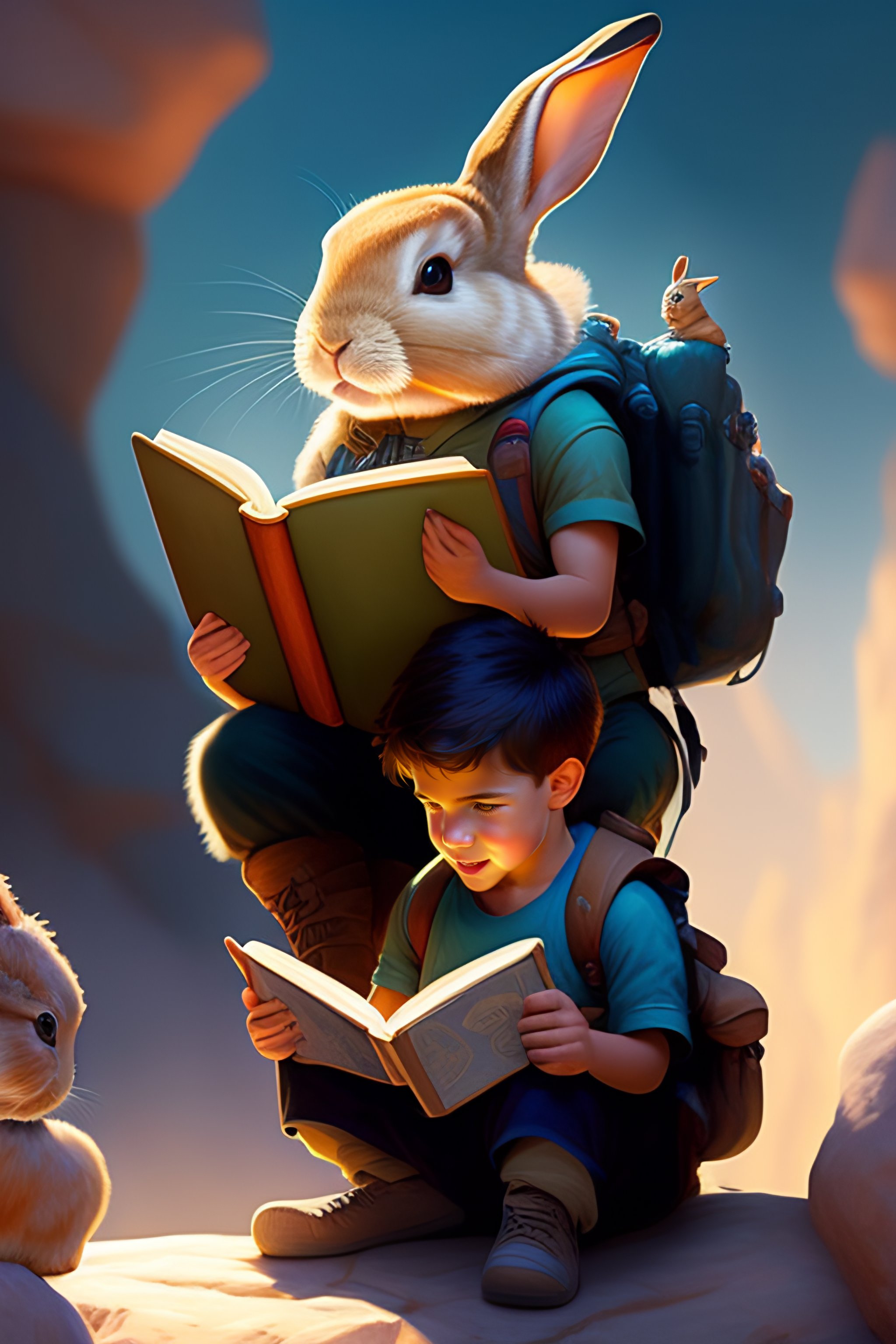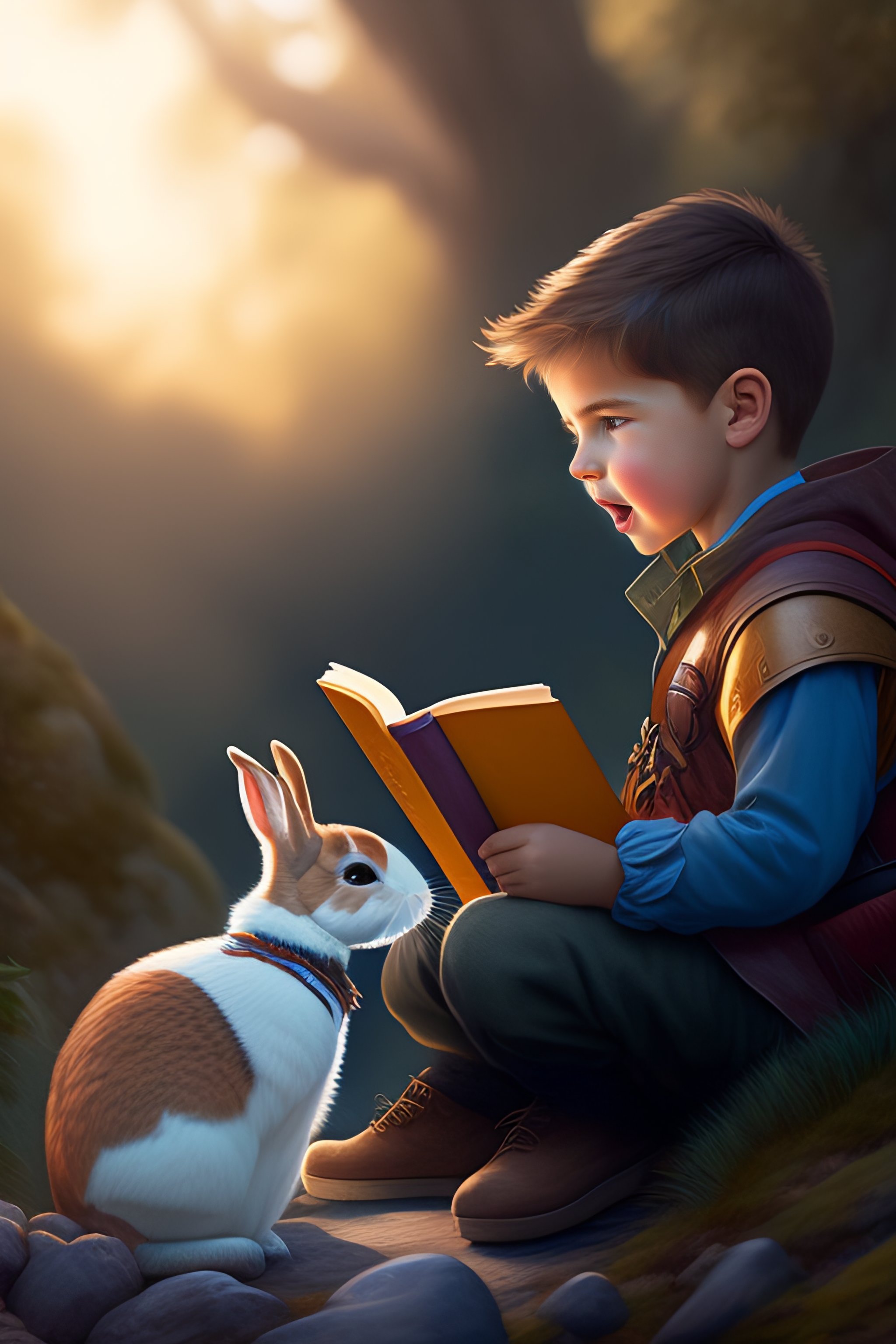 Boy reading a book to a rabbit, yelling at the camera, epic adventure, fantasy, magic, digital matte painting by steve henderson and mark brooks (and greg rutkowski), extremely detailed, artstation