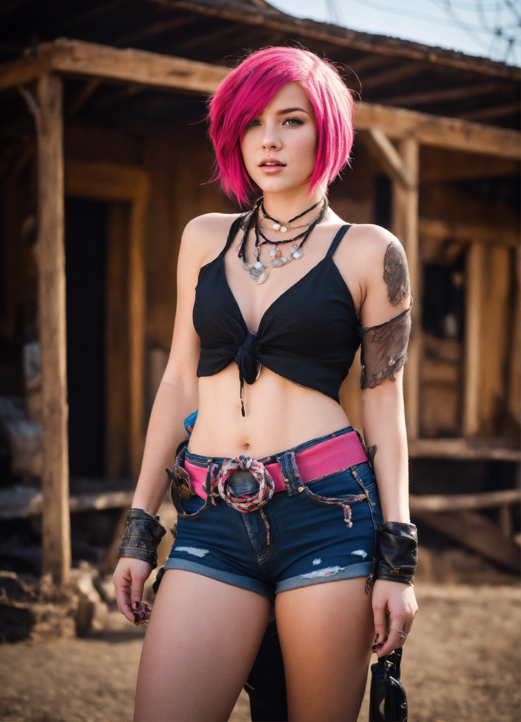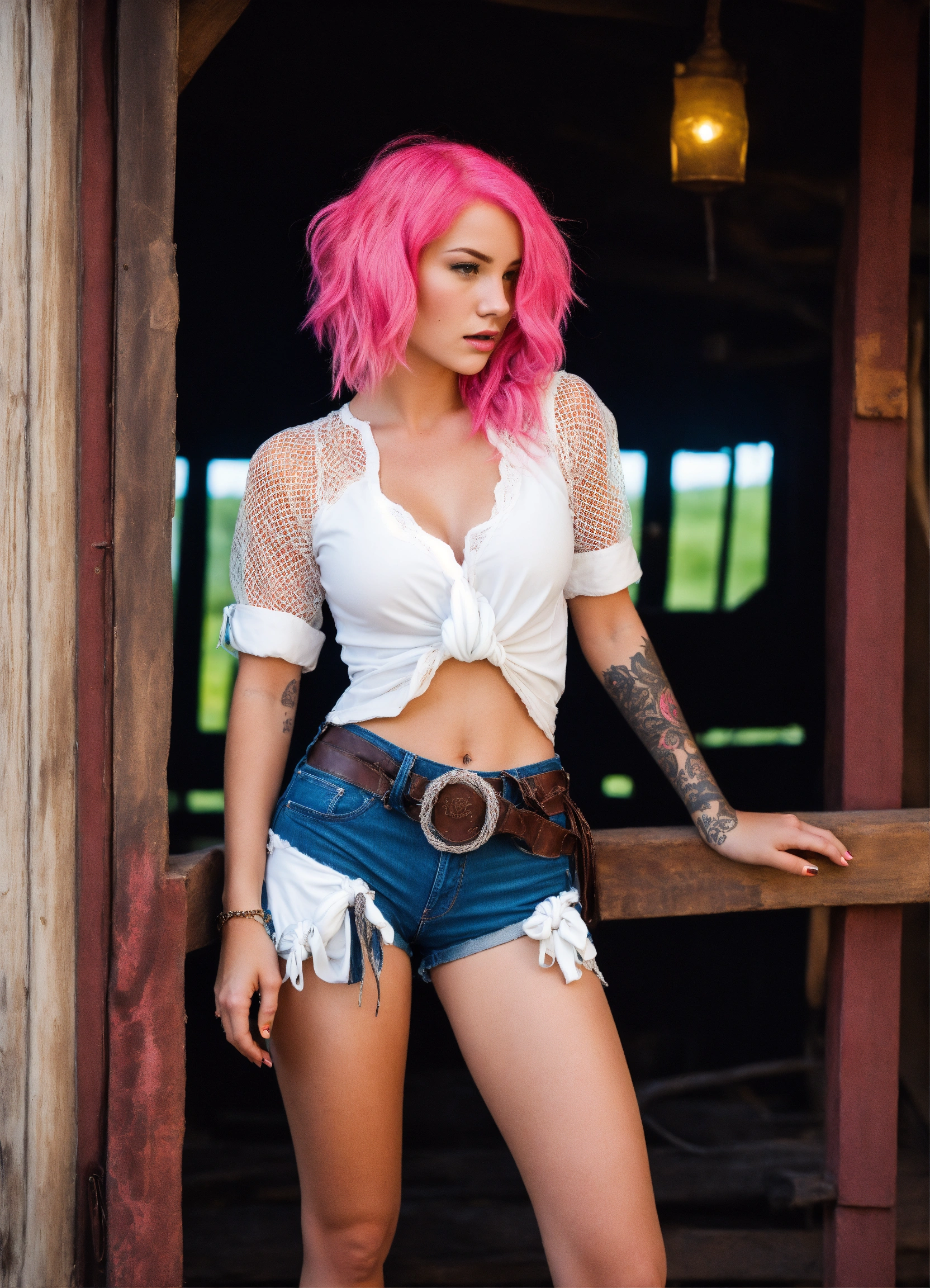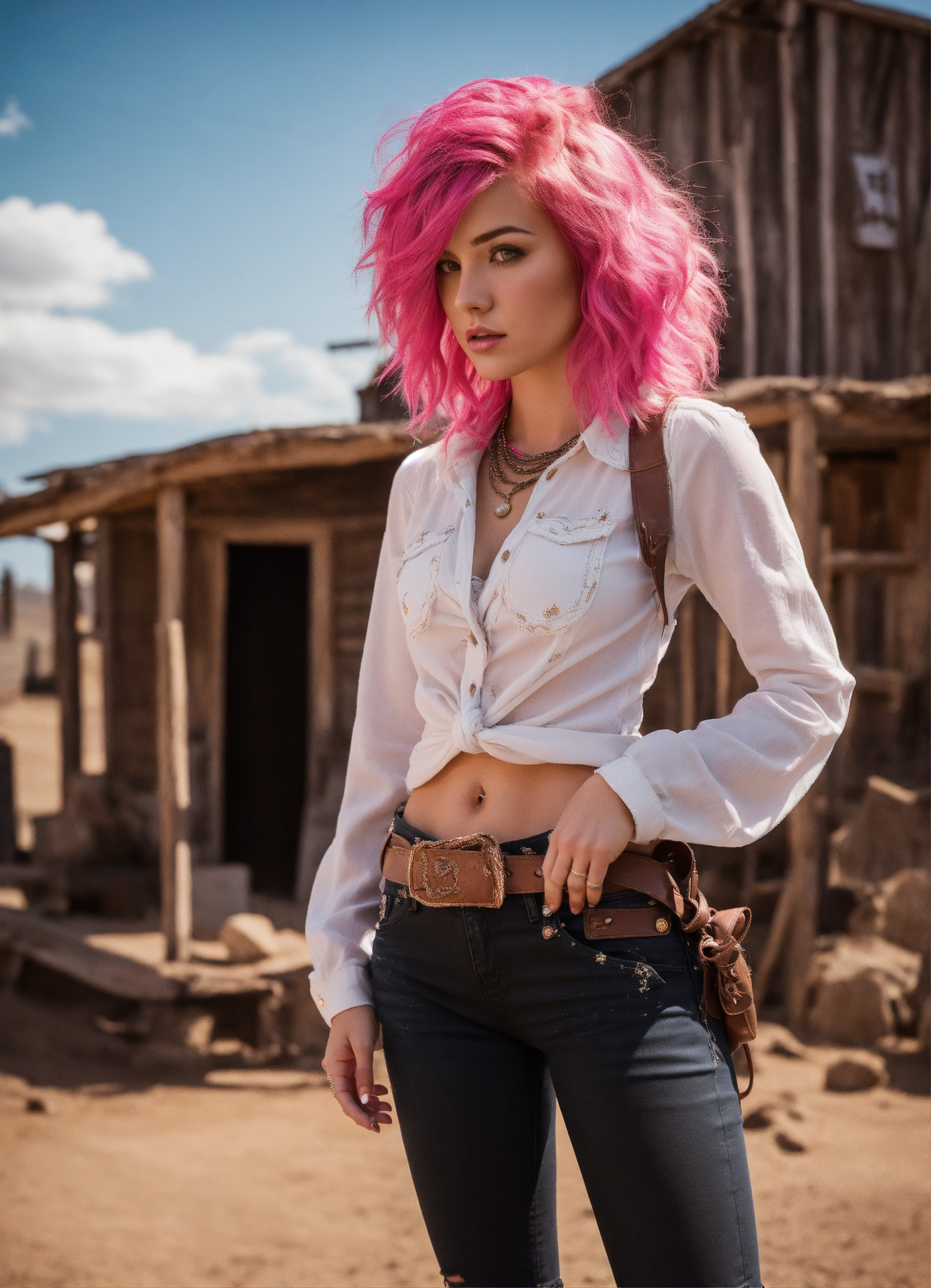 A real photo of a hot 25 year old cowgirl with bright pink hair. she is wearing a white knotted fishnet blouse, tight short black denim hotpants and a leather had. she stands in a very old western alien town
