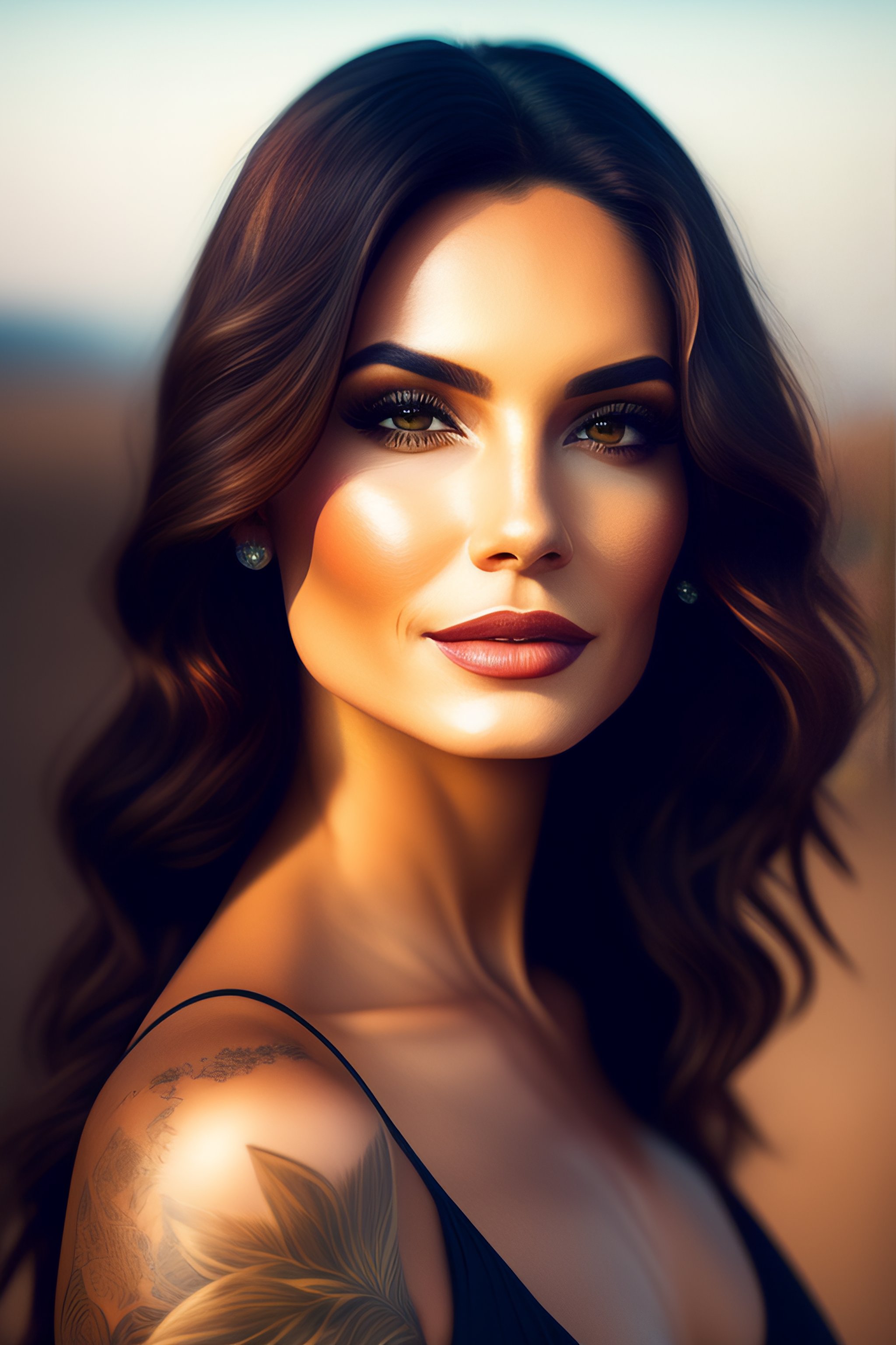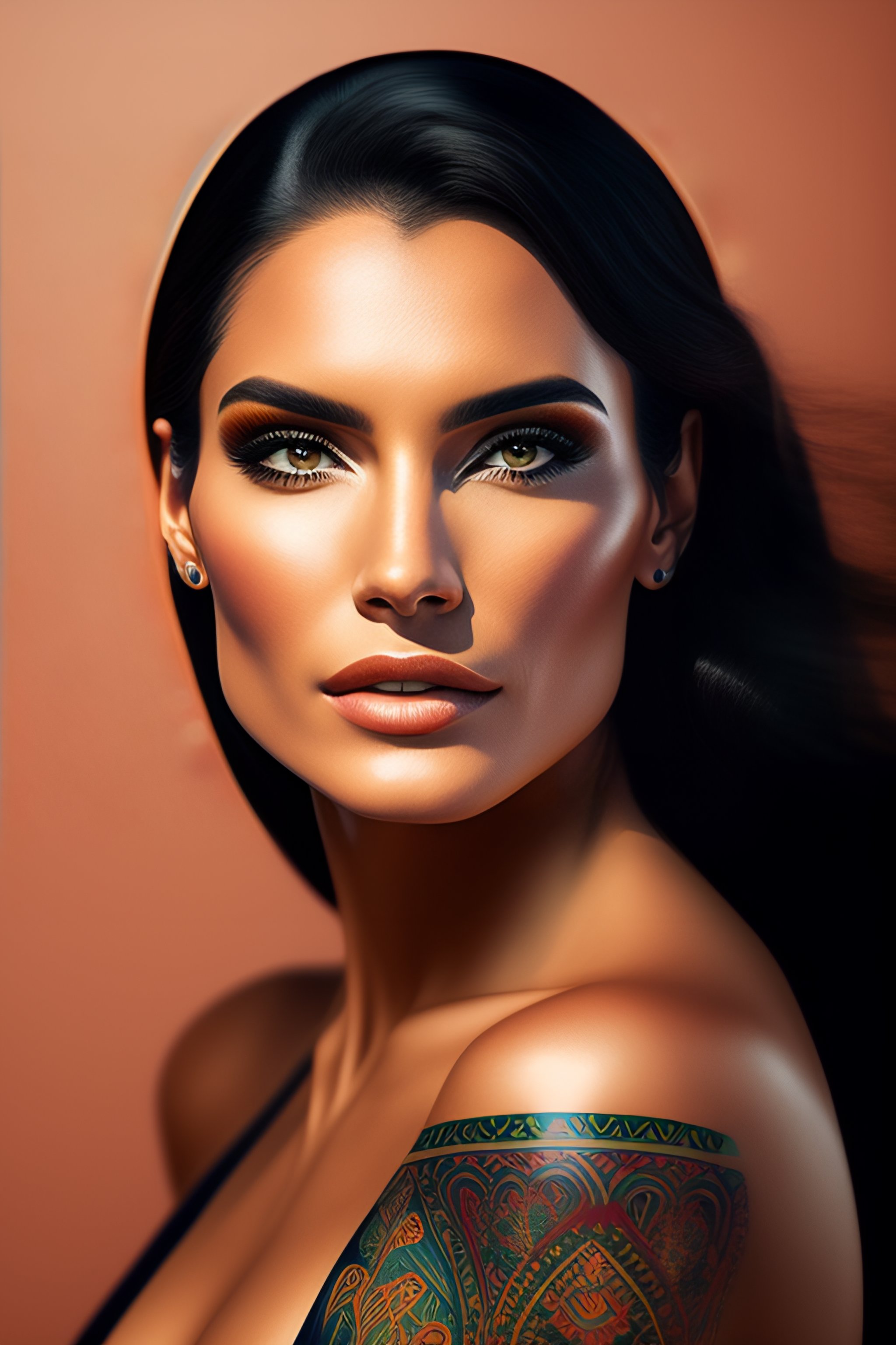 Mujer, piel de porcelana, tatuada, alta resolución, con el rostro tatuado con símbolos, pelo largo, hermoso, ojos grandes, pelo sedoso y brillante, suave, imagen de alta definición, imagen digital, arte digital de alta resolución, imagen hiperrealista