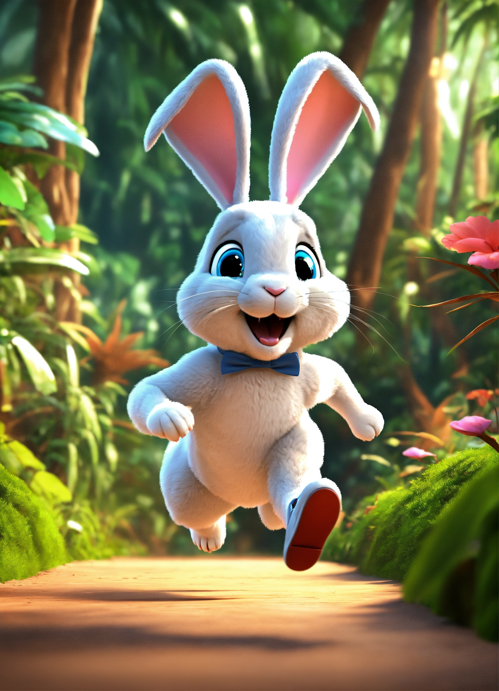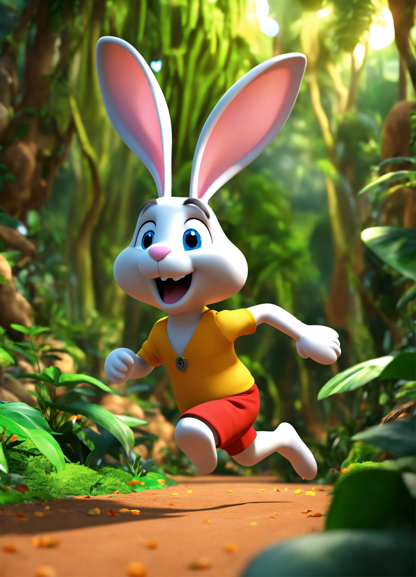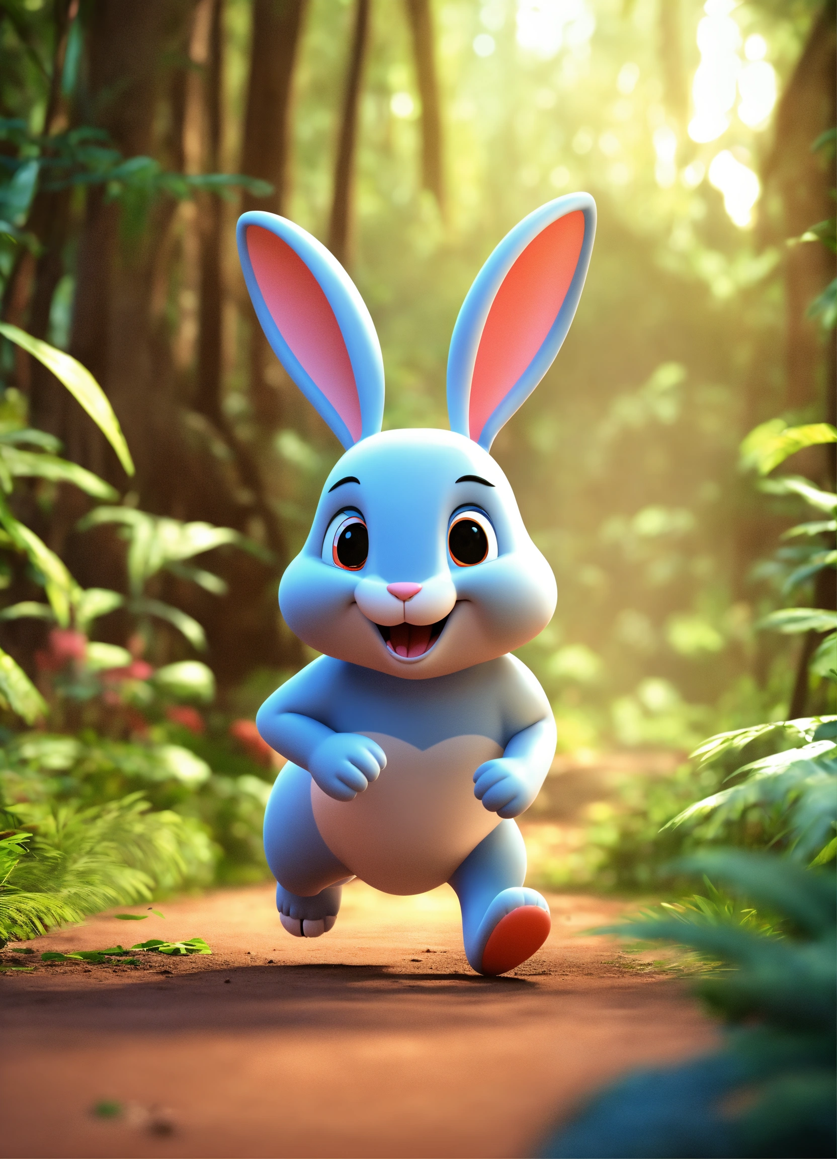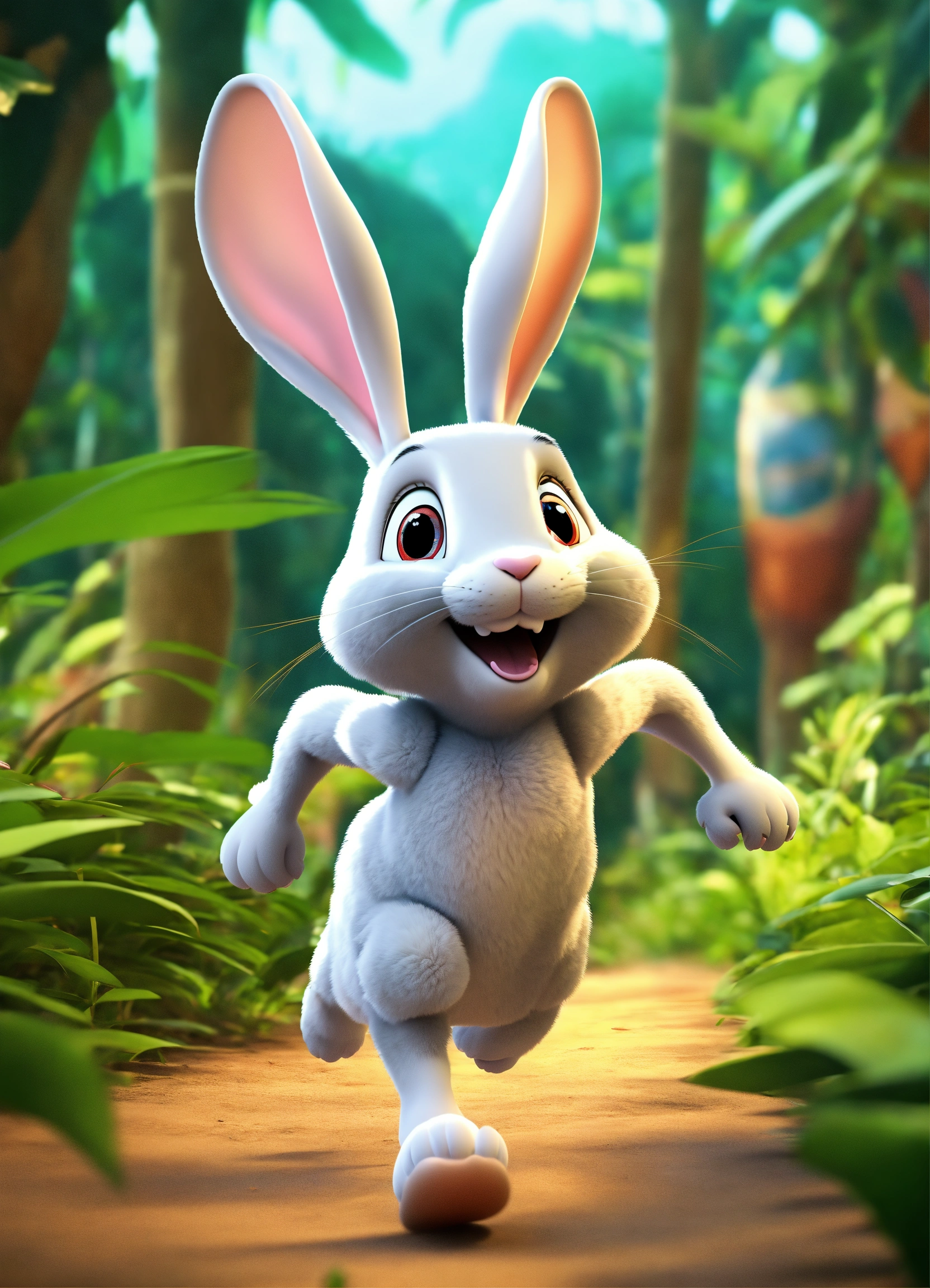 3d cartoon big slim rabbit running in jungle