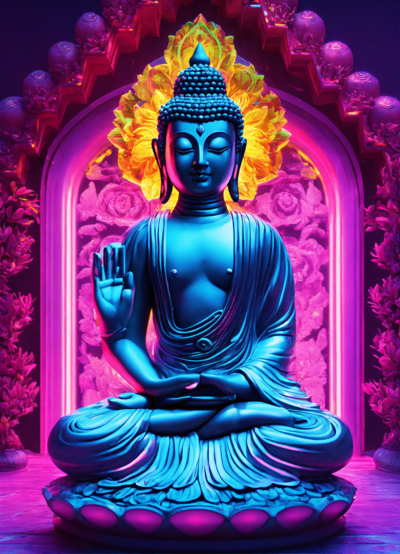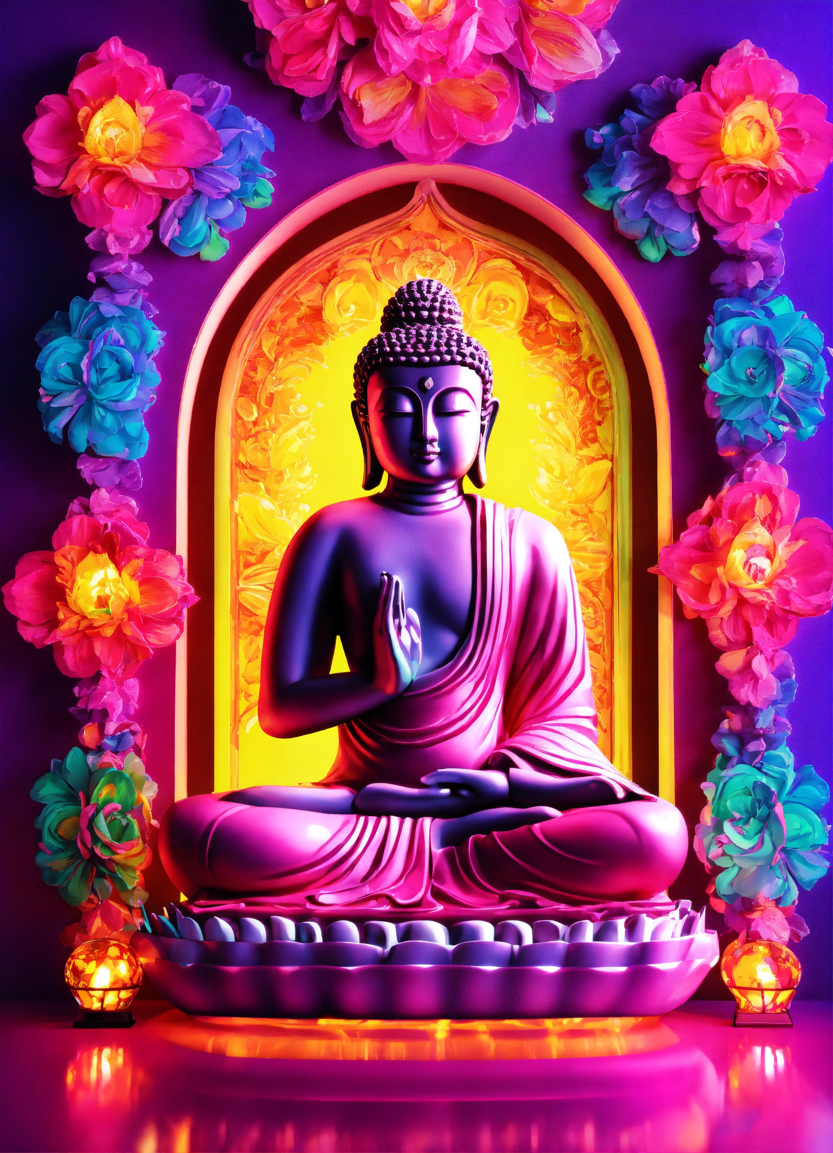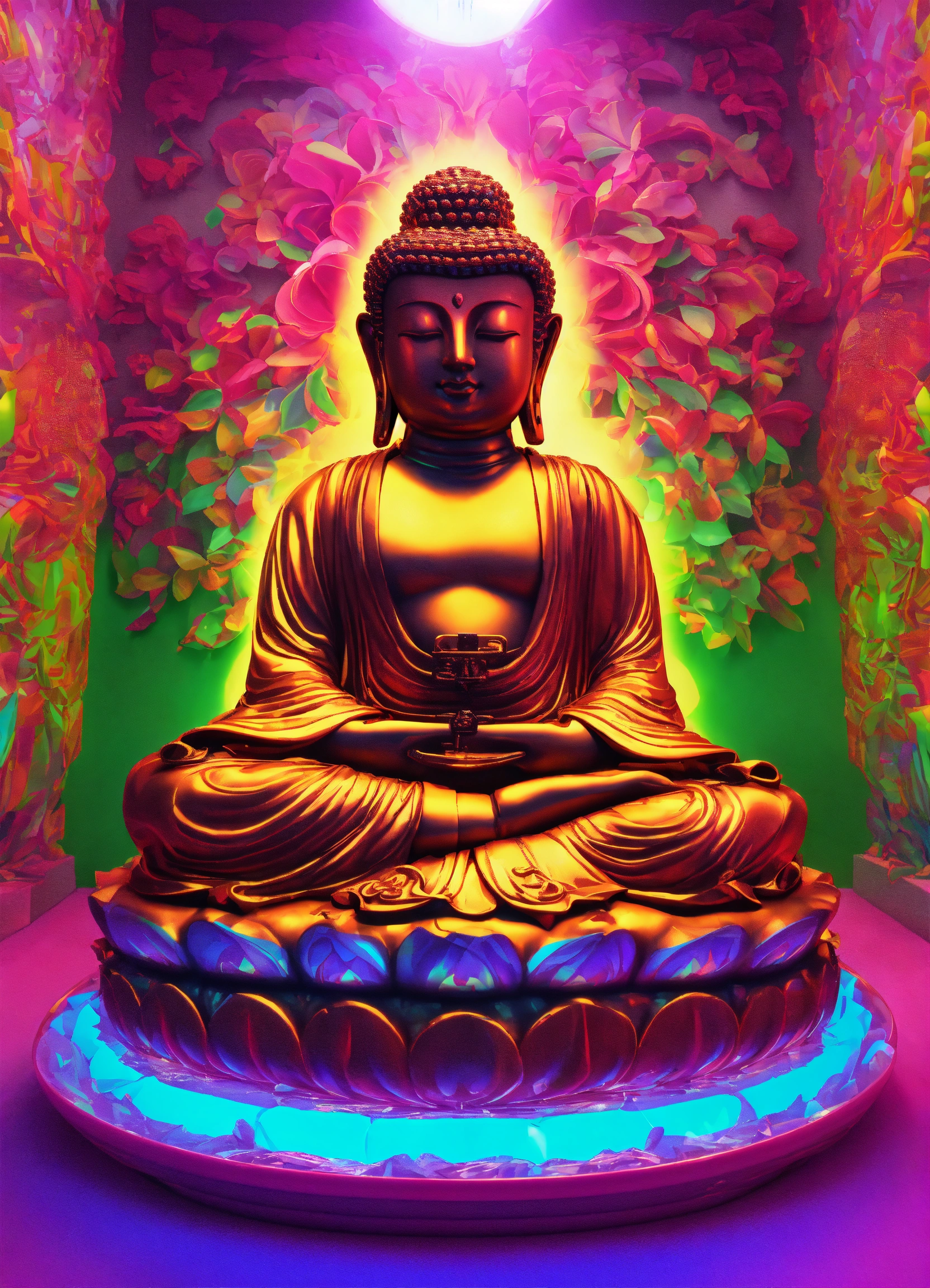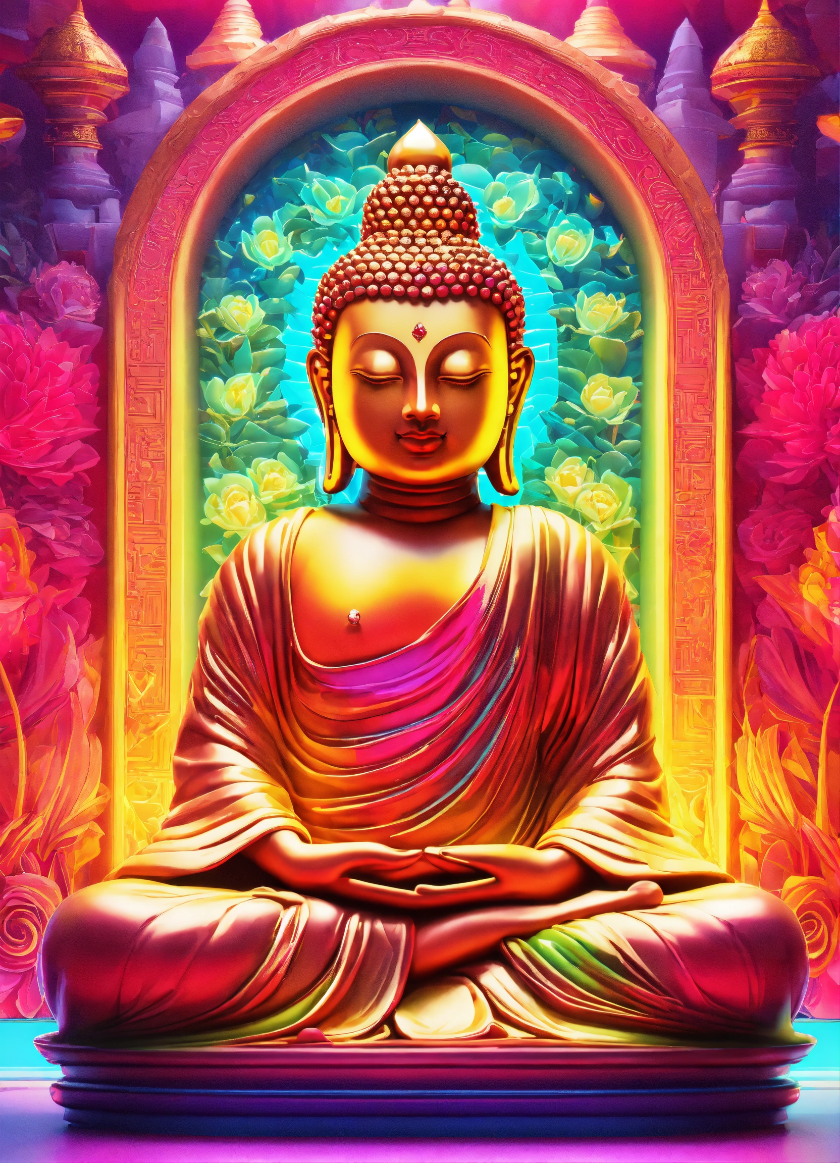 Gelly cute adorable buddha, neon glow colours, highly intricate details, 3d, cgi, realistic light, facing camera, portrait, global illumination, glass like, repeatable pattern unicorns background on a wall