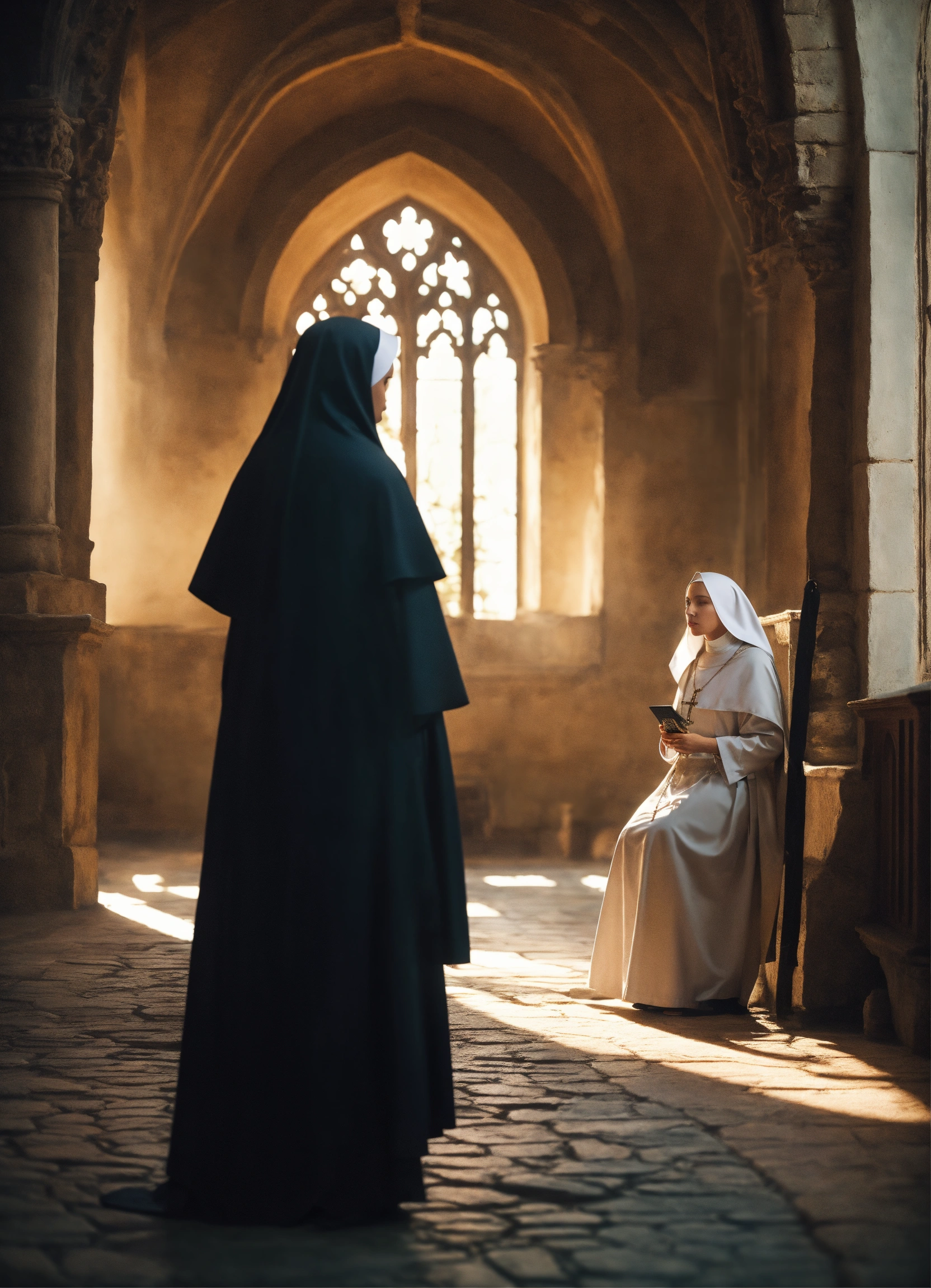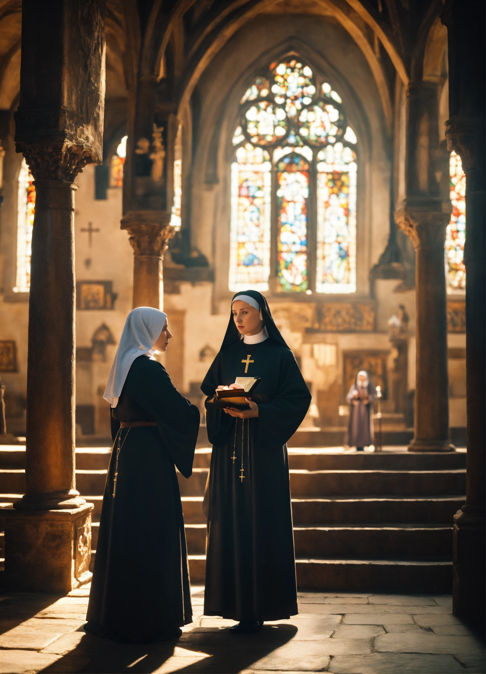 An epic fantasy scene featuring a gorgeous beautiful blonde nun in conversation with the abbess in medieval orthodox monastery. cinematic view, sharp detail.