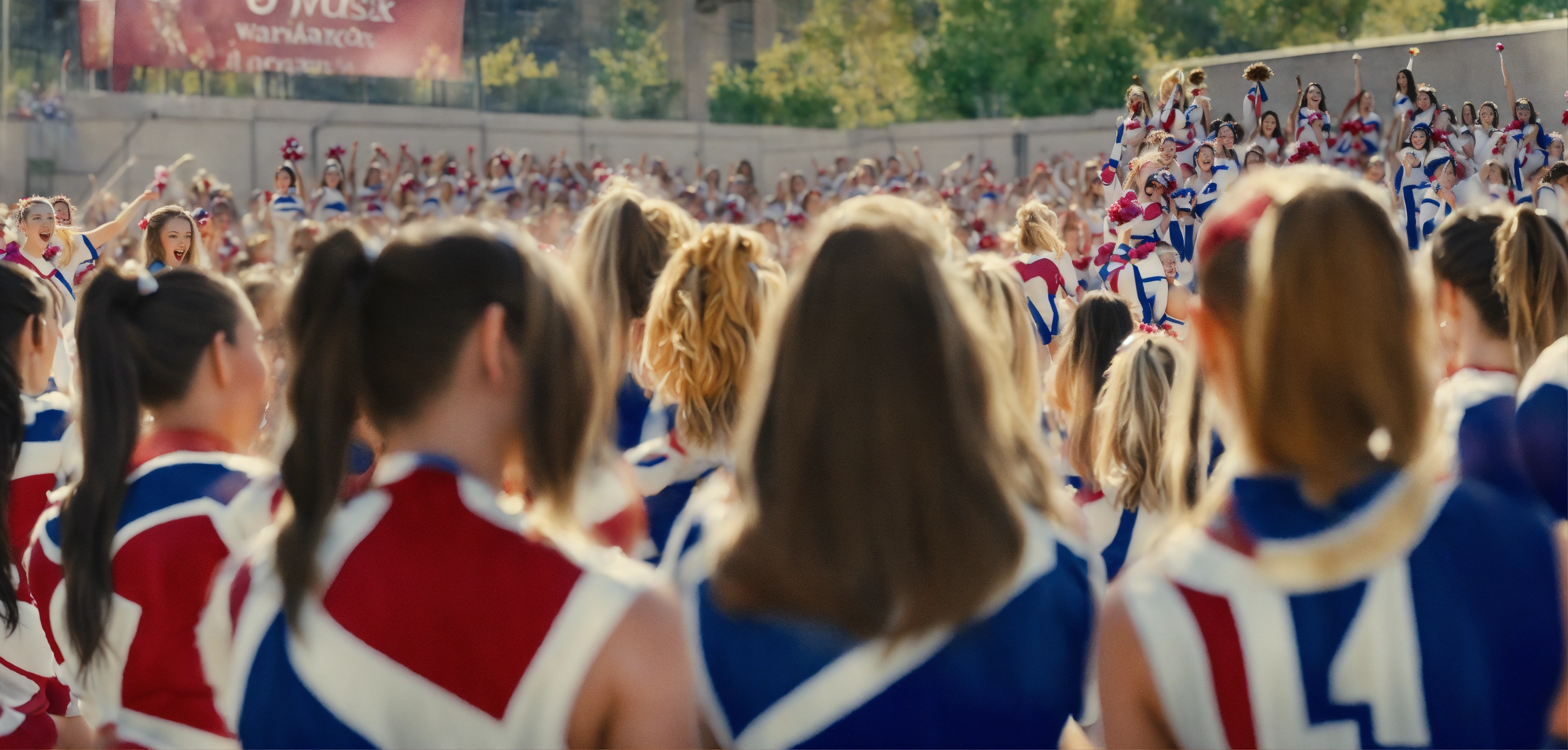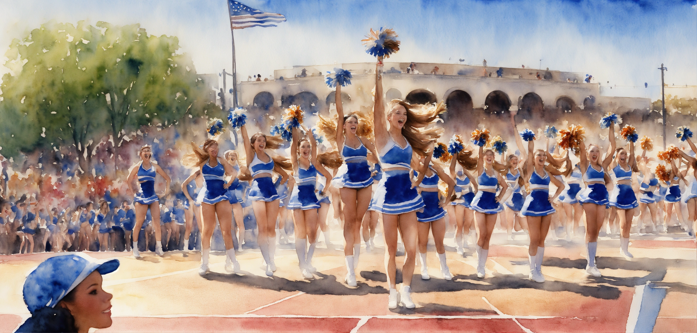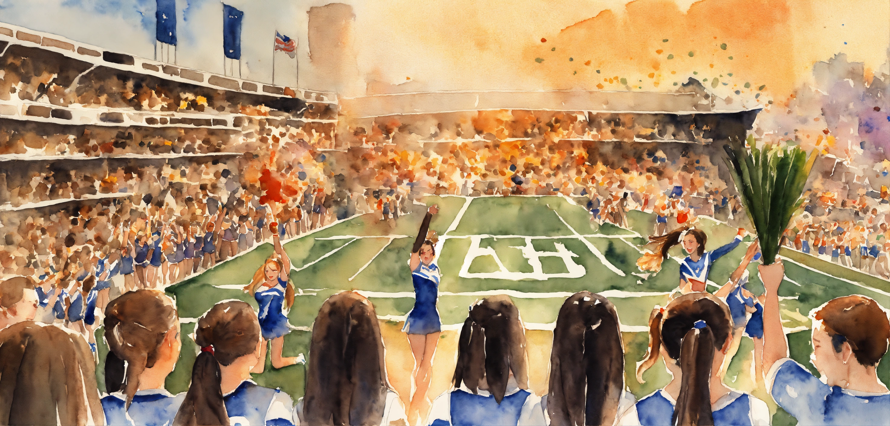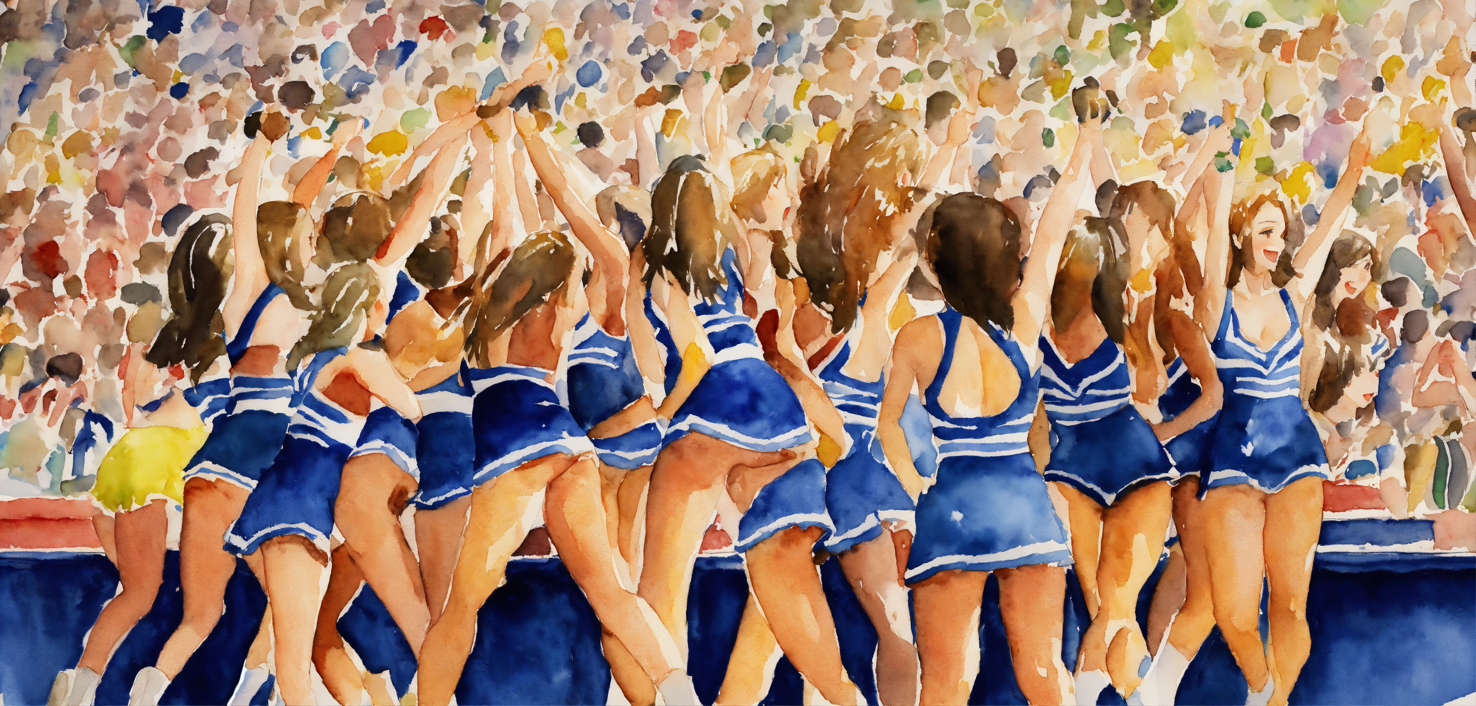 A watercolor of a group of cheerleaders facing a crowd cheering