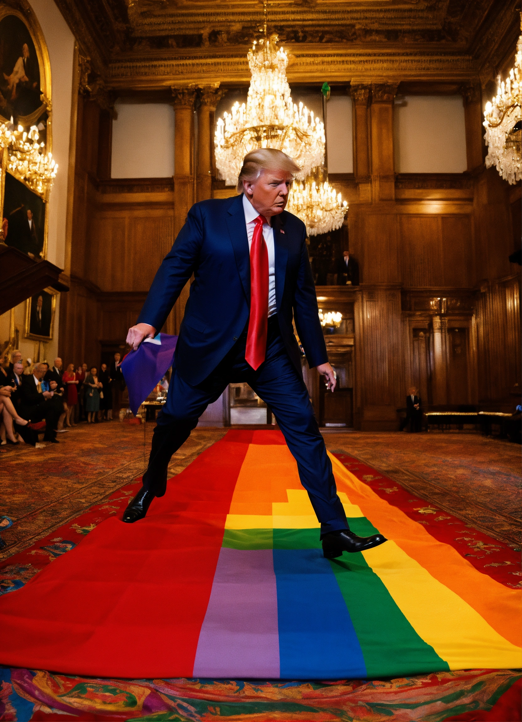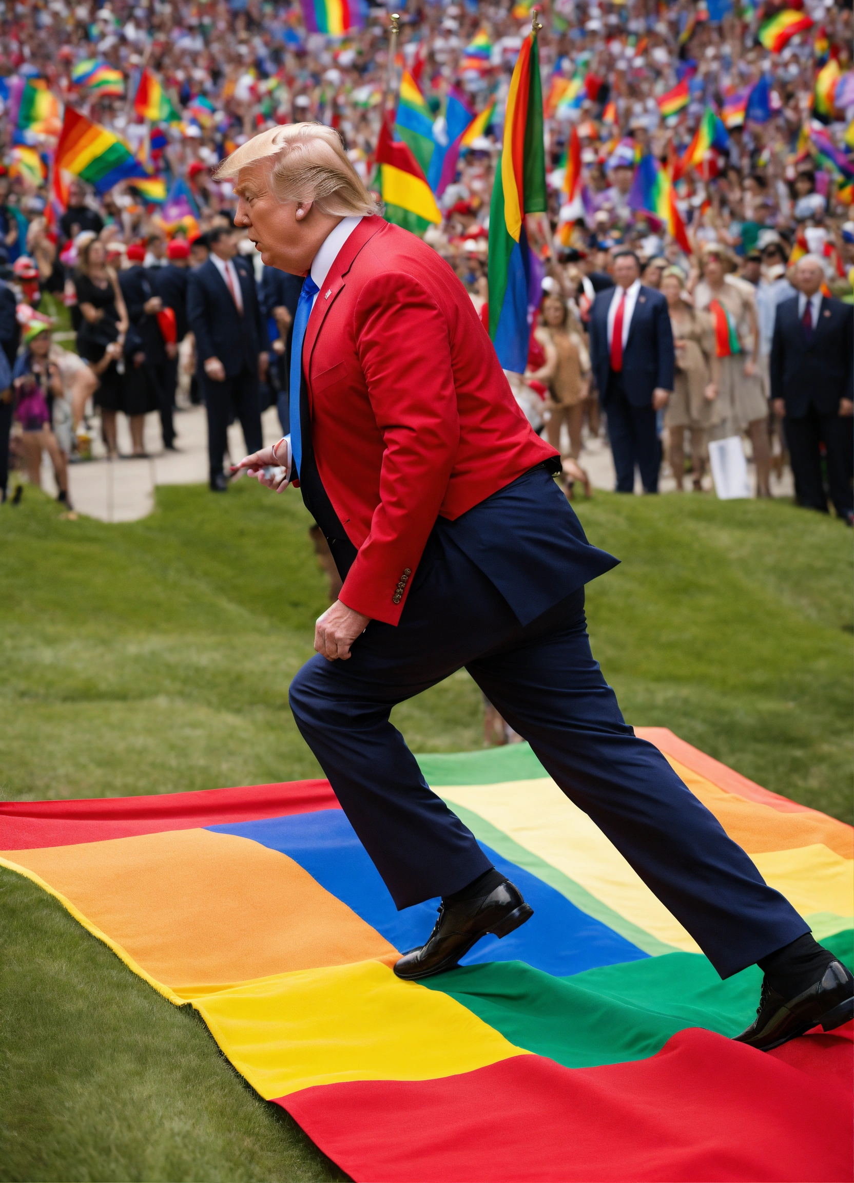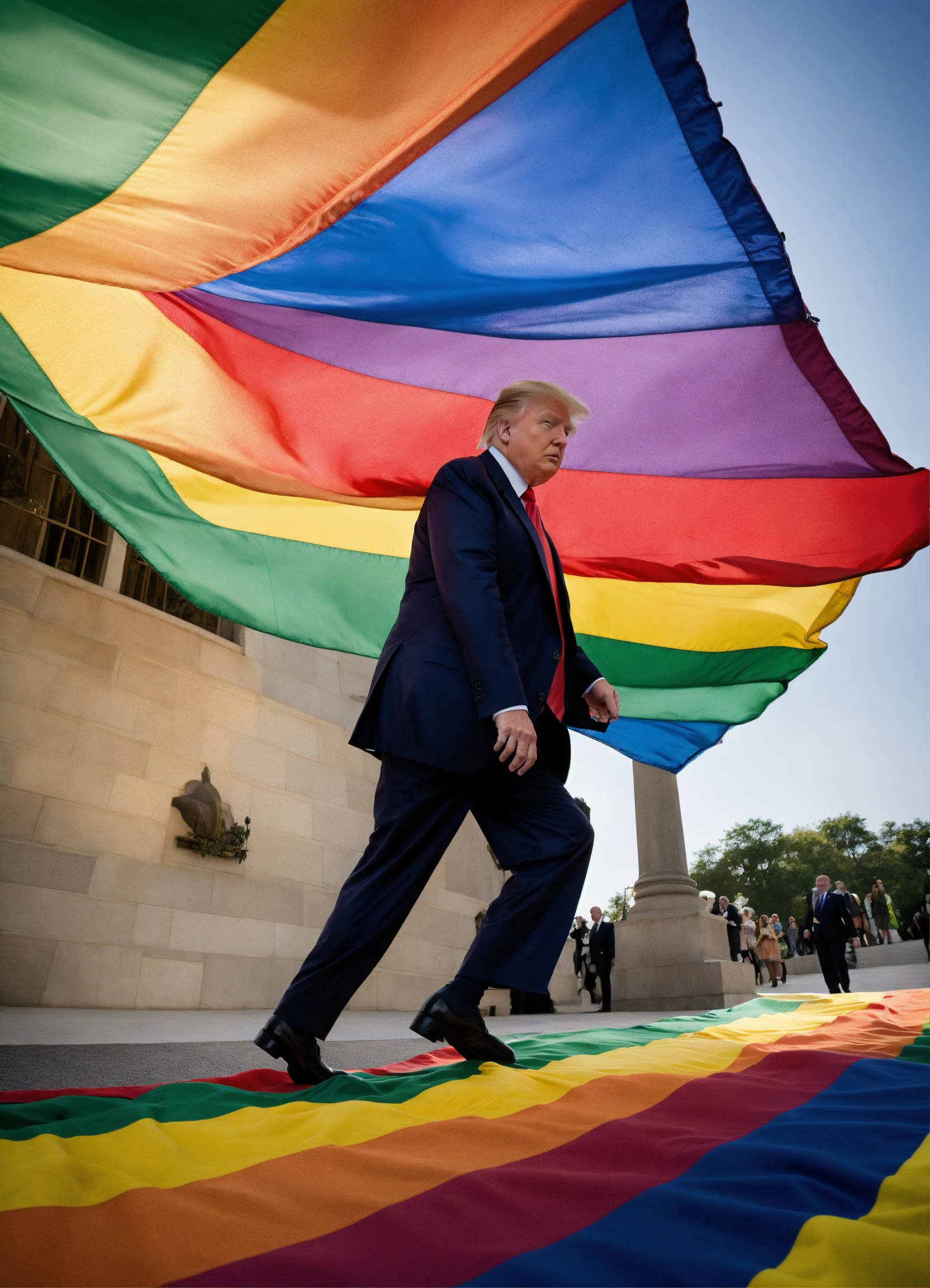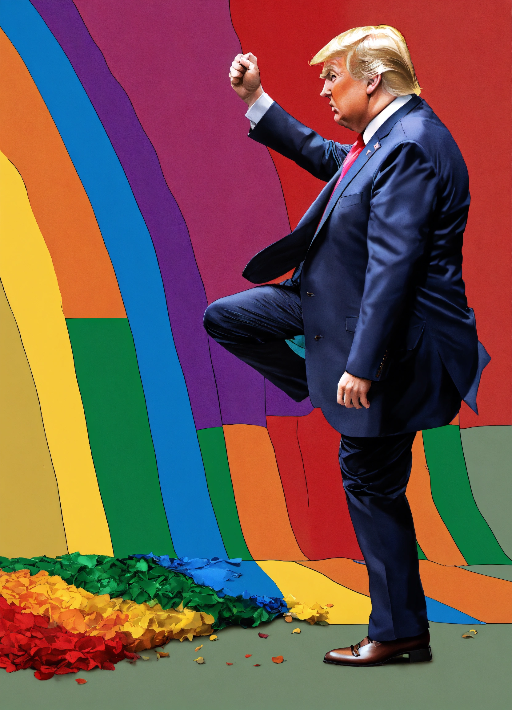 Donald trump stepping over a rainbow flag
