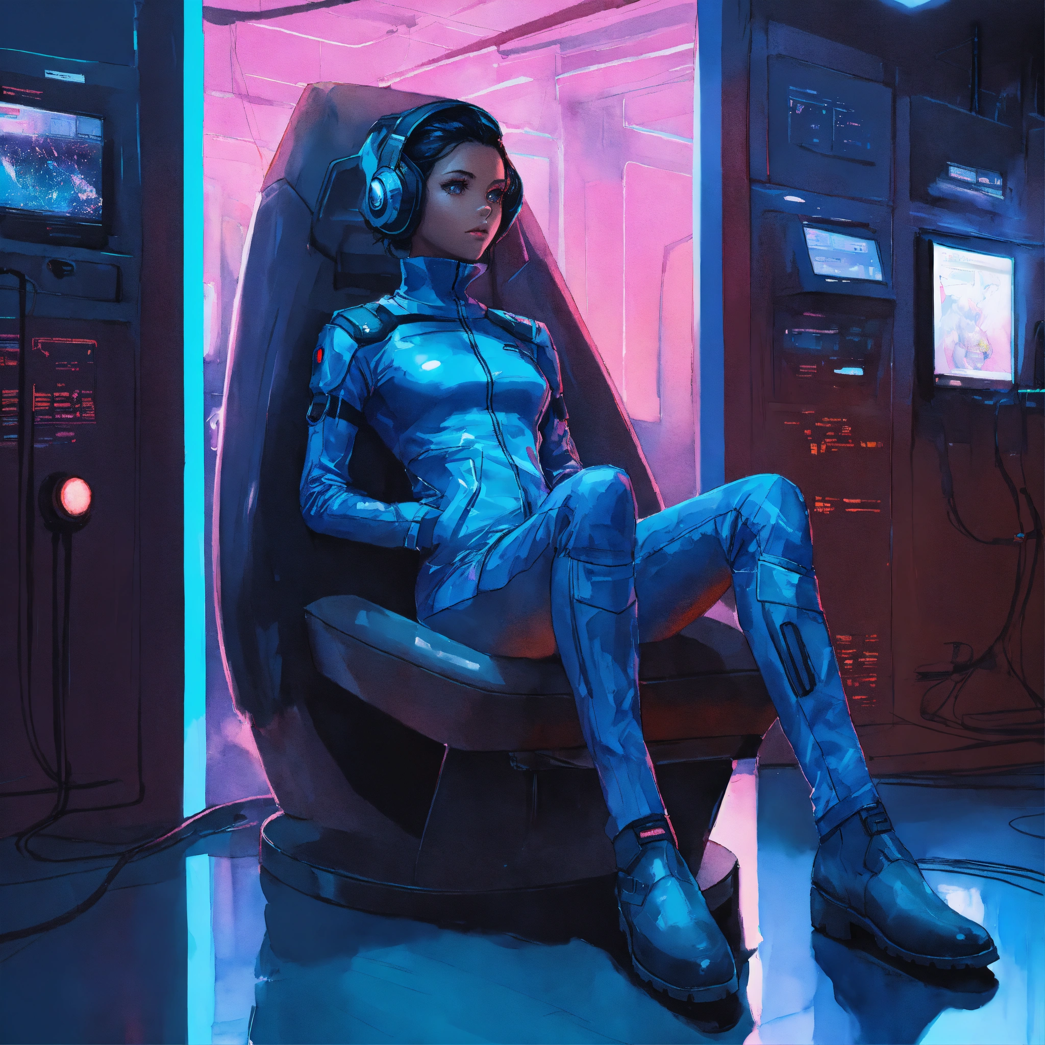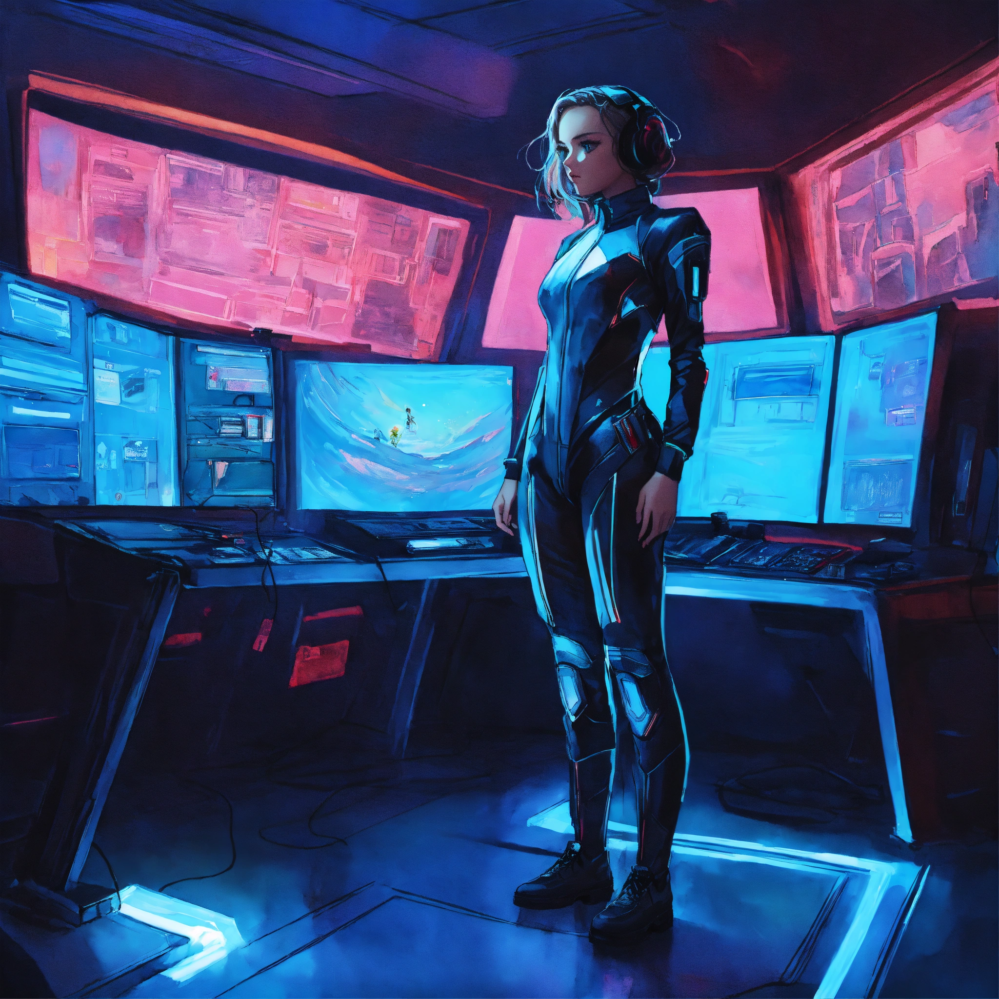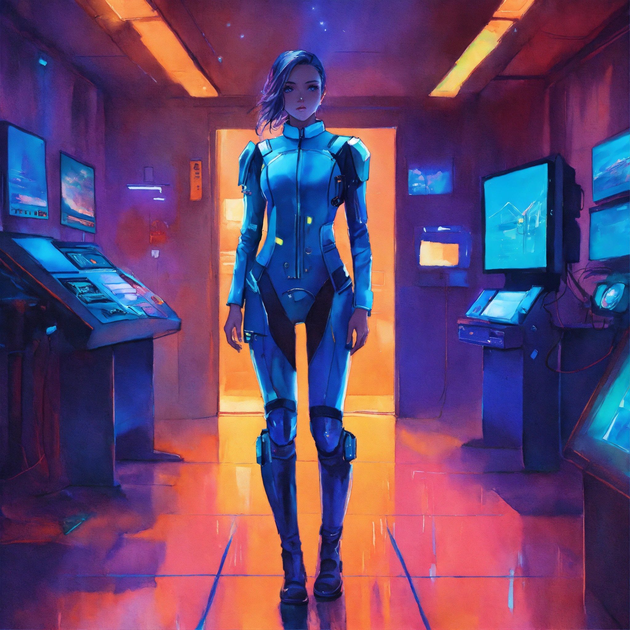 Full body illustration of a woman, young, 18 years old, beautiful, wearing a futuristic suit, inside a dark control room, neon blue light, watercolors, gloomy and depressing ambient, artwork by tom björklund