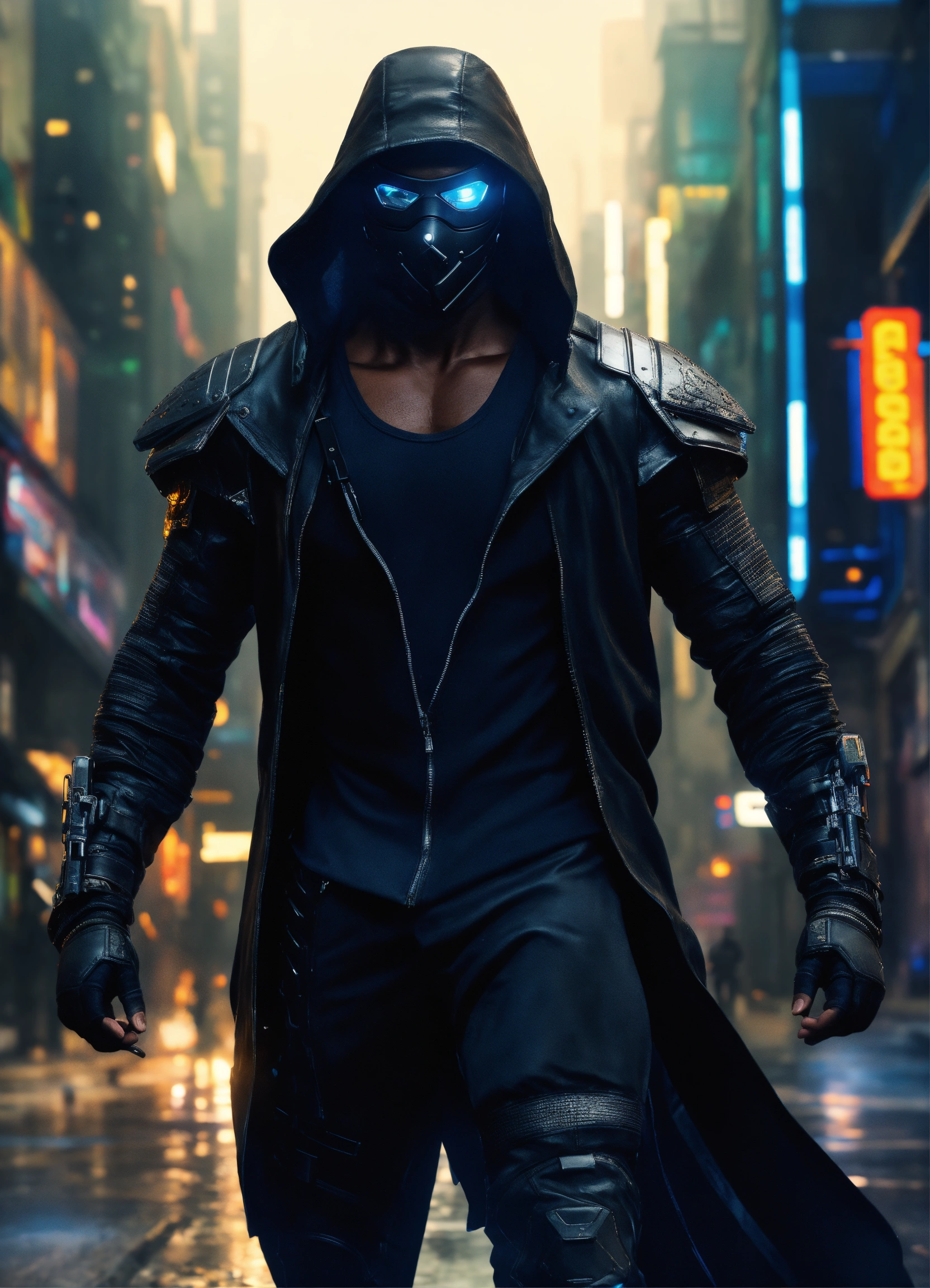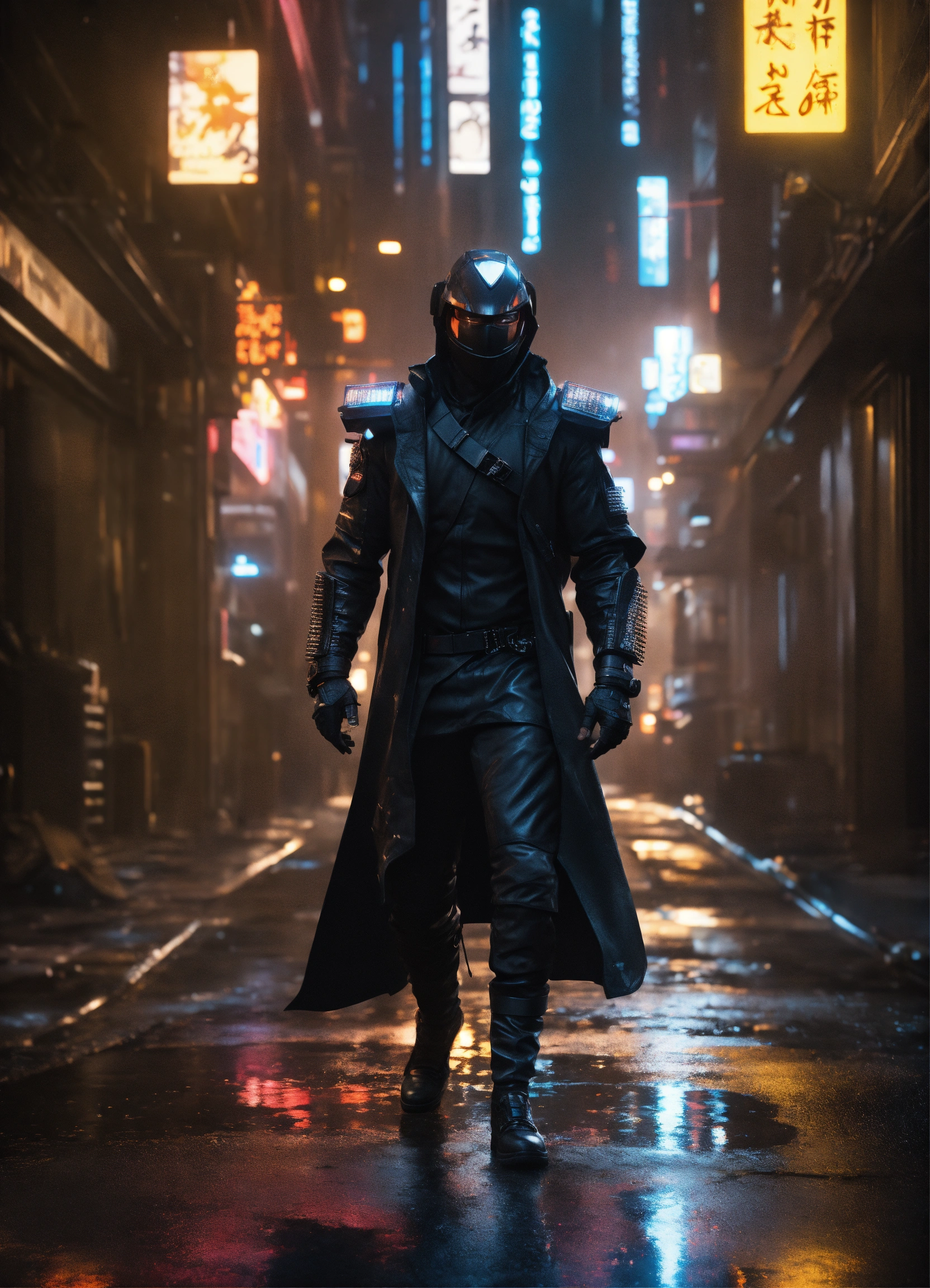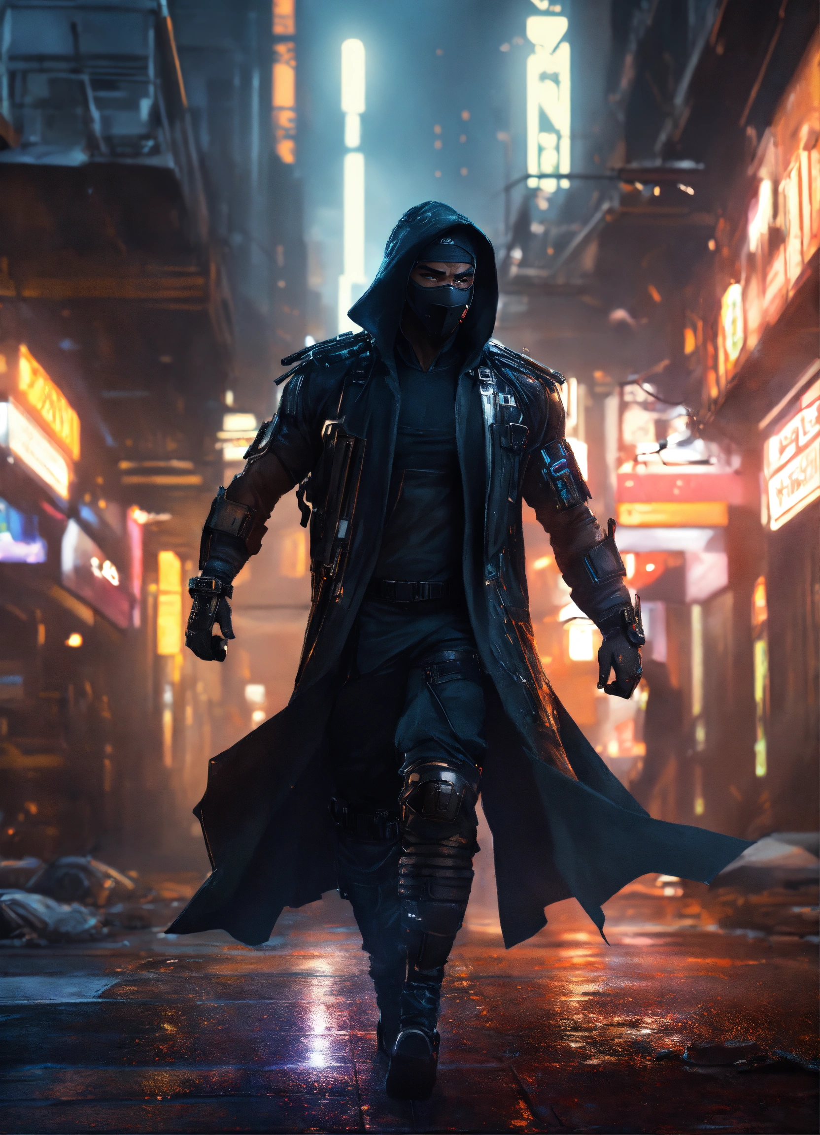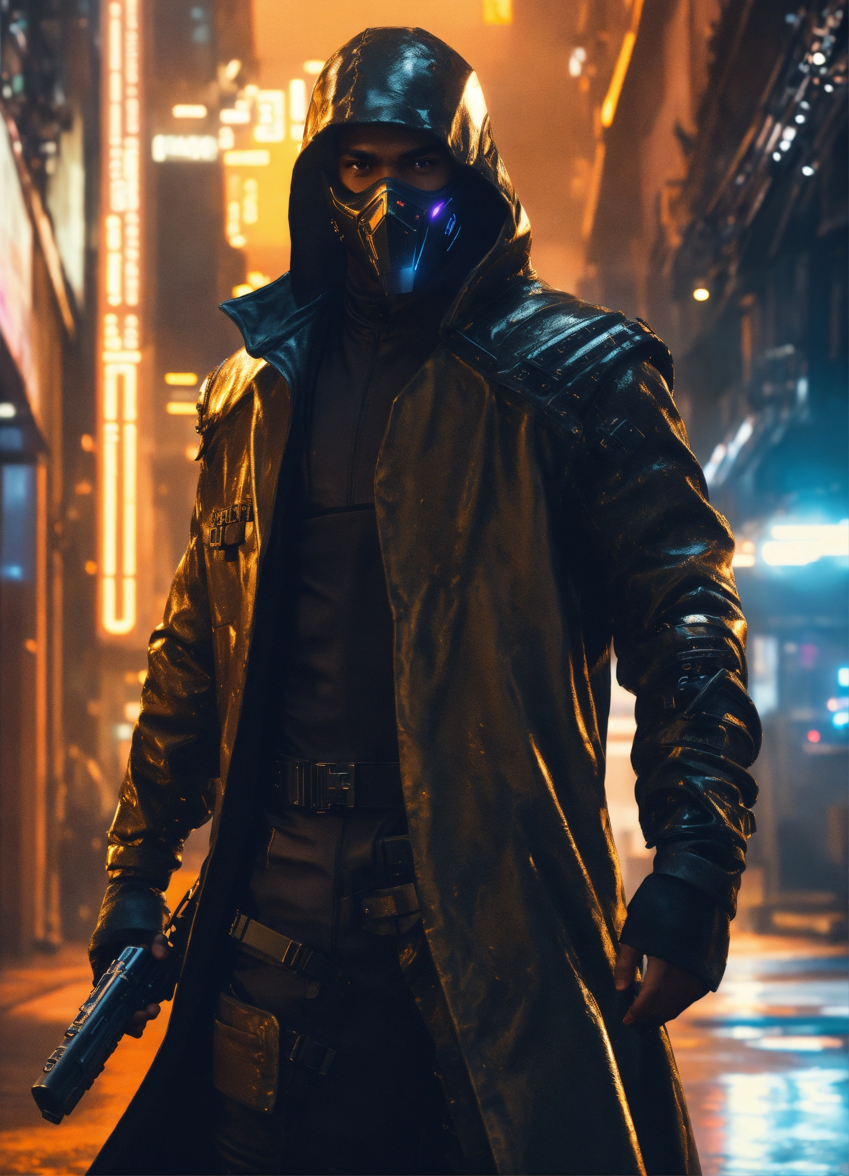 Full body of a black man, handsome athletic black man, a male ninja a futuristic blade runner 20149 ninja, he has a black mirrored face mask covering his face, futuristic ninja, muscular wearing a long leather coat and a black and super spy stealth suit, in futuristic cyberpunk streets, full body, 8k resolution concept art portrait dynamic lighting hyperdetailed intricately detailed splash art trending on artstation unreal engine 5 volumetric lighting