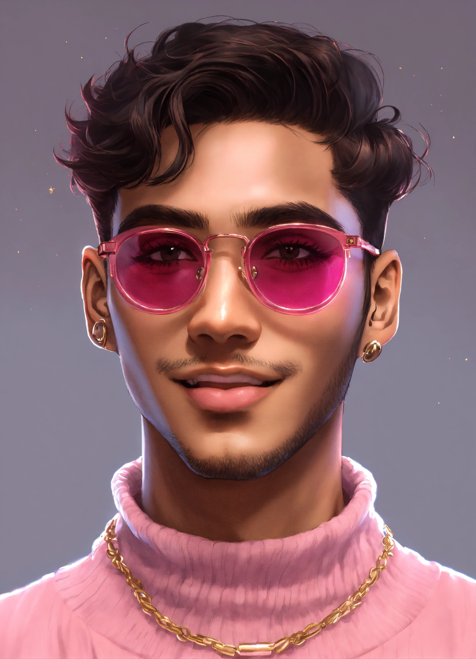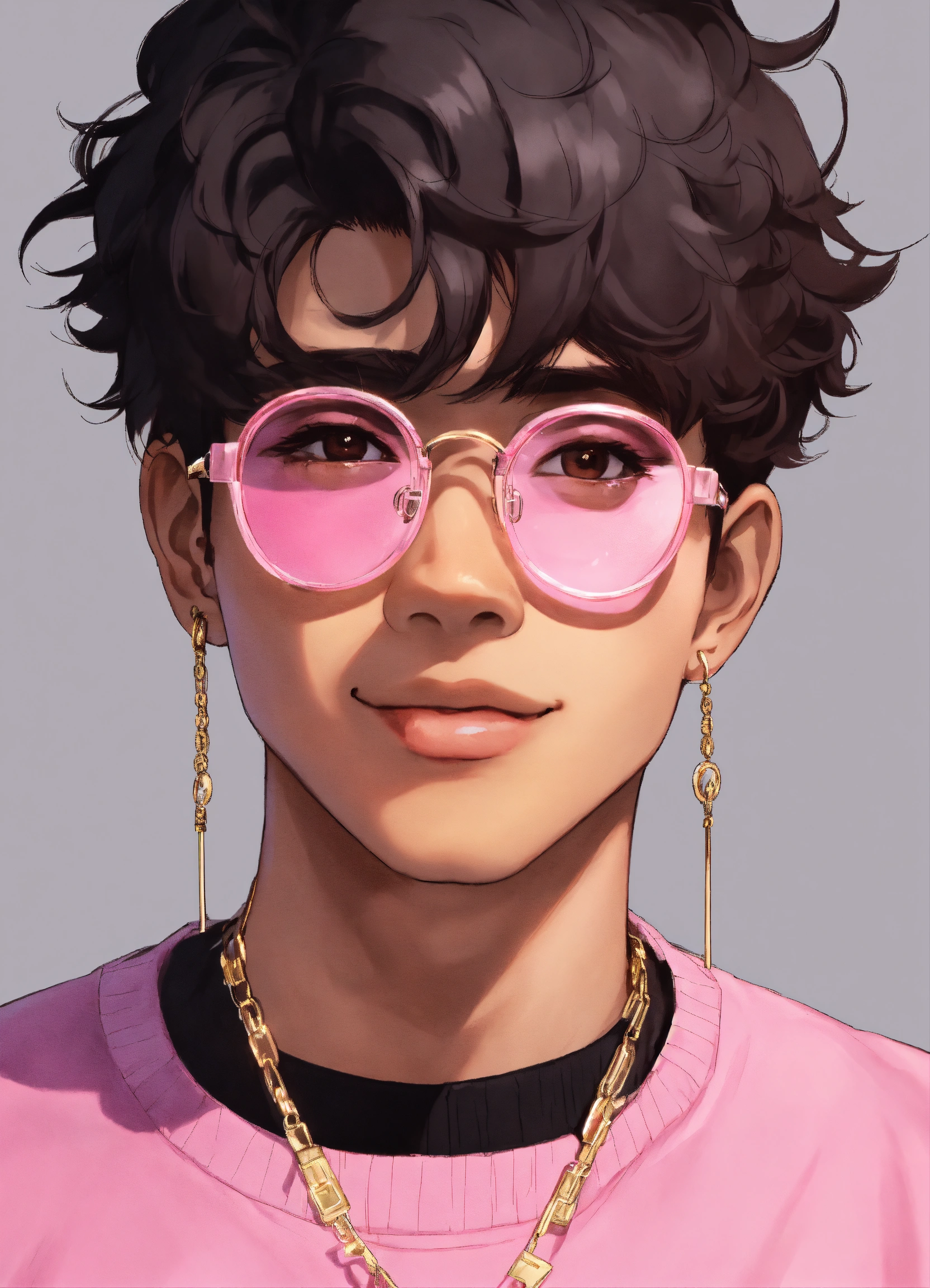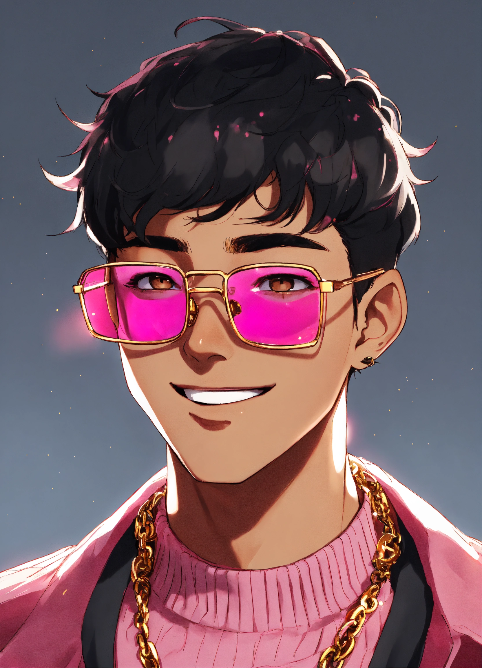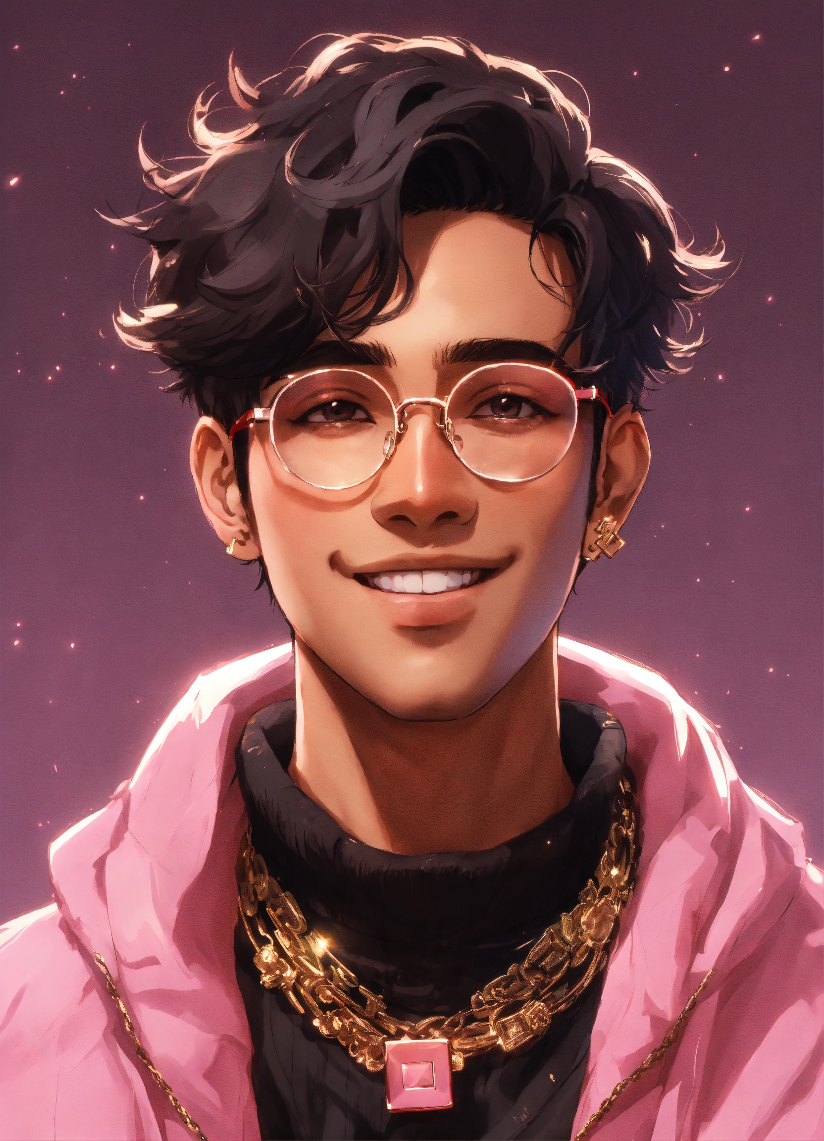 A young brown man wearing square pink vision glasses, only the face showing, anime style, black hair, white background, black turtleneck, gold necklace, smiling face, looking straight at the camera, 3d sytle