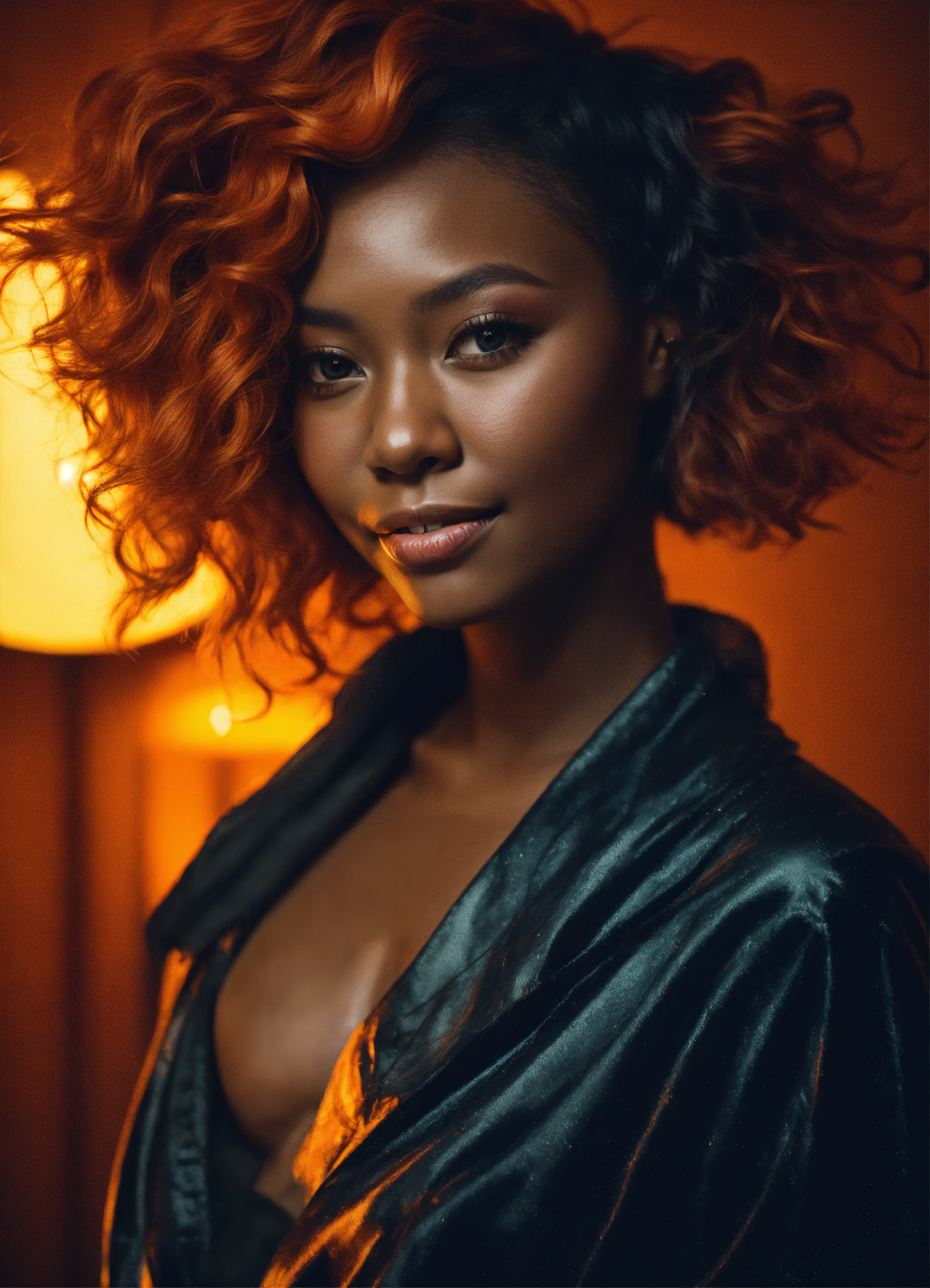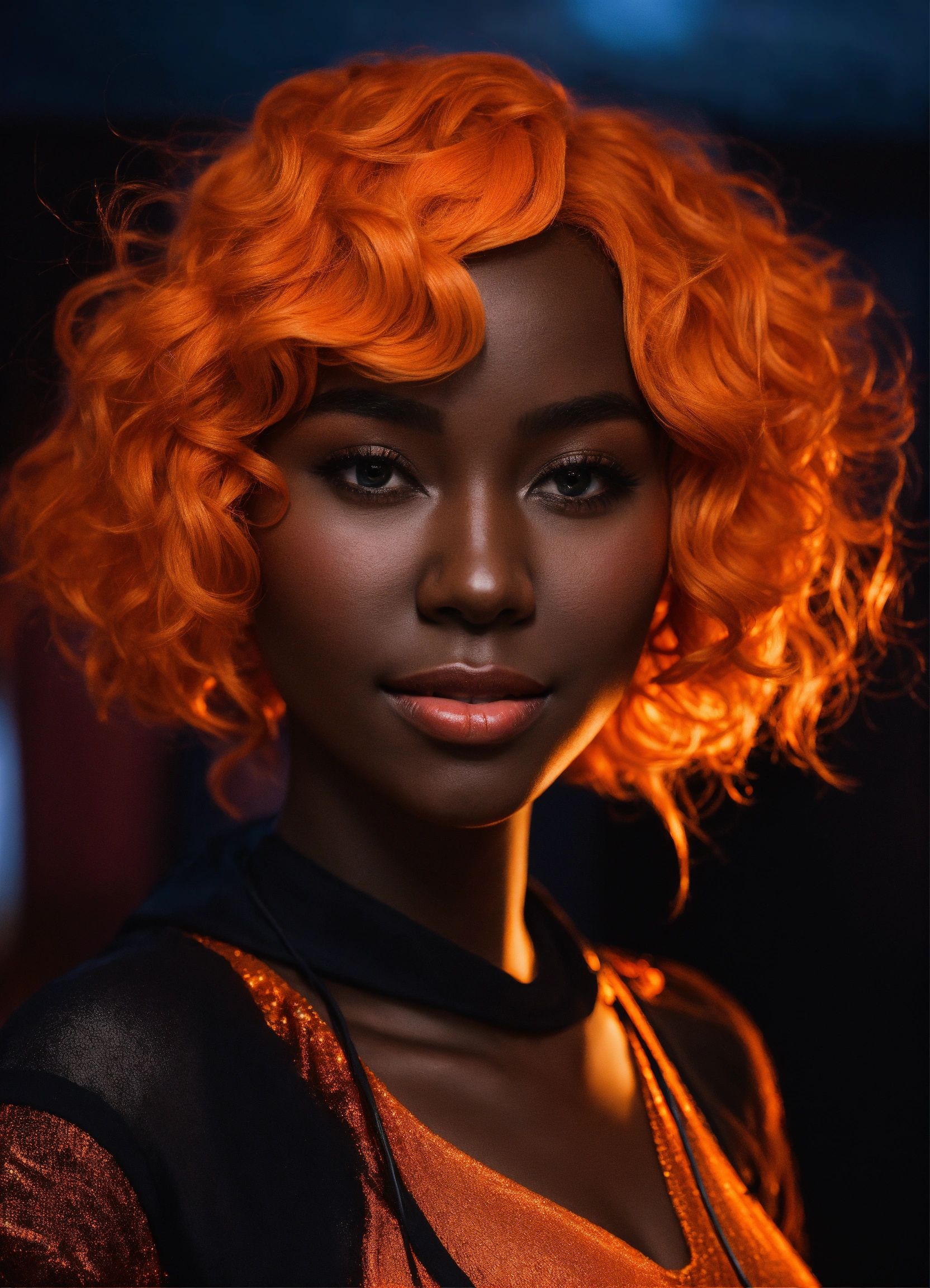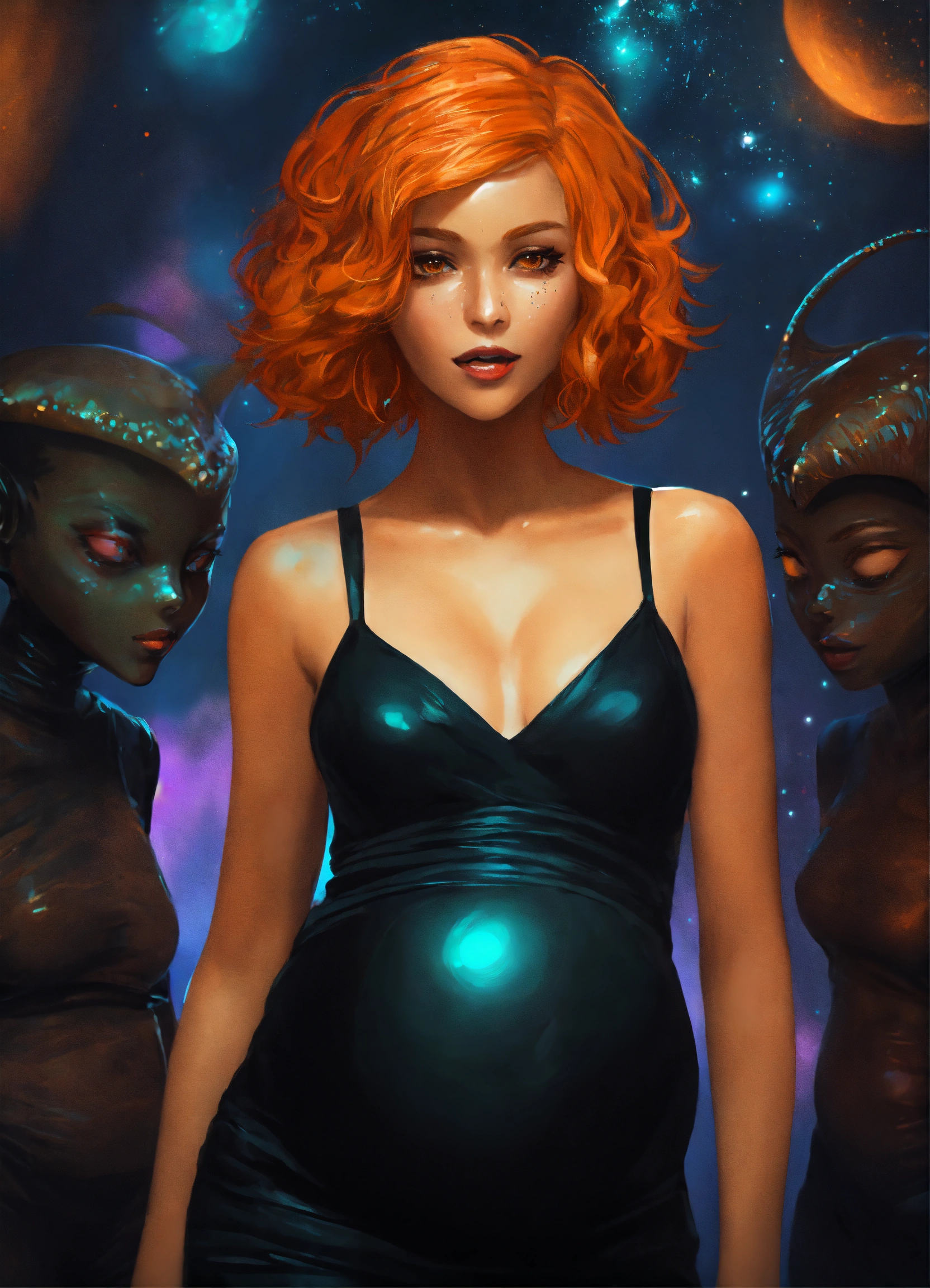 Alien female. short orange wavy hair. face round. very dark black complexion in maternity wear, happy persona. at upscale party.