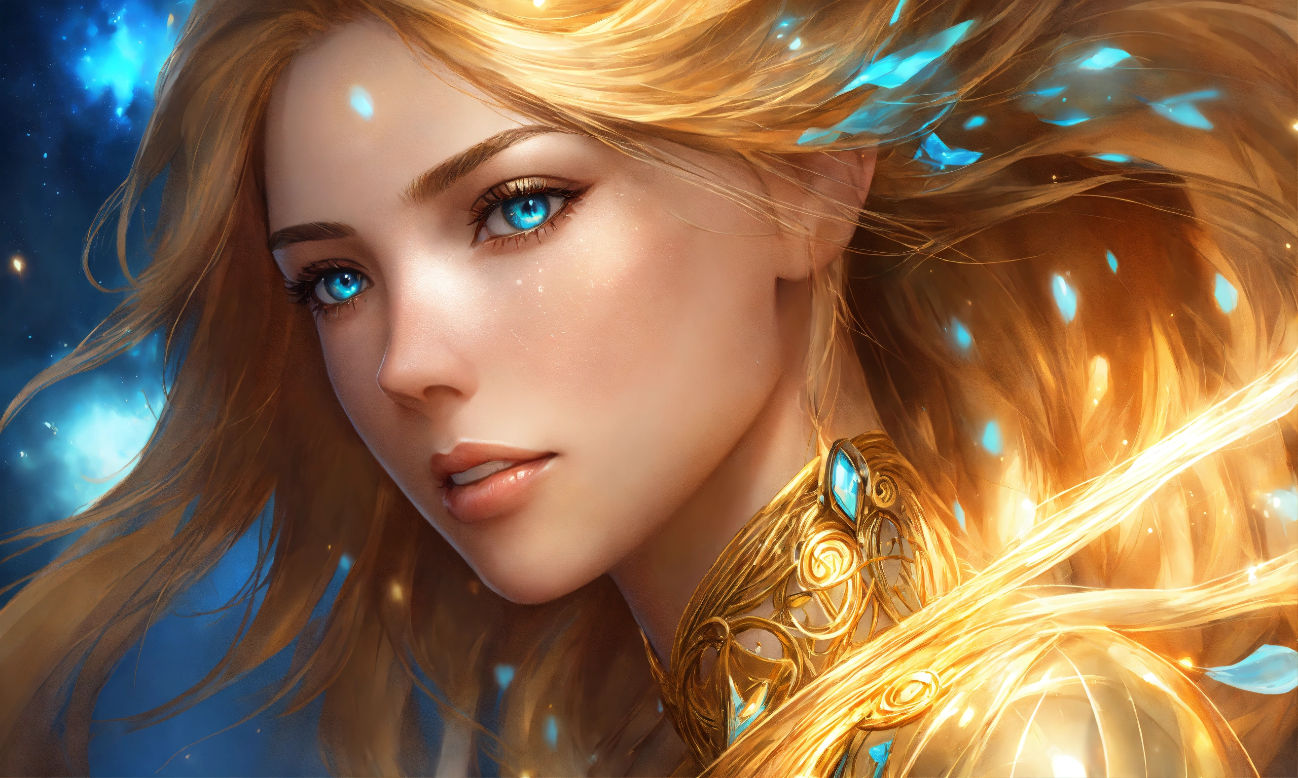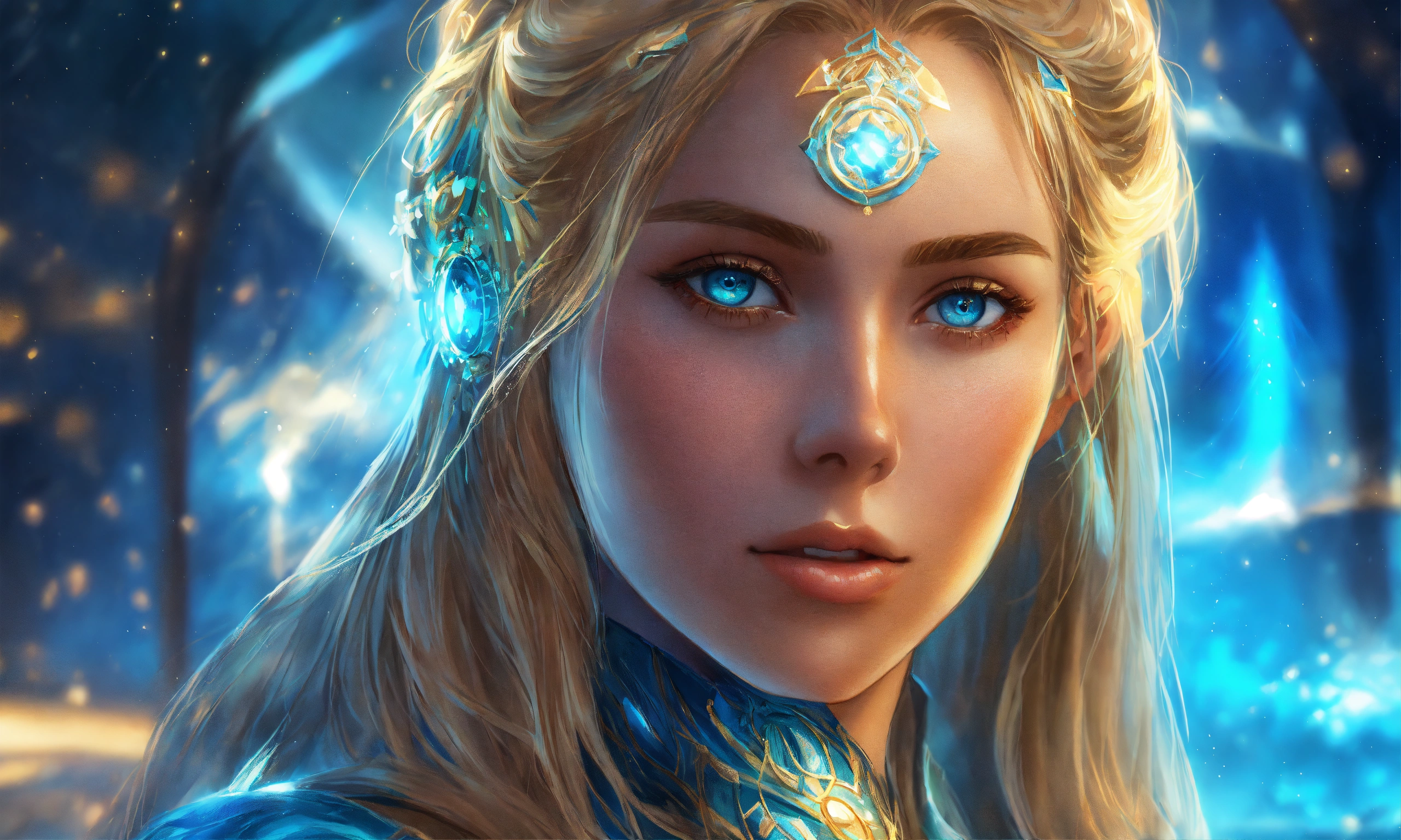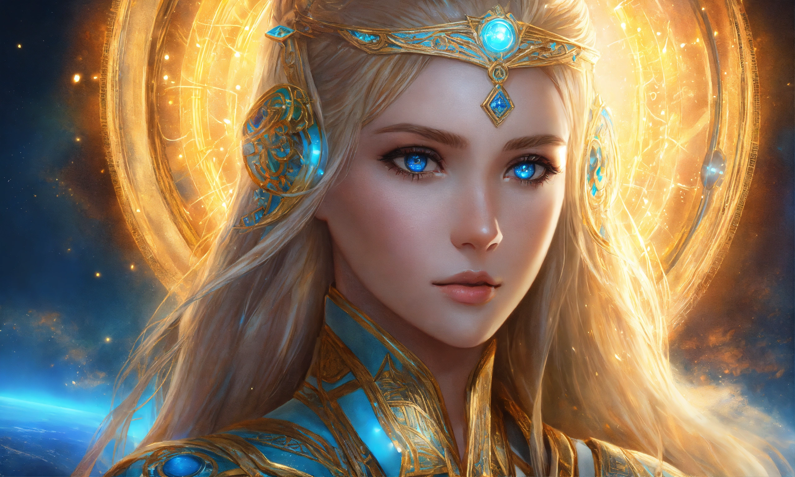 Beautiful pleiadian woman, highly detailed, digital painting, art station, concept art, smooth, sharp focus, illustration, electric light blue eye pupils, blonde golden brown hair back to one ponytail