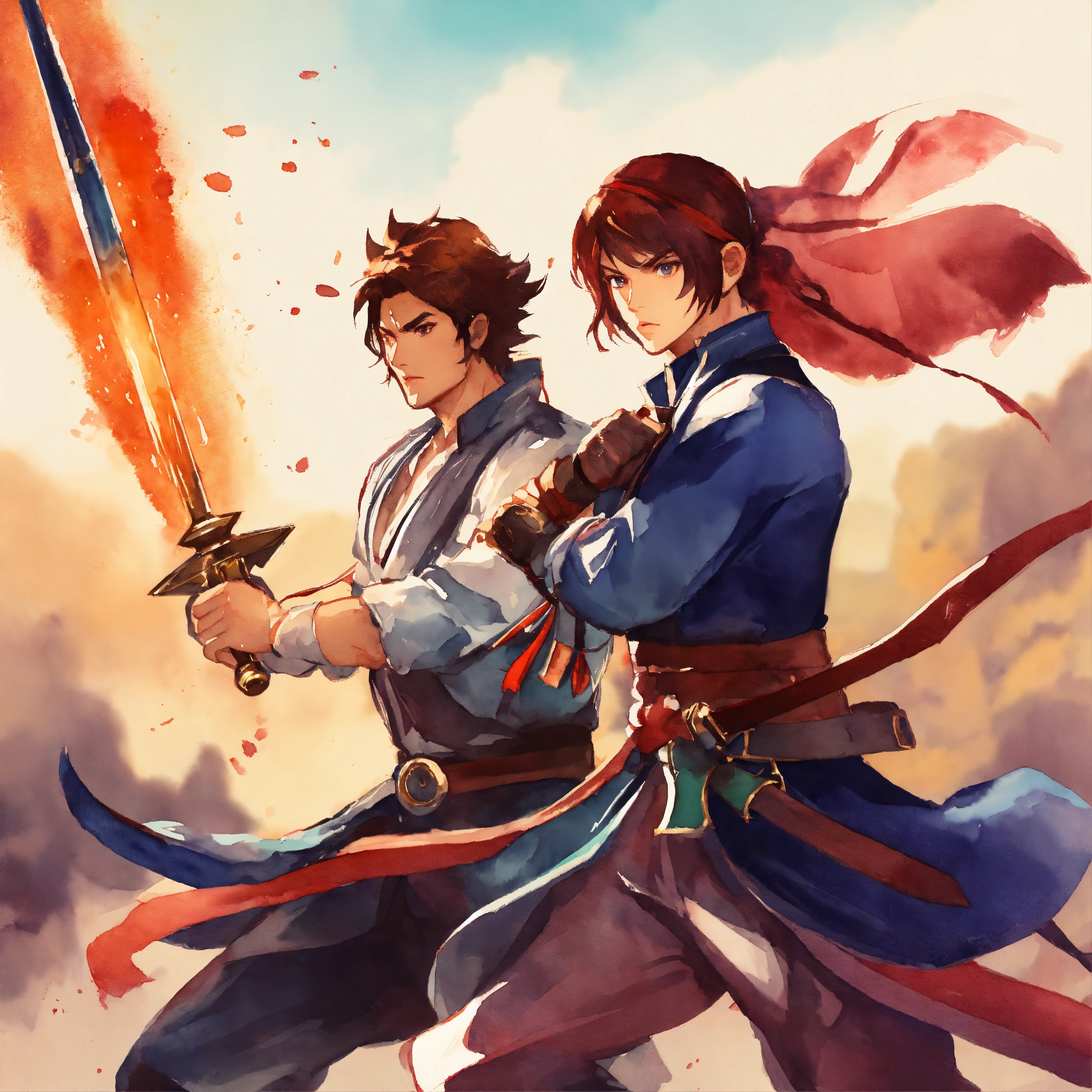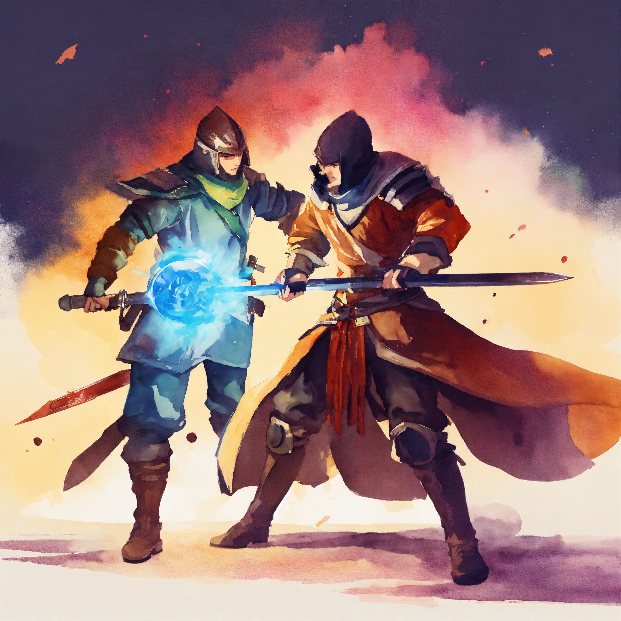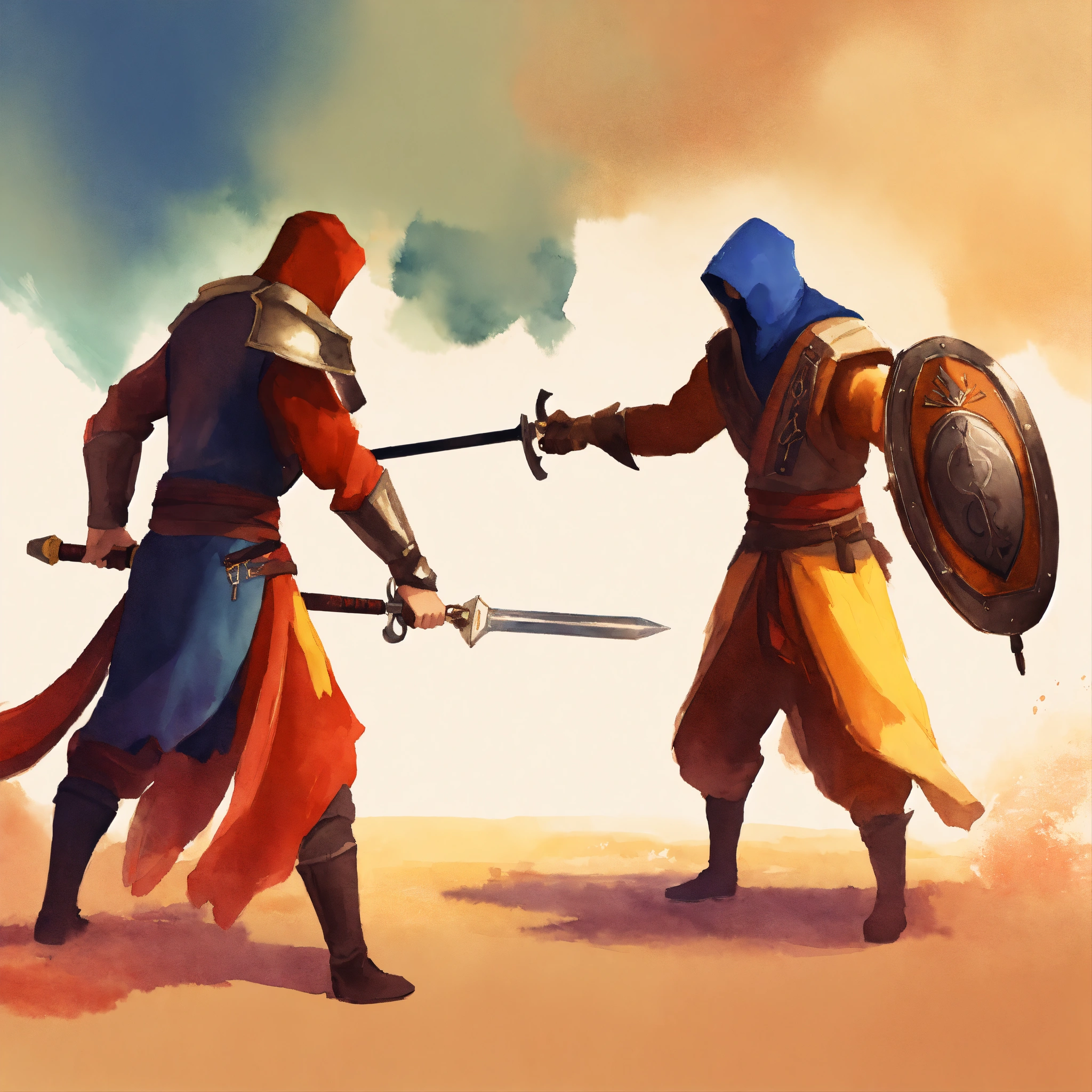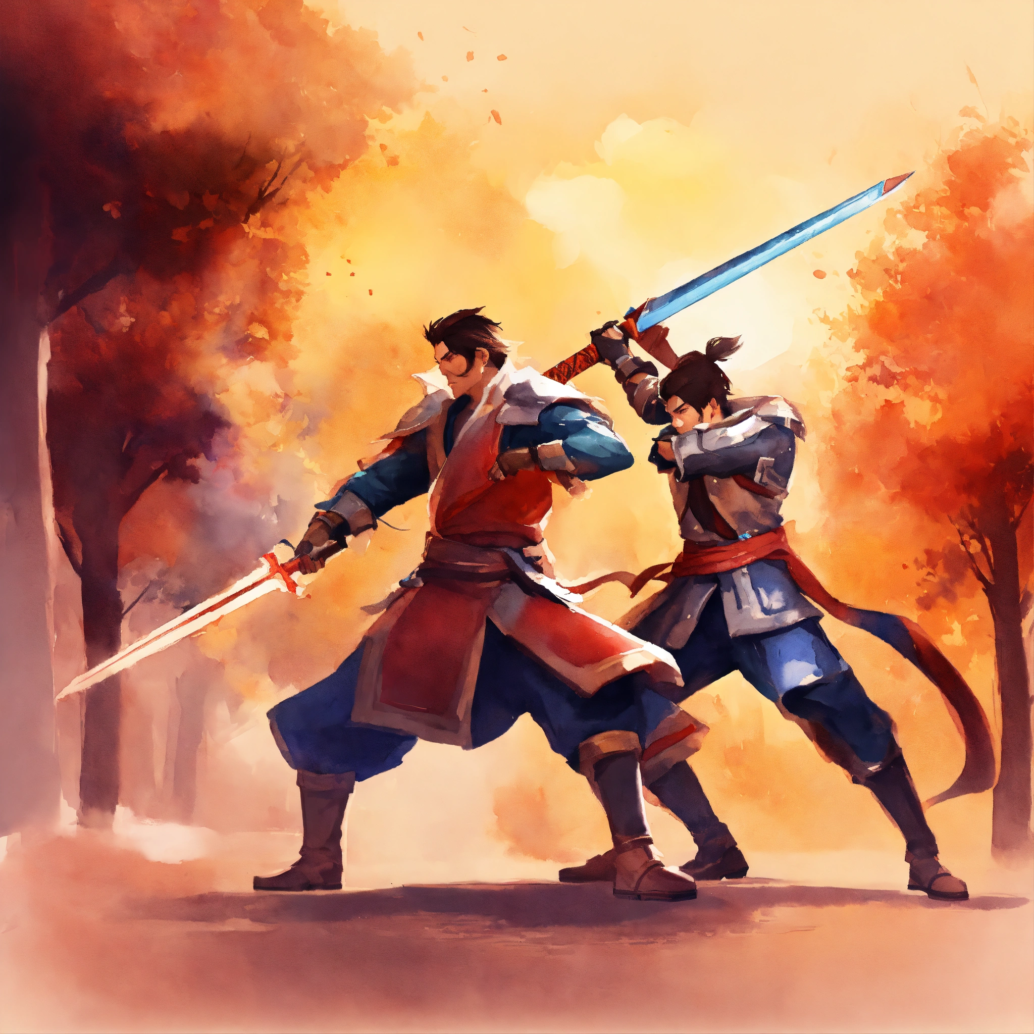 Duel weapon fighting, character talent, game icon, stylized, simple design, simple background, watercolor
