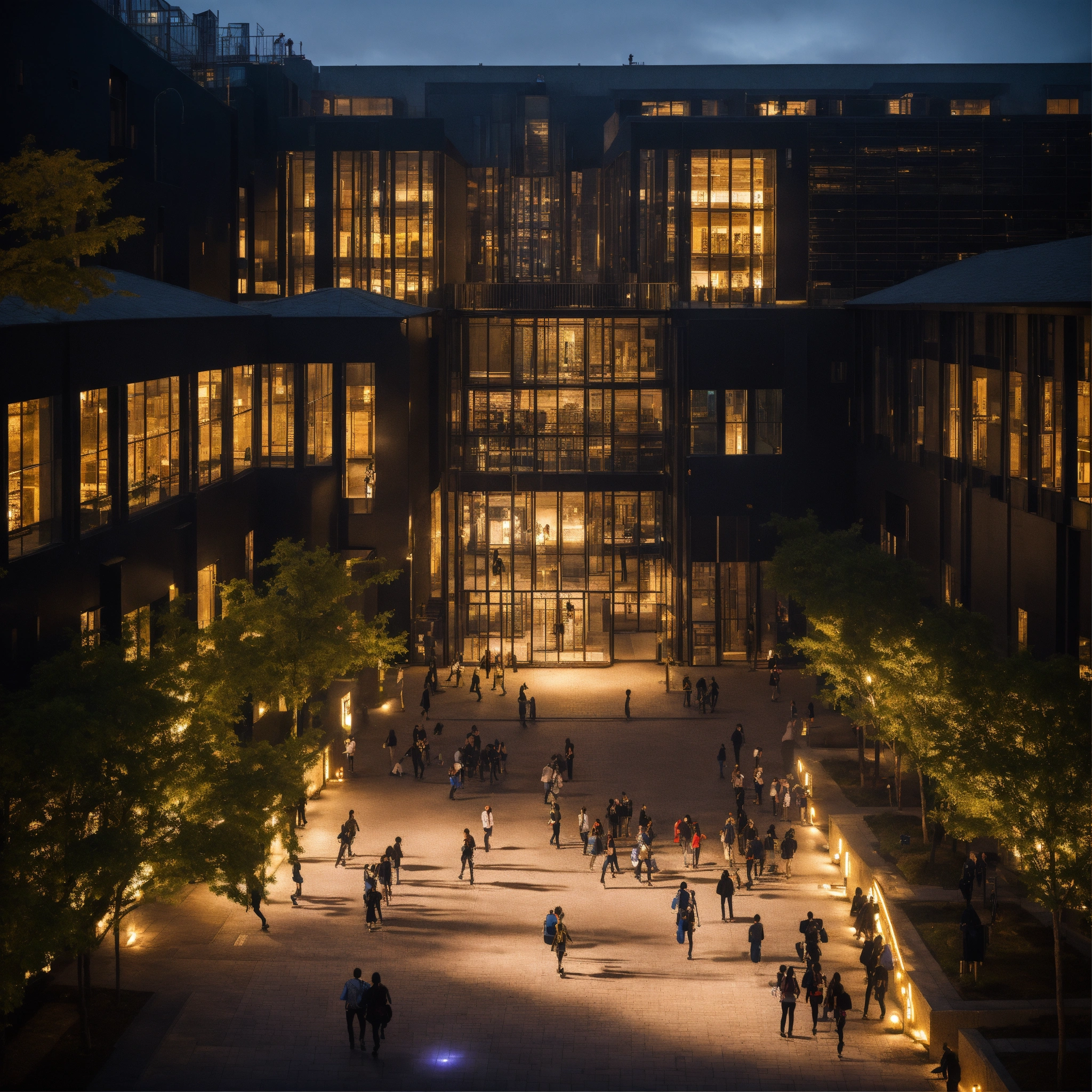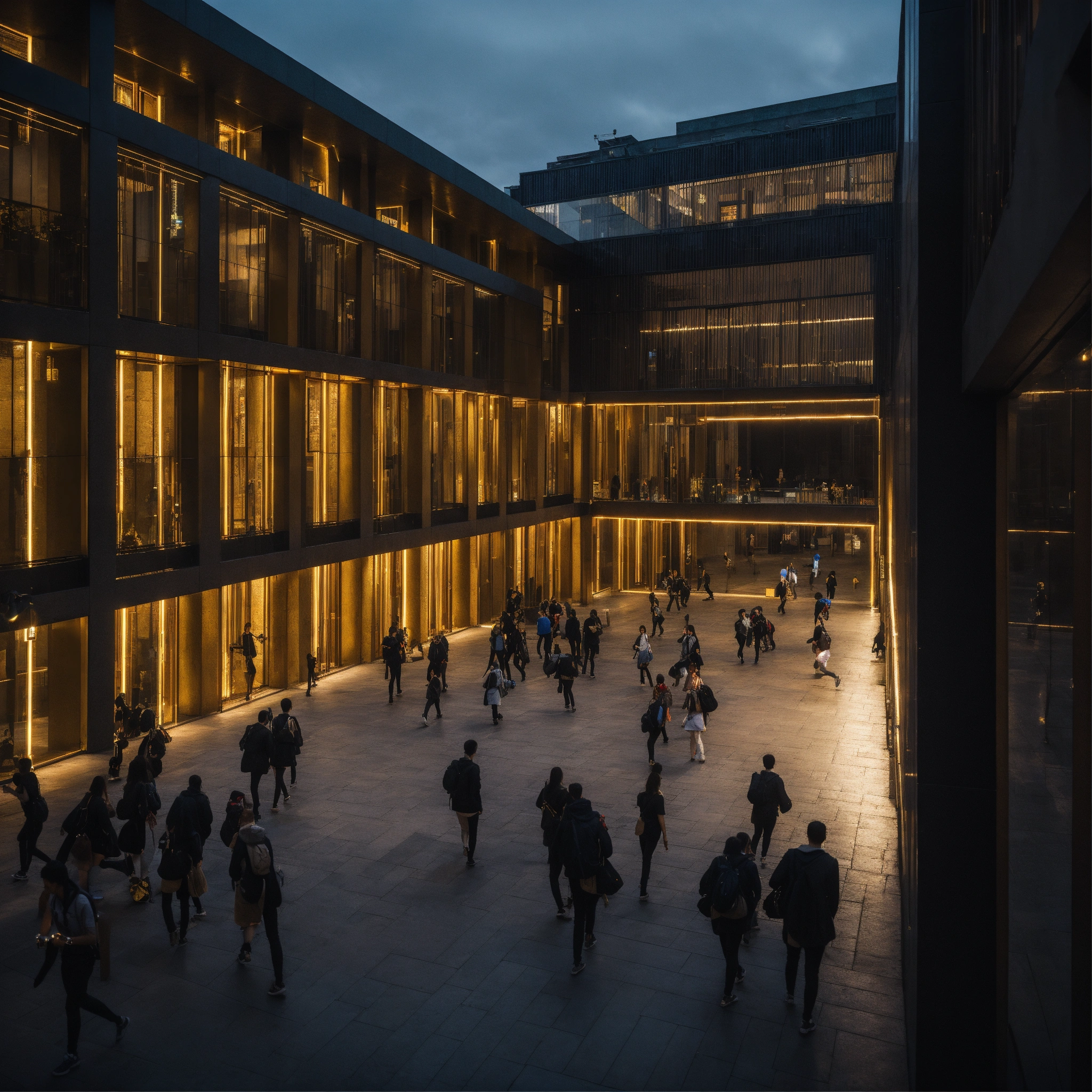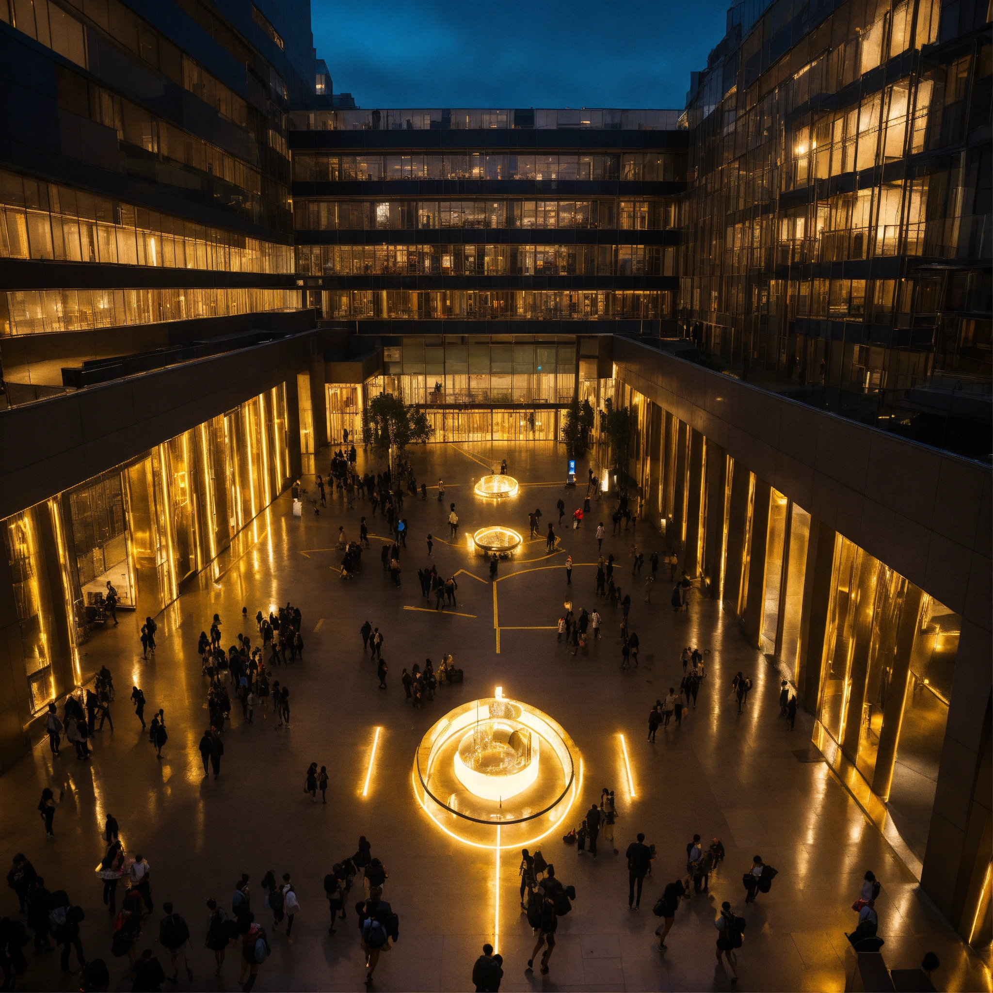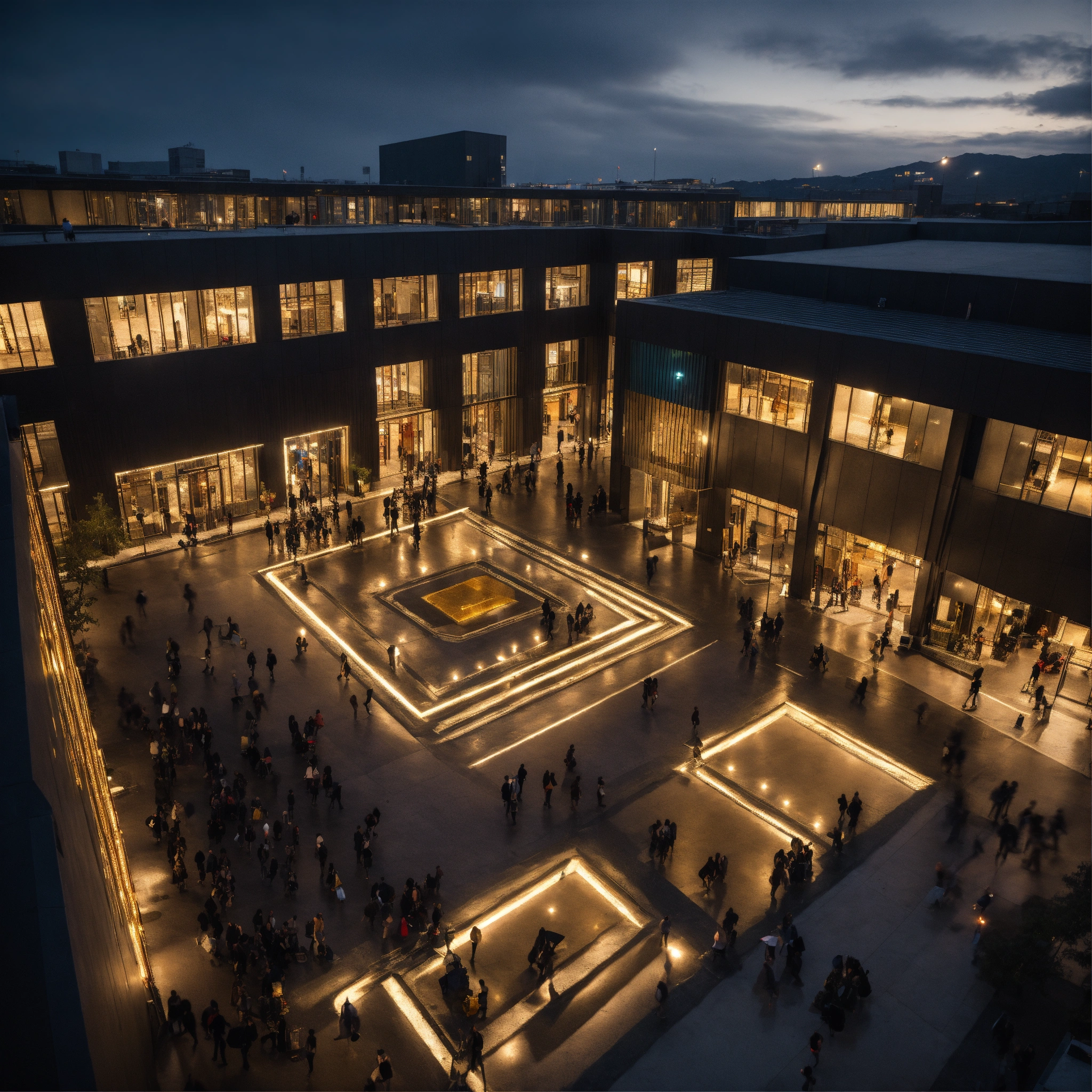A dark futuristic courtyard with many students scurrying around next to golden signs and statues and shining lights, photographed from above