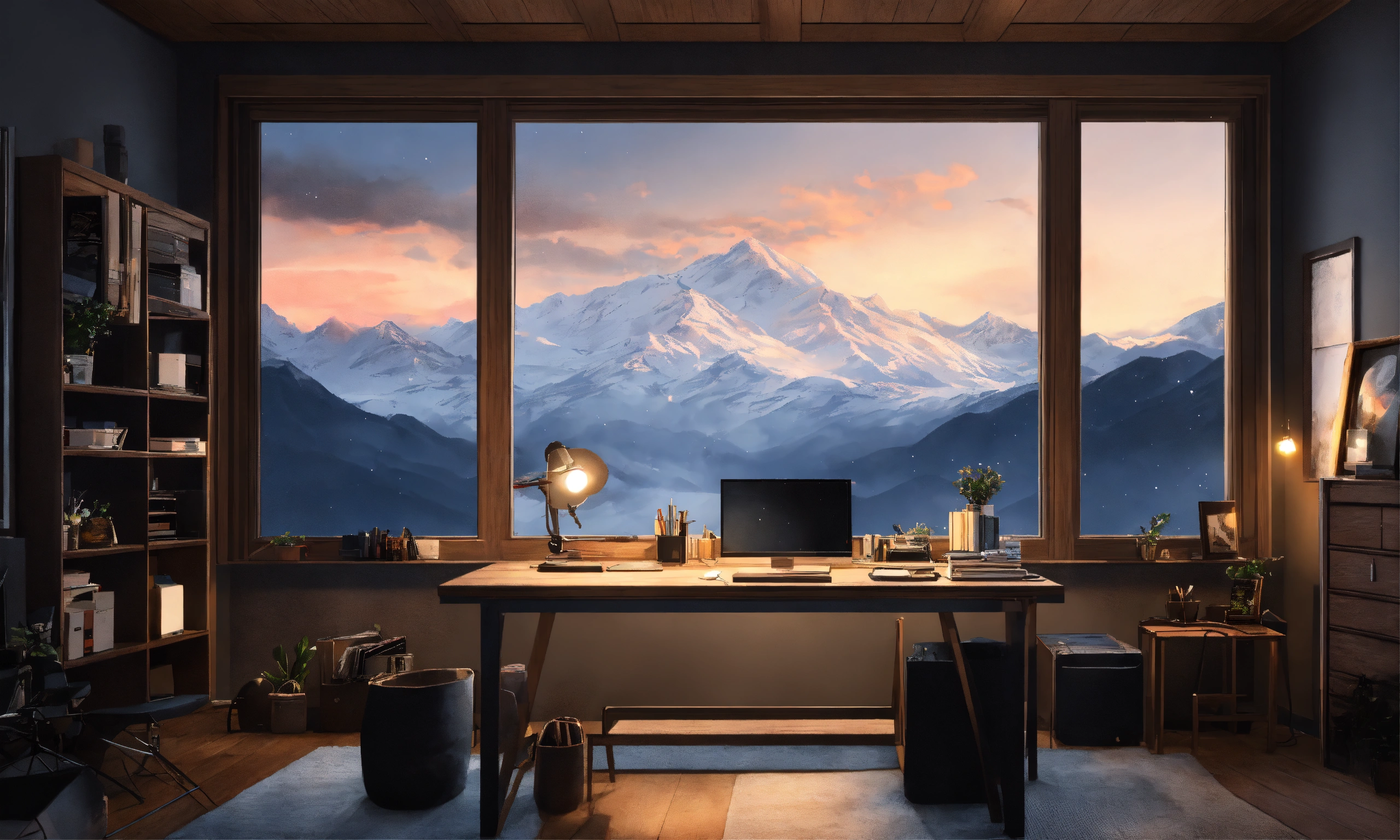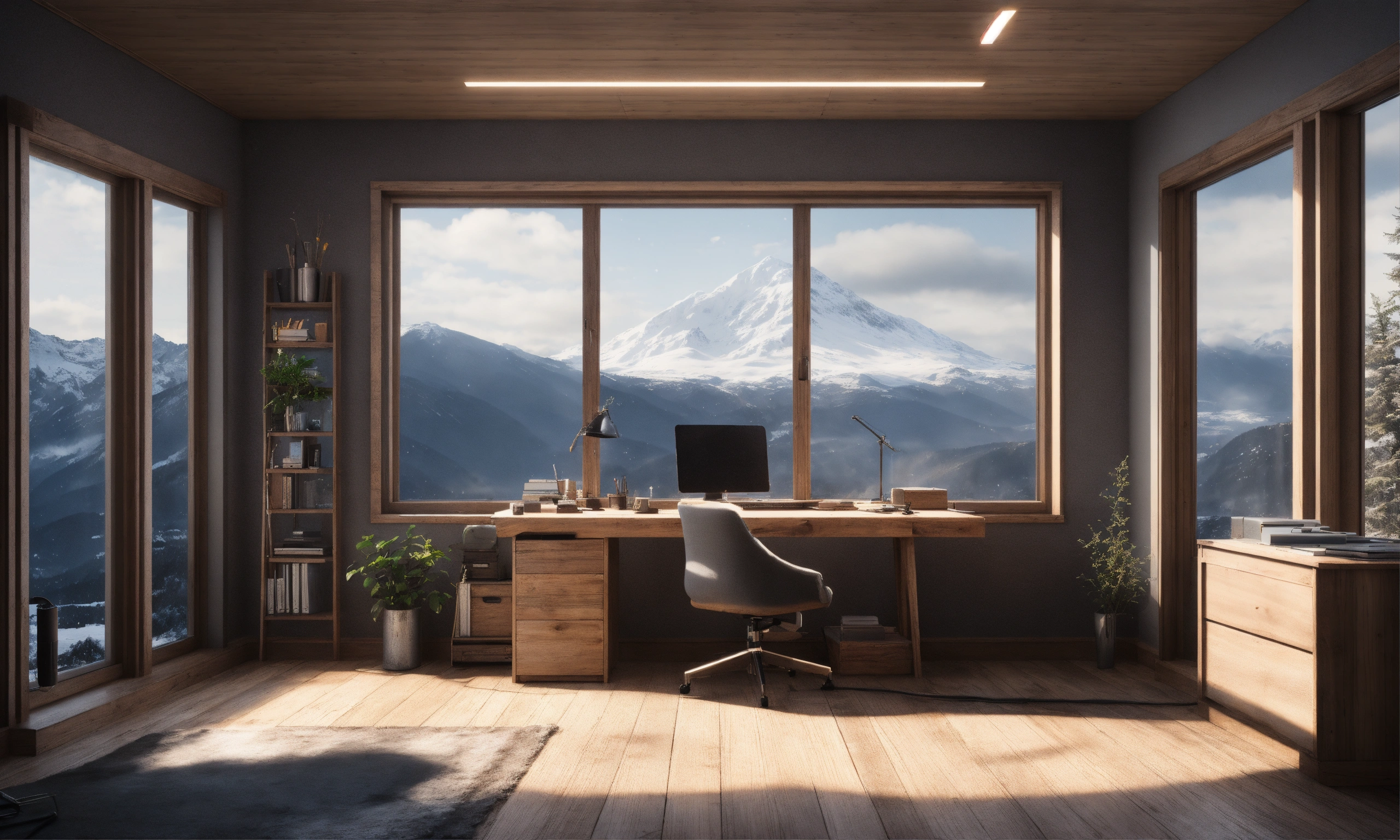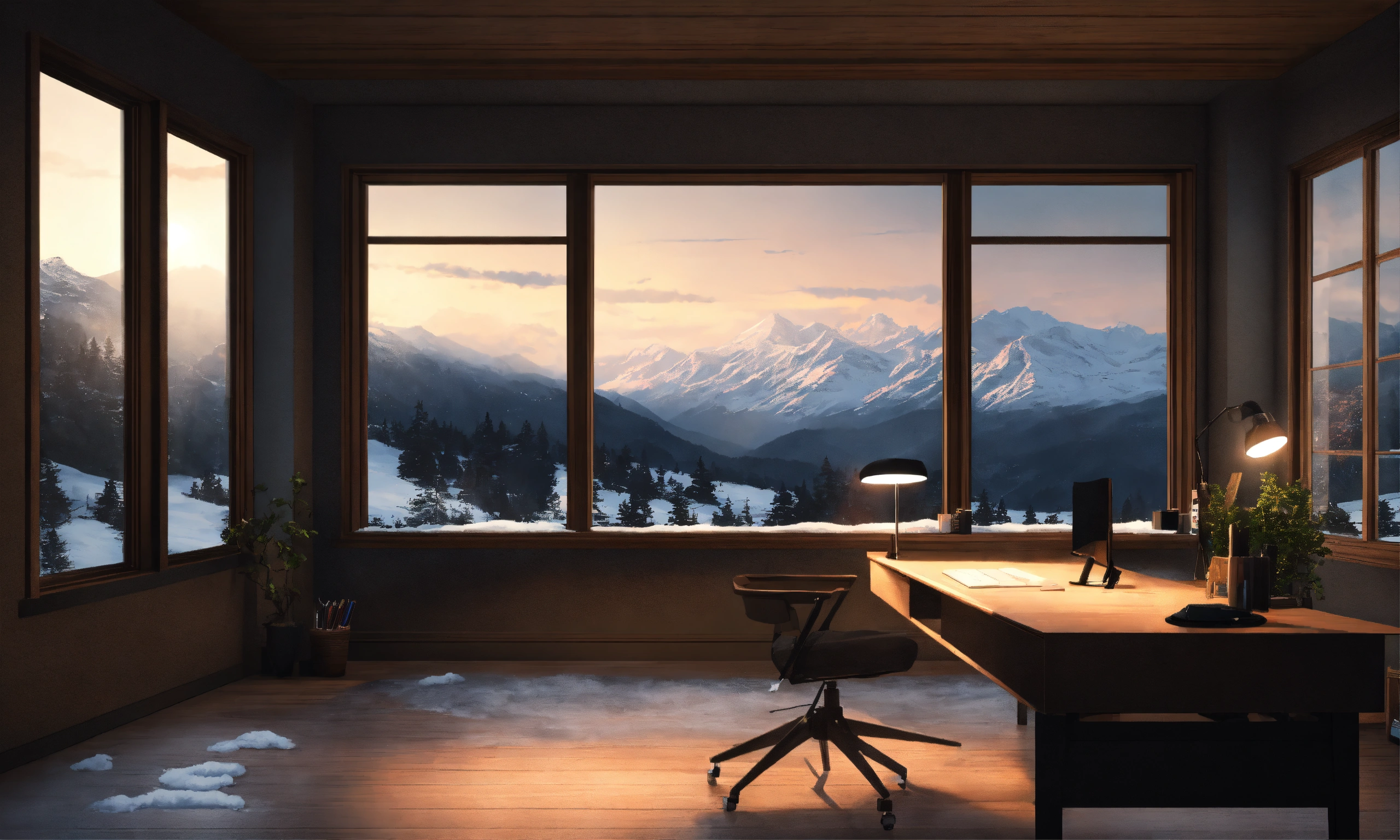 Anime minimalistic nordic home office, anime lofi art, big centered window, wooden desk against, grey walls, dark wash over the picture, air brushed, acrylic, dark wooden room, view over snowy mountains