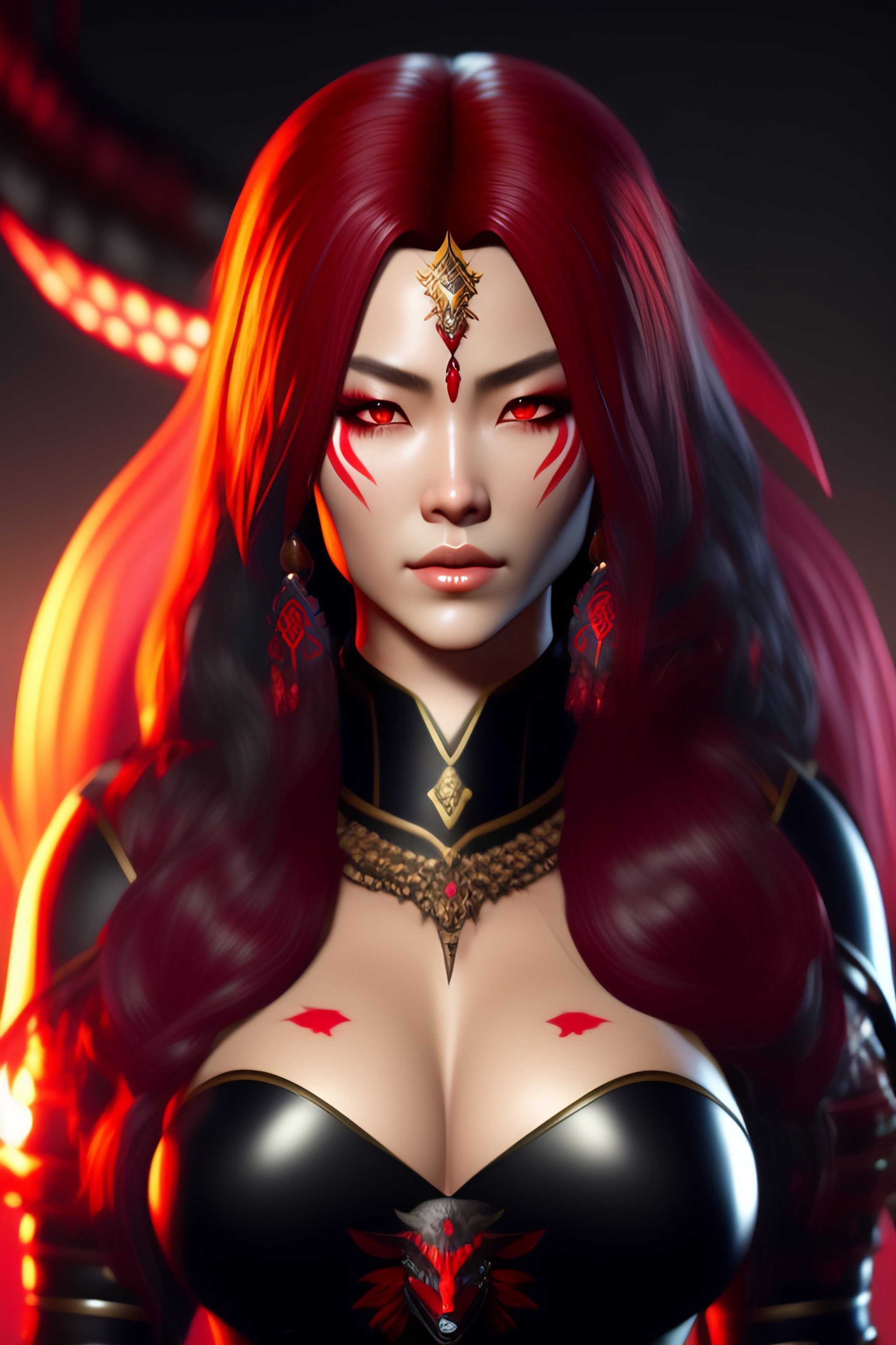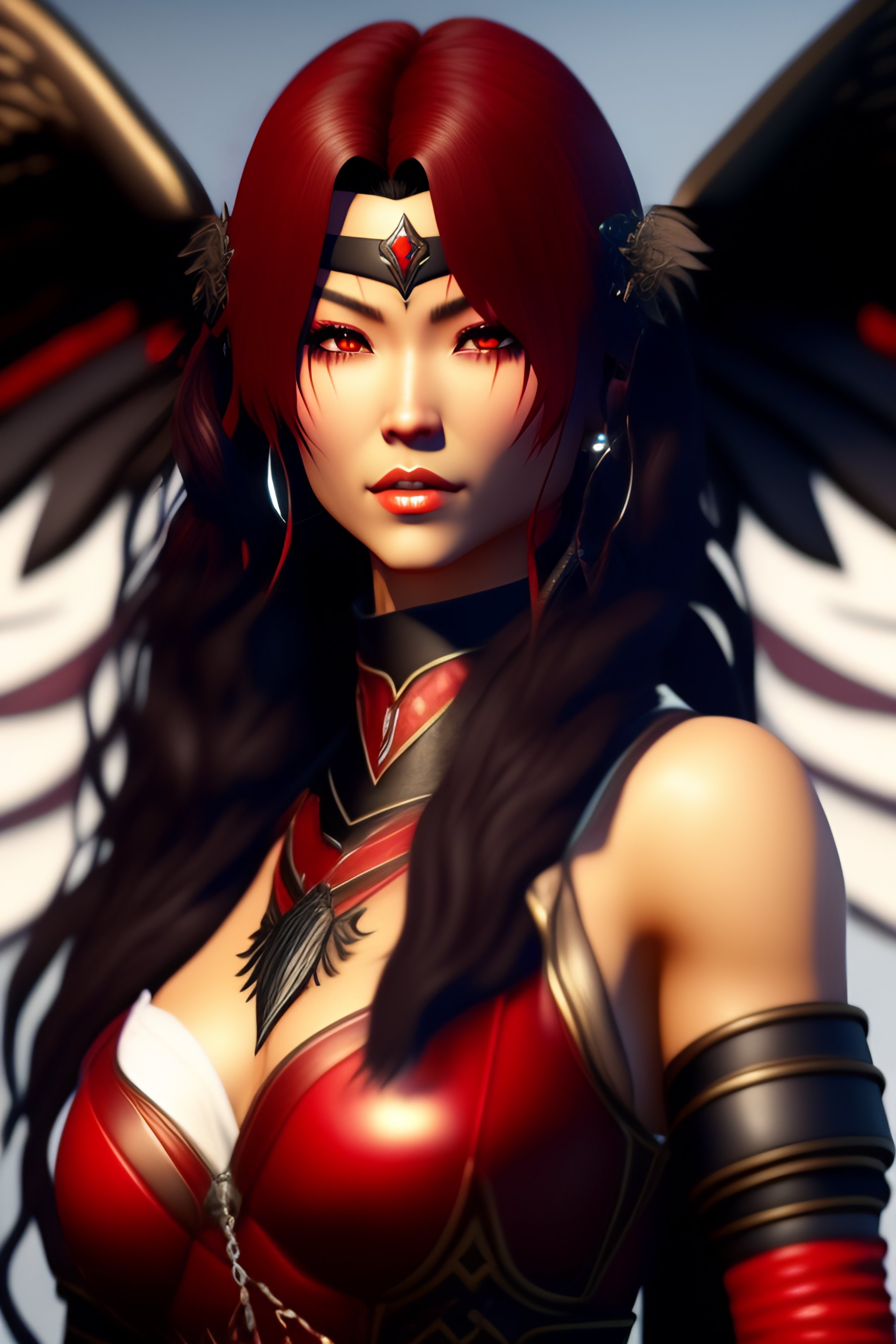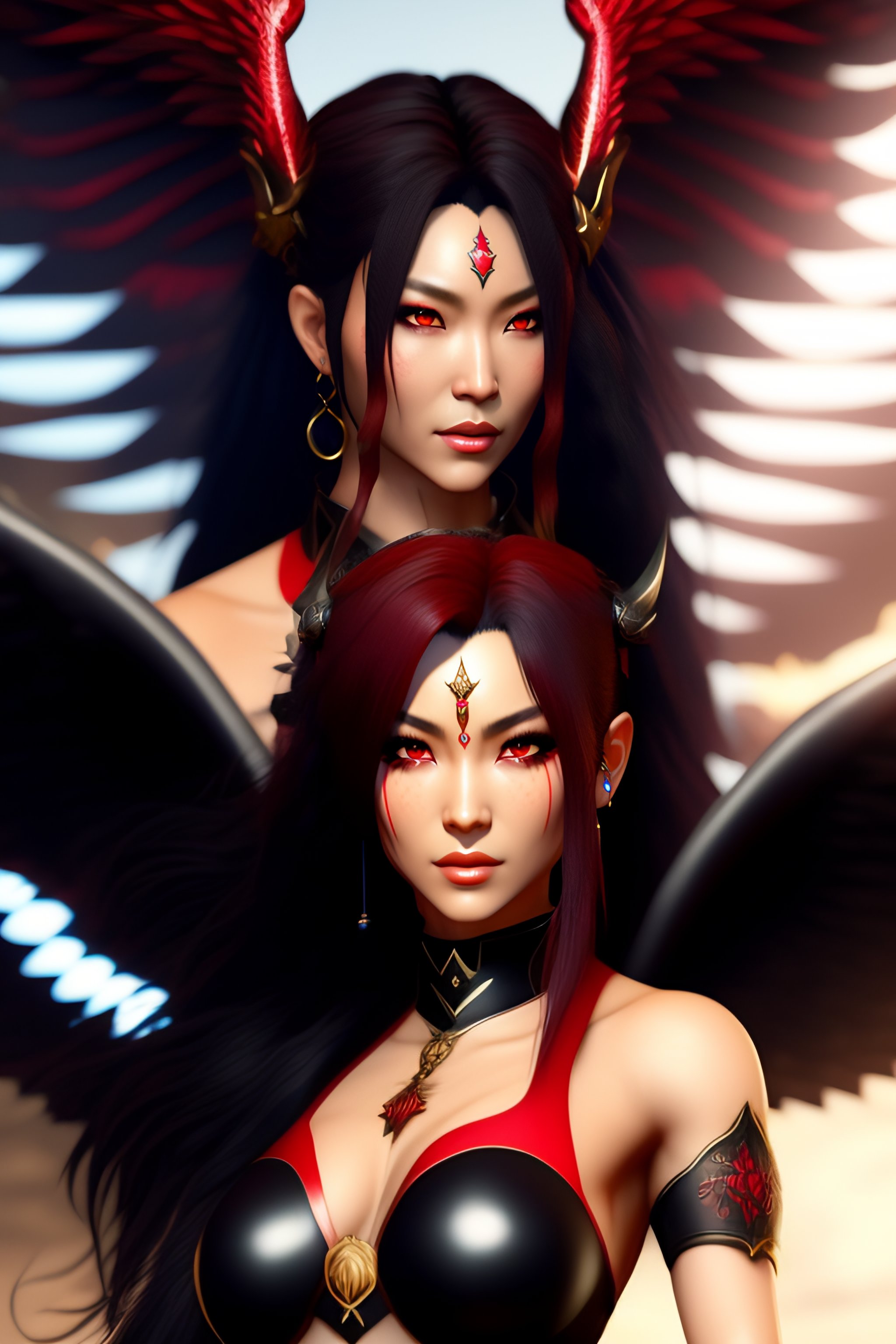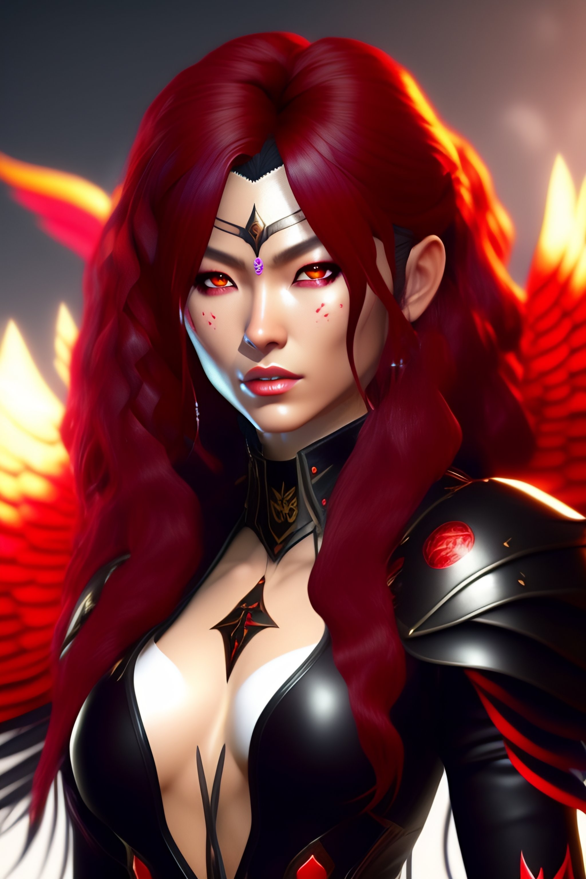 New female character from genshin impact, dark red hair with black streaks, long hair, red glowing eyes, dark gray skin, cow horns on the sides of the head, black eagle wings on the back, demoness