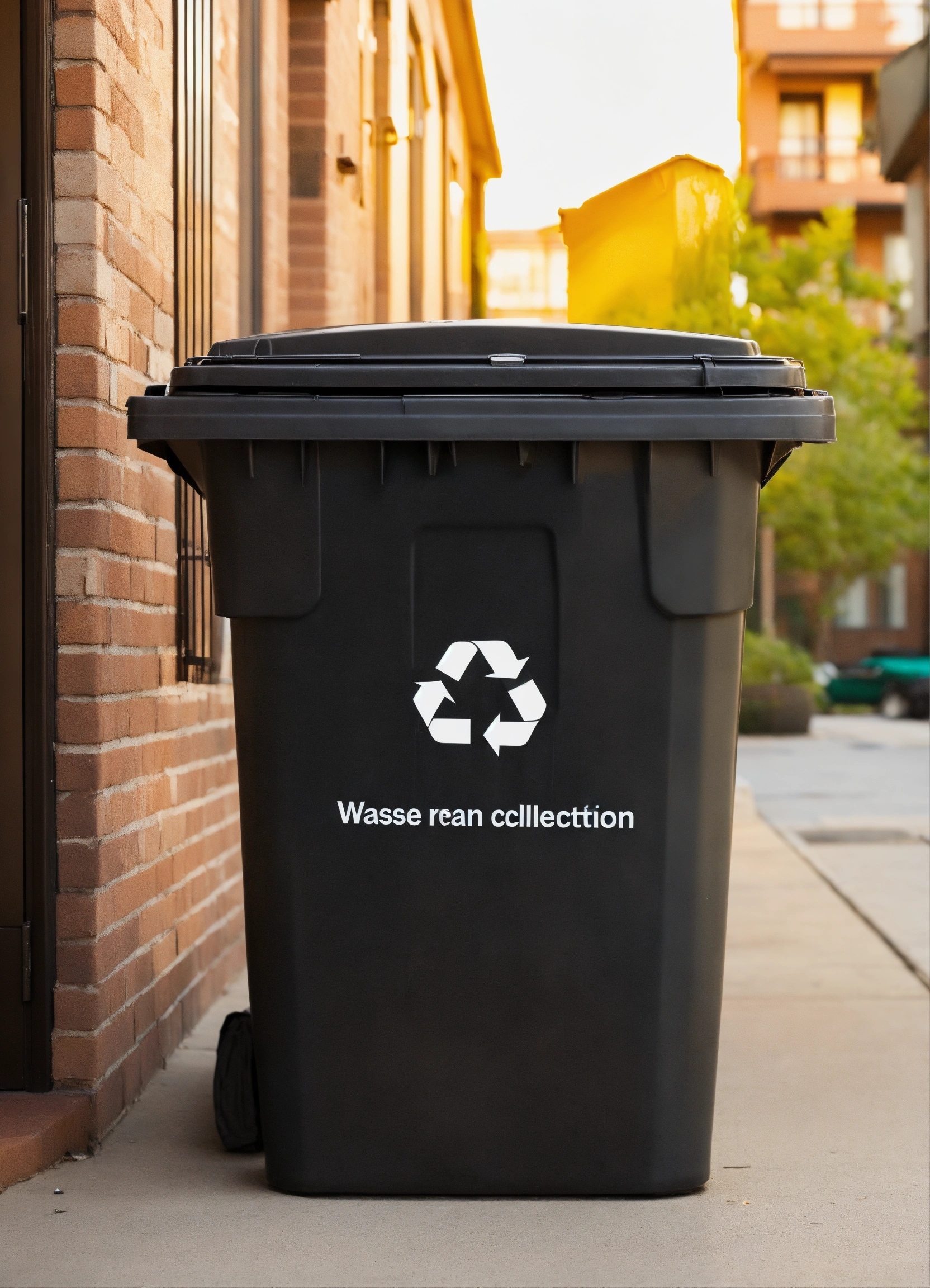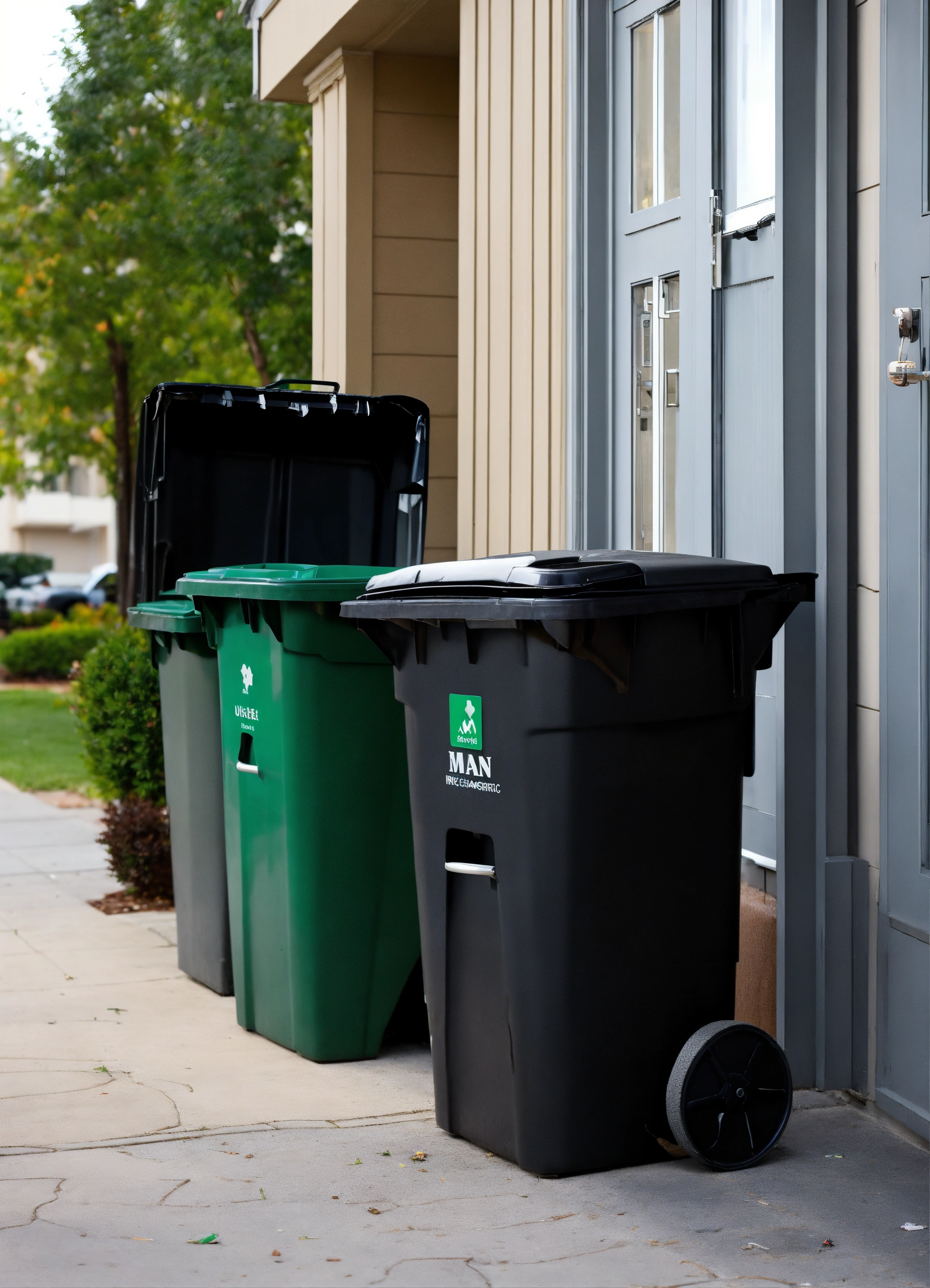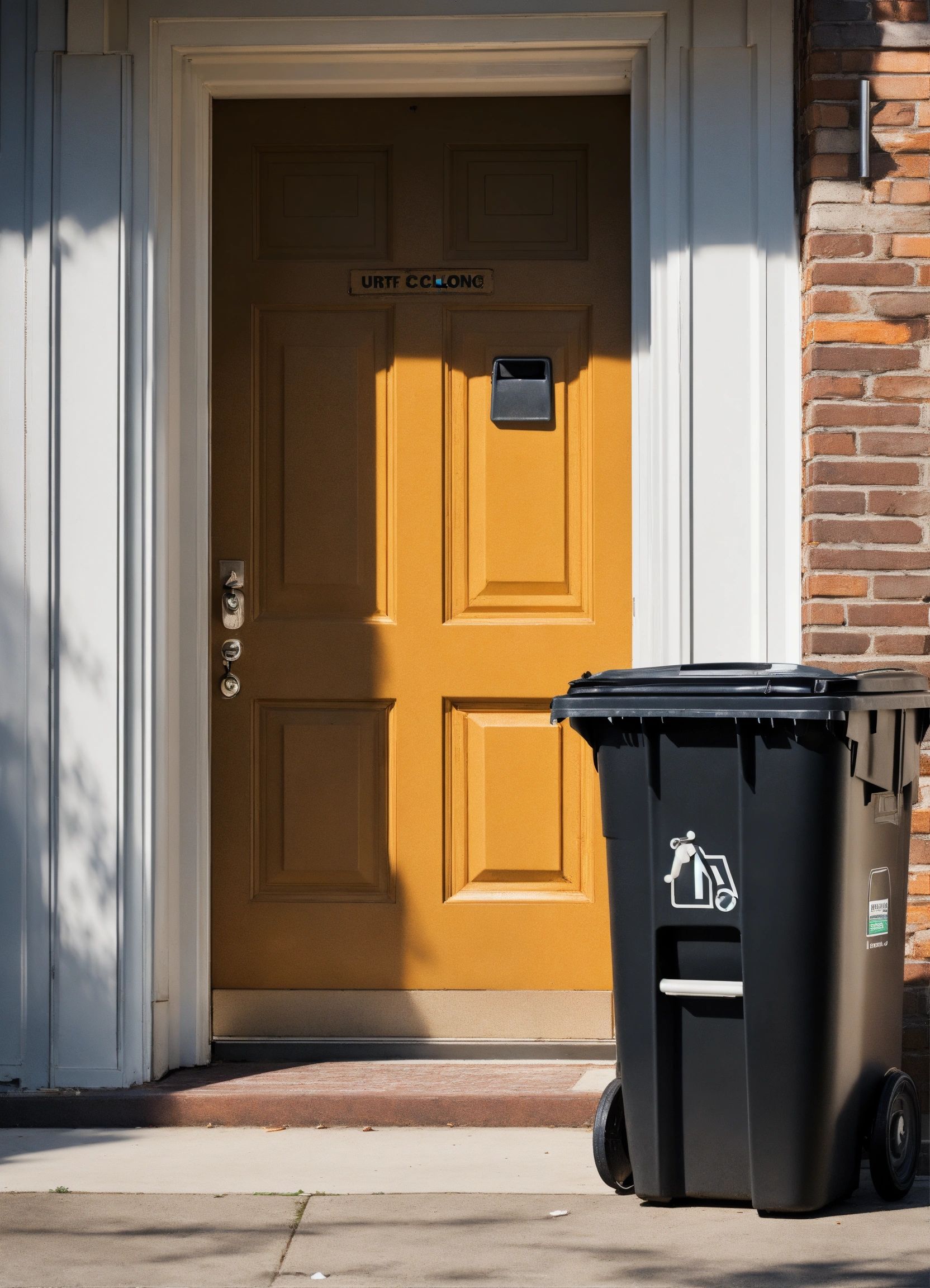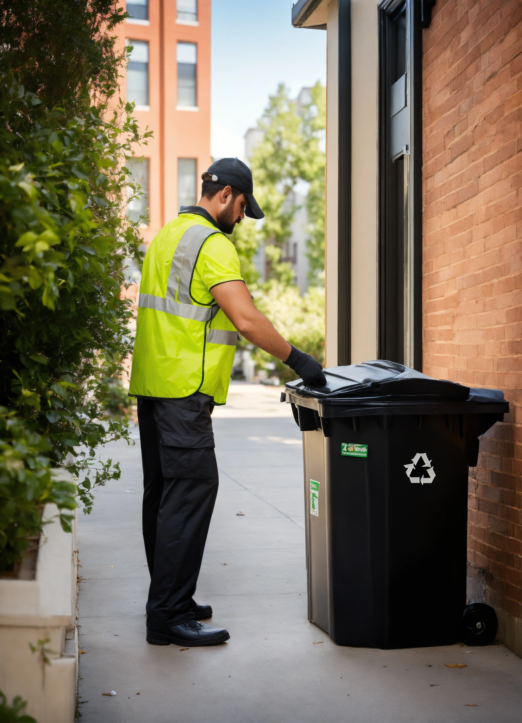 Waste management, man, professional, trash collection, service, apartment, convenience, ultra realistic, single small black bin in front of apartment door, removing full trash bag.