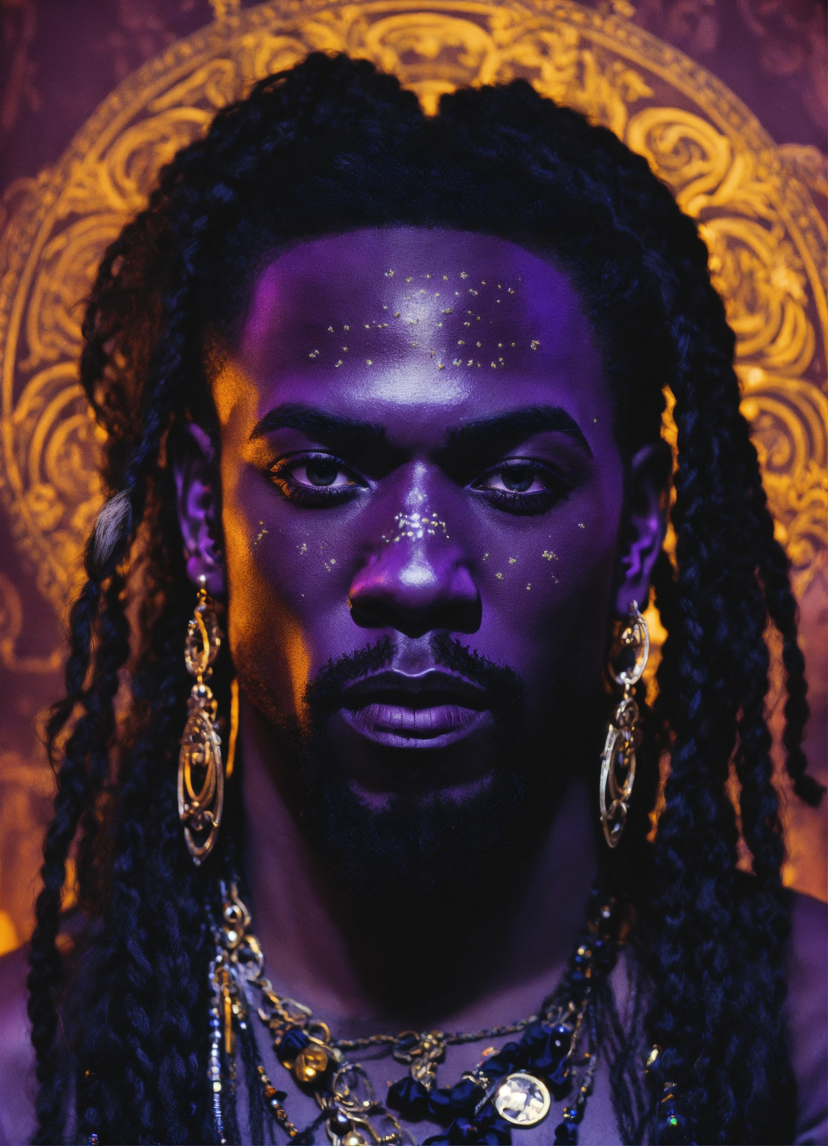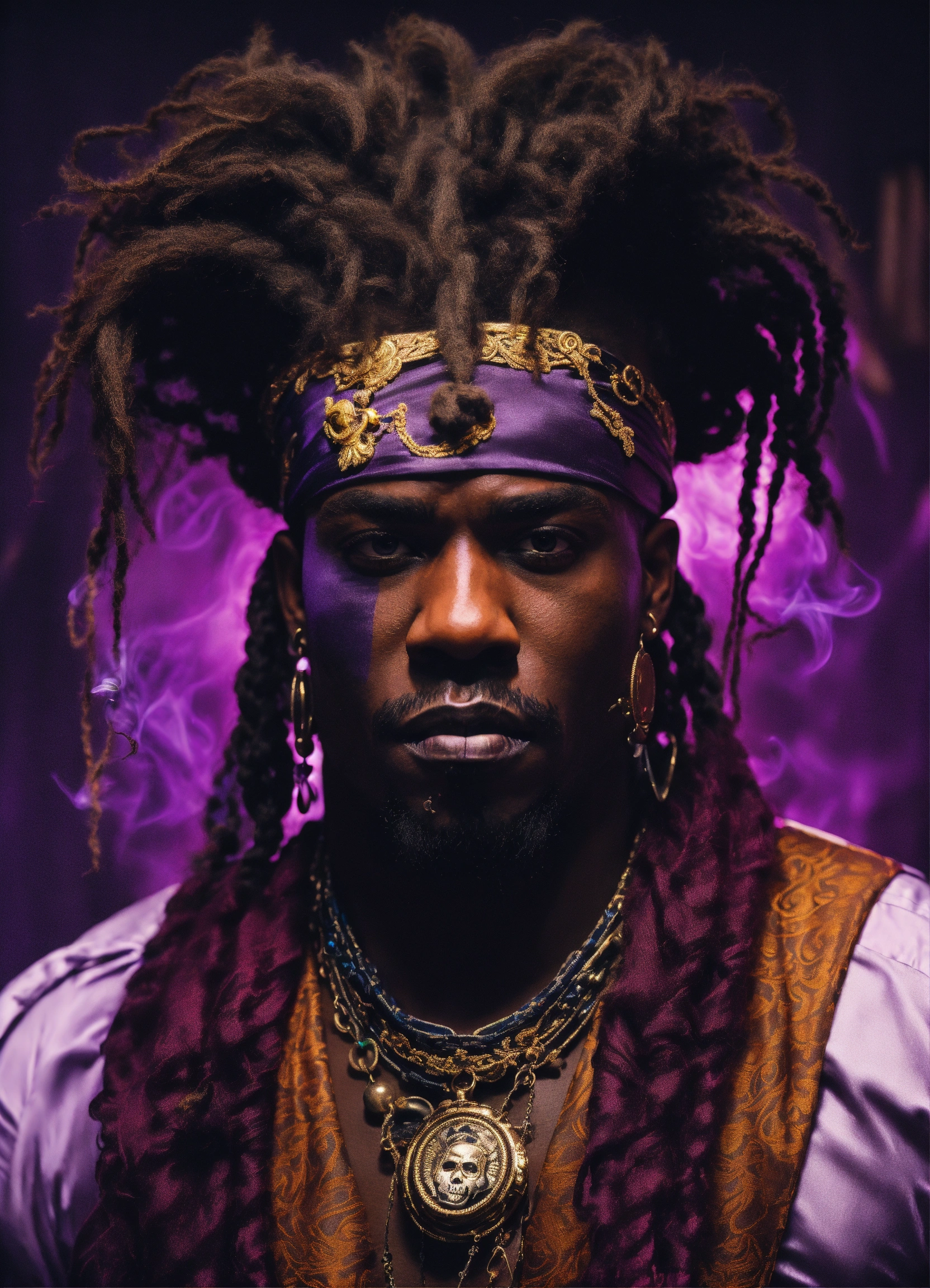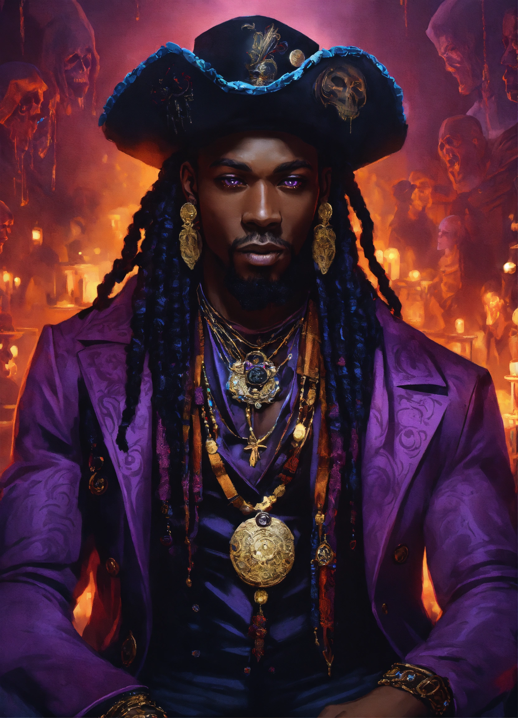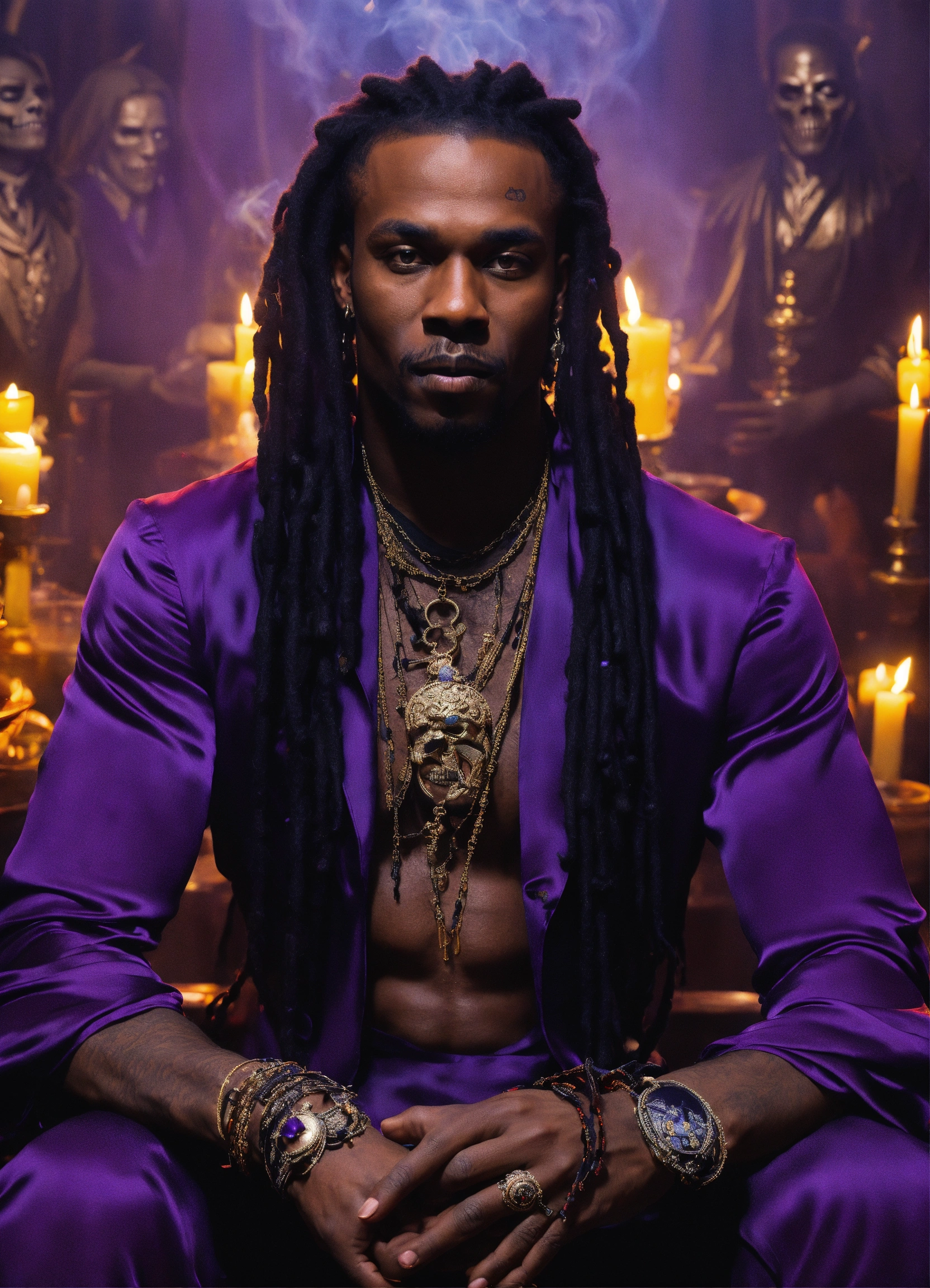 A black man with ornate dreadlocks piercing deep purple eyes broad shouldered muscular he wears black and purple silk similar to baron samedi and papa midnight surrounded by ghosts, parties, alcohol, smoking, and general merrymaking.