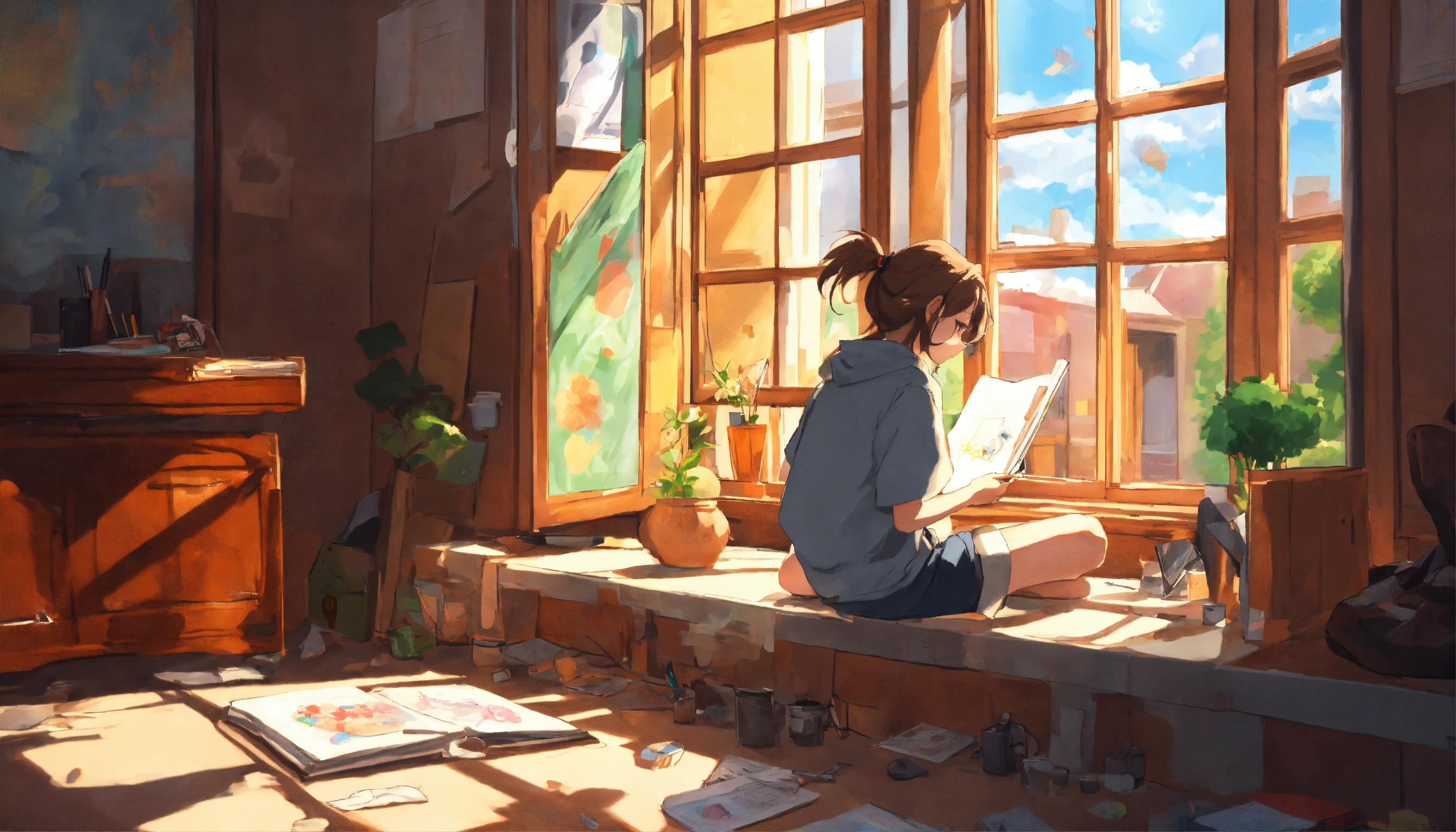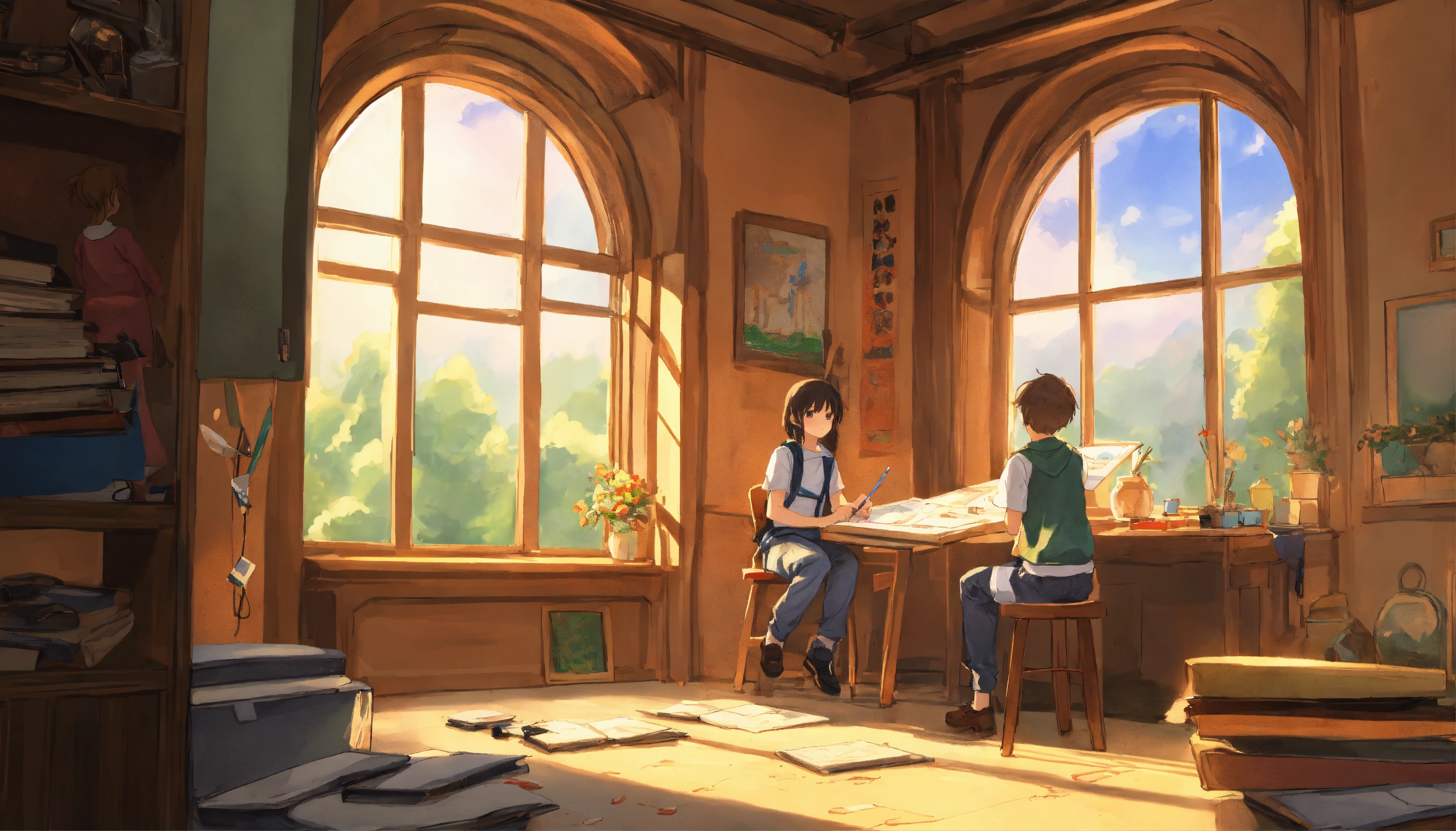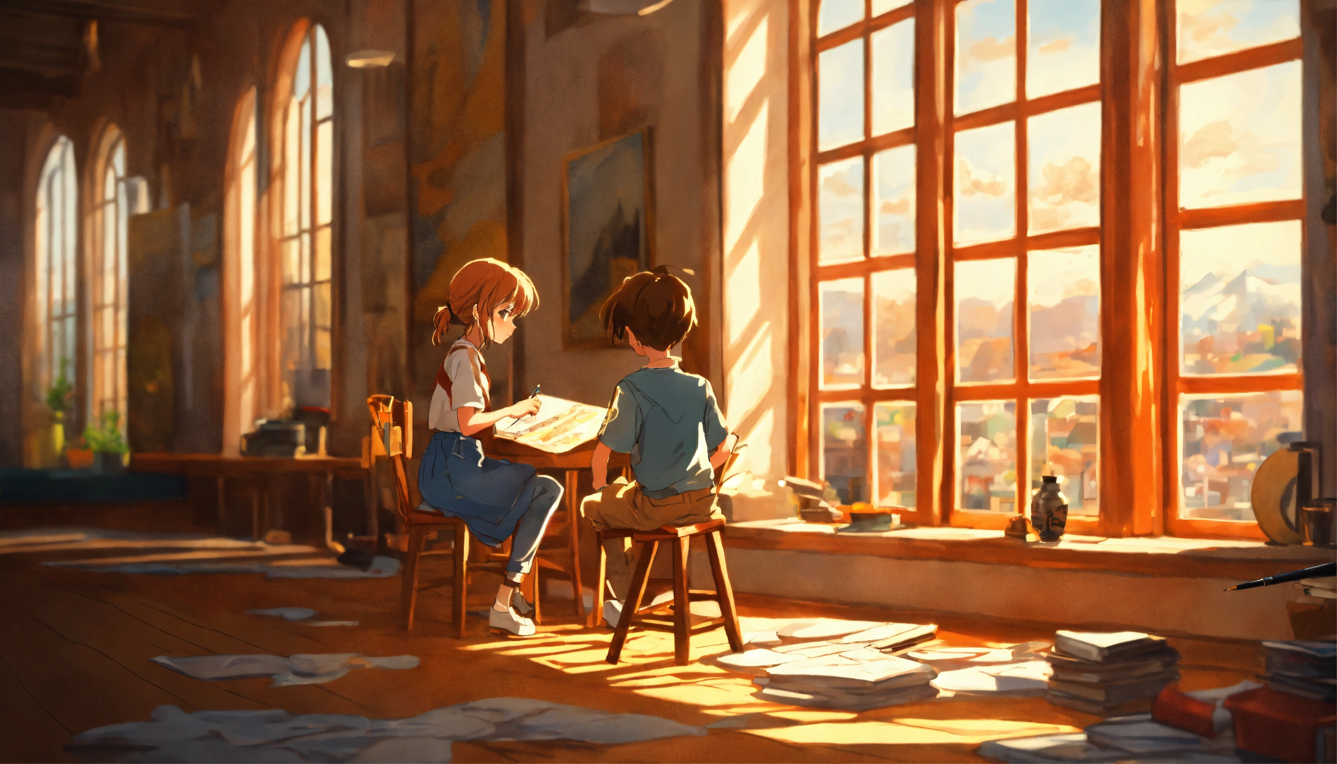 Anime style, a girl draws a still life with plaster in a large art hall. boy sits on the window and looks out the window, holding an album and a pencil. wide angle lens