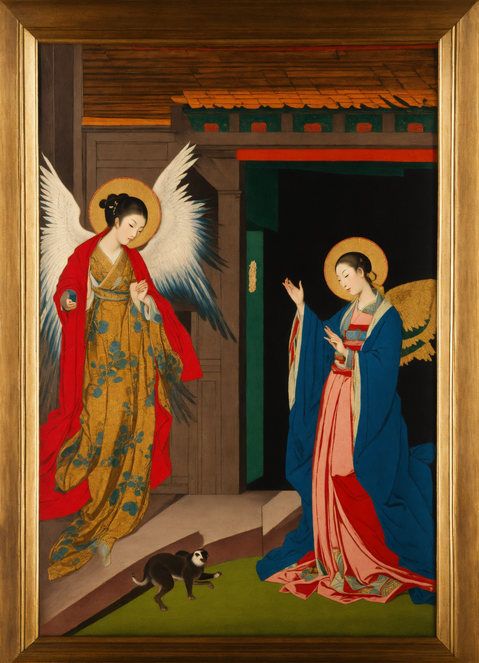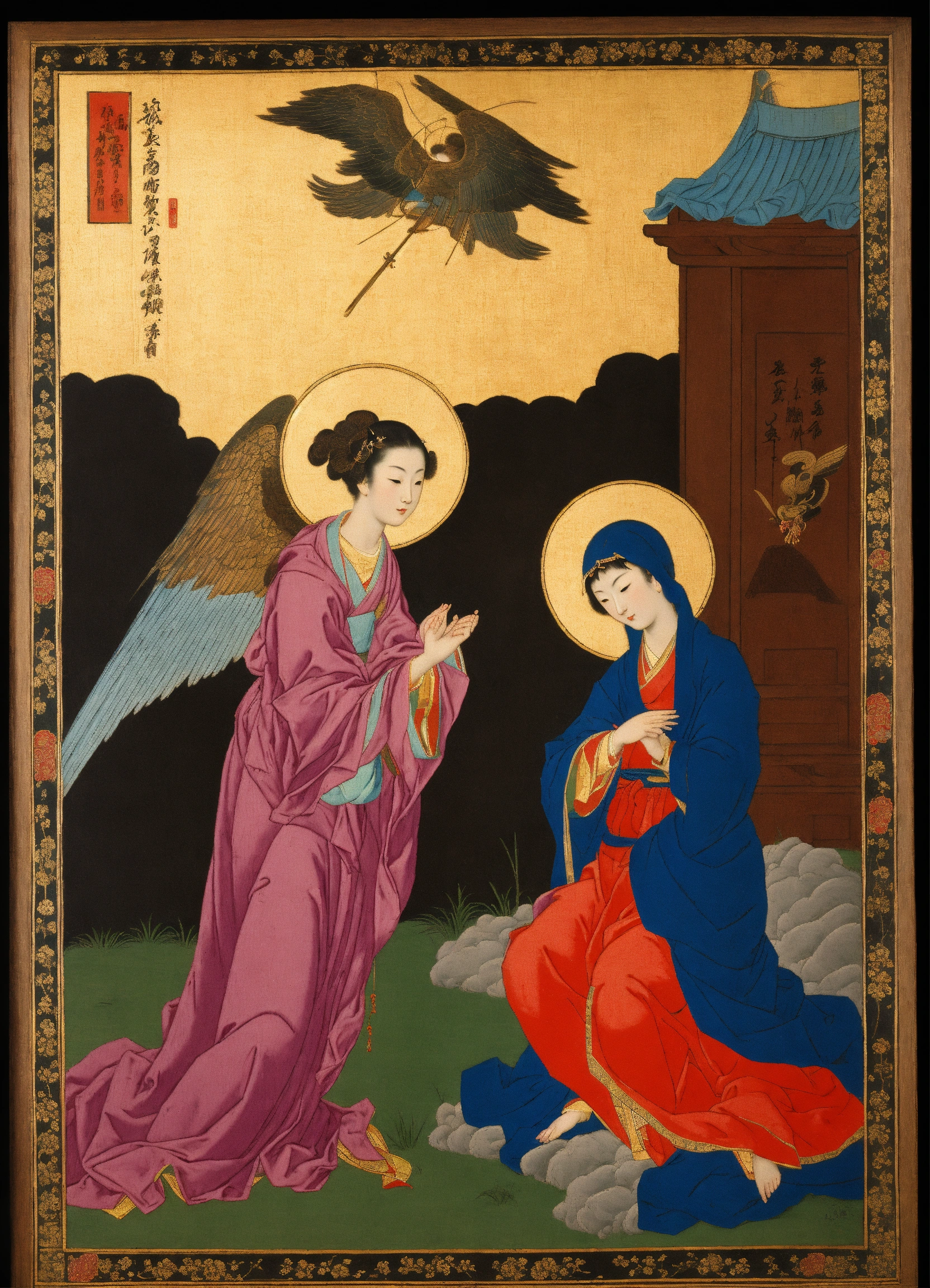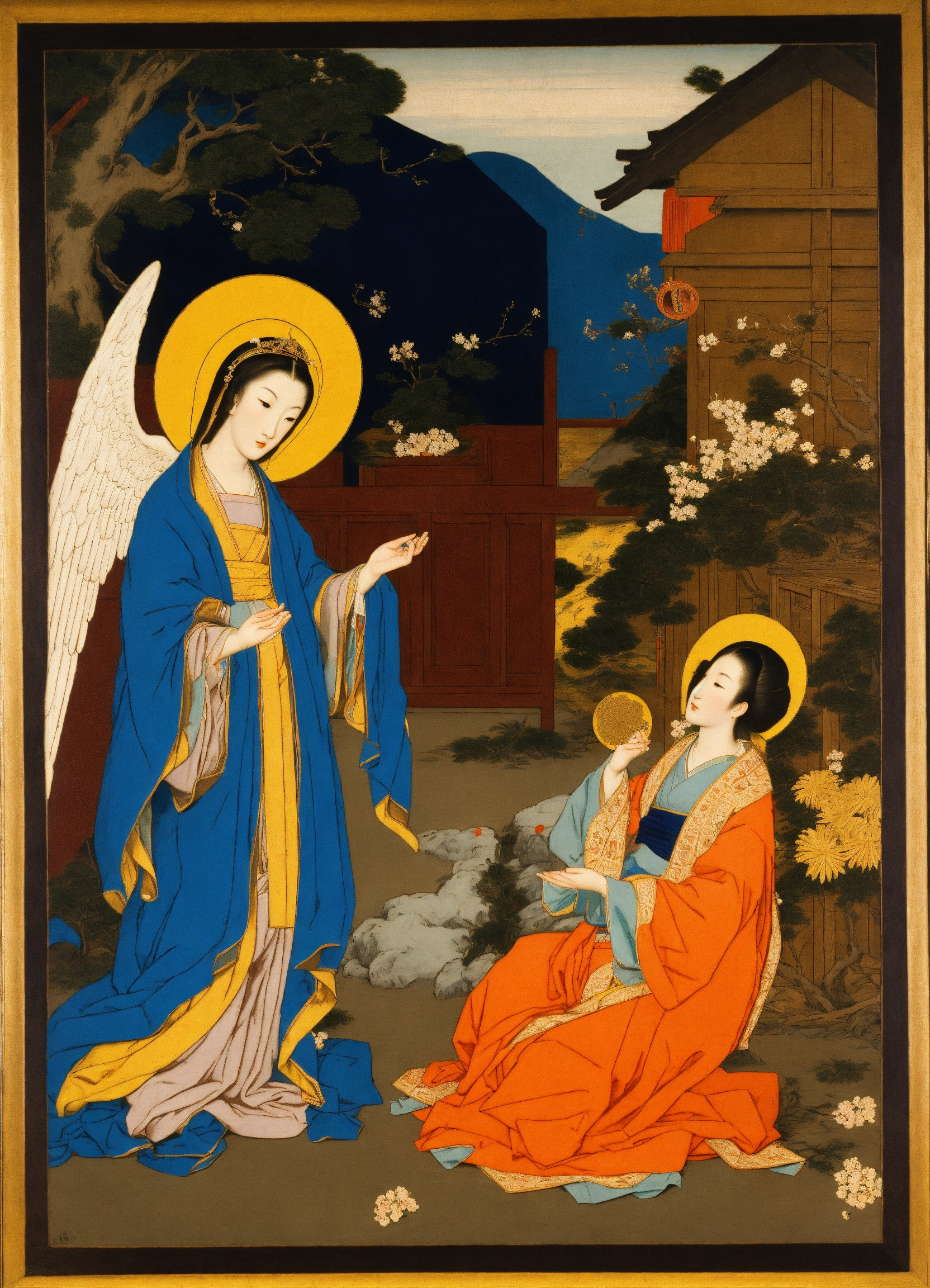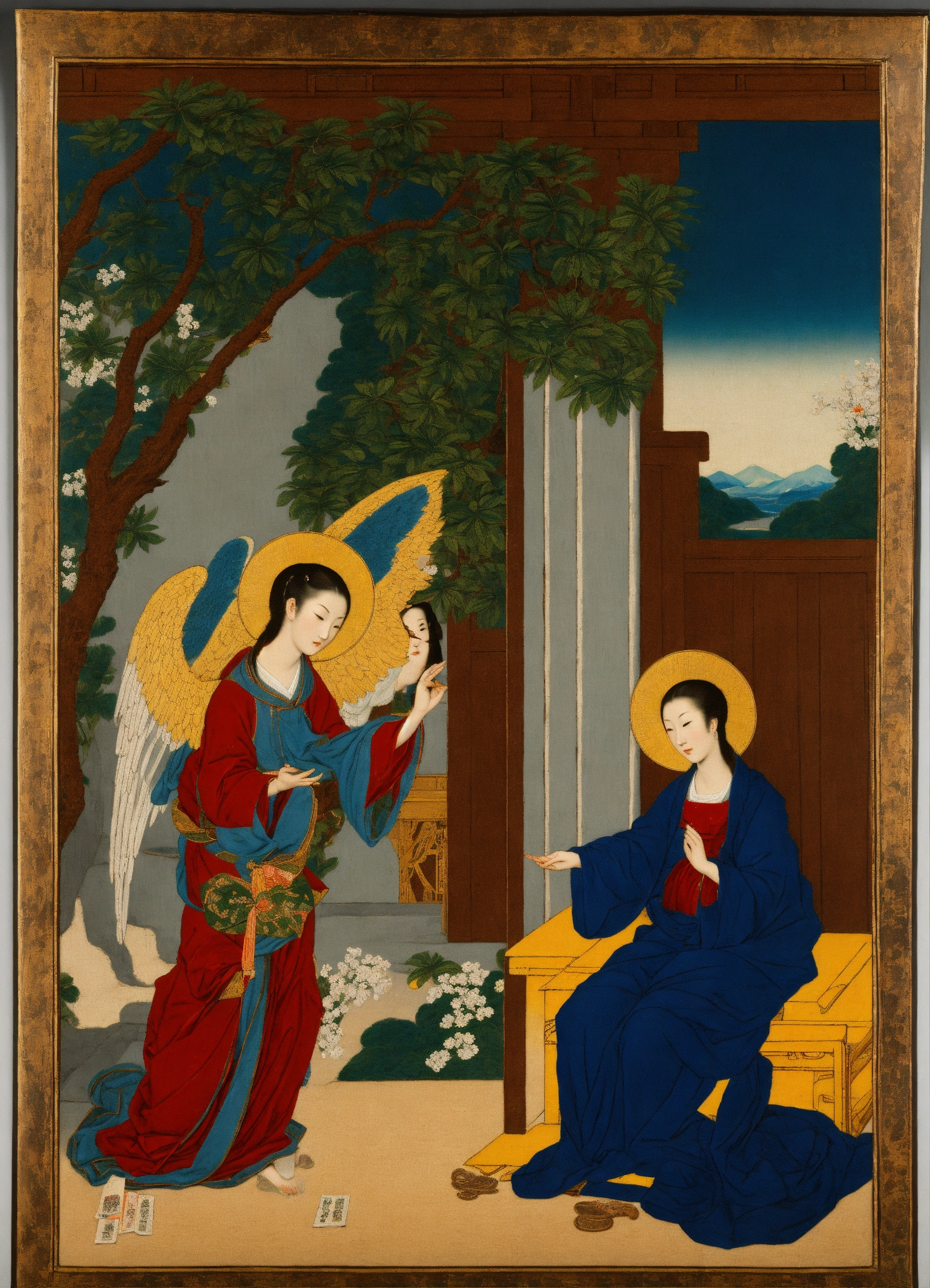 Edo period art depicting the annunciation of the lord to the virgin mary by the archangel gabriel, vibrant color, woodblock print, asian, christian, gospel of luke, japanese art, masterpiece, detailed scenery, the annunciation by el greco, the annunciation by paolo de matteis