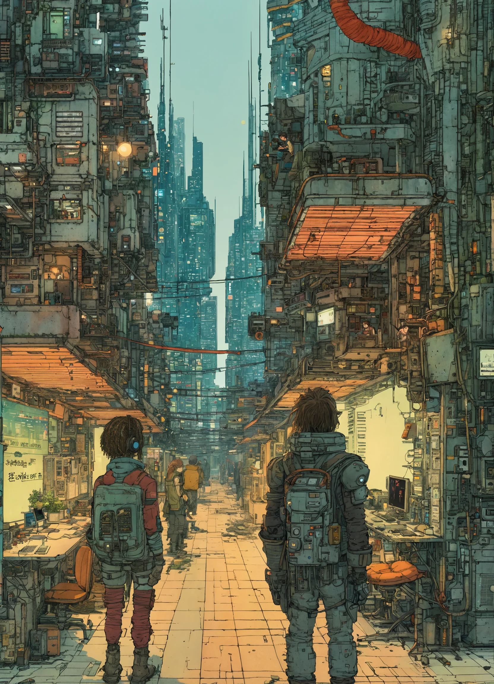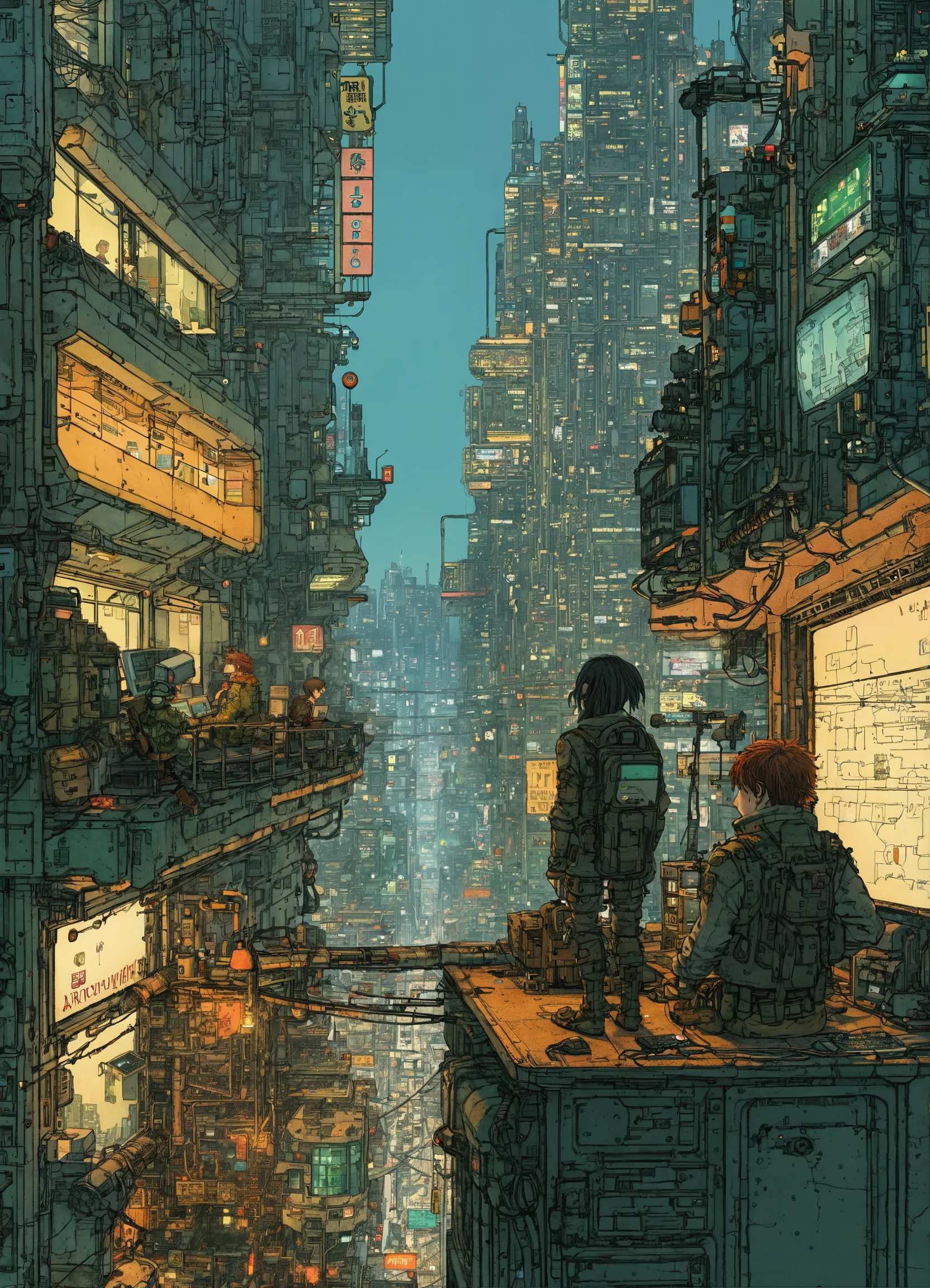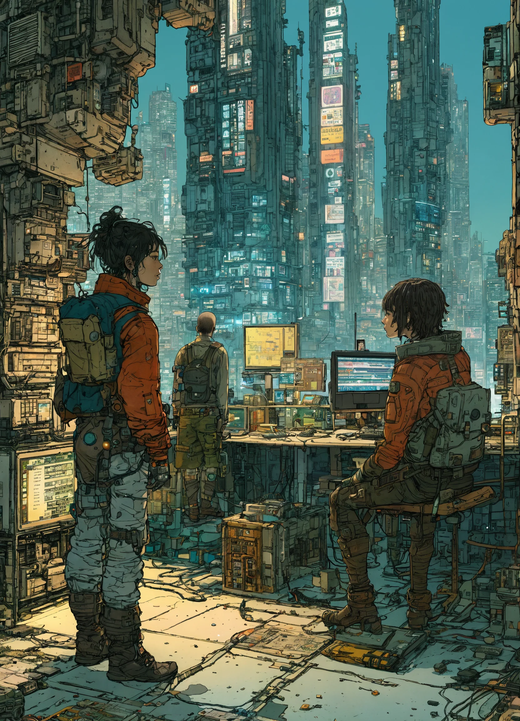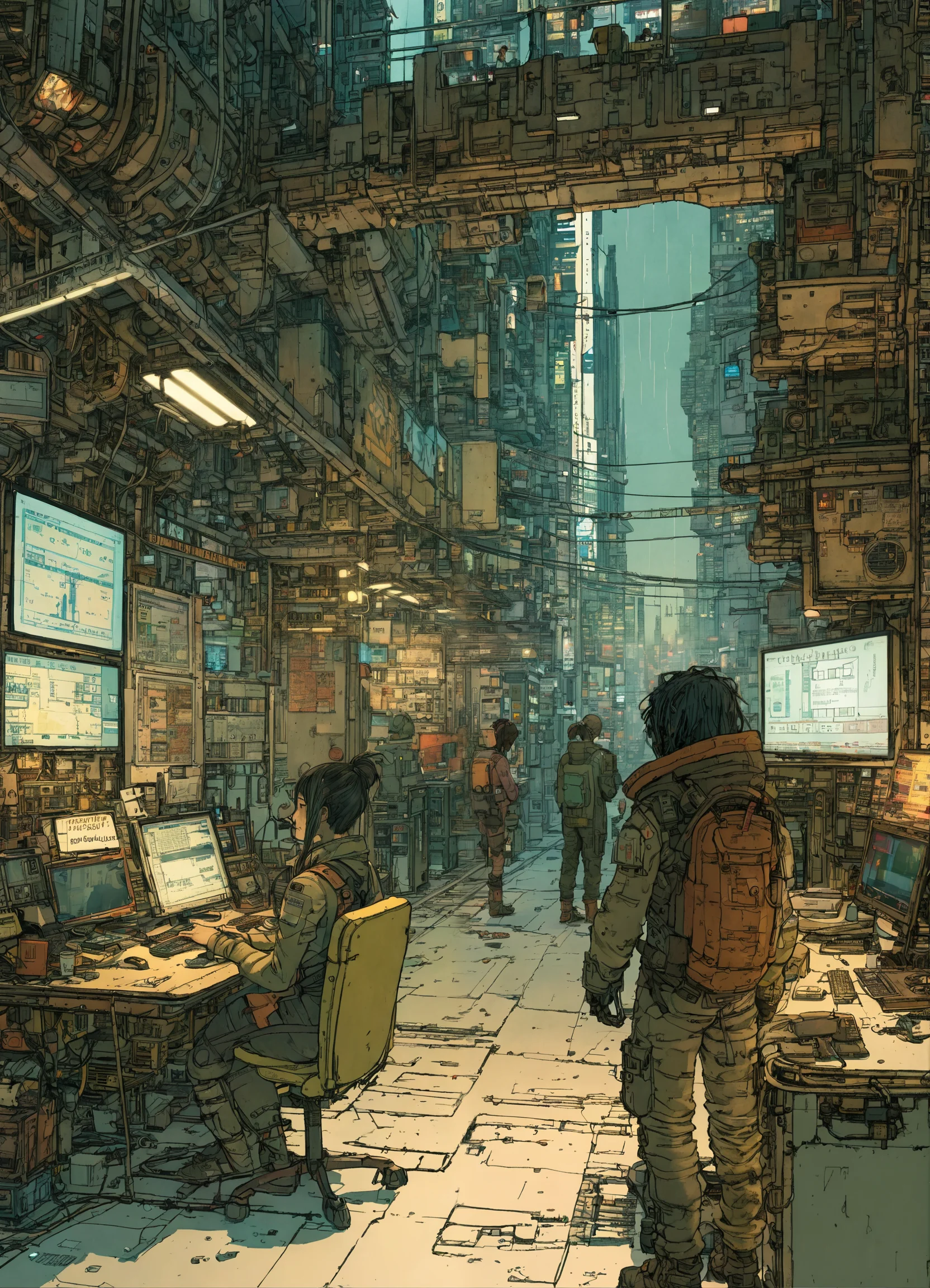 Futurepunk team of software engineers, office in cyberpunk megacity, assembled cast, atmospheric lighting, over the shoulder angle perspective, ultra-high definition (uhd), very detailed, by mattias adolfsson