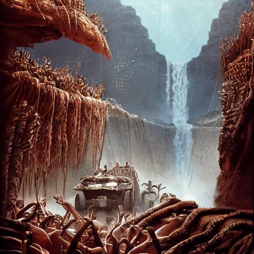 A crowd of tribal people cheer with joy as a torrent of water pours down a huge cliff, concept art for the film mad max fury road, biblical, dramatic, insanely detailed, by dan mumford, yusuke murata, makoto shinkai, ross tran, intricate detail, cinematic, 8 k, featured on artstation, pixiv