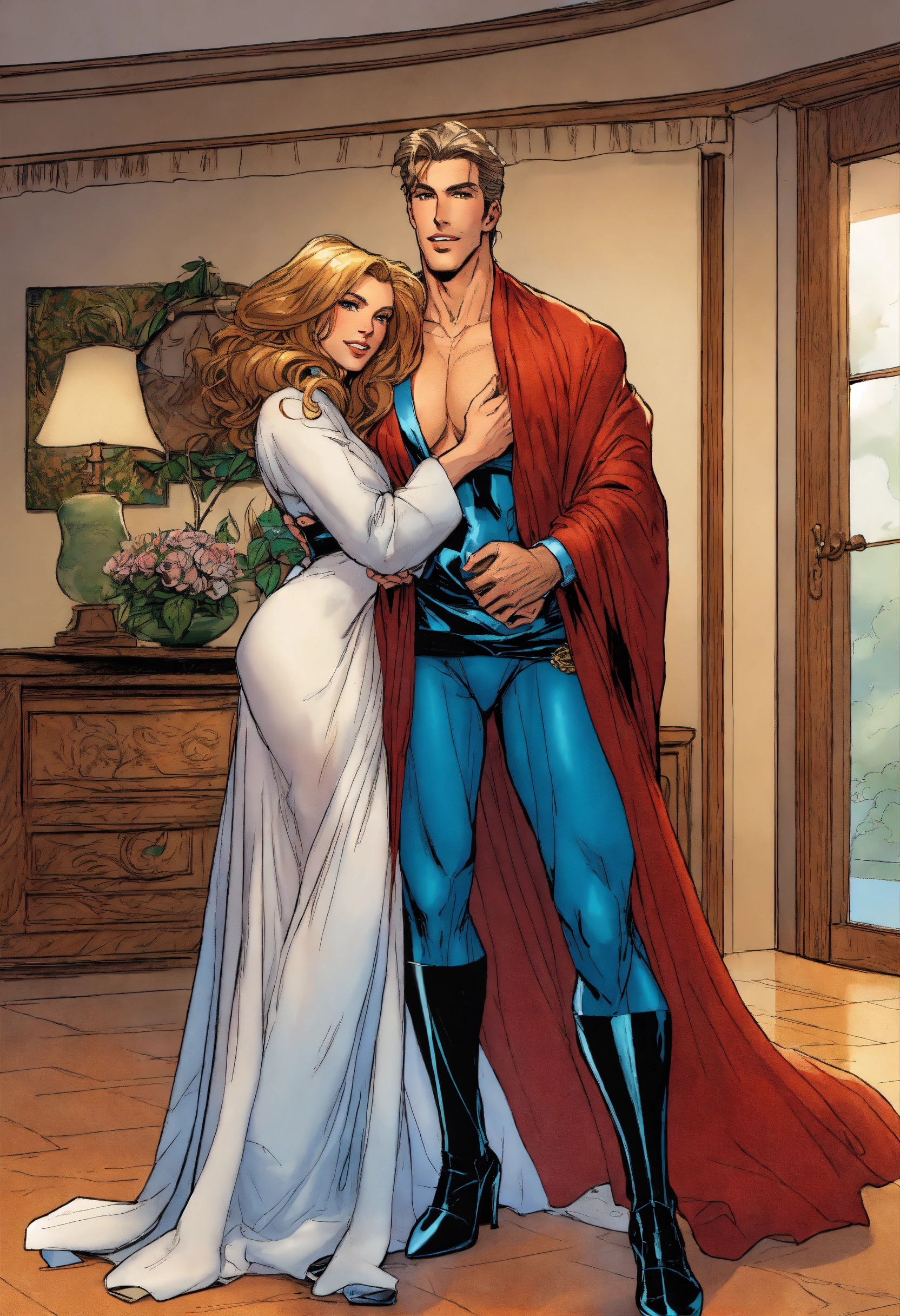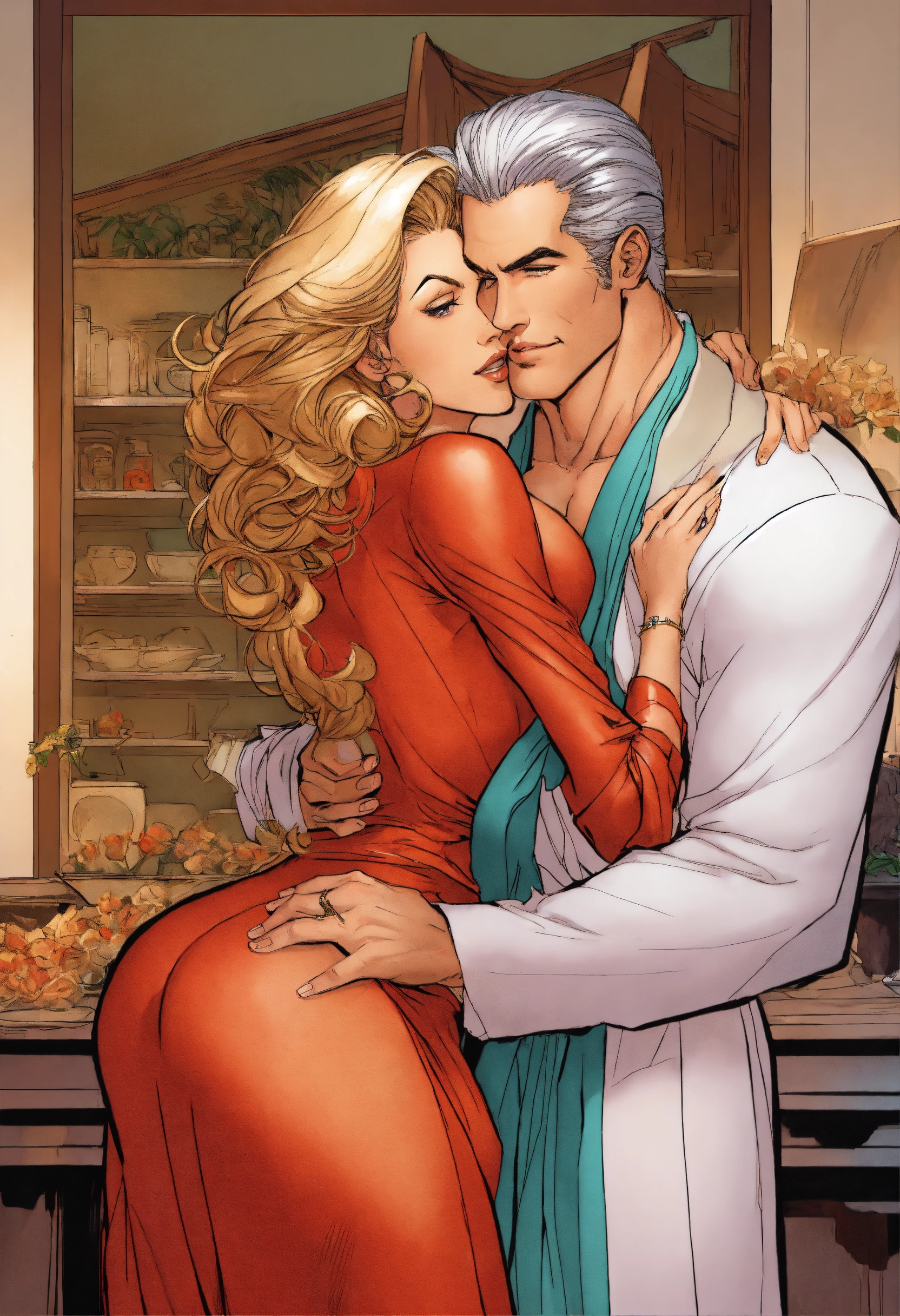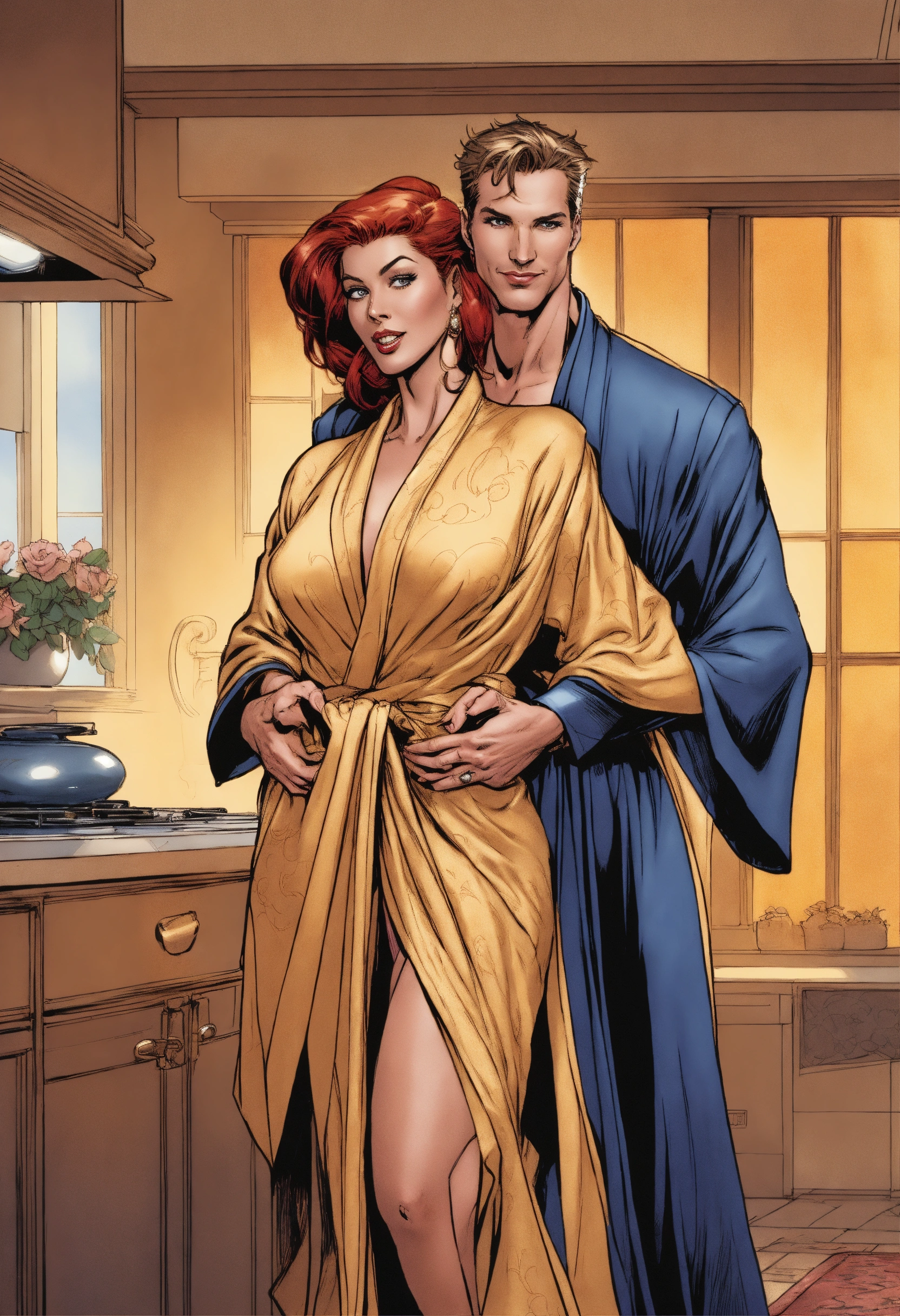 Older angela as a housewife, wearing a silk robe and stiletto high heels, hugged from behind by her handsome son, art by j. scott campbell, art by todd mcfarlane