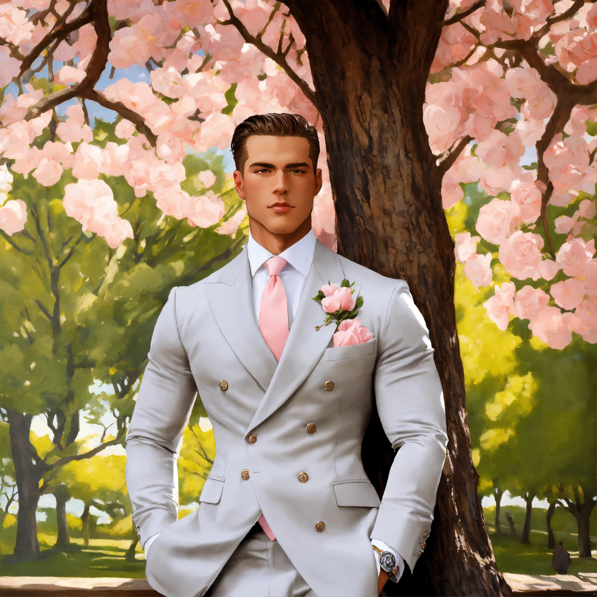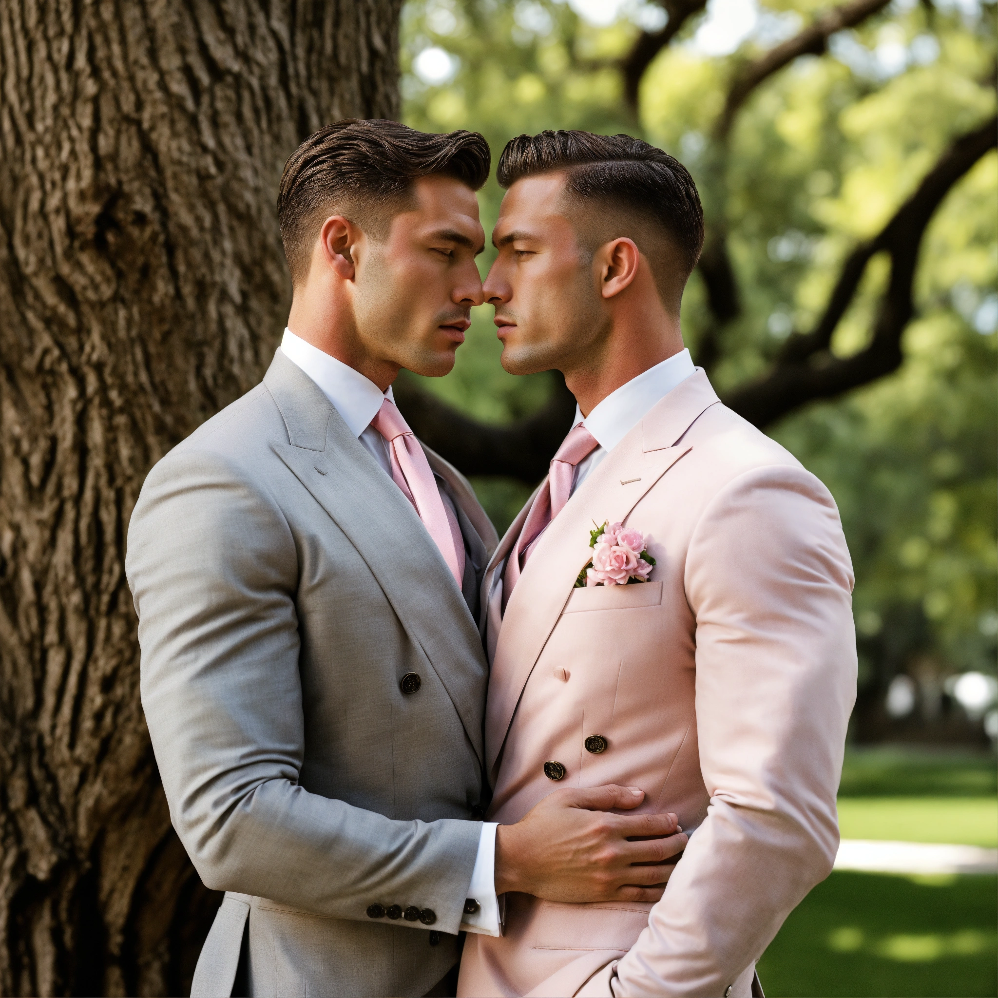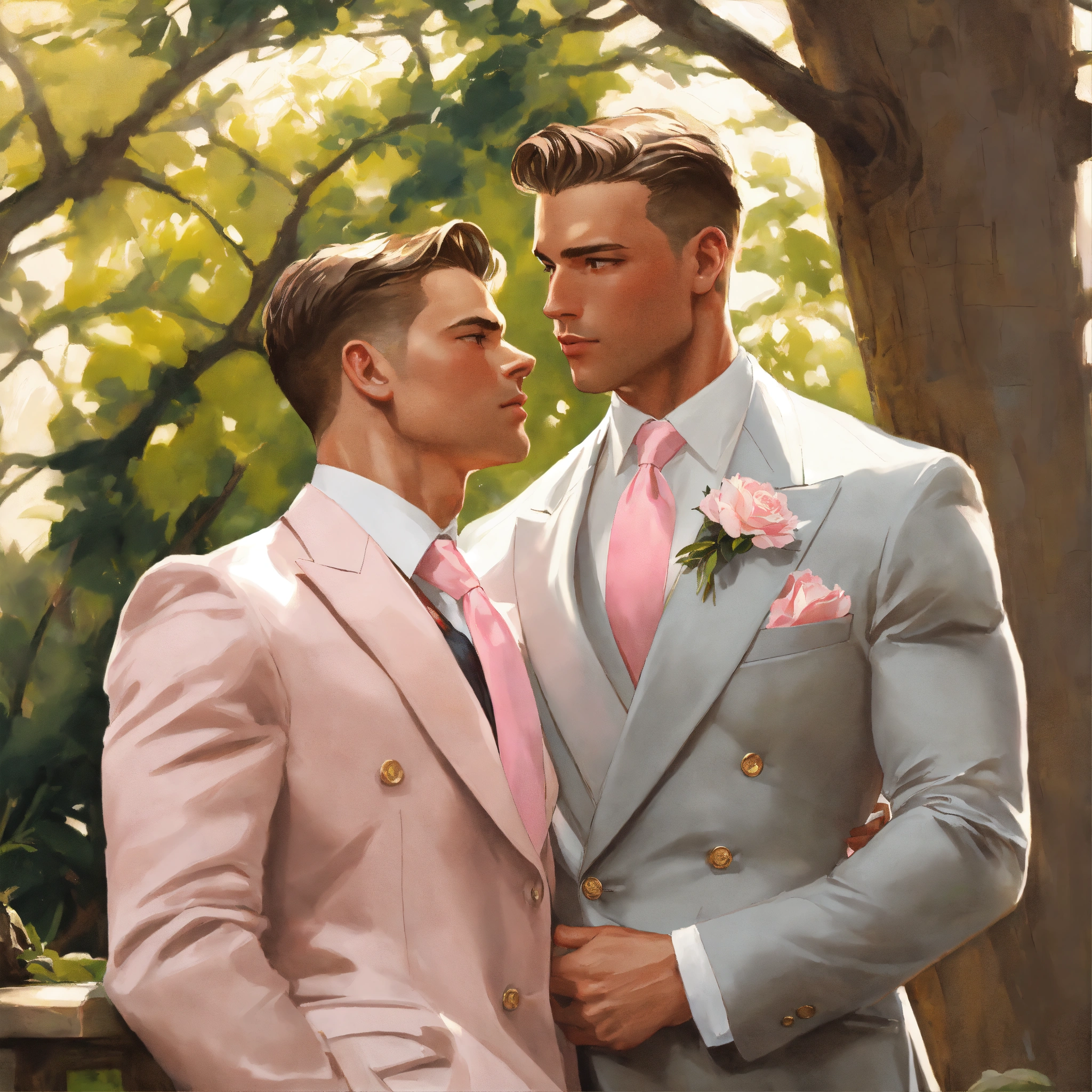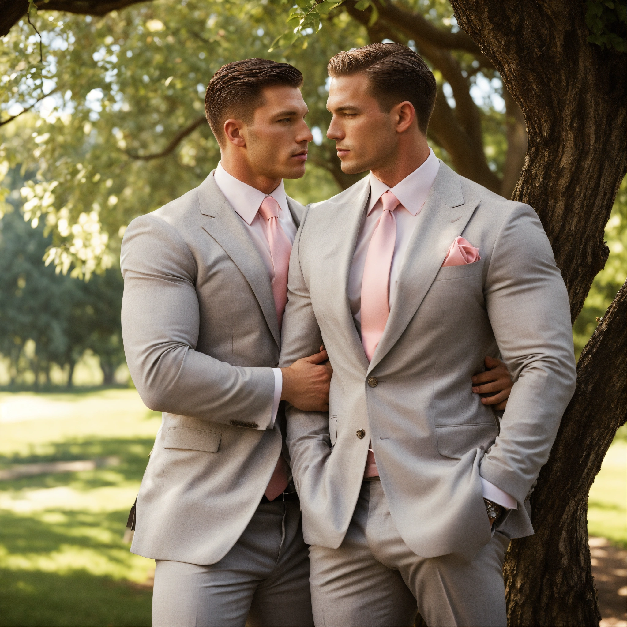 Two muscled male ceo in light grey double breasted suit, pale pink tie, embracing under a tree, leyendecker style