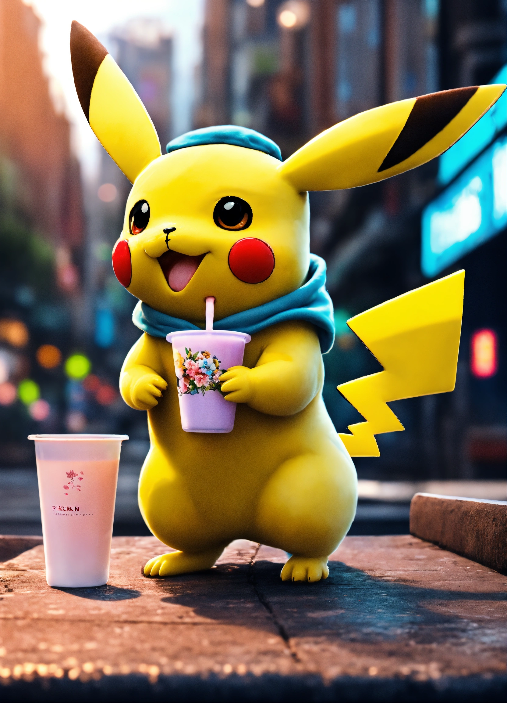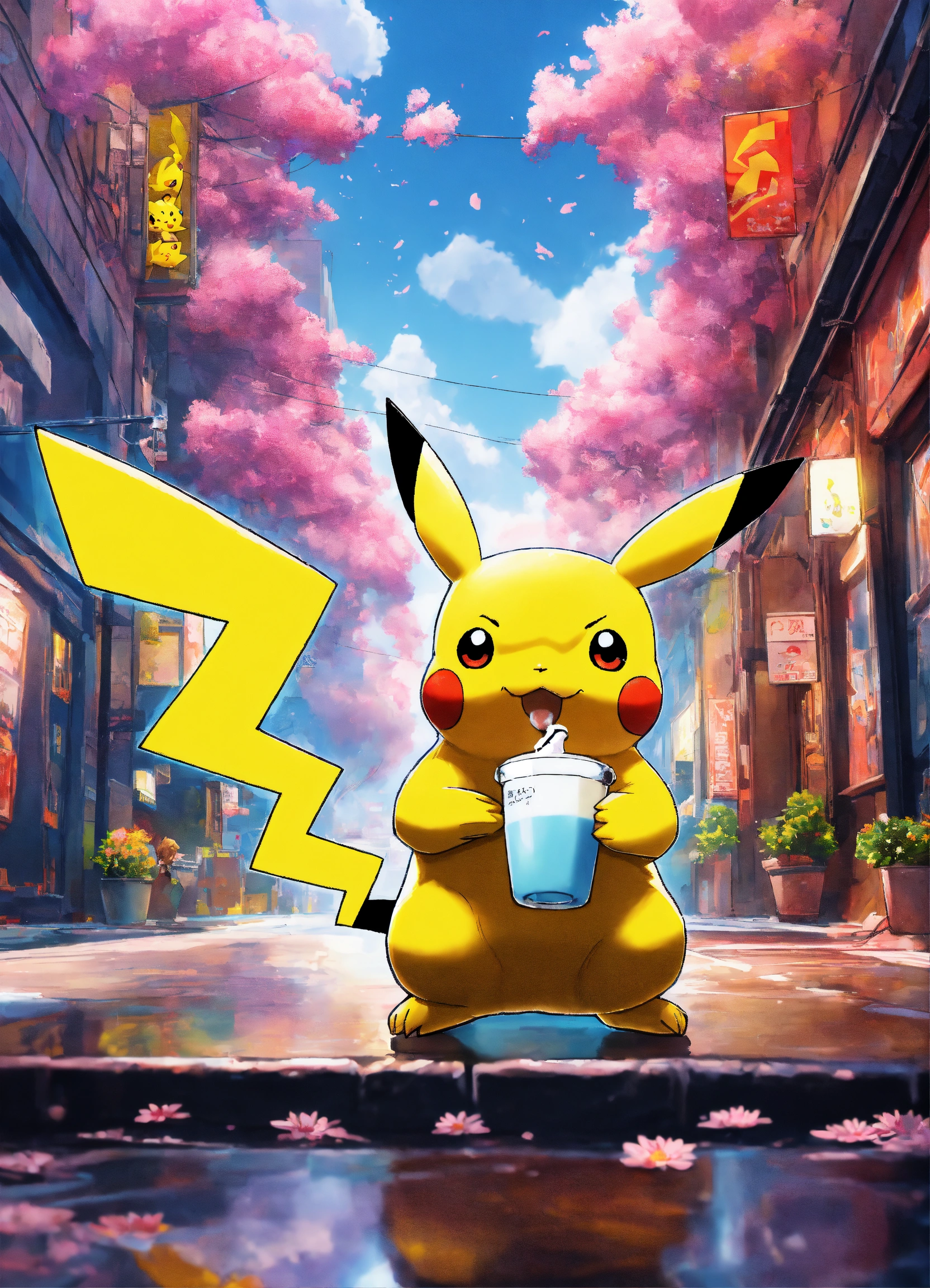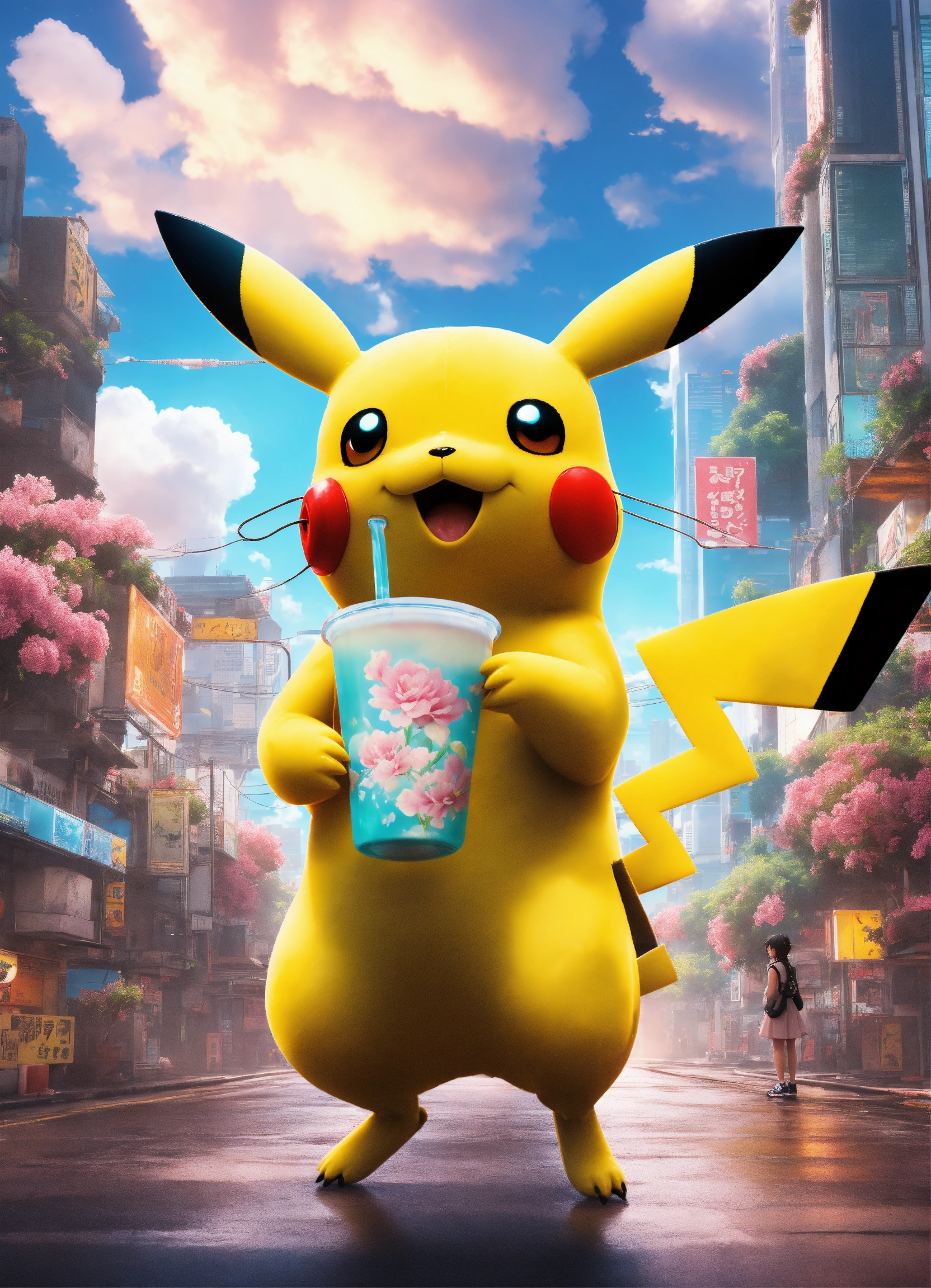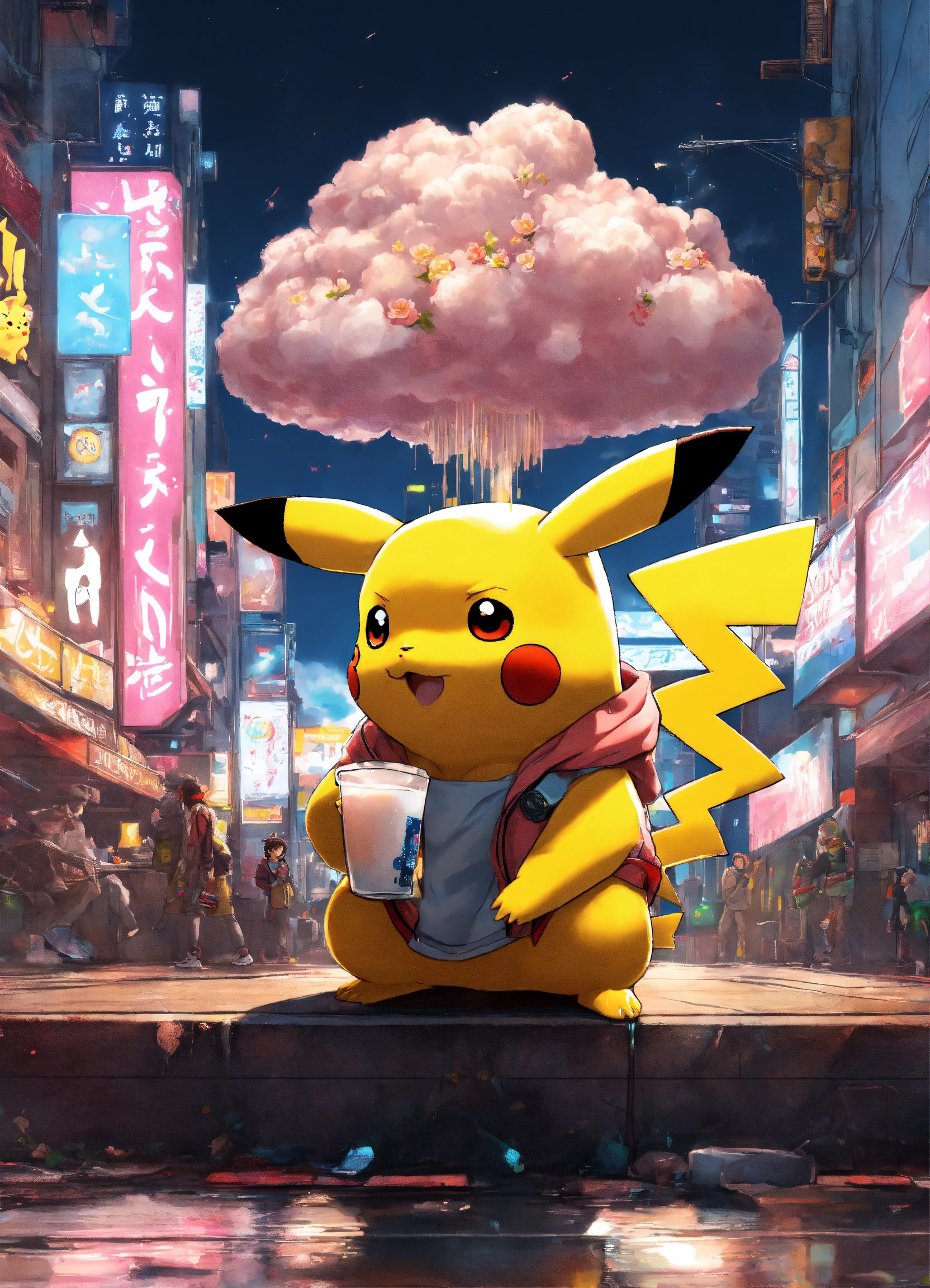 A pikachu drinking milk slice of life anime, cyberpunk style, of a person in urban floral wear, with a cloud as a head, photorealistic, volumetric lighting, 8k, highly detailed
