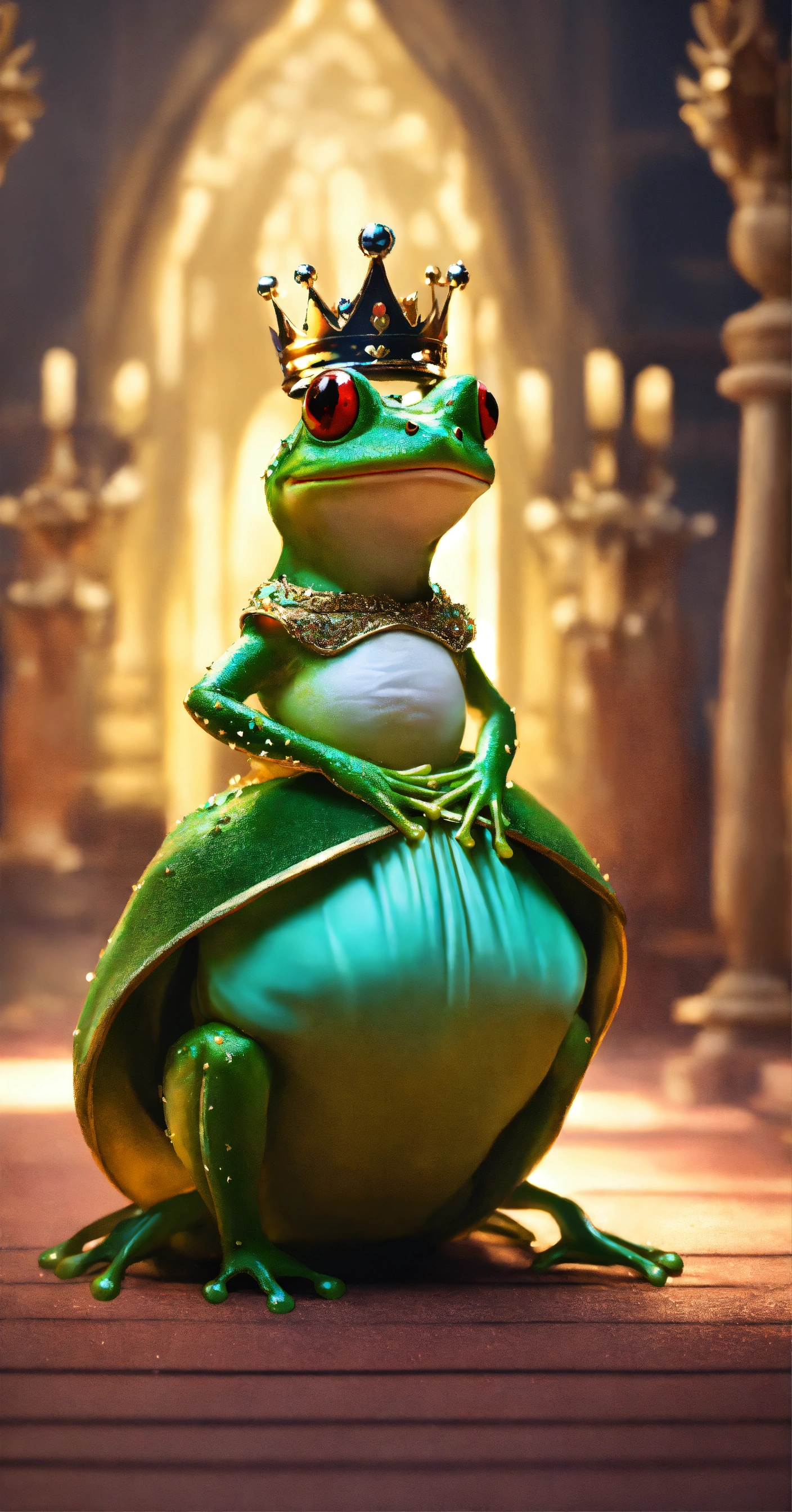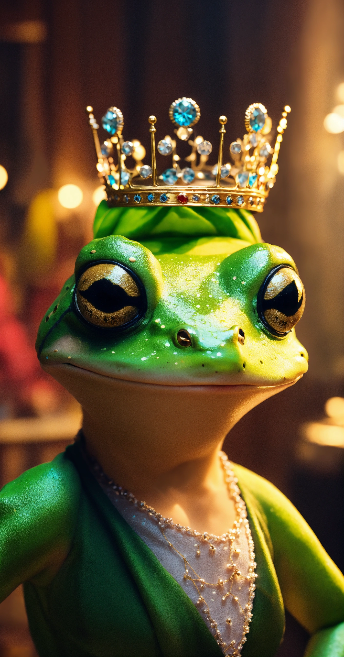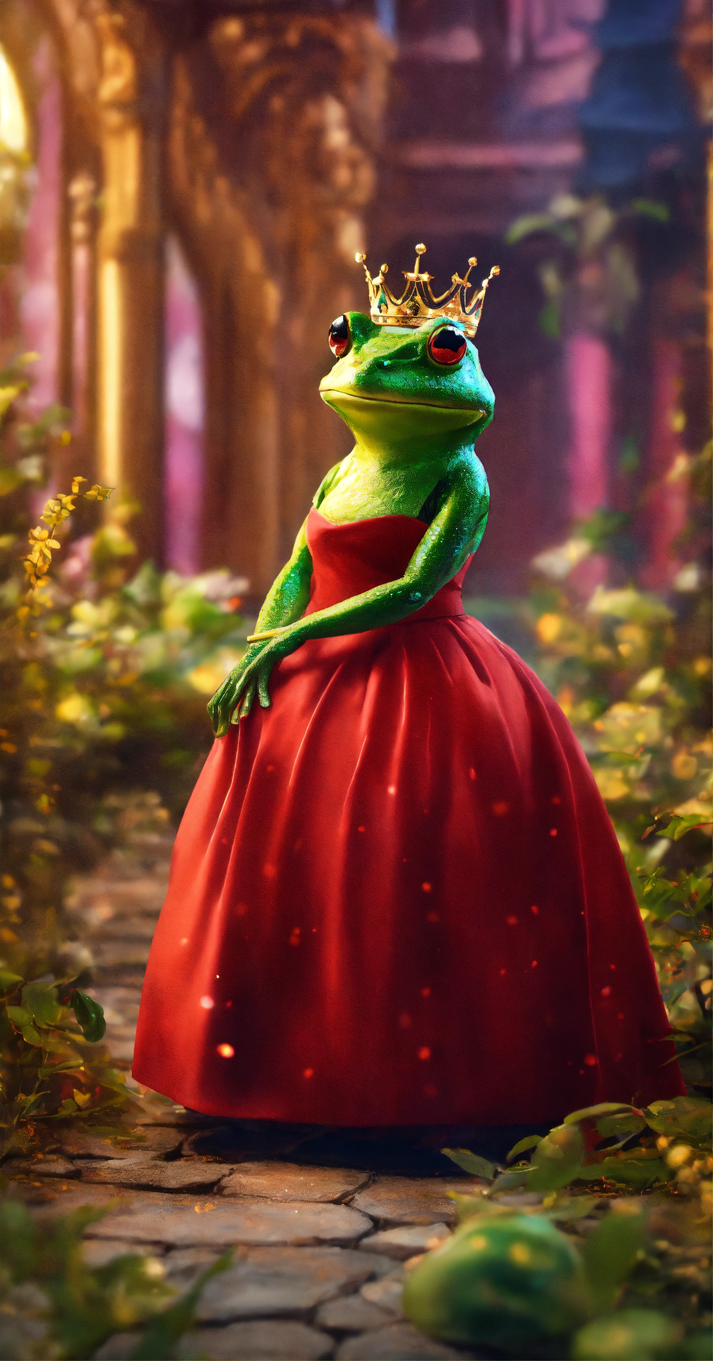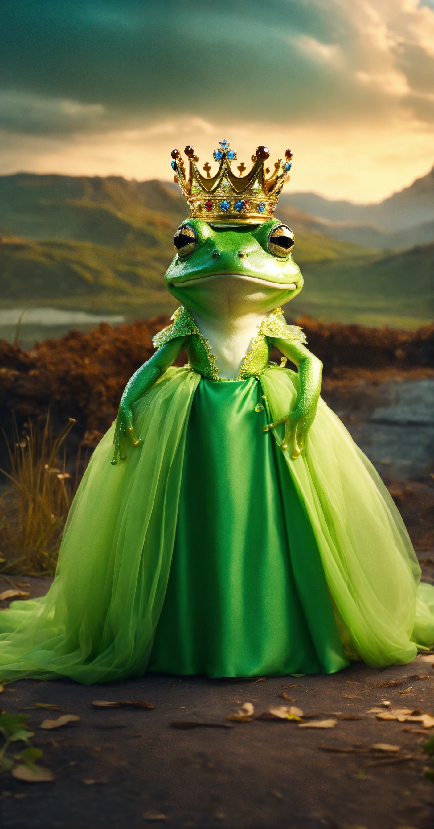Cute lady frog in dress and crown dressed in gown in cinematic environment