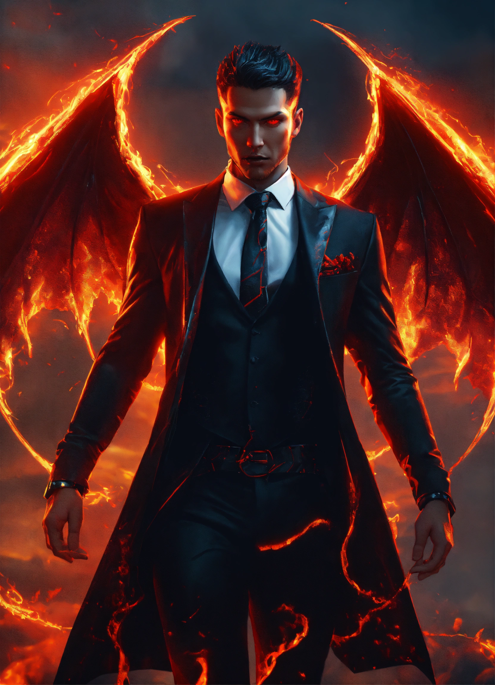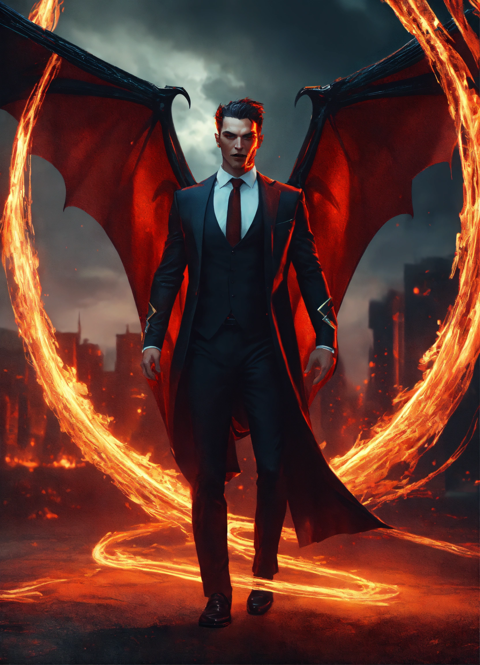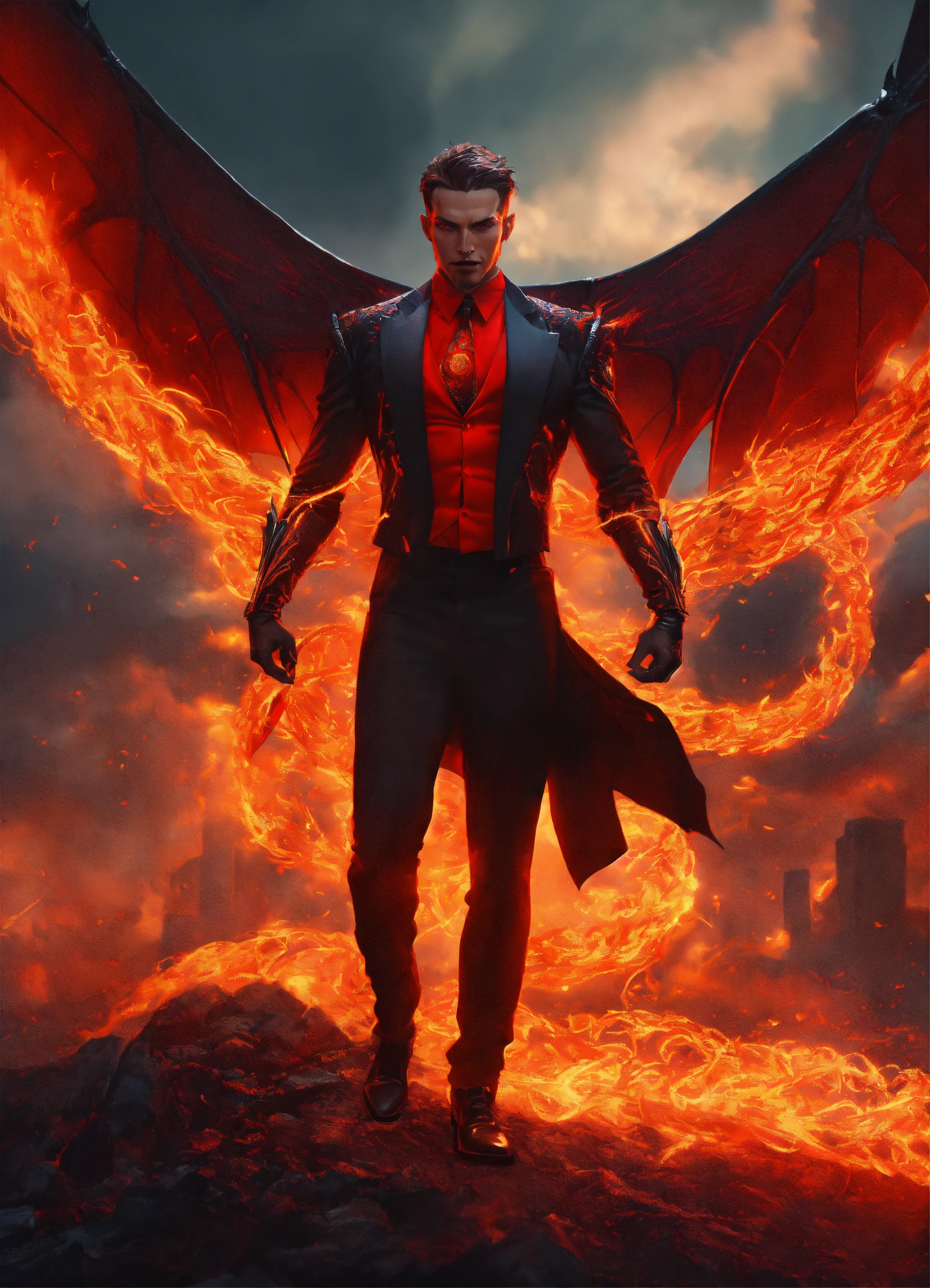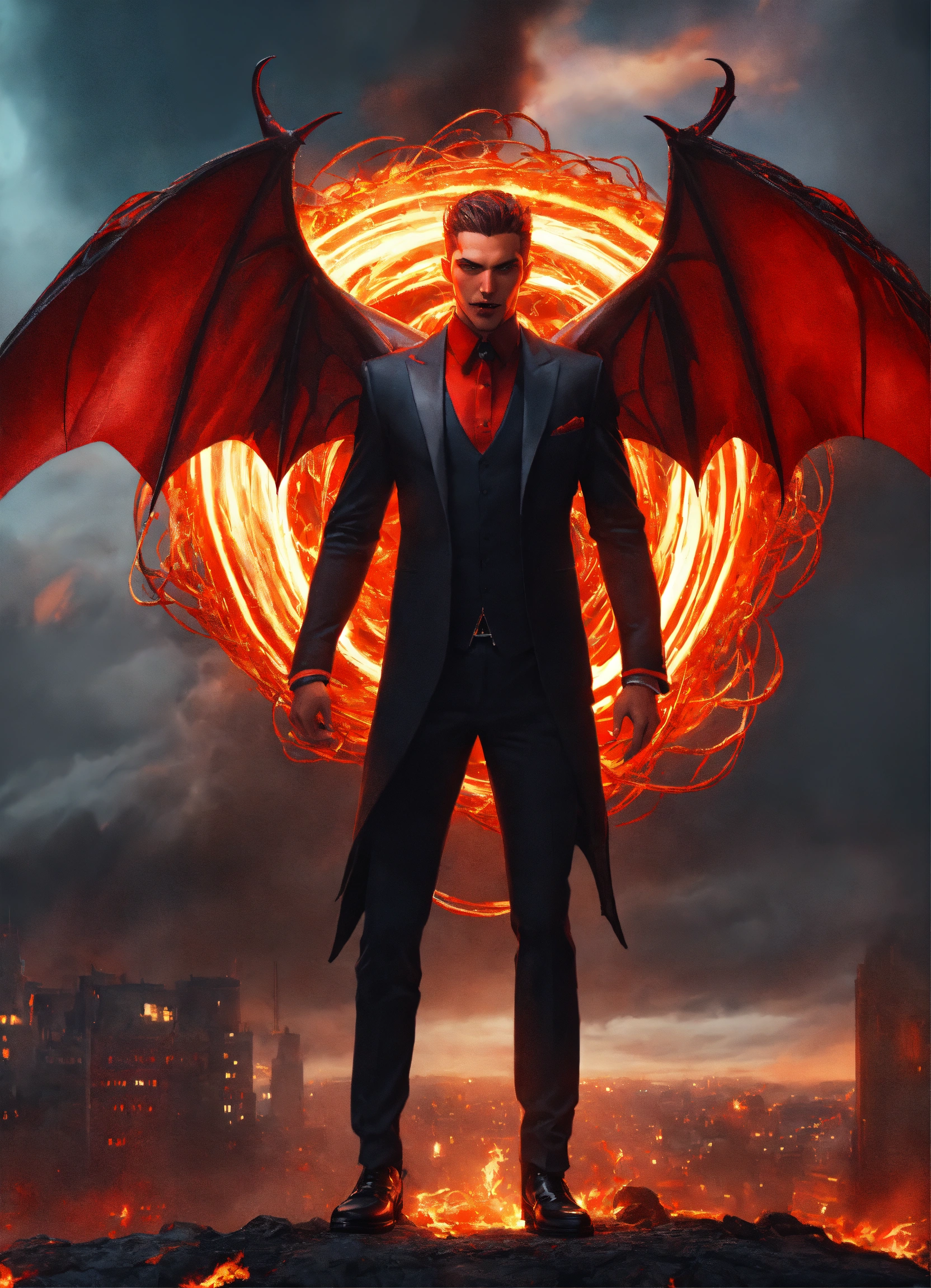 Full body strong muscular evil futuristic vampire man entangled in a red fiery spiral, attractive evil futuristic vampire man with bat wings entangled in a fiery spiral, fully clothed wearing black suit, floating in the sky, fantasy, high detail, realistic photo, high detail, digital painting, cinematic, stunning, hyper-realistic, sharp focus, high resolution 8k, insanely detailed