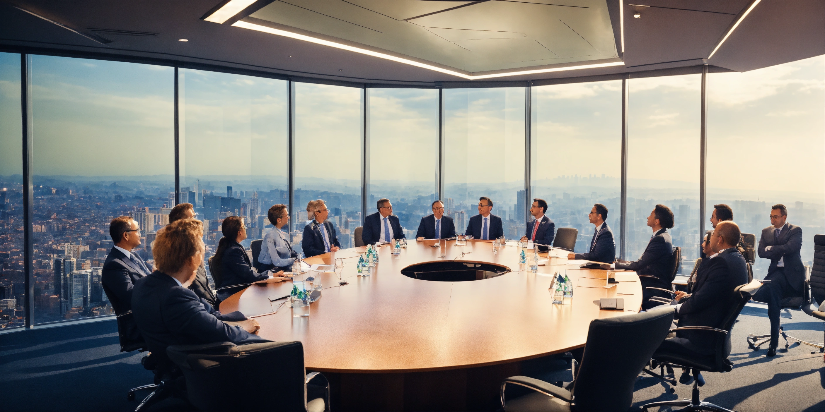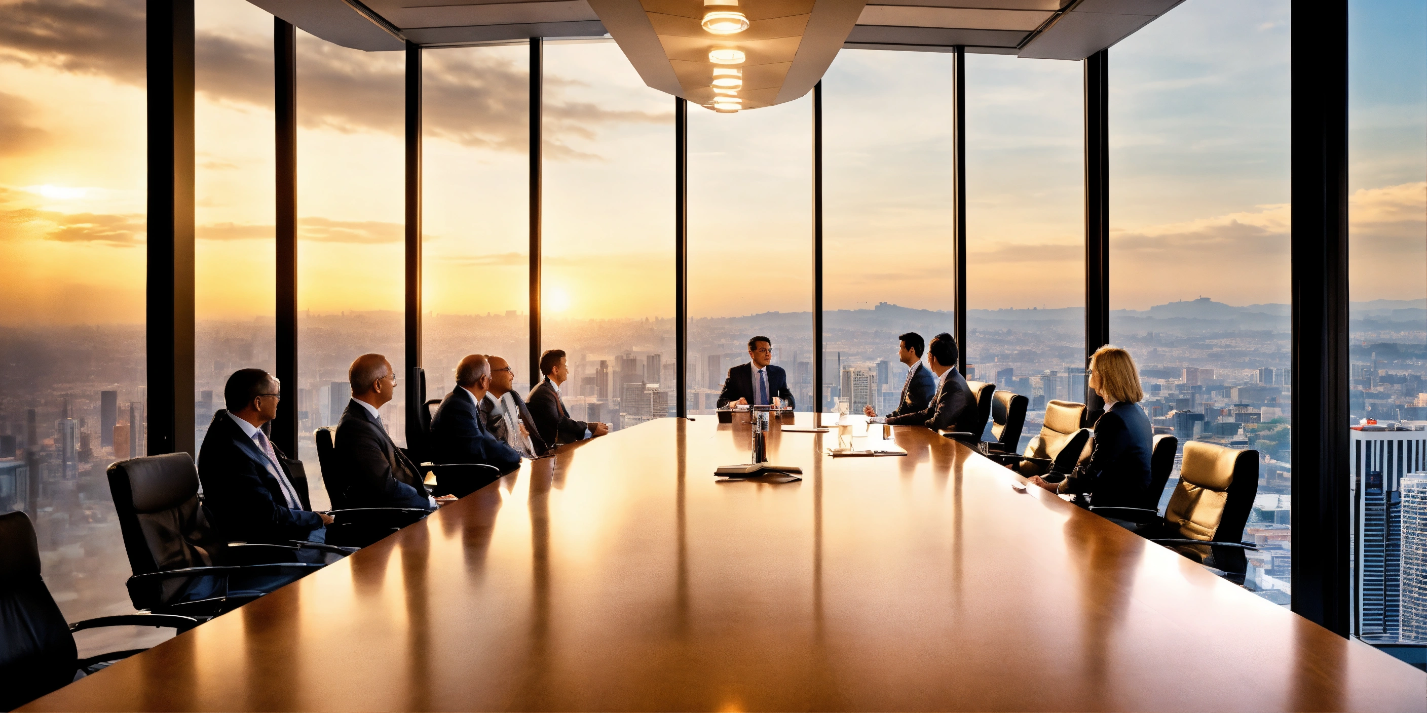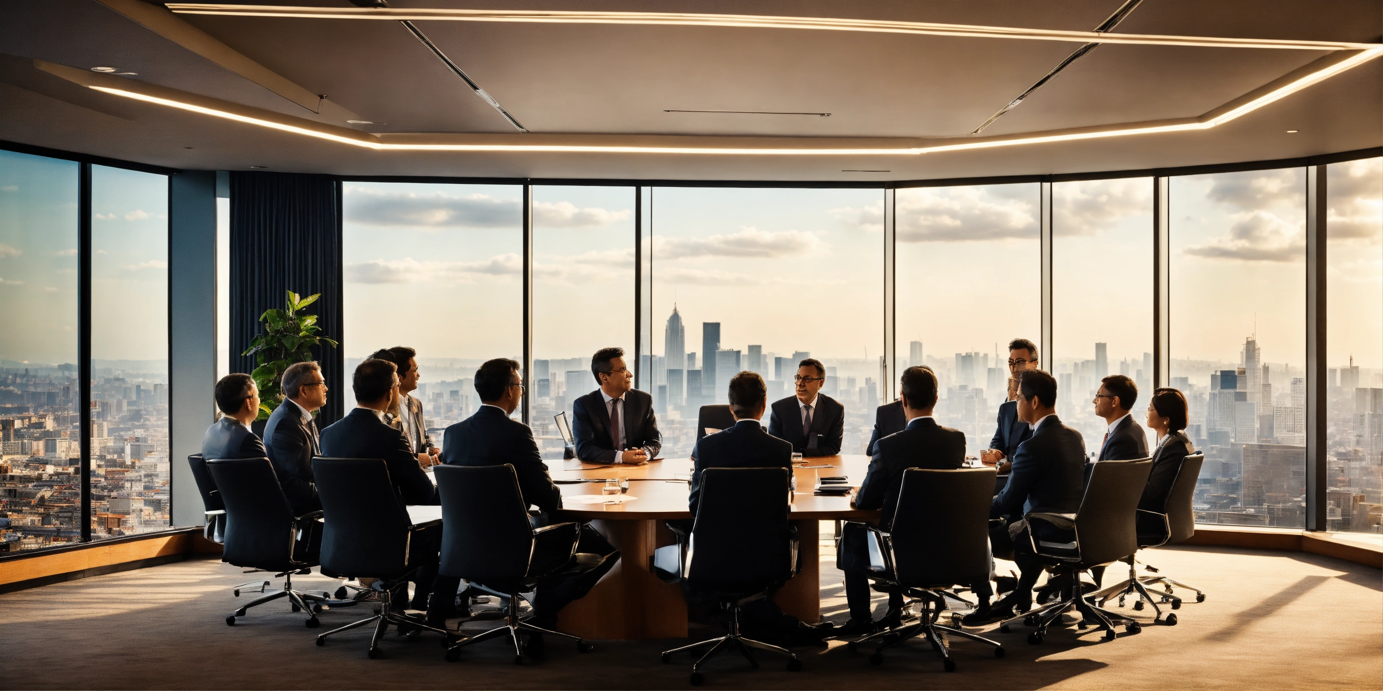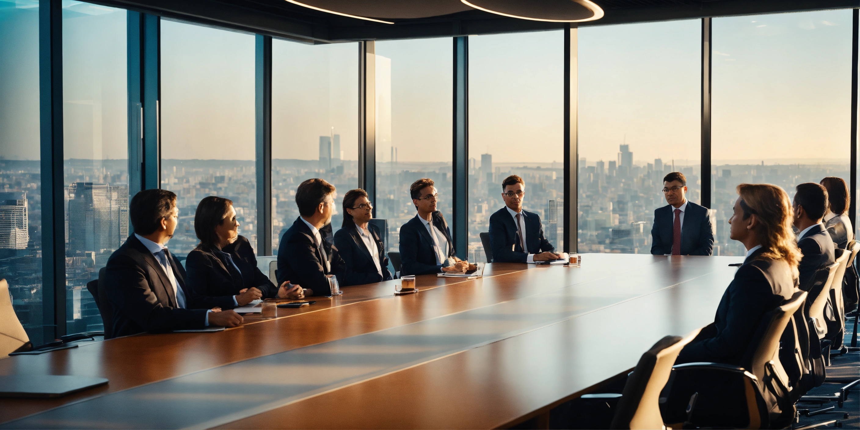 A meeting in a board room with a beautiful panoramic view of a city below, everyone is looking at the leader of the meeting