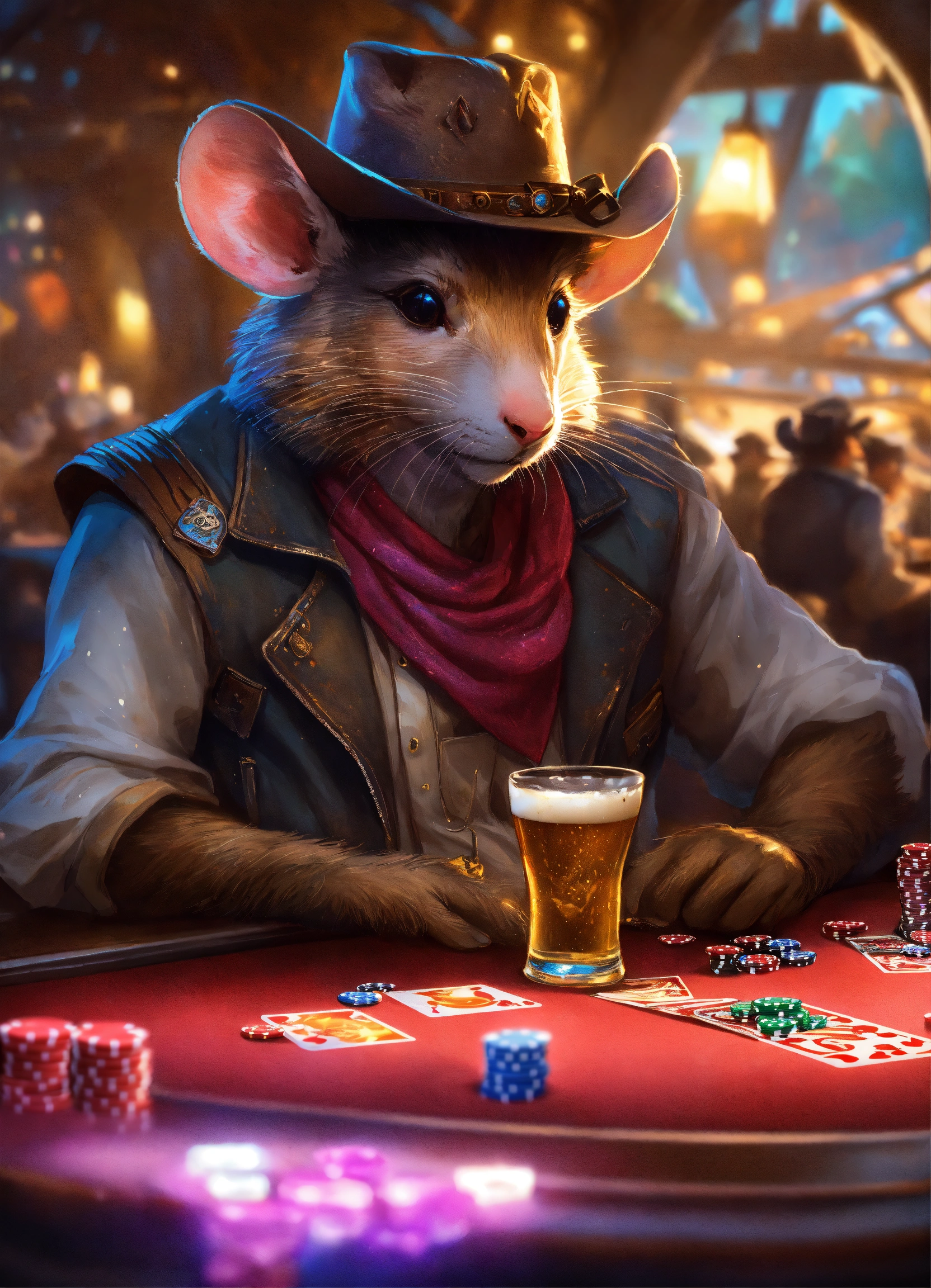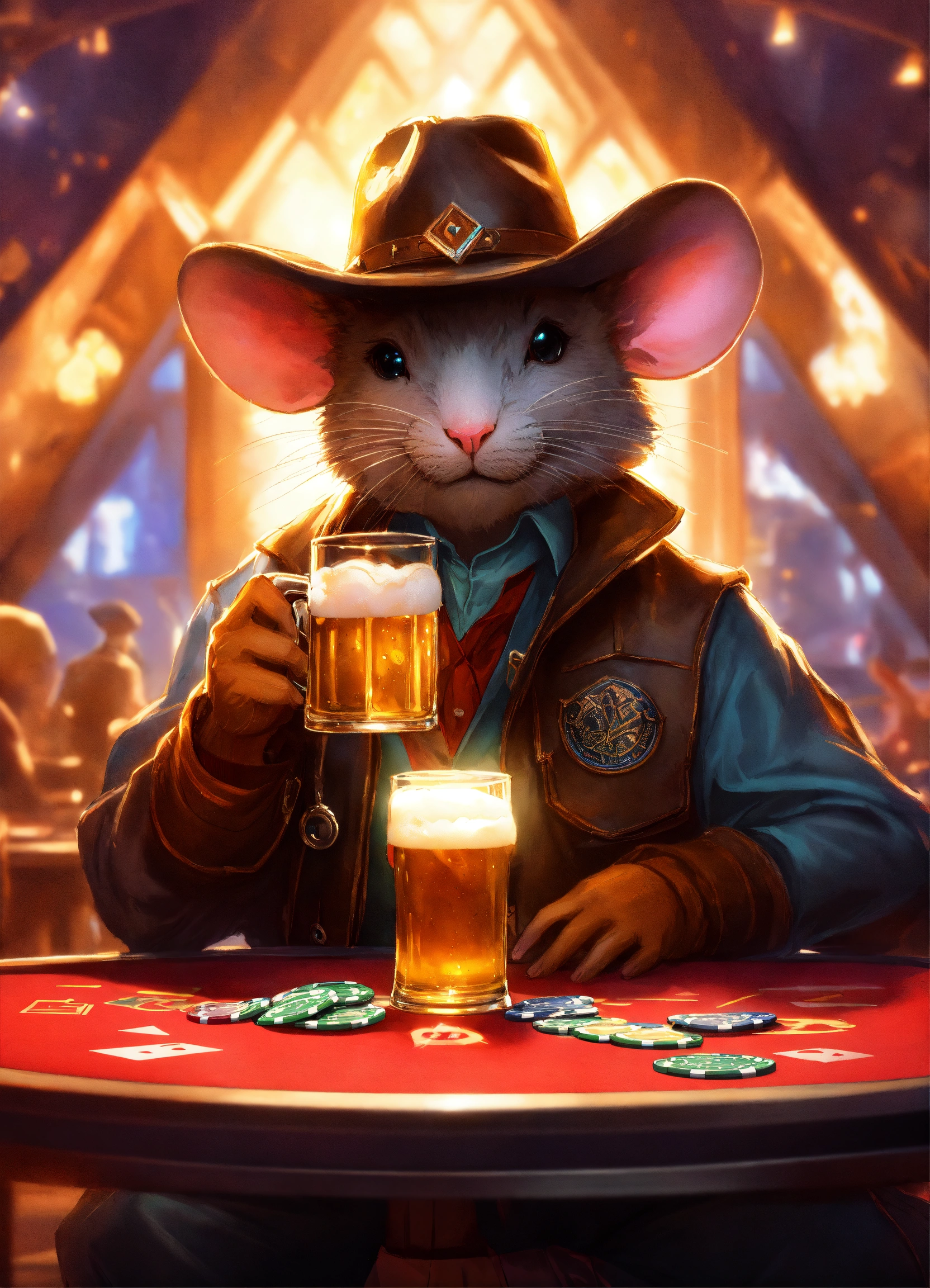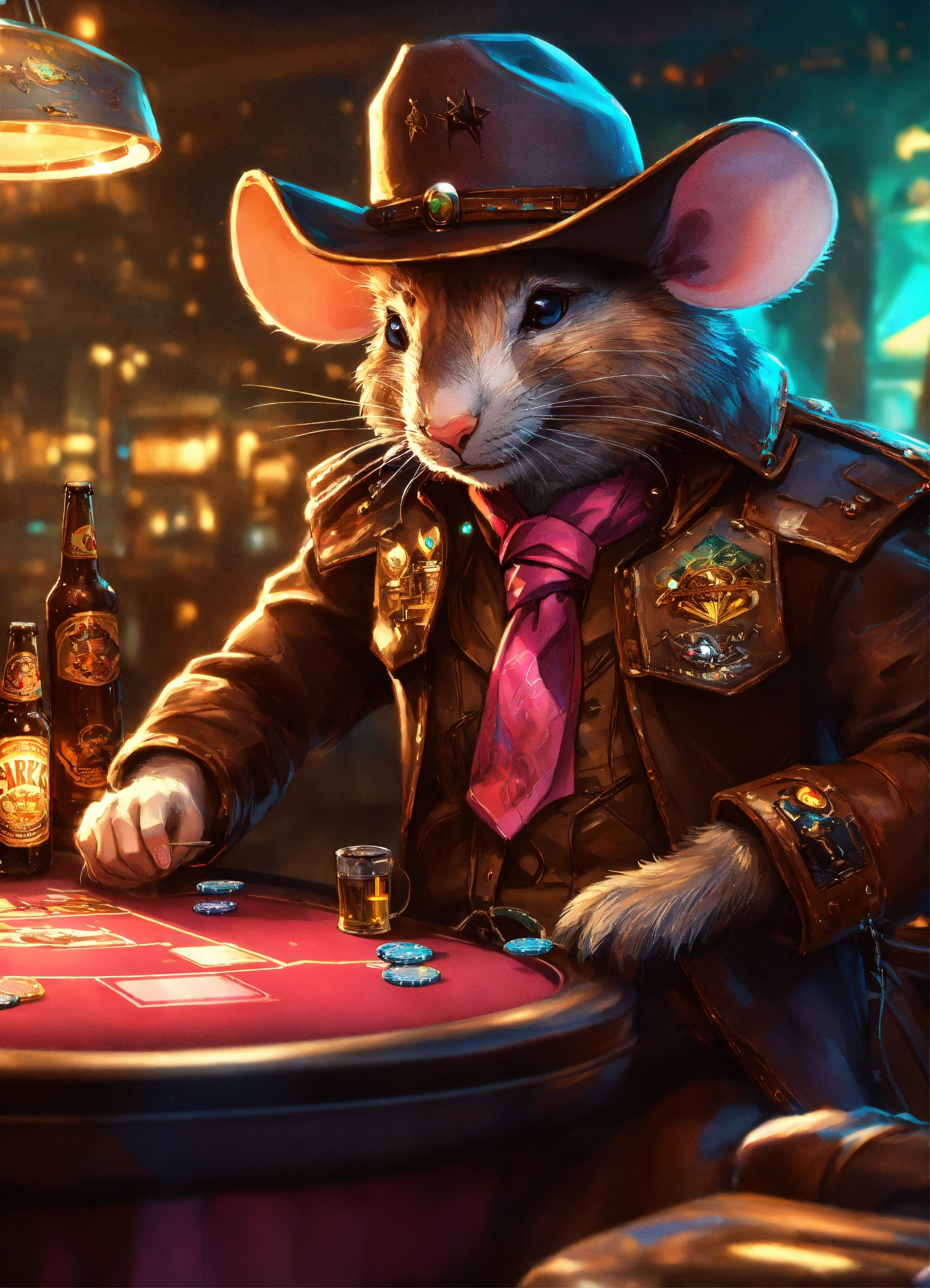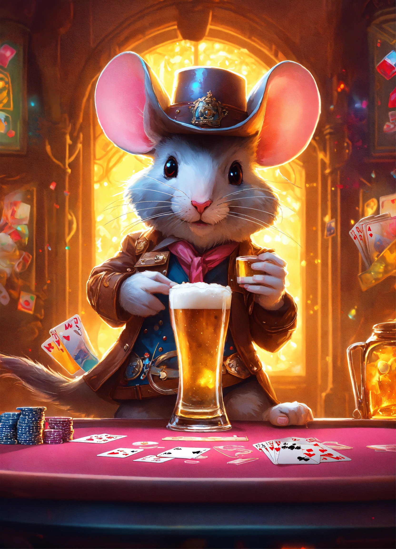 Poker mouse cowboy drinks beer at speckled pink cyber pyramid, glowing, prismatic, pearlescent, shimmering, highly detailed, concept art, cinema lighting, digital painting, unreal engine, smooth, sharp focus, illustration, trending on artstation, art by artgerm and greg rutkowski and alphonse mucha and craig mullins