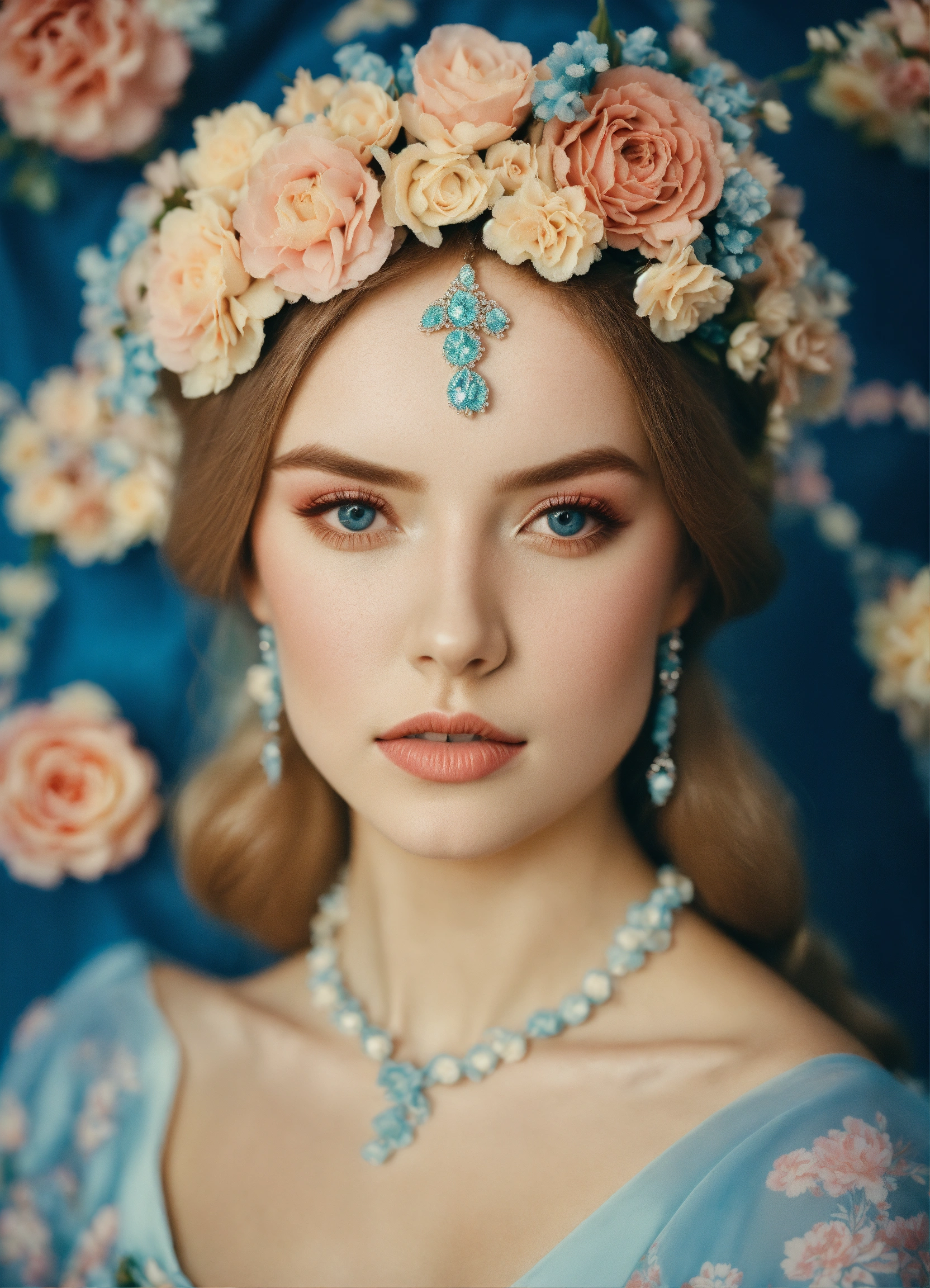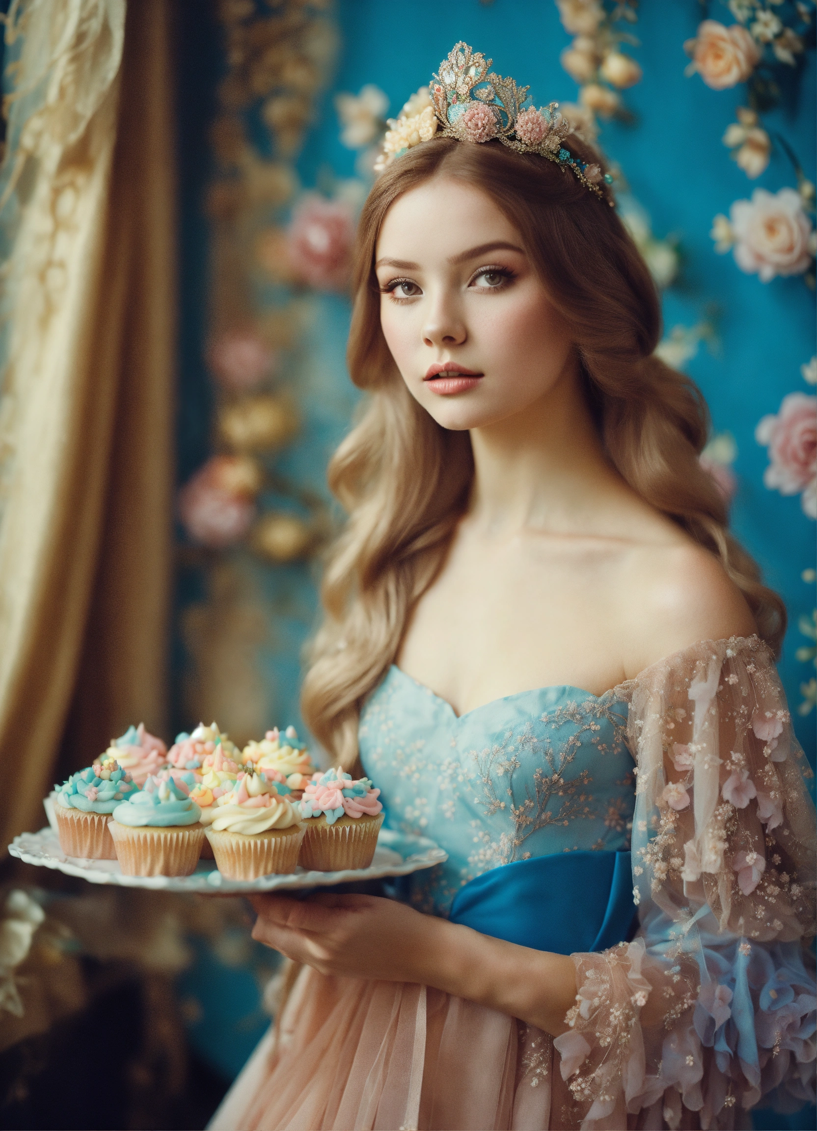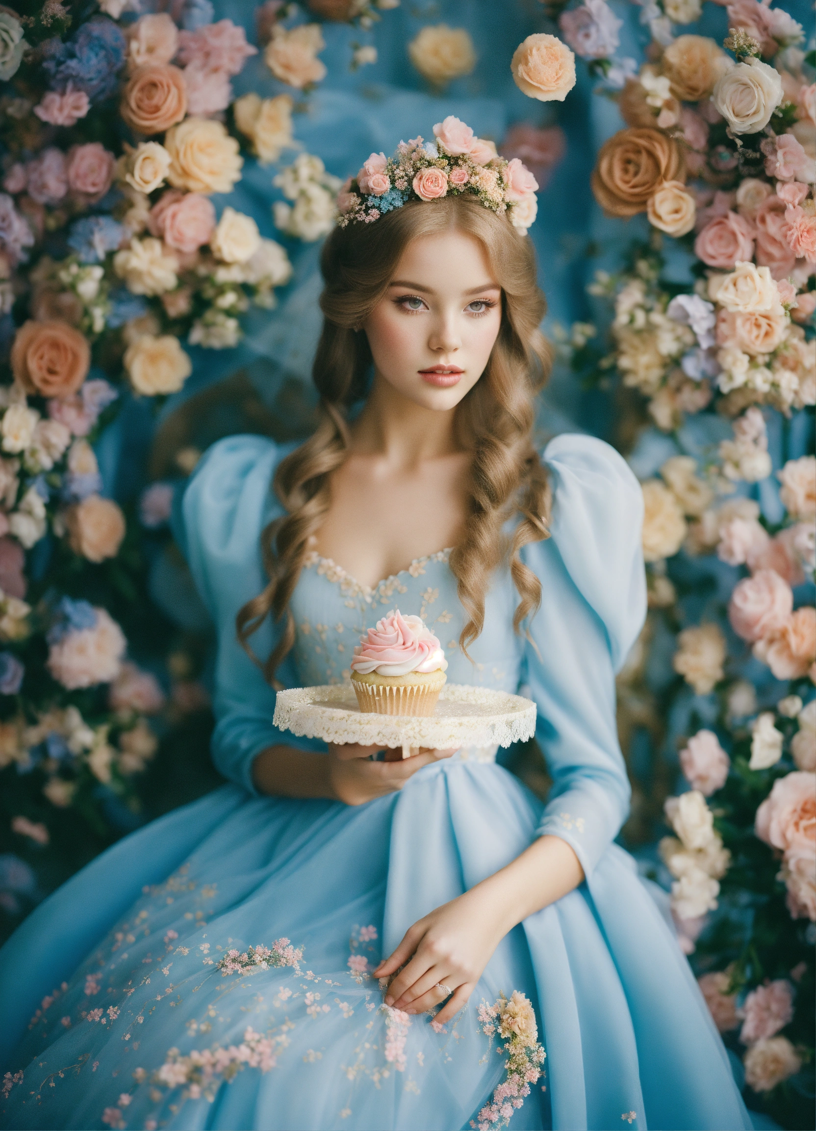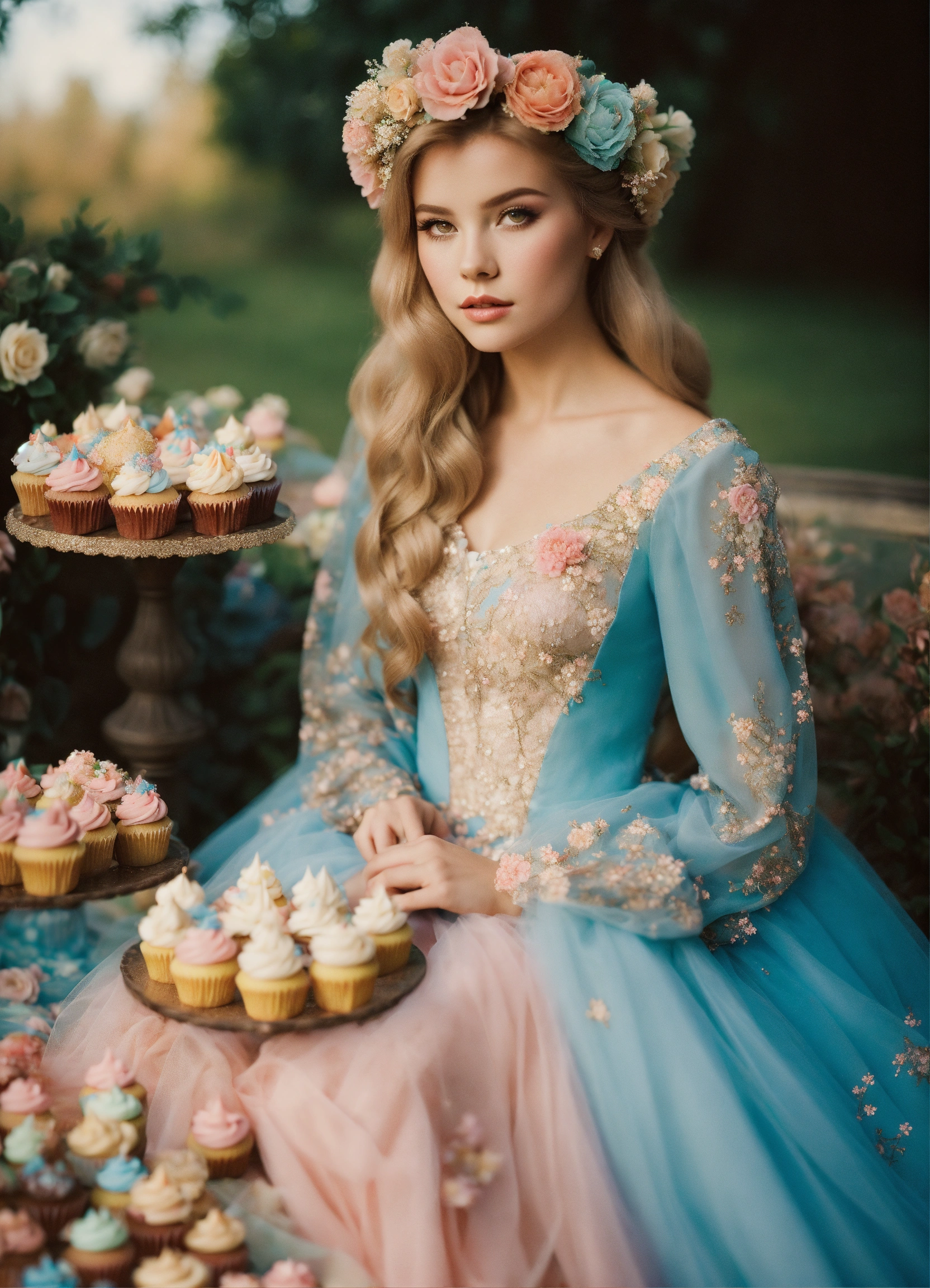 Fashion editorial. floral edition. millions of colored candies and cupcakes analog fashion portrait. portra 400 high dpi scan. beautiful russian young as princess aurora sepia pastel colors, blue dress long sleeve medieval bride long tail