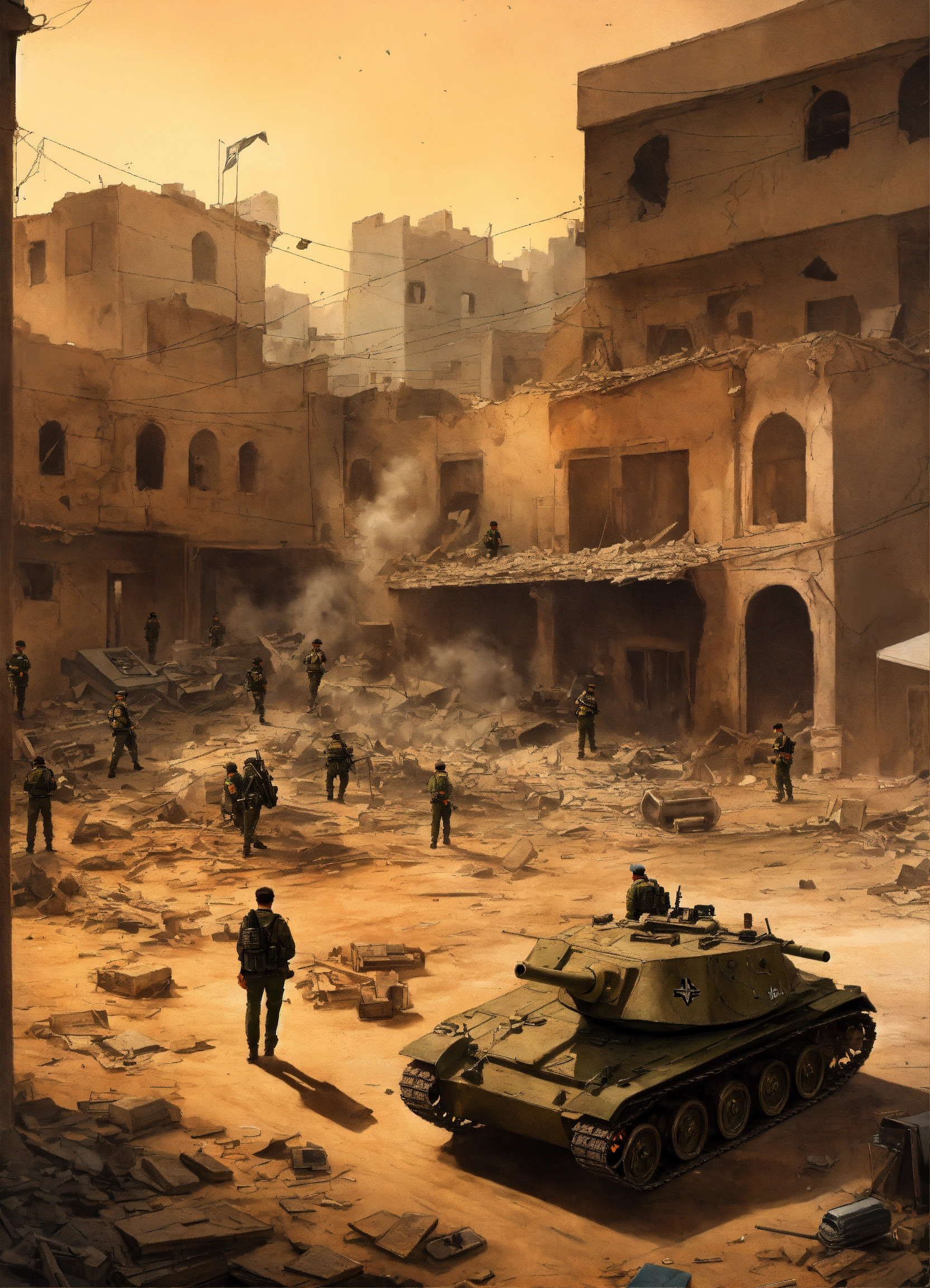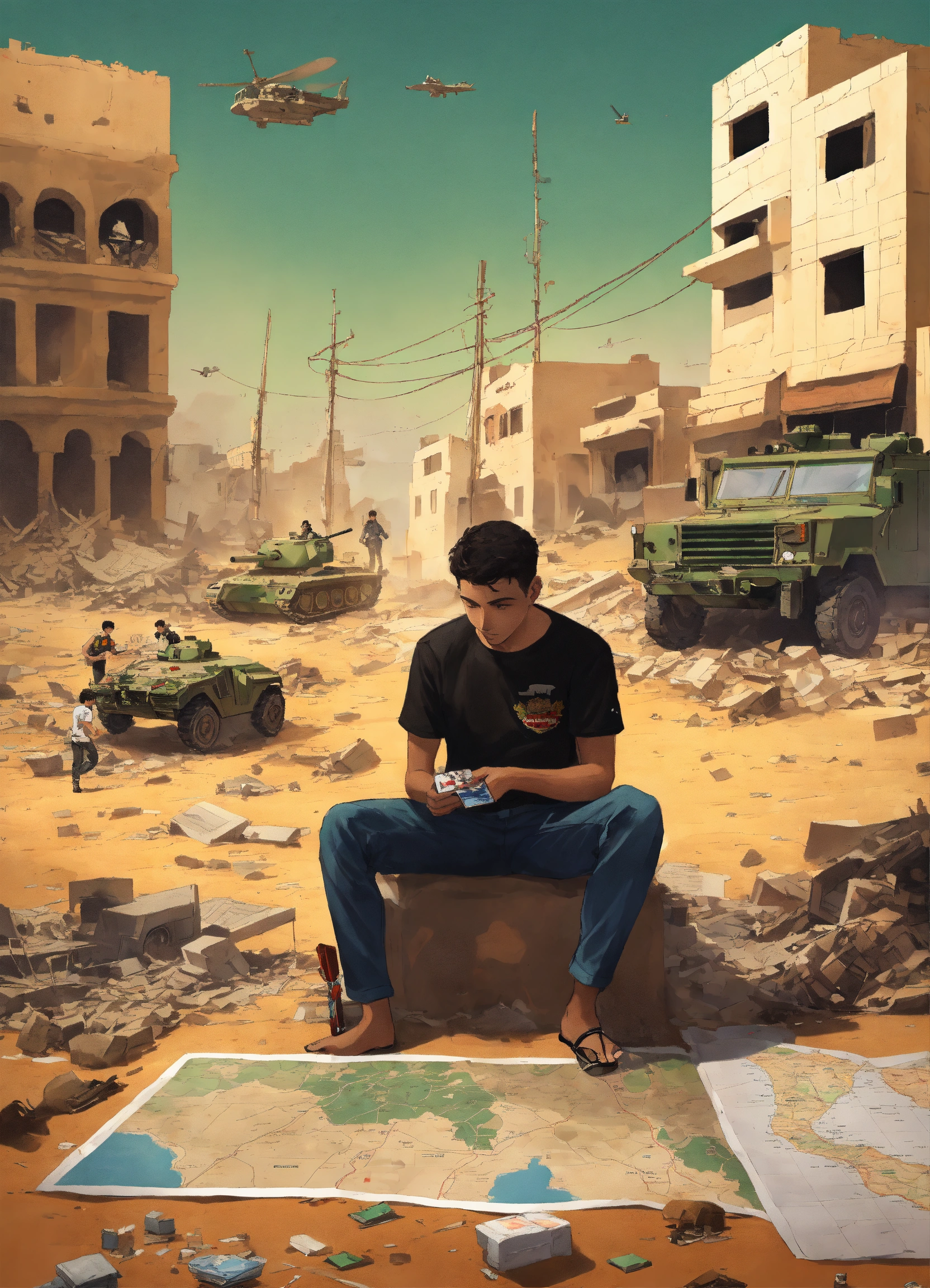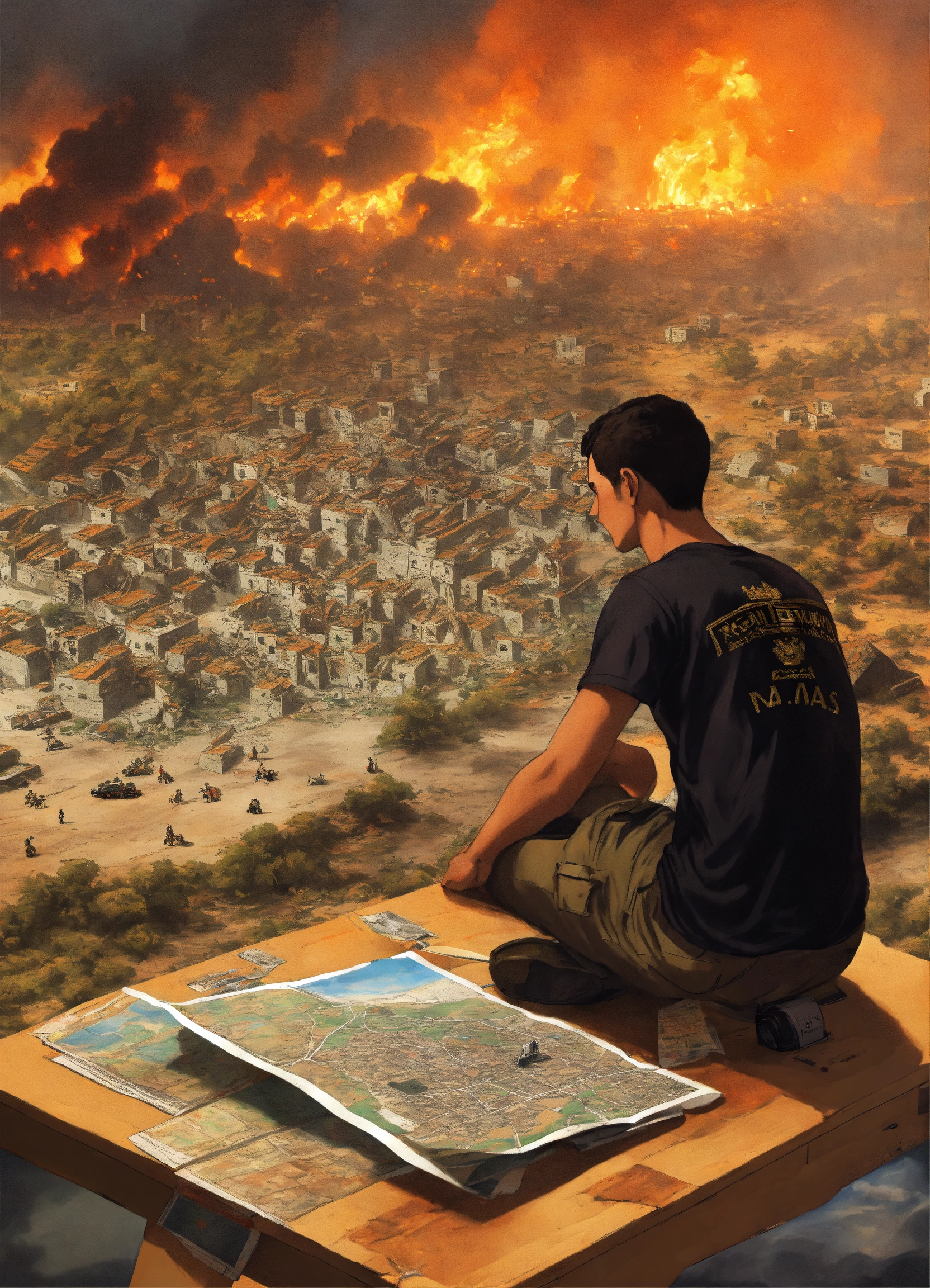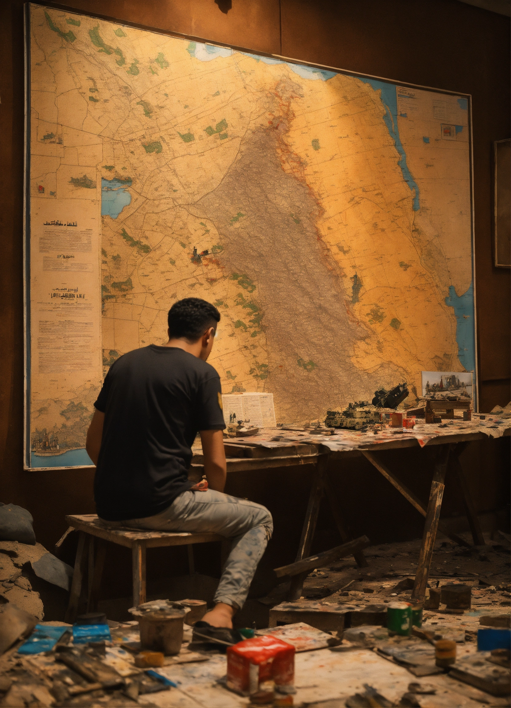 A painted canvas depicts the israeli bombardment of the palestinians in gaza. it doesn't represent any religion but rather the freedom and justice. the design showcases a young man wearing a black t-shirt with the words 'nas daily' on it. in the background, he sits at a table planning, with a large map in front of him. the map displays mockups of collapsed buildings, fires, models of tanks, soldiers, and military vehicles resembling toy pieces scattered across the map.