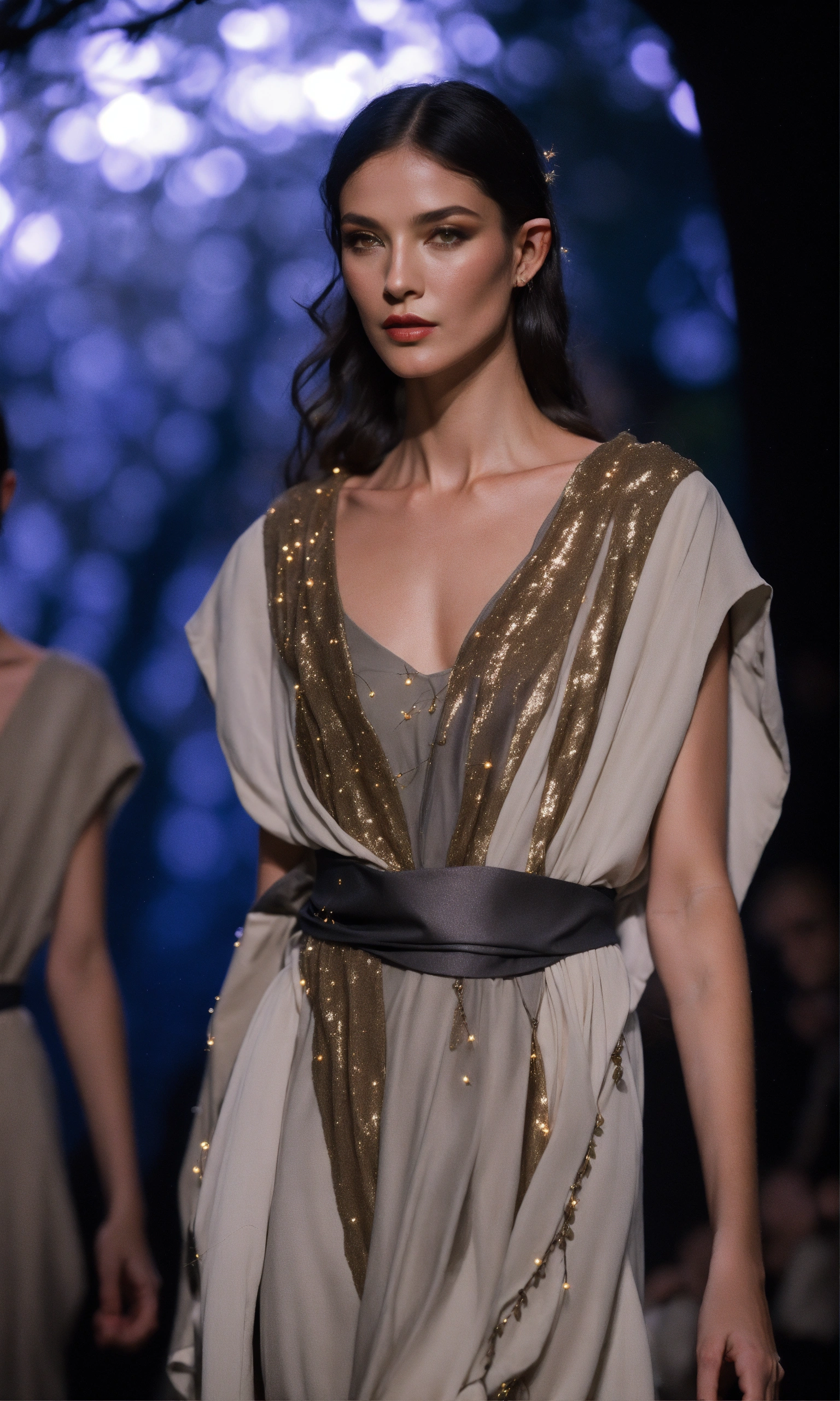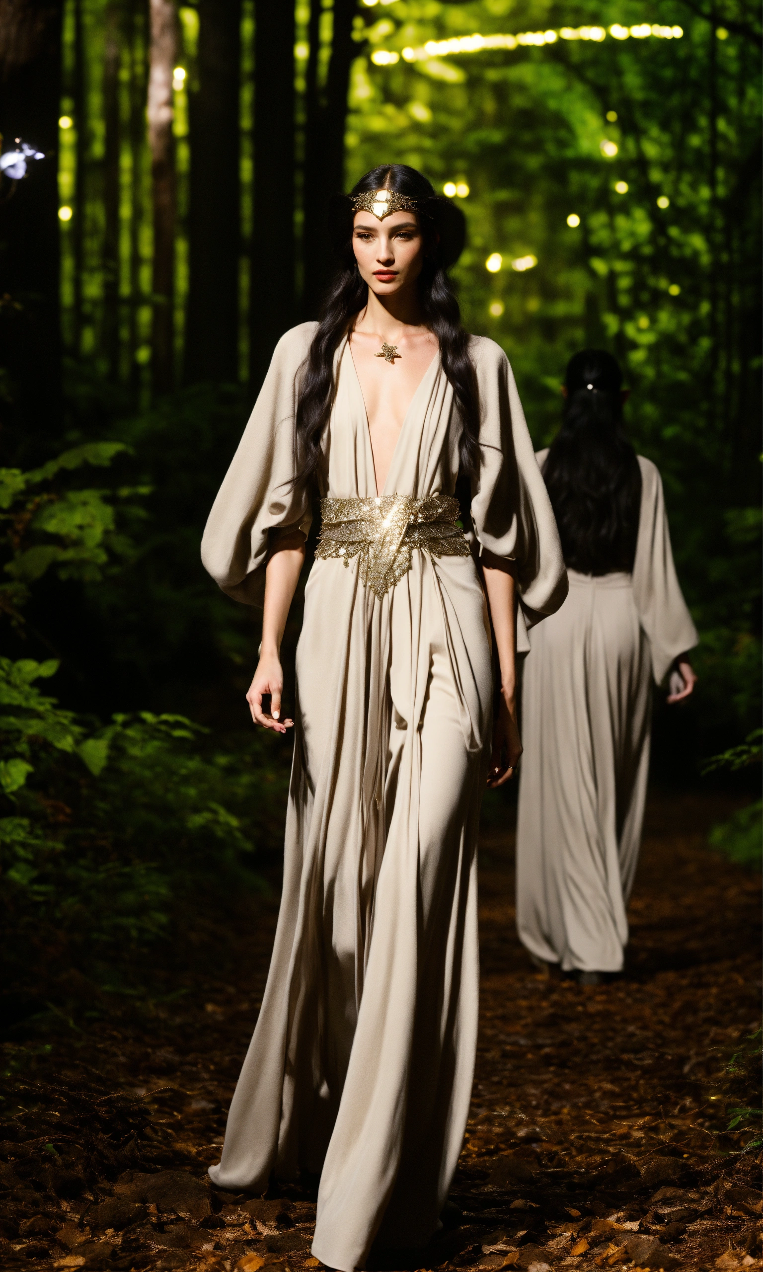 Lothlorien androgynous elves walking runway during elvin fashion week wearing dolman sleeve elvish donna karan fashion in black, white, grey, beige, stone, metallics, shimmer at an enchanted forest runway at starry nighttime, fireflies