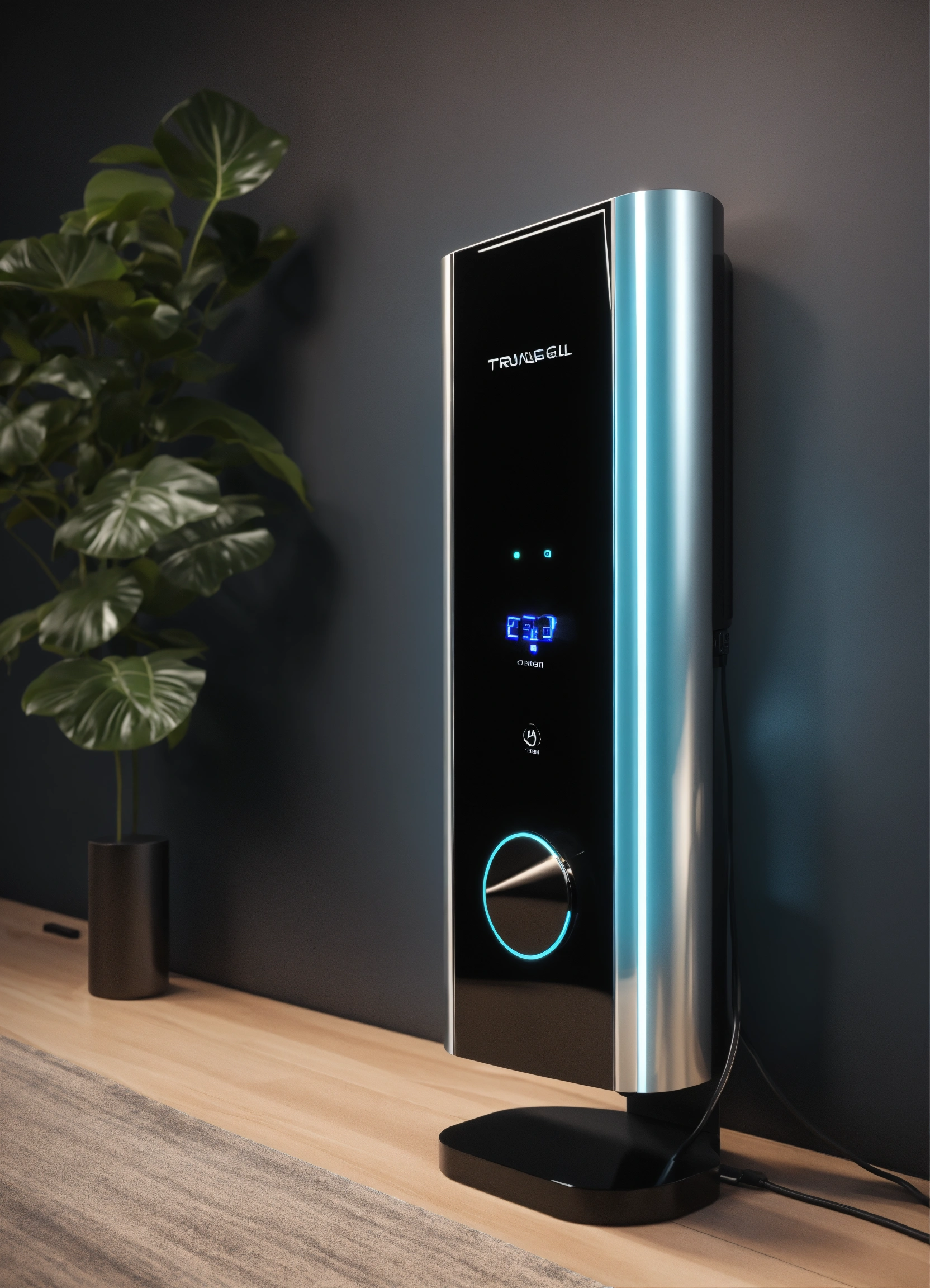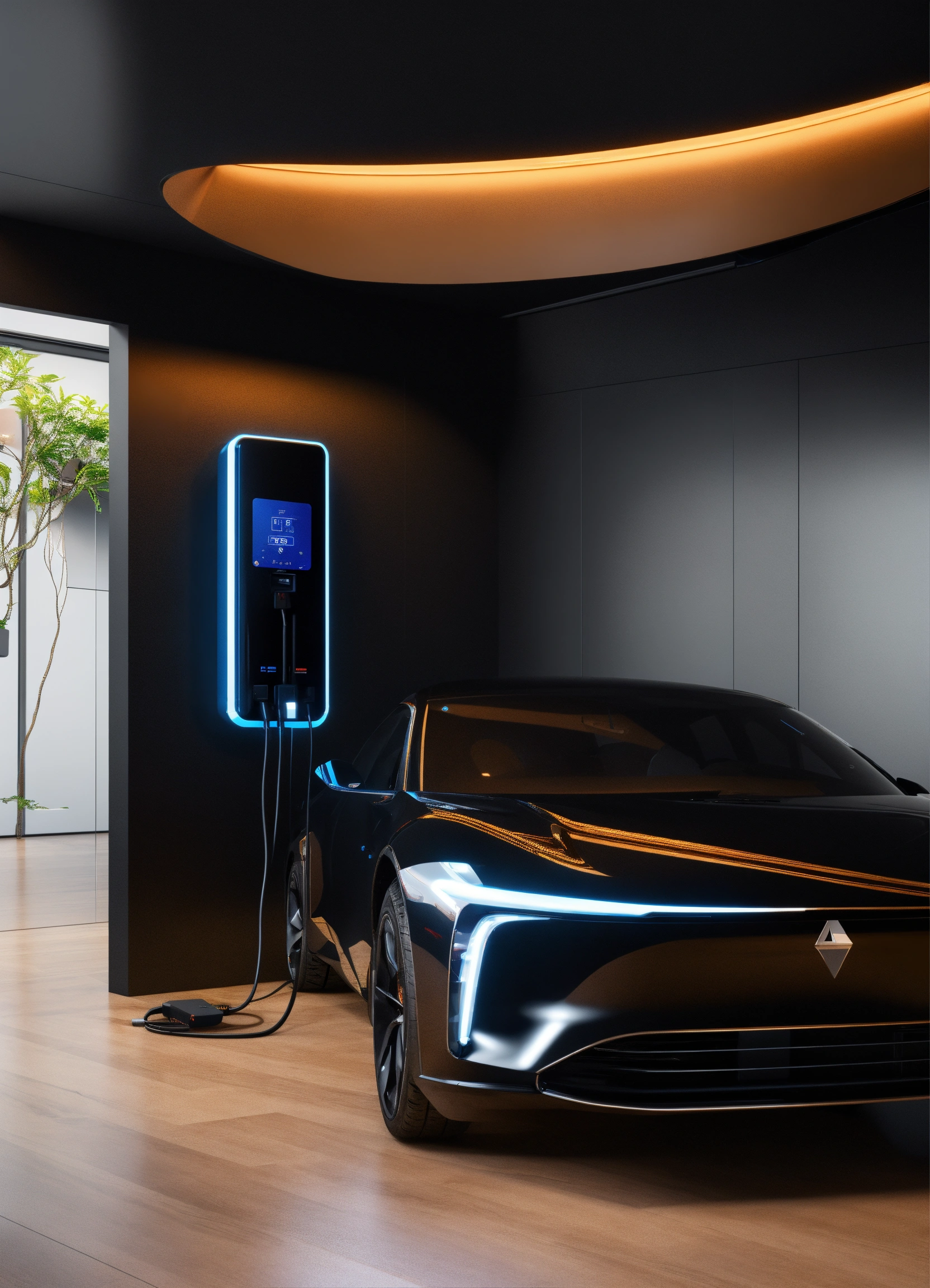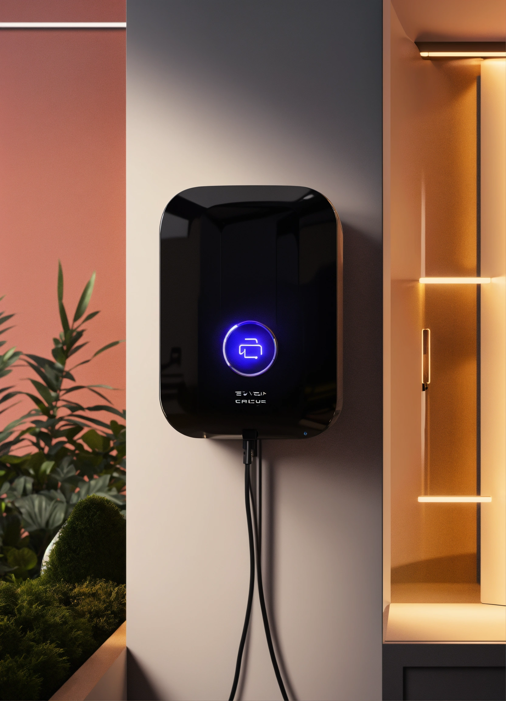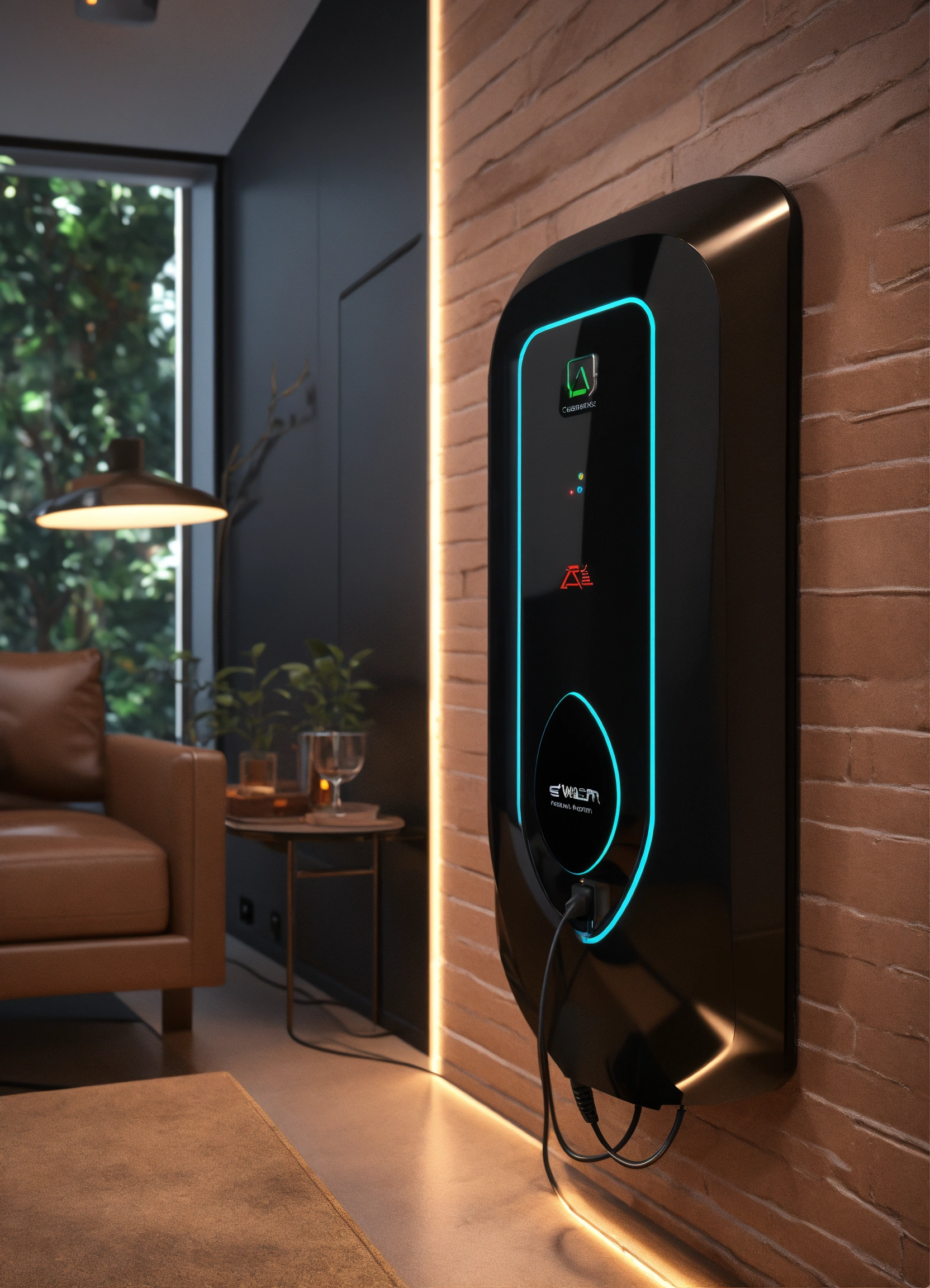 Small black wall mounted portable 11kw ev home charger, hi gloss, triangular top design, futuristic, tron, realistic, 3d, unreal engine, 8k