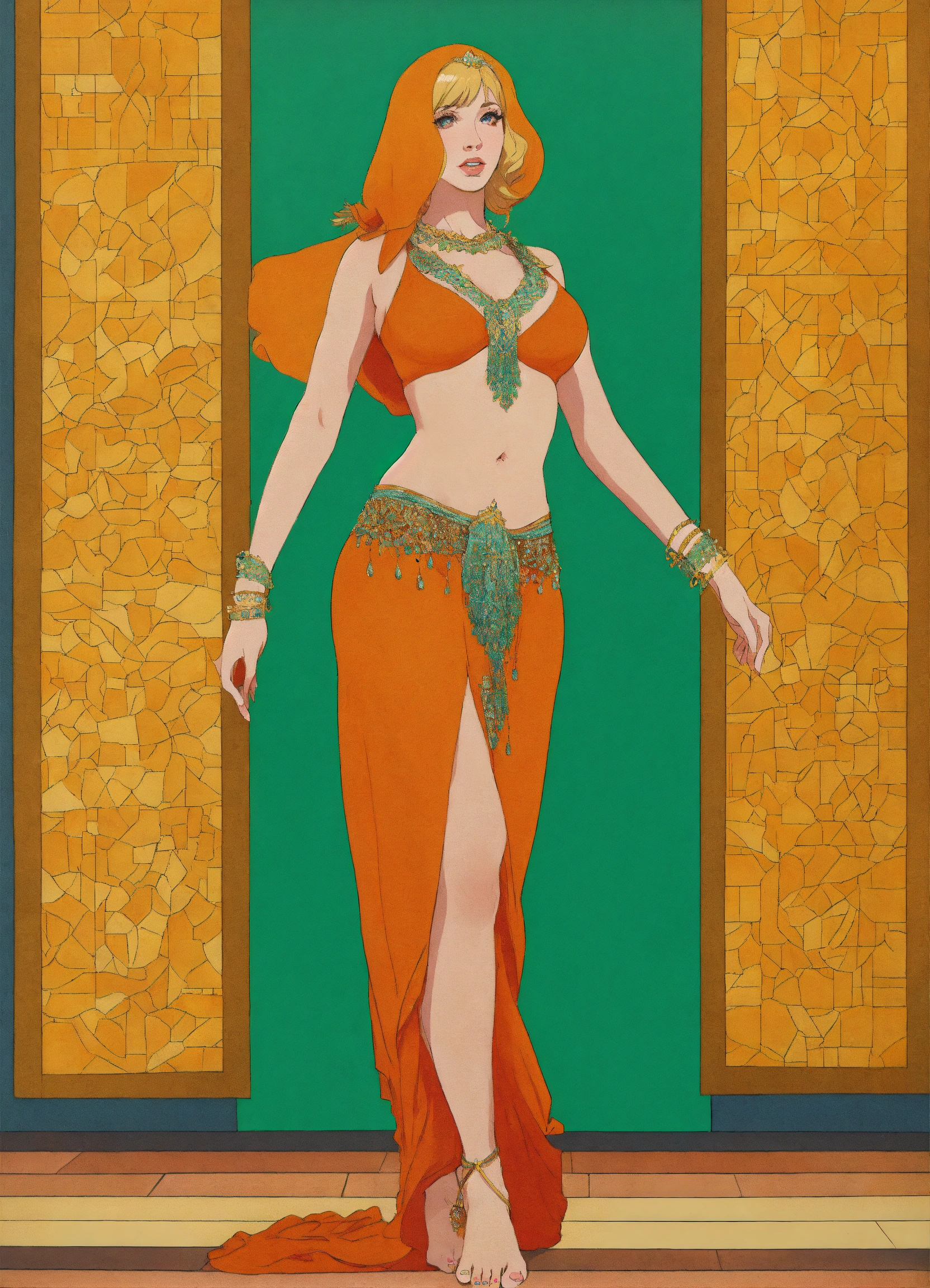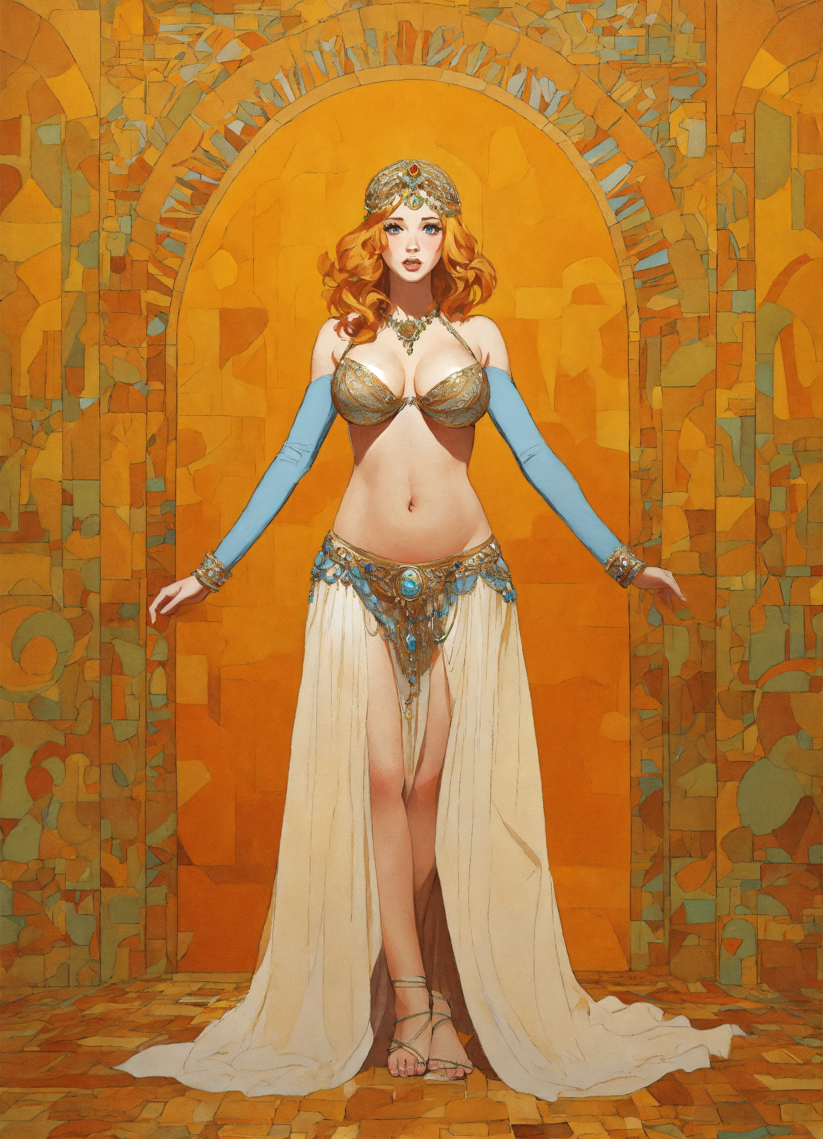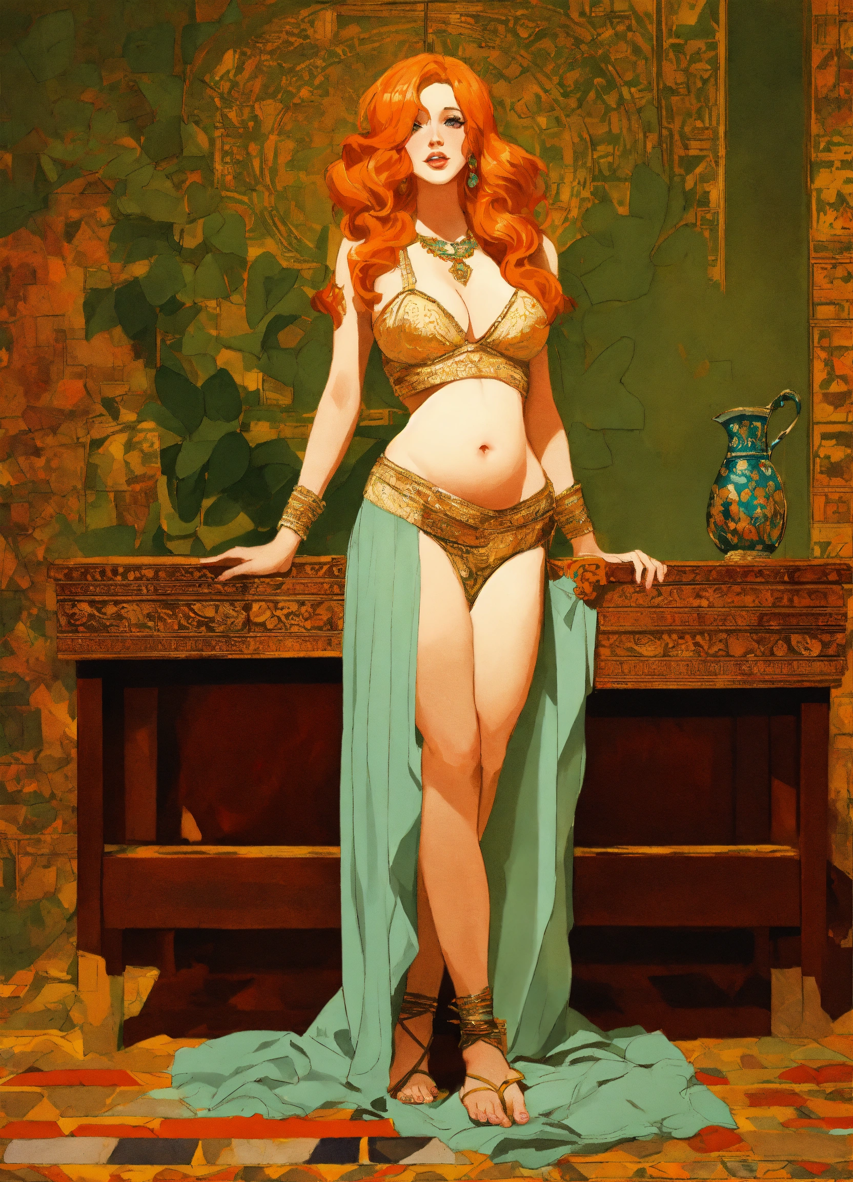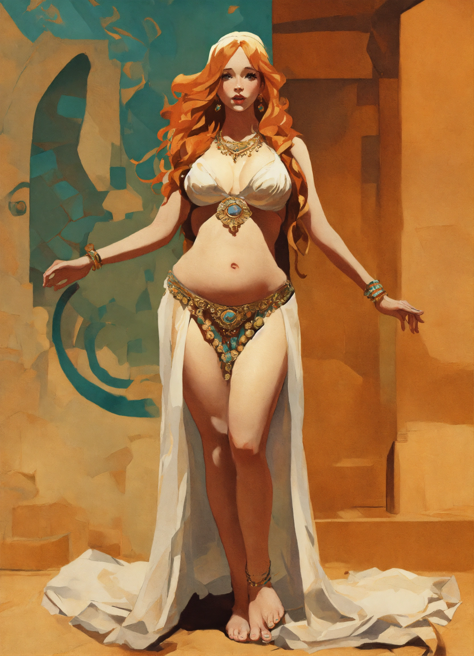 Blonde christina hendricks as steatopygic belly dancer, steatopygia, full body, 1960's fantasy book cover, paper drawing, minimalist far perspective, style by stefan kostic, barefoot, jordan grimmer, barefeet, gigantomastia, greg rutkowski