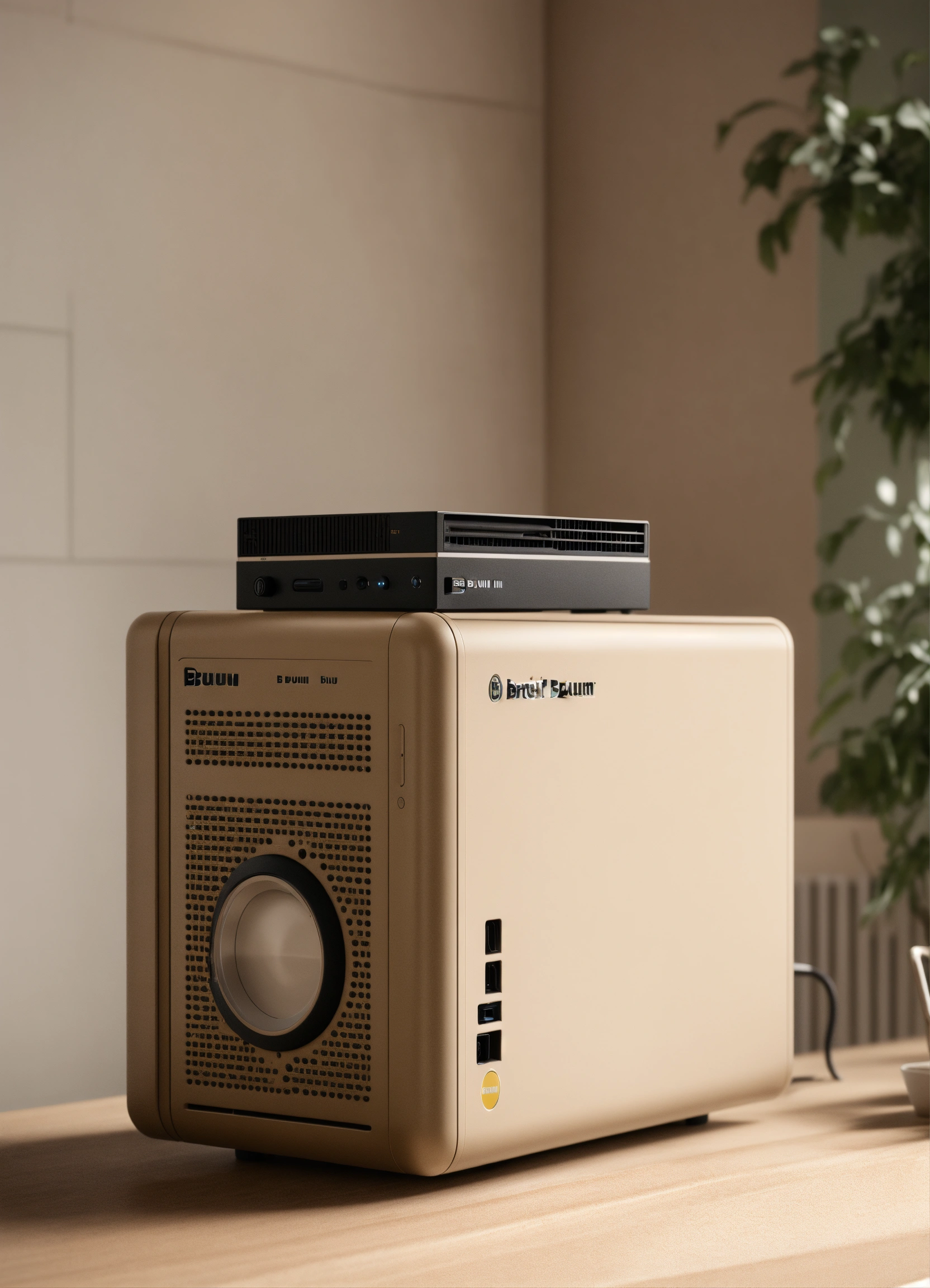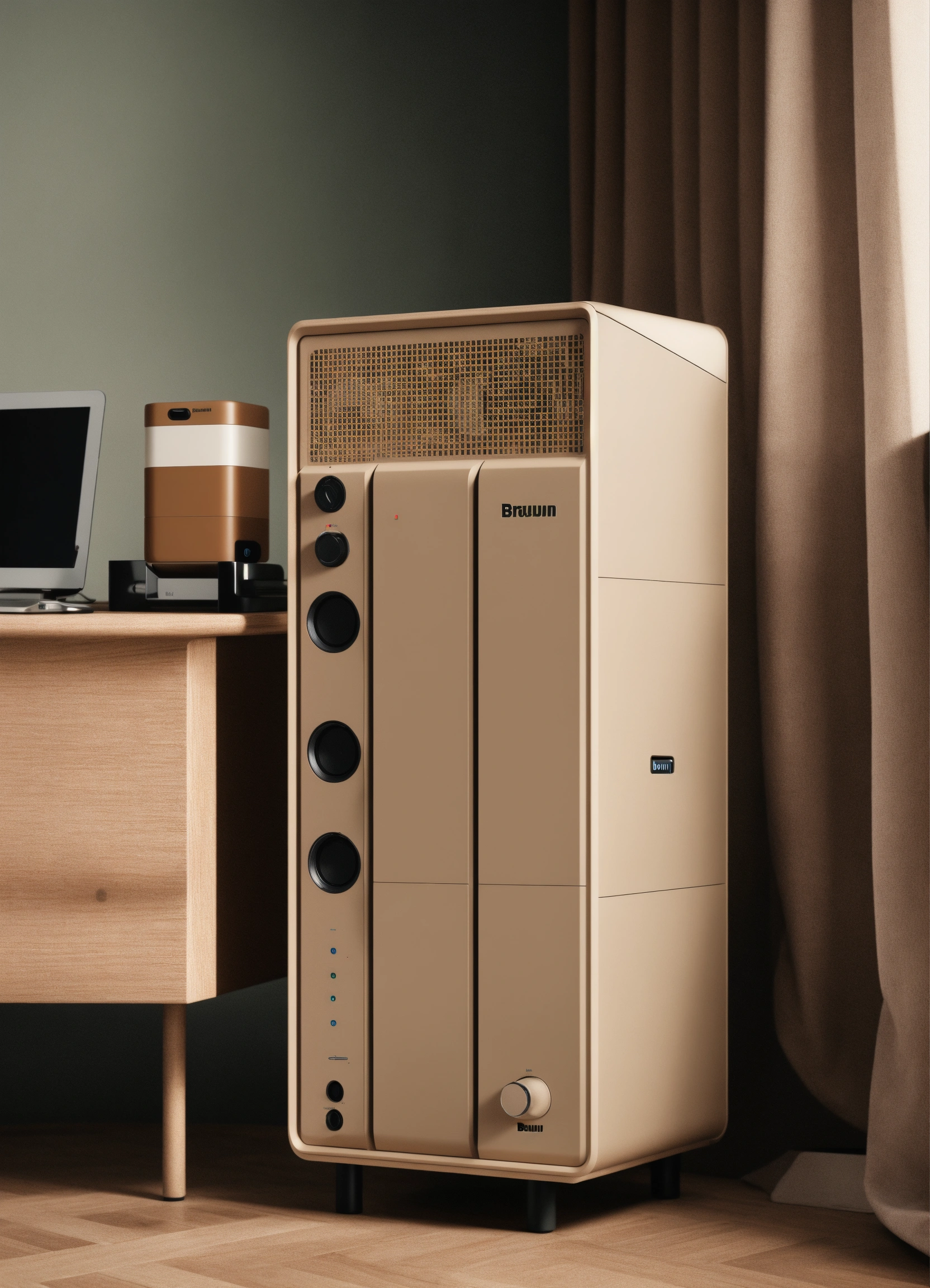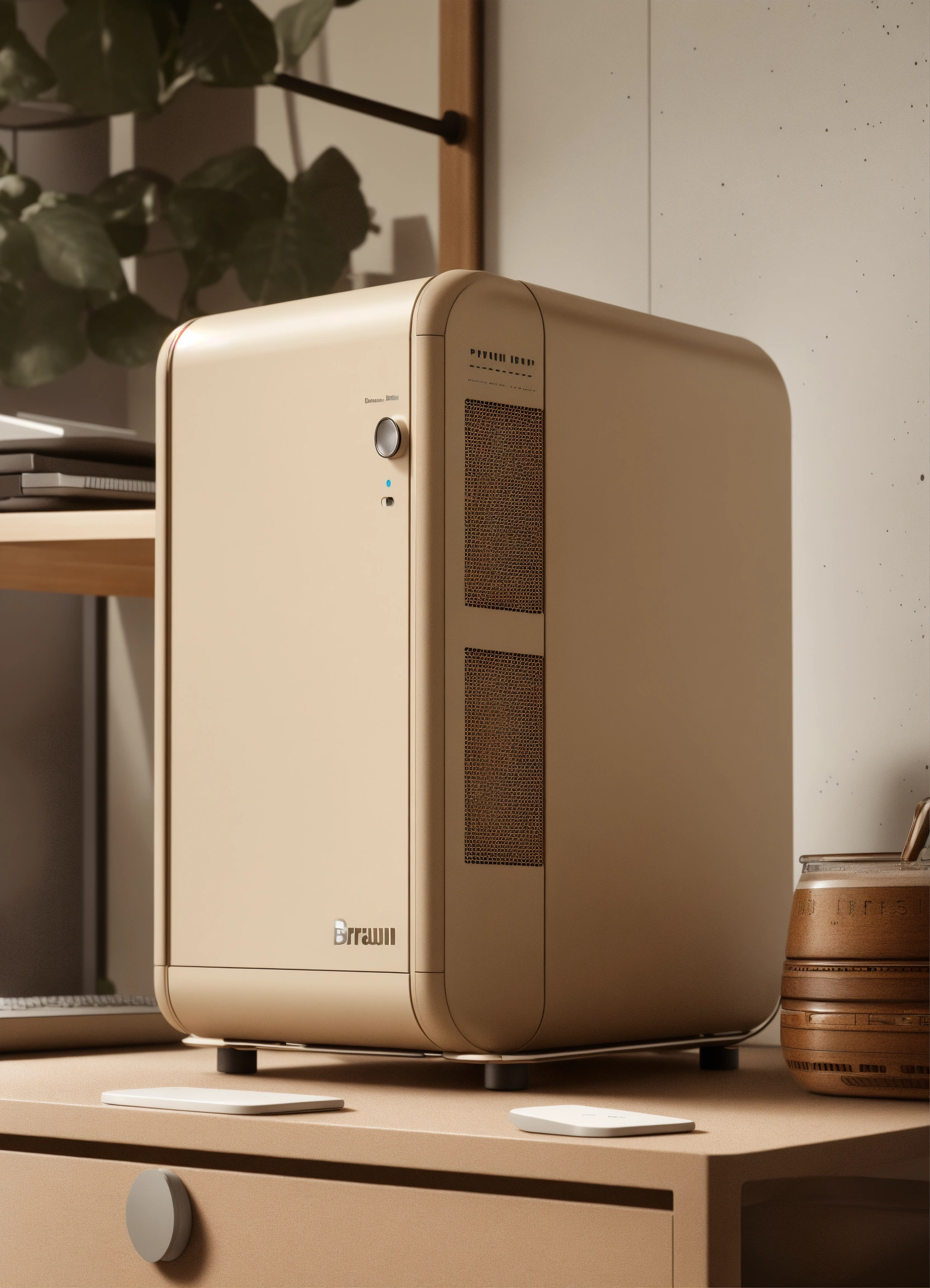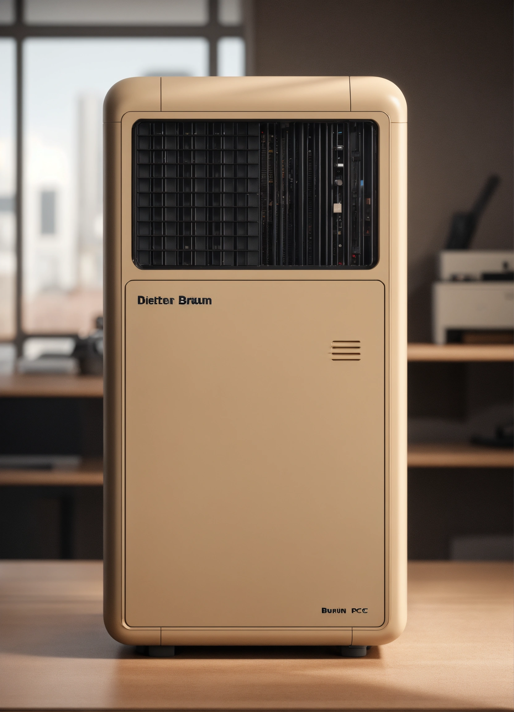 A stunning beige pc case designed by dieter rams, braun. product ad retro. industrial design inspiration. unreal engine render, natural lighting, on desk