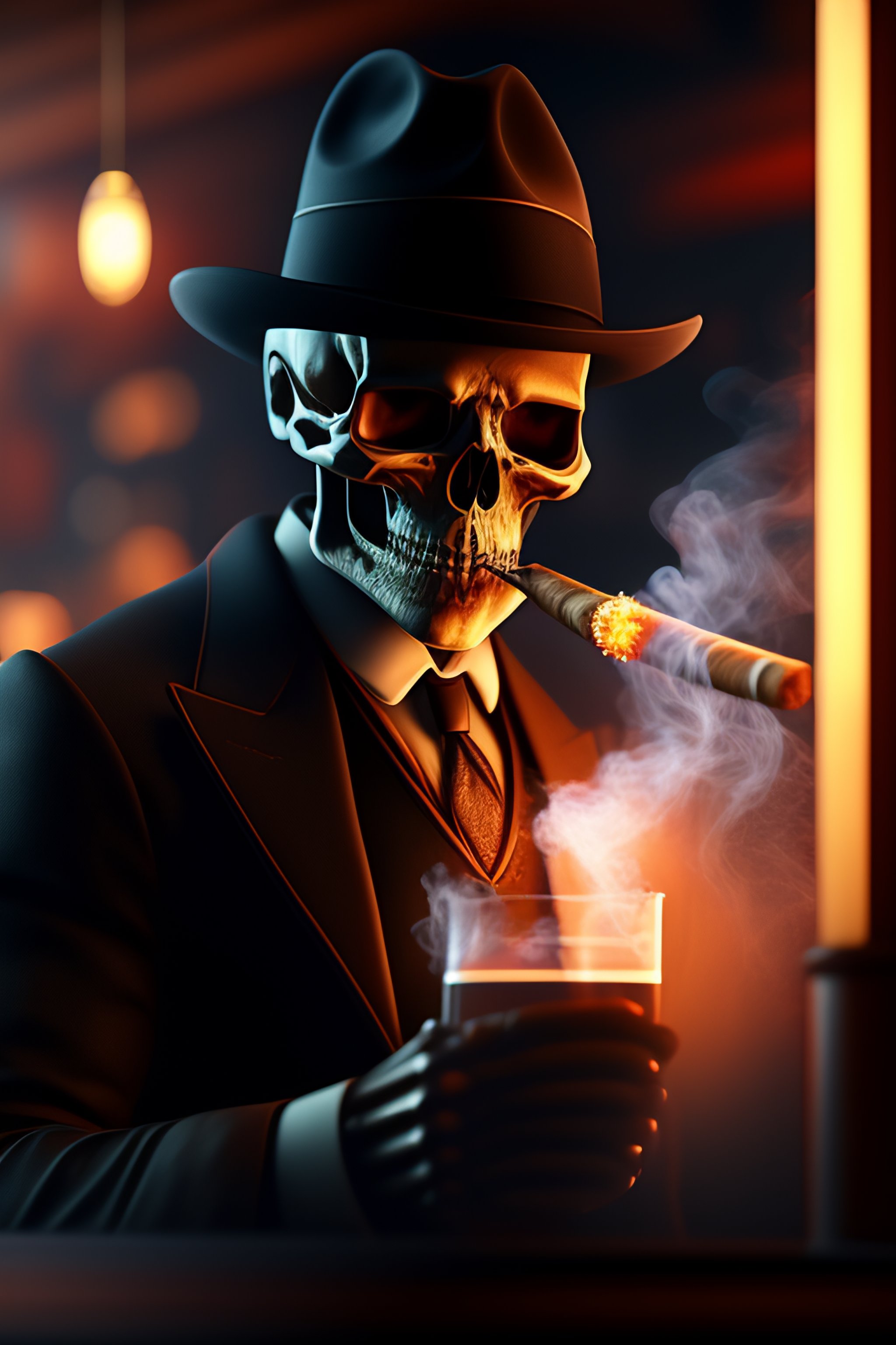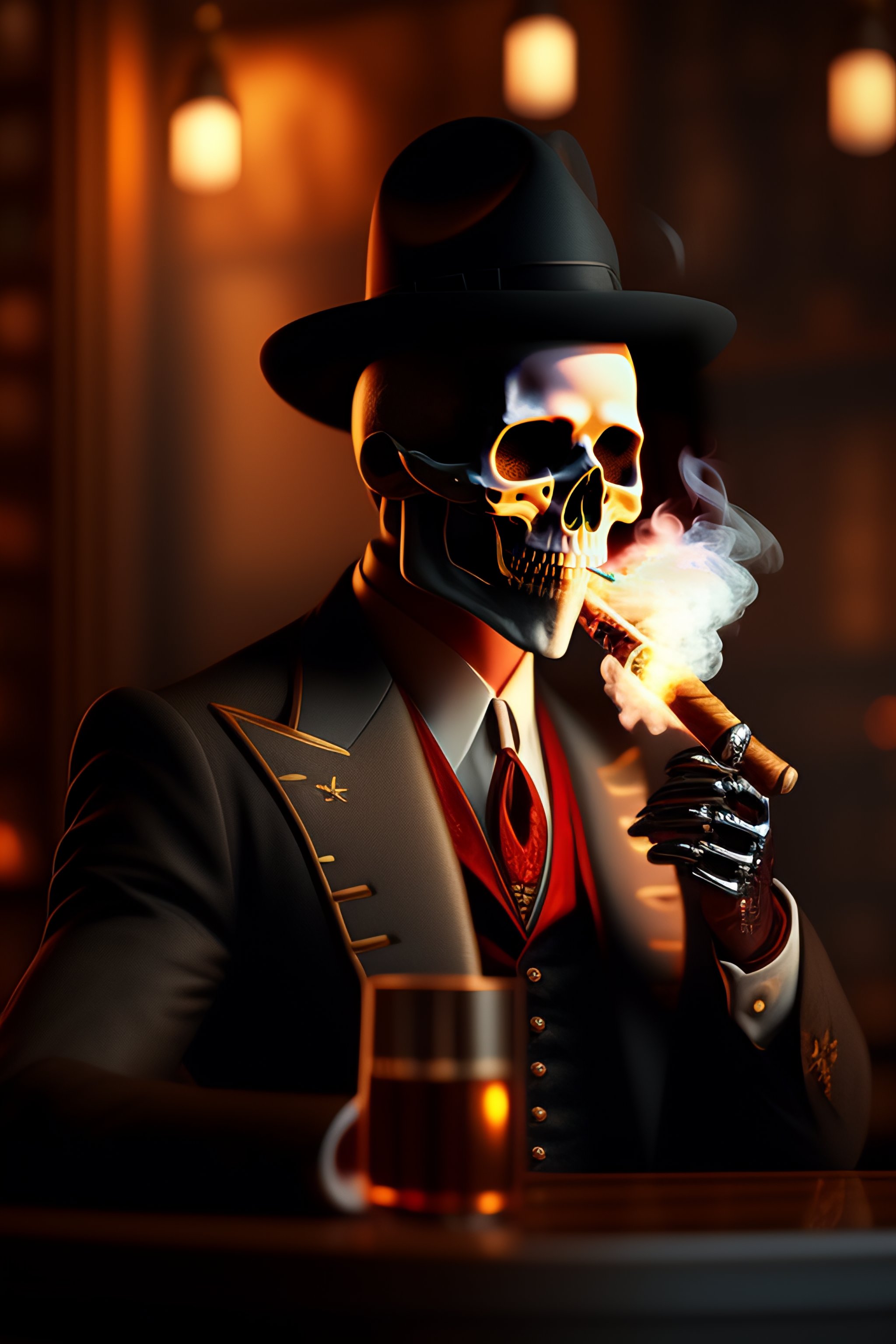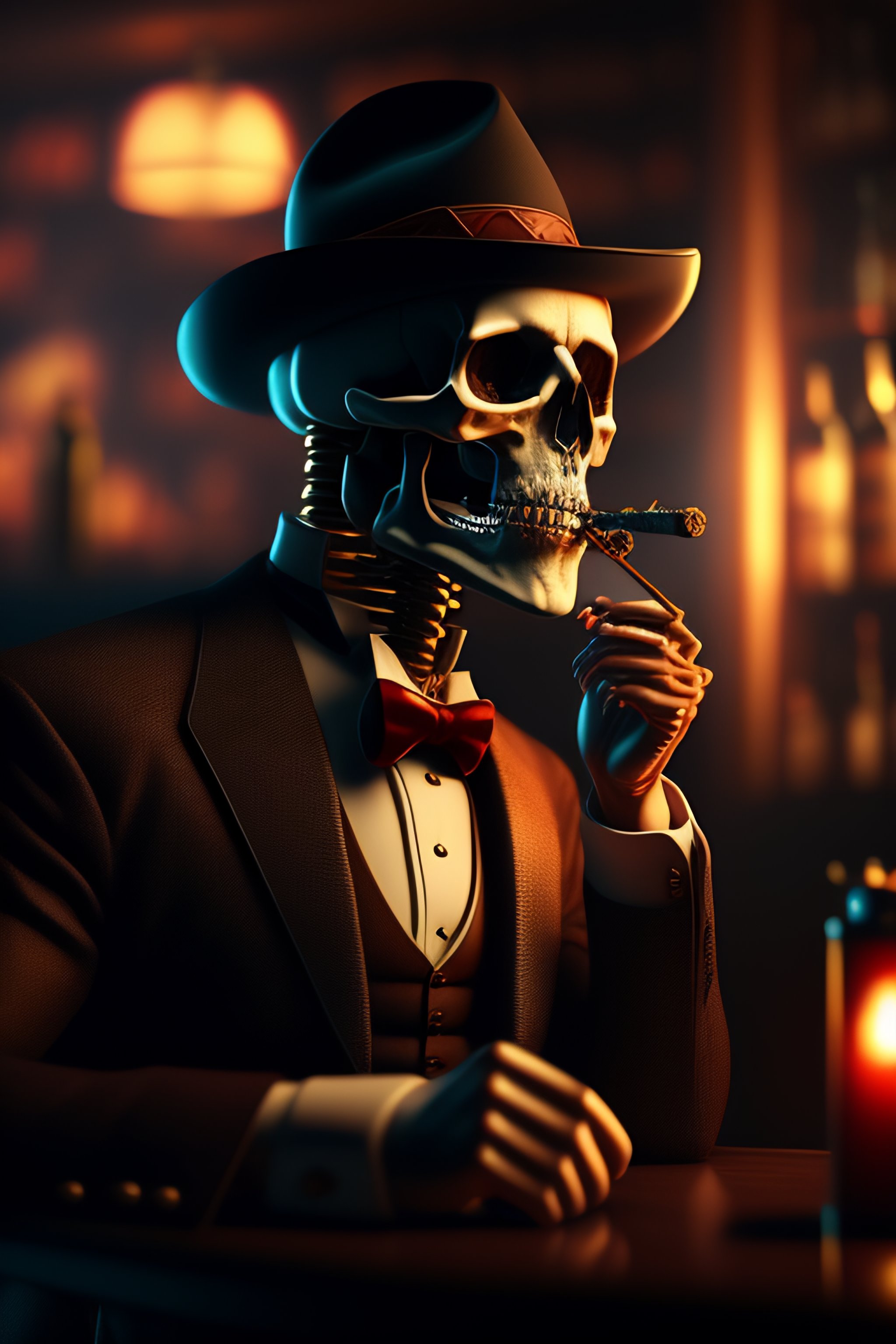 Gentleman skeleton smoking a cigar in a bar, cinematic lighting, dimly lit, hyper-detailed, hd, 4k, volumetric lighting