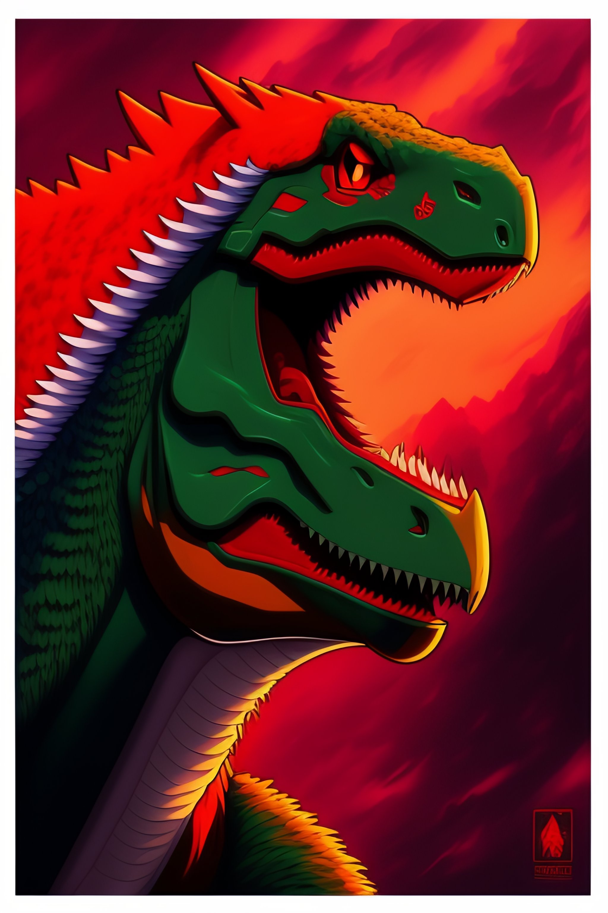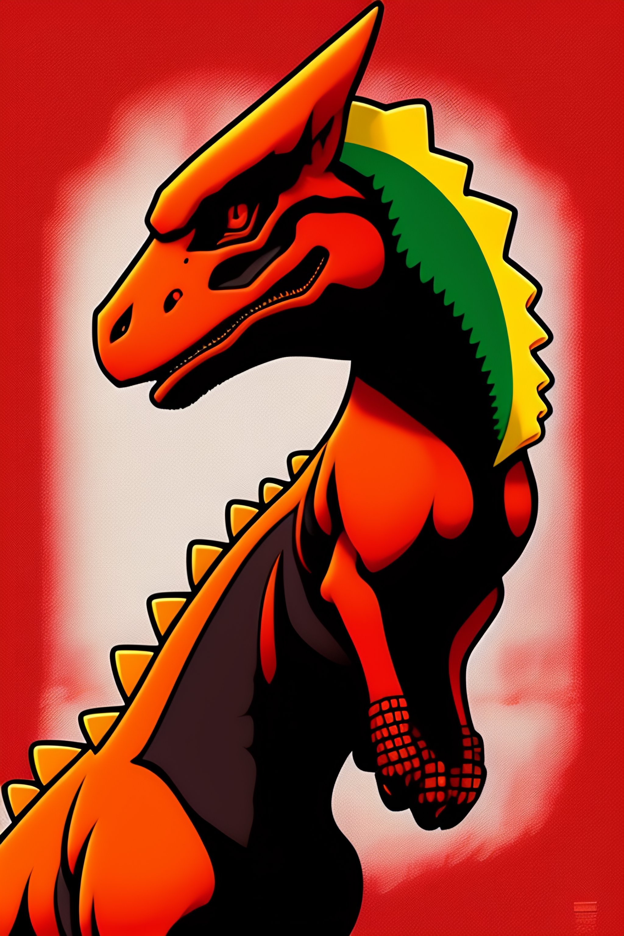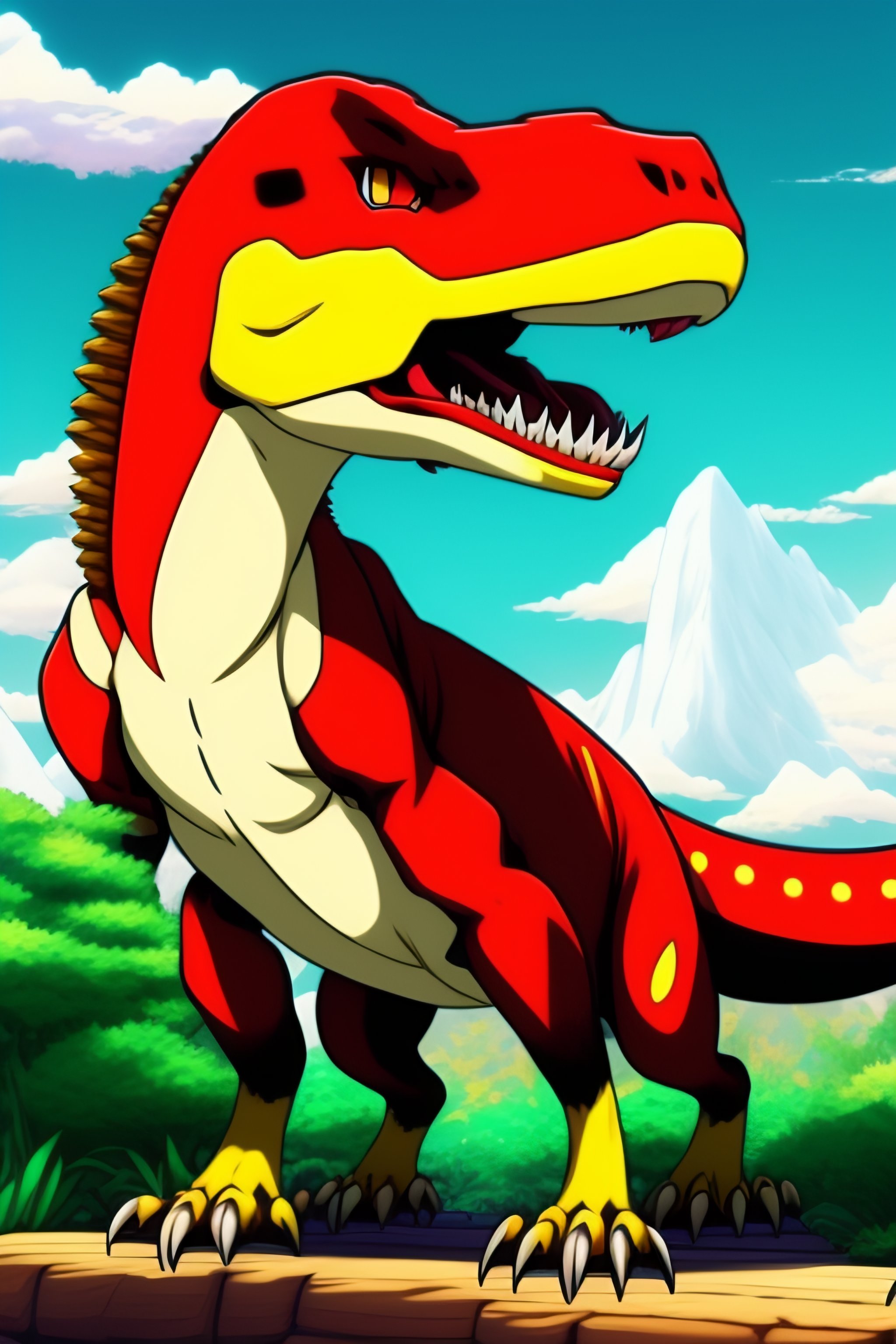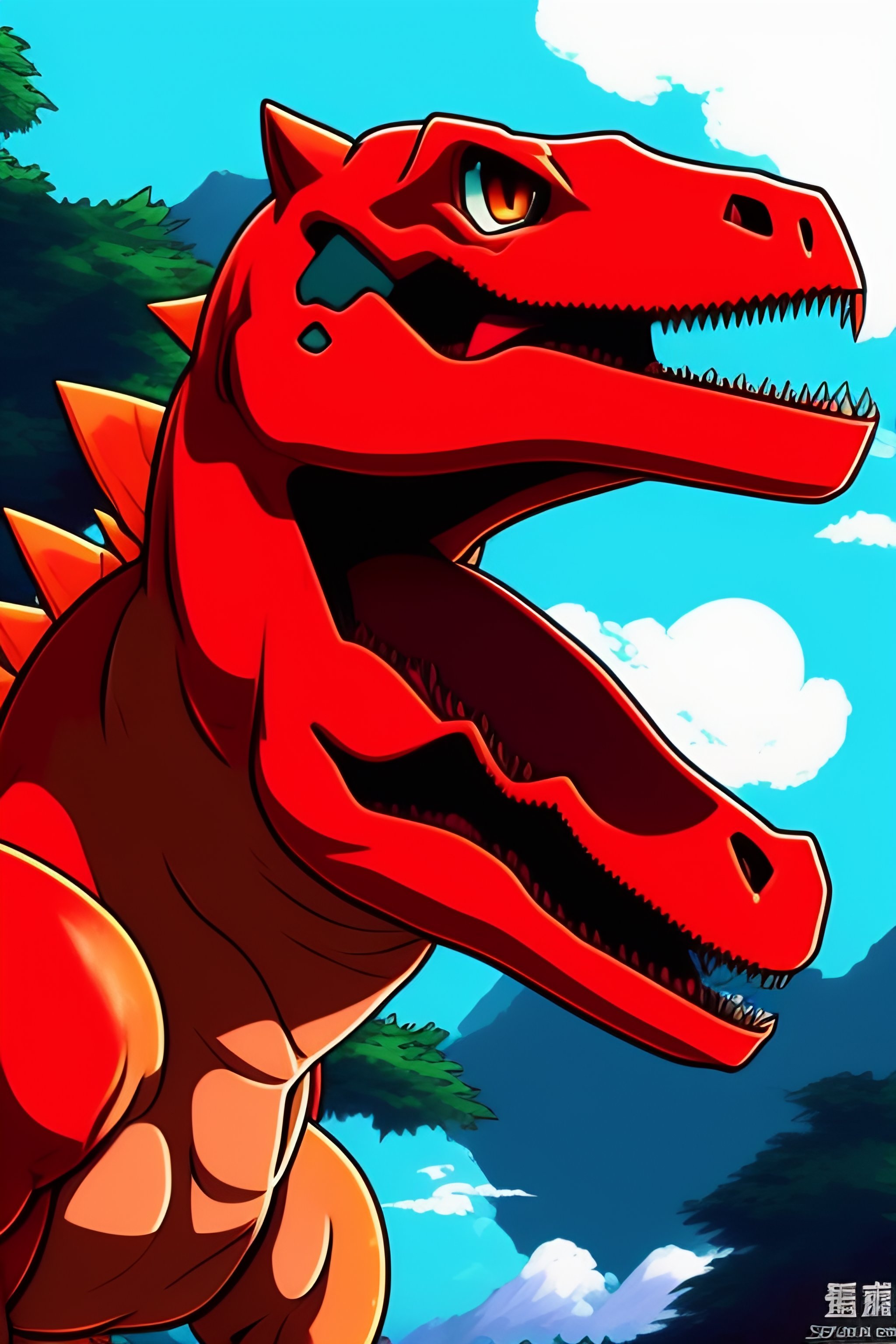 Anime illustration of a pokemon red-coloured raptor dinosaur