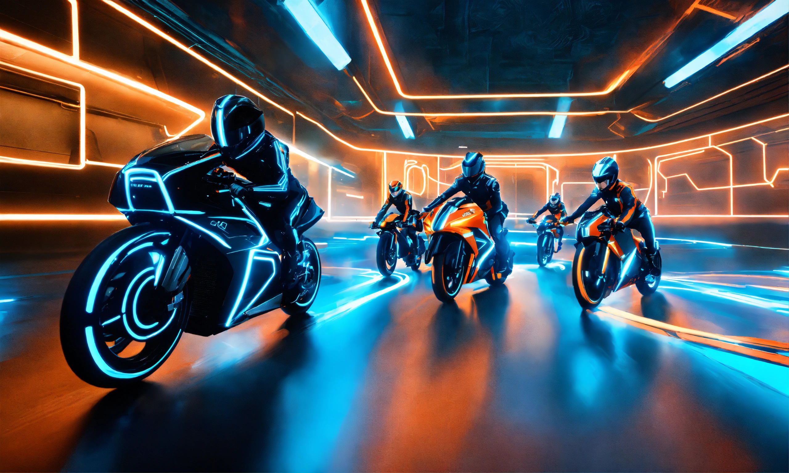 Light cycles from the movie tron legacy, racing against each other on the green, neon blue and neon orange on different light cycles, light walls generating behind the cycles, battle each other