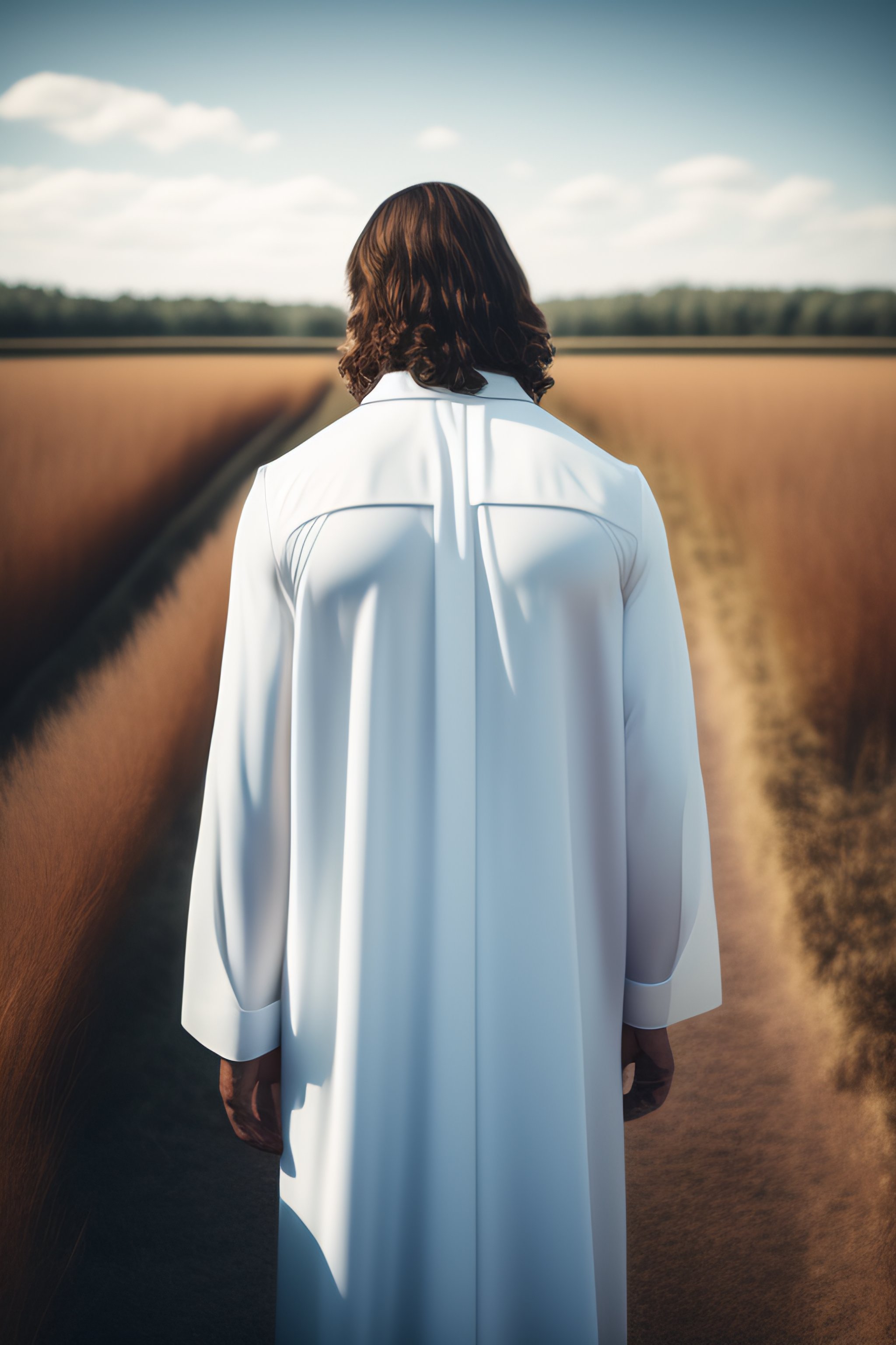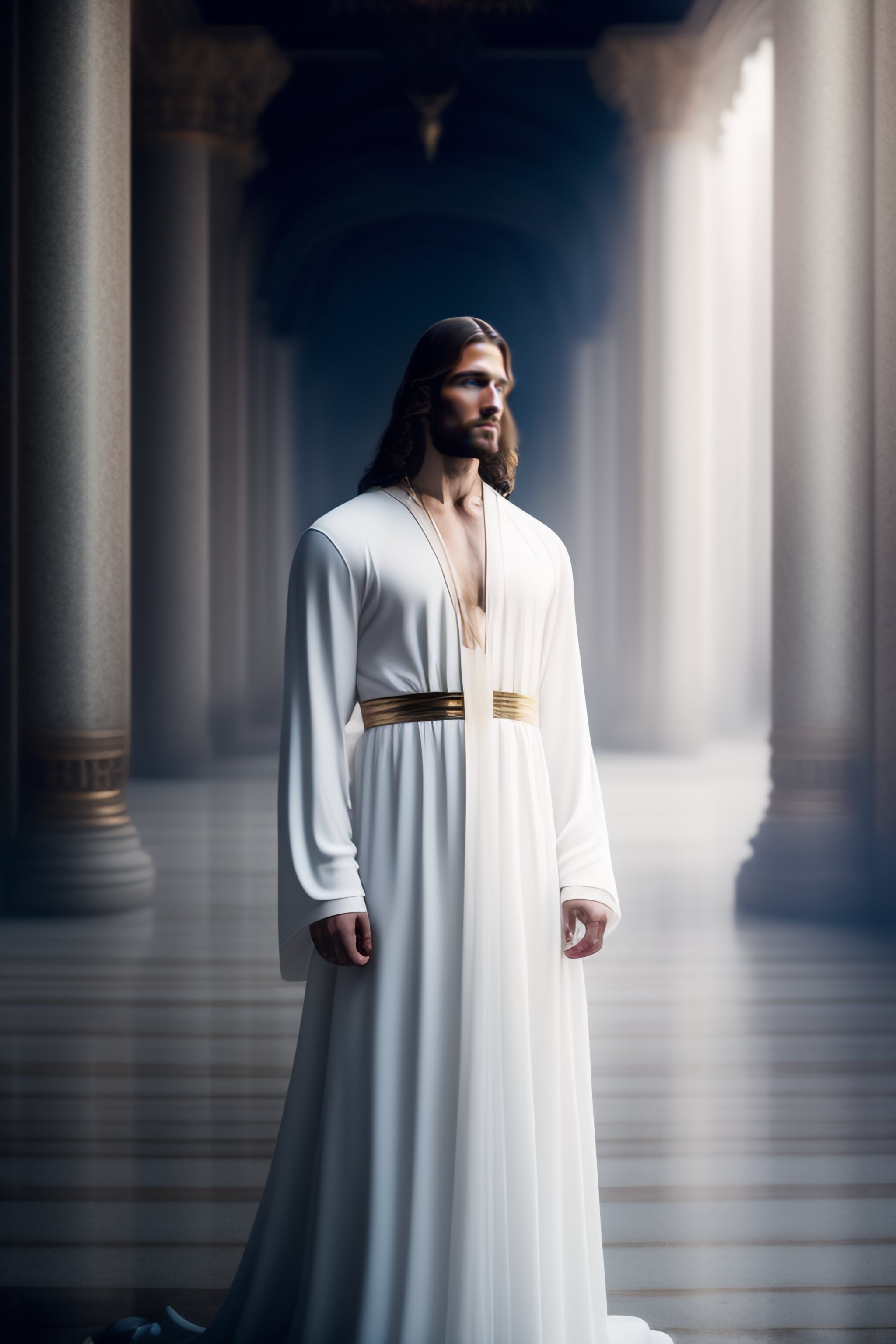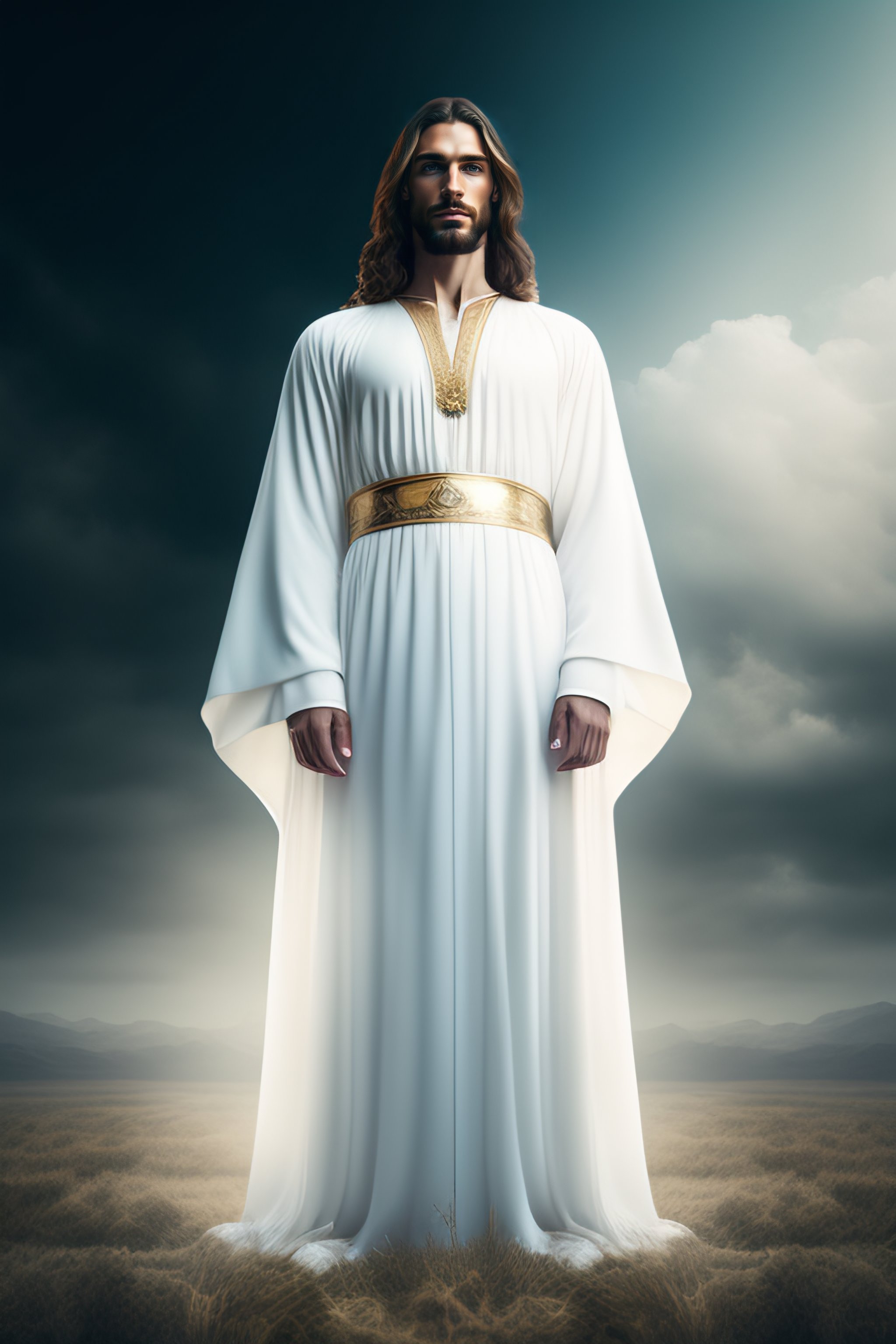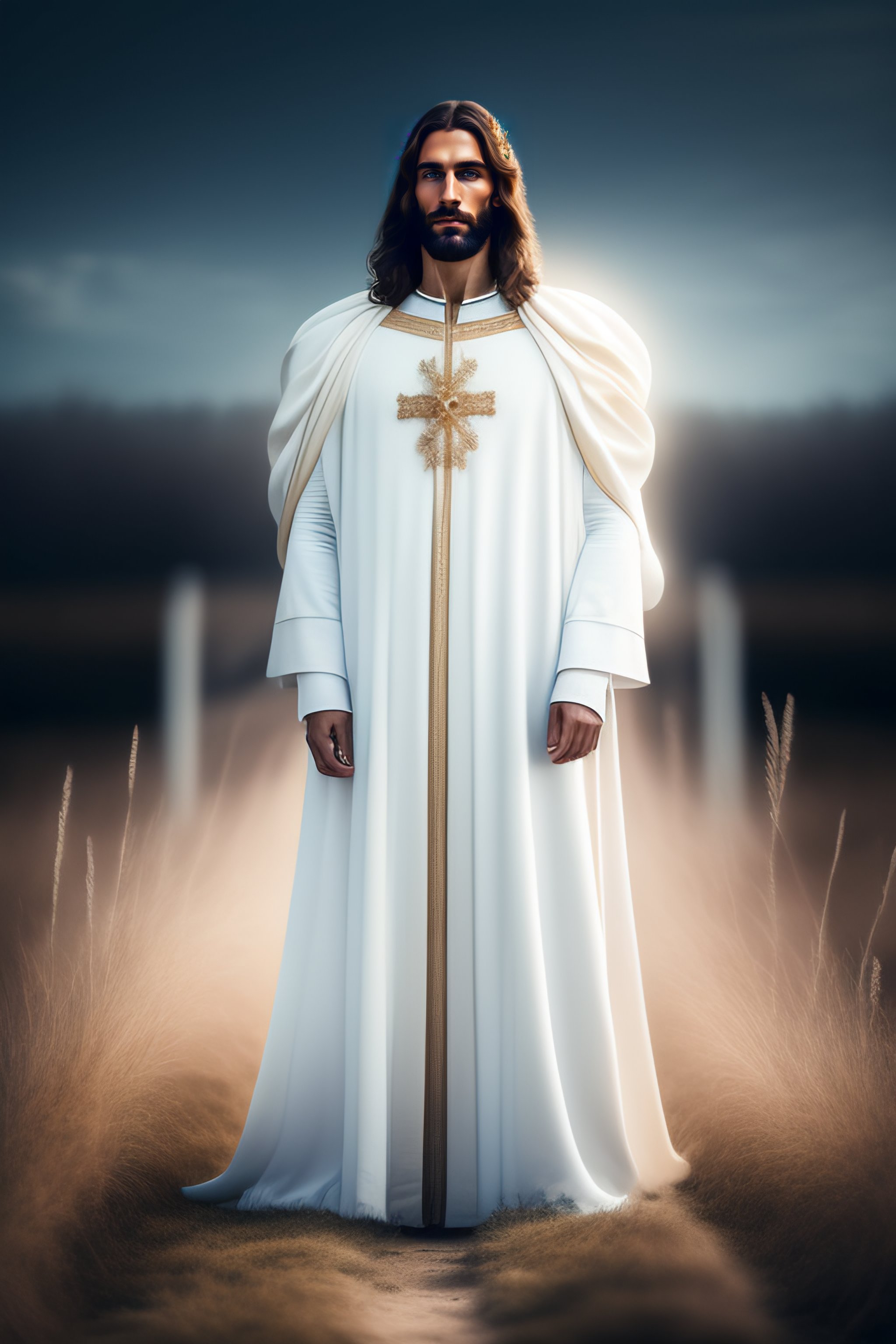 Jesus christ, realistic photography, dressed, man, suffering, white long clothes, crown, heaven on the background