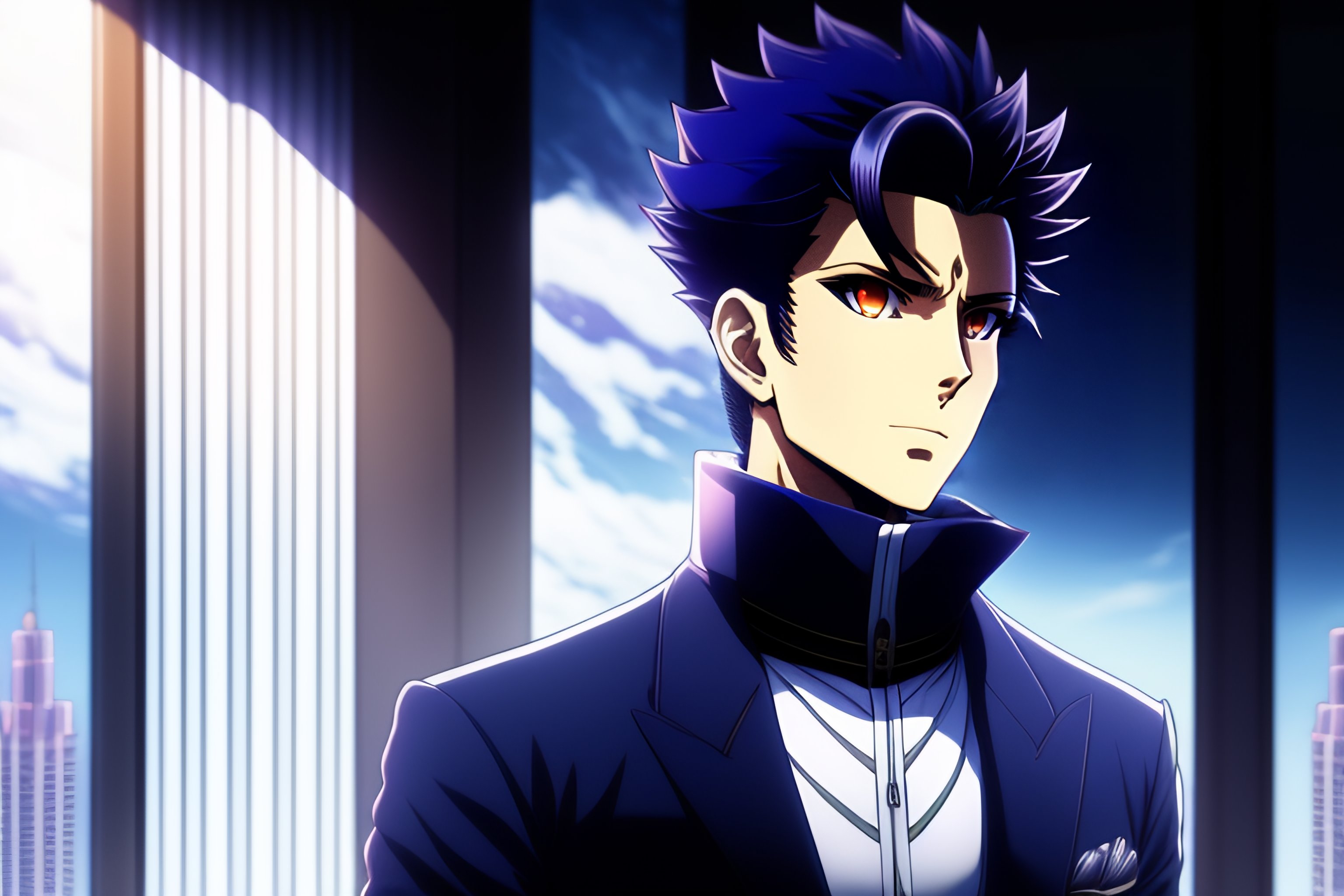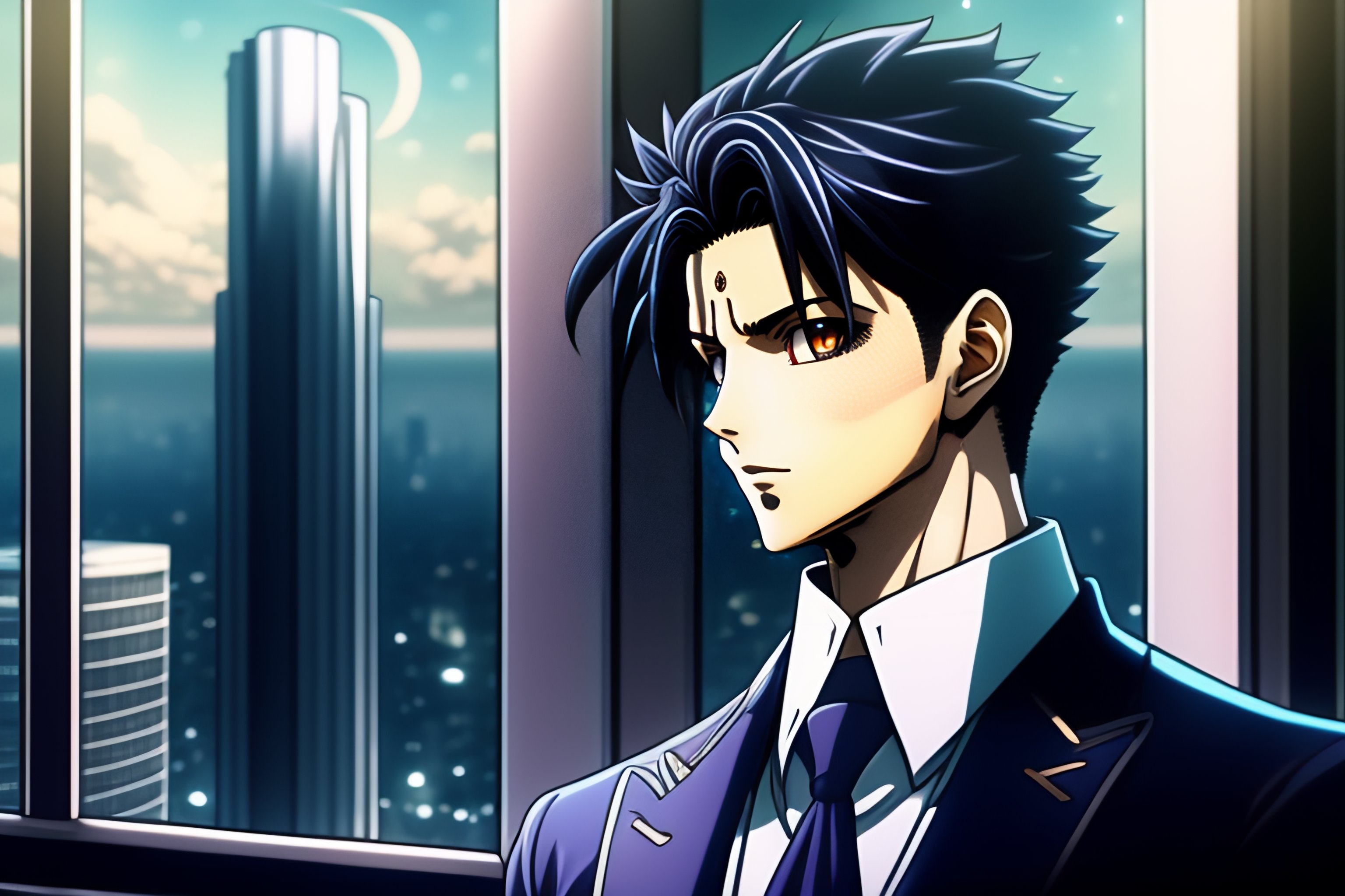 Illustration of chrollo from hunter x hunter in a skyscraper on the balcony at night, facing the back, holding a bible, yoshihiro togashi, well-defined facial structure, extremely detailed, uhd, artstation