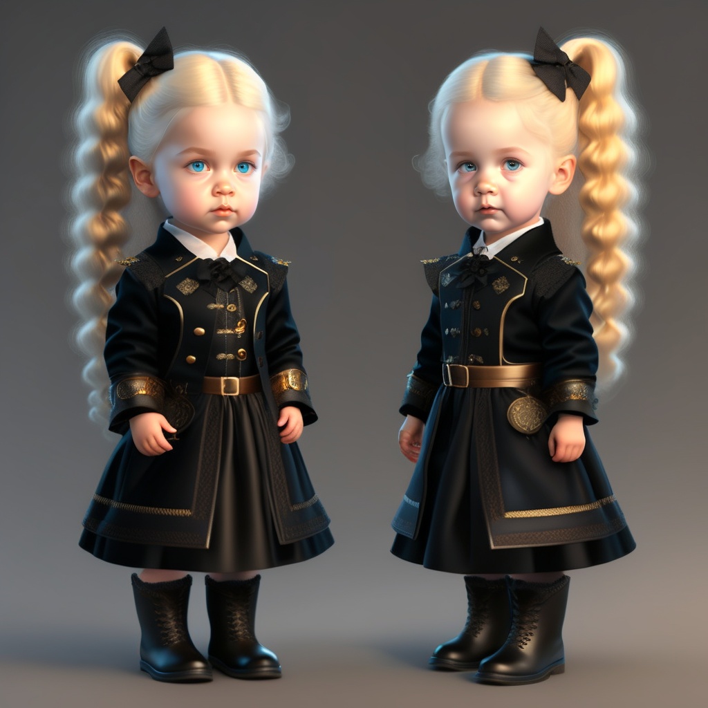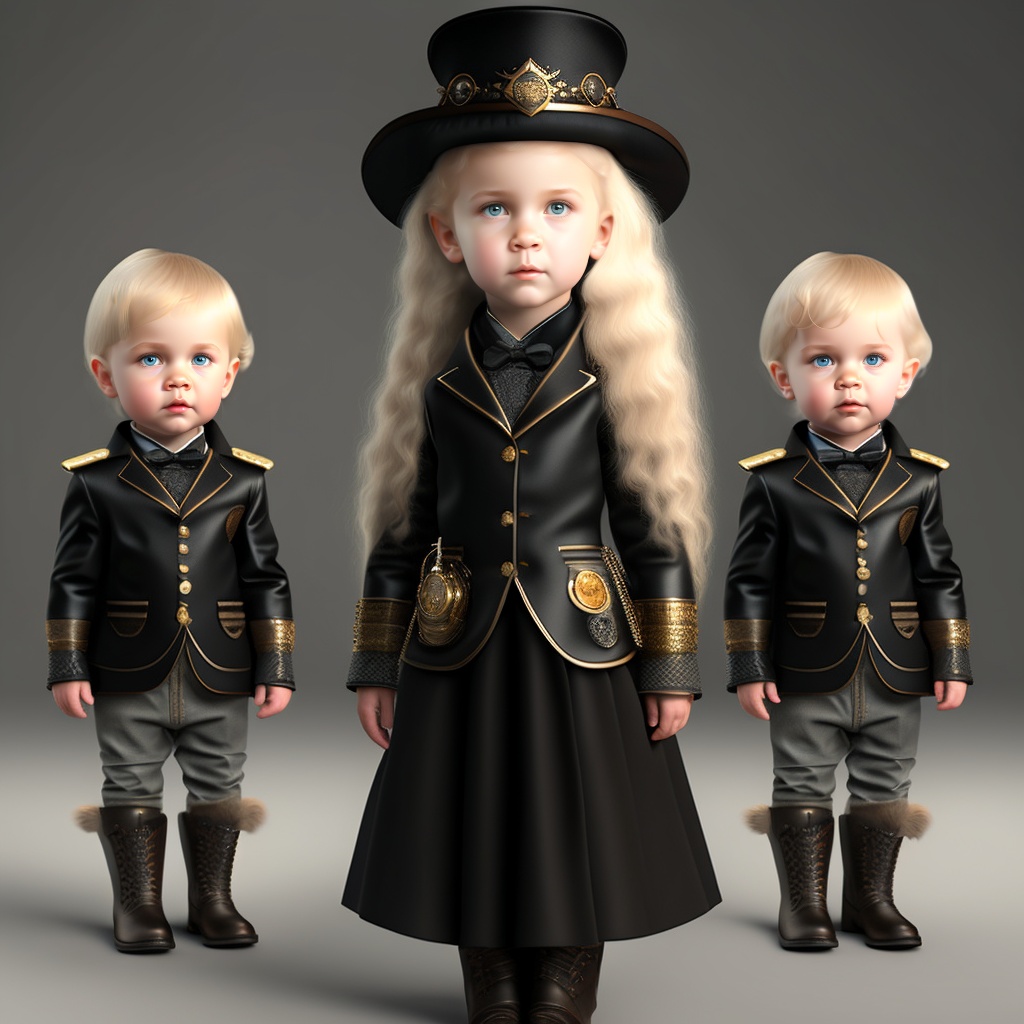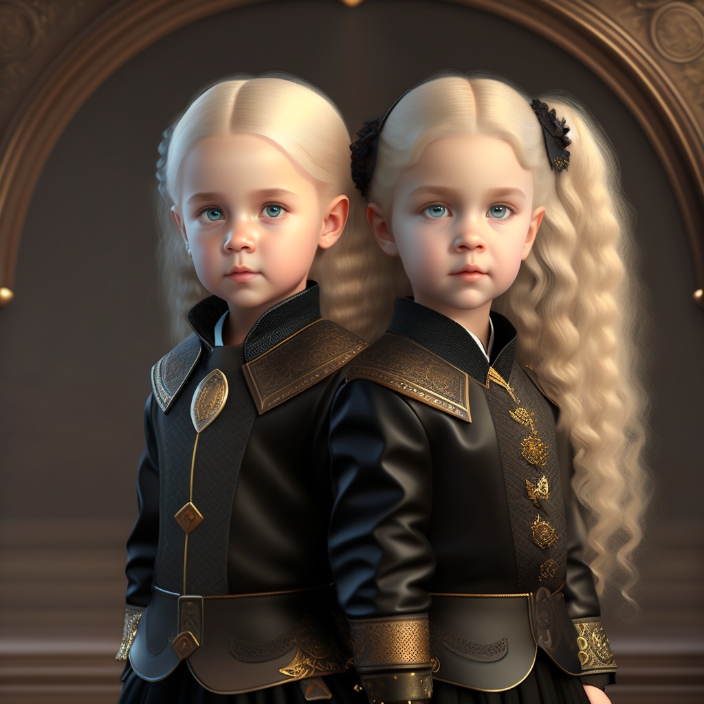 Little kid daenerys targaryen sad expression wearing steampunk black clothes realistic 3d render --q 5 --ar 1:1, twins, in full growth, platinum blonde