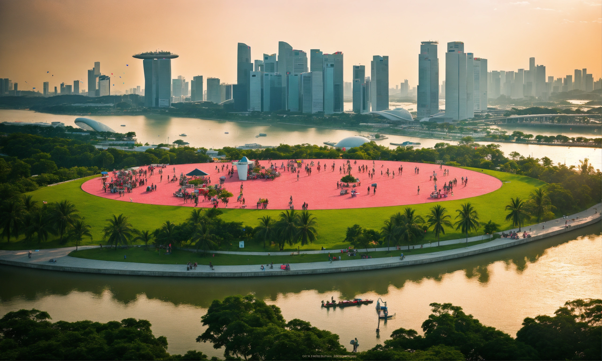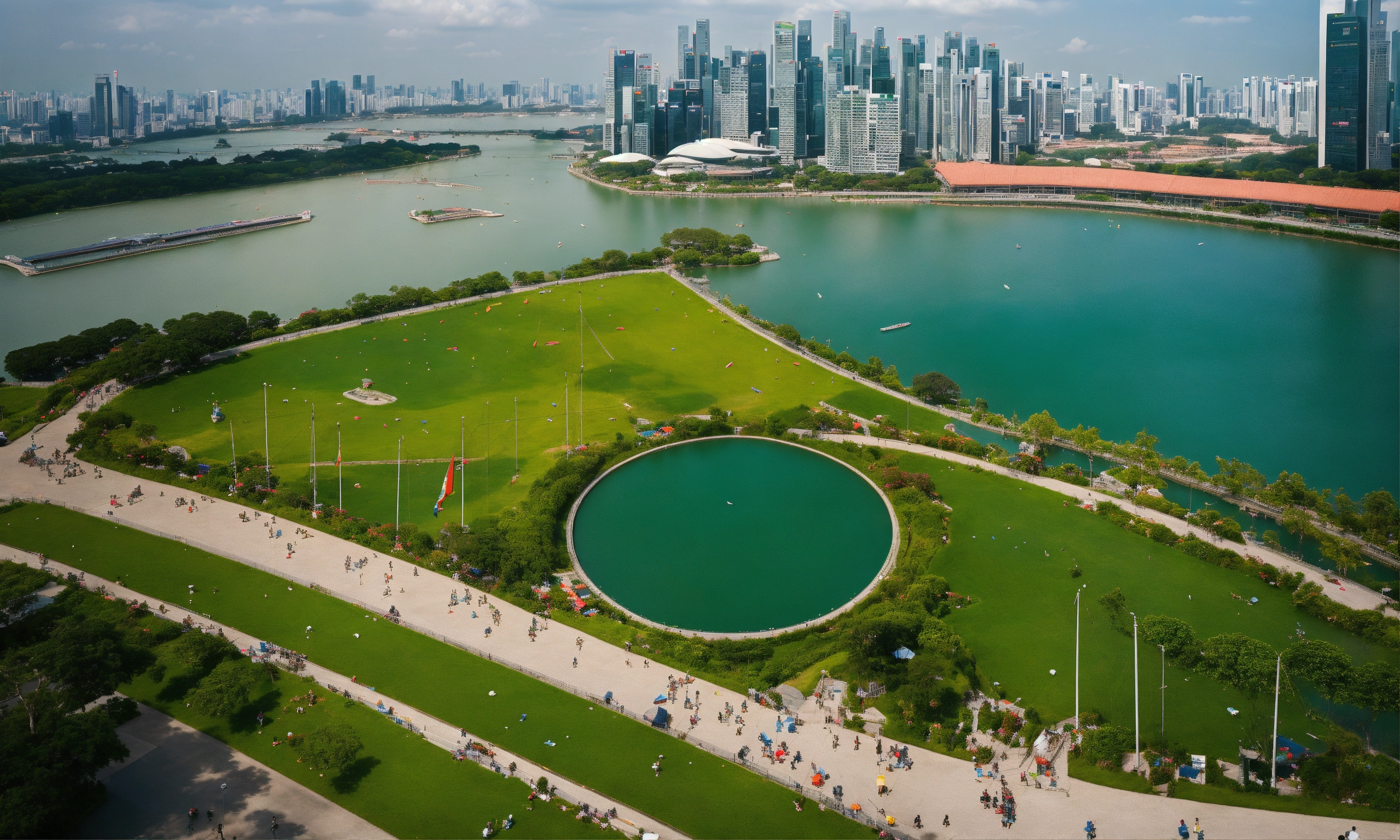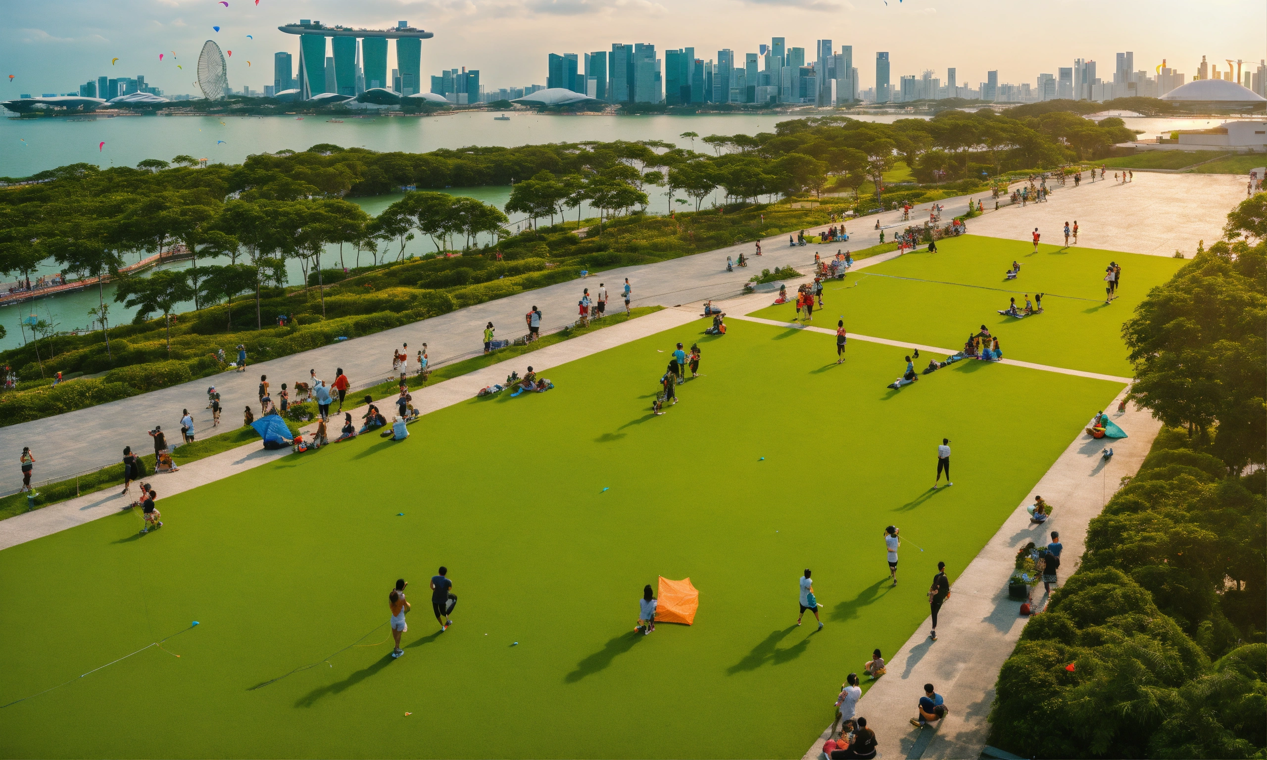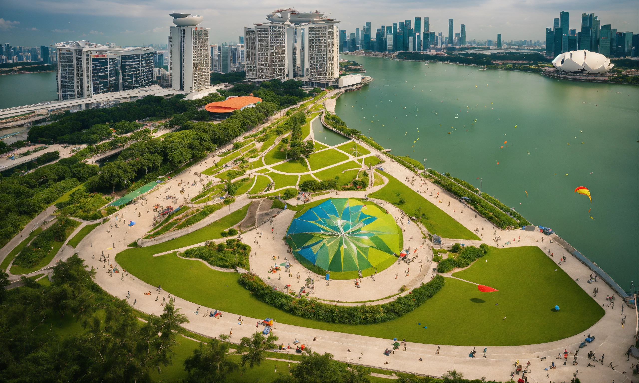 Ultra-realistic photo, cinematic quality, afternoon setting, aerial view capturing the activity on the vast green rooftop singapore's marina barrage the barrage is packed with people with families flying kites, joggers taking in the view, and tourists snapping photos; modern urban attire, expressions of awe and relaxation. under the bright afternoon sun, the barrage gleams, showcasing its marvel of modern engineering. themes modern nostalgia, juxtaposition of nature, sustainable infrastructure, and recreation, reflections on the water's surface, 70mm camera to capture vast expanse, portra 400 film for rich contrasts and colors, slight film grain for added texture