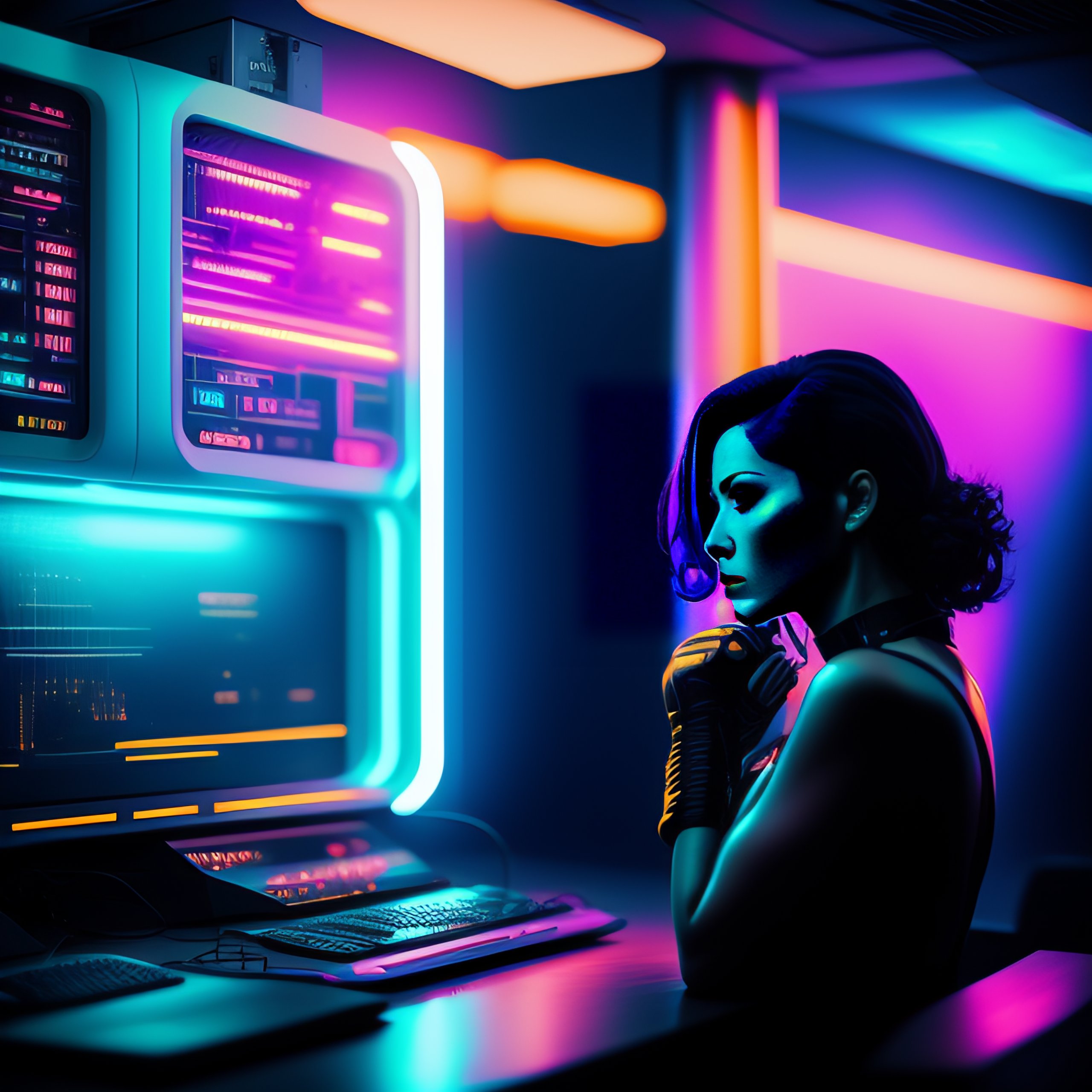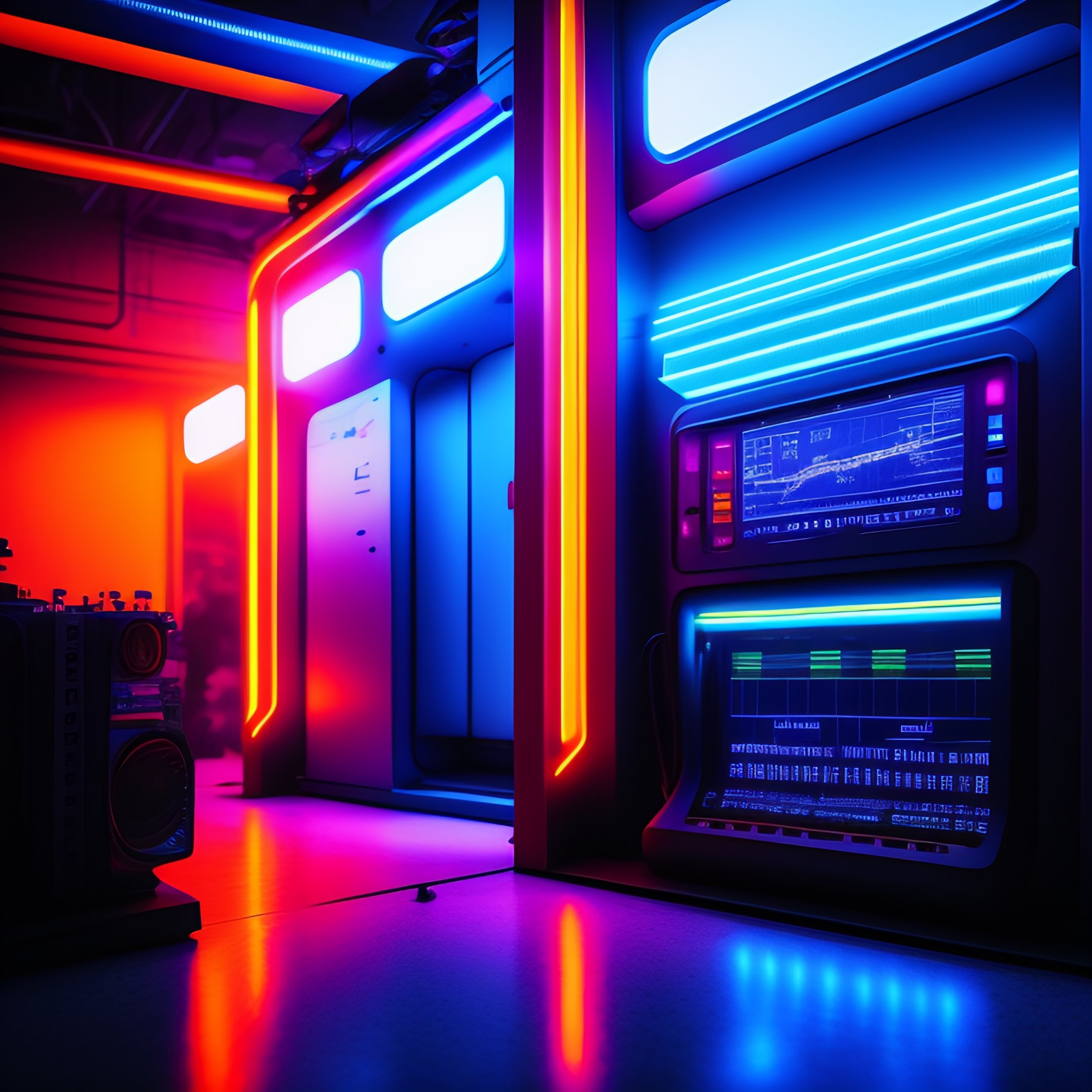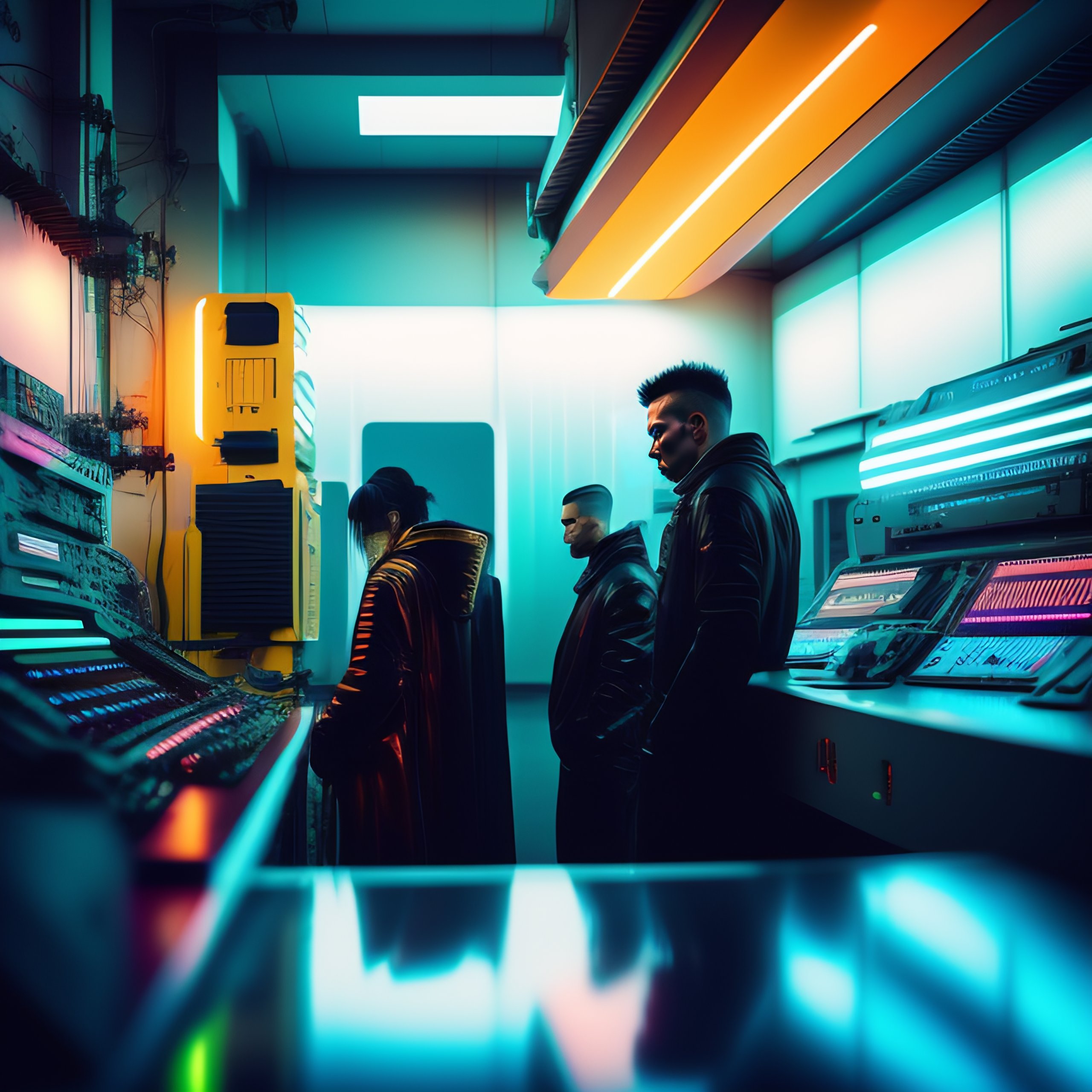 Sci-fi tron cybernetic trans-humanist cyberpunk industrial electro-punk band in hi tech lab, neon, muted colors, wires, machines, cinematic photograph +photos taken hasselblad xpan camera +photos taken from a fuji tx1 +sharpened. pain, fear gloom doom, moody atmospheric