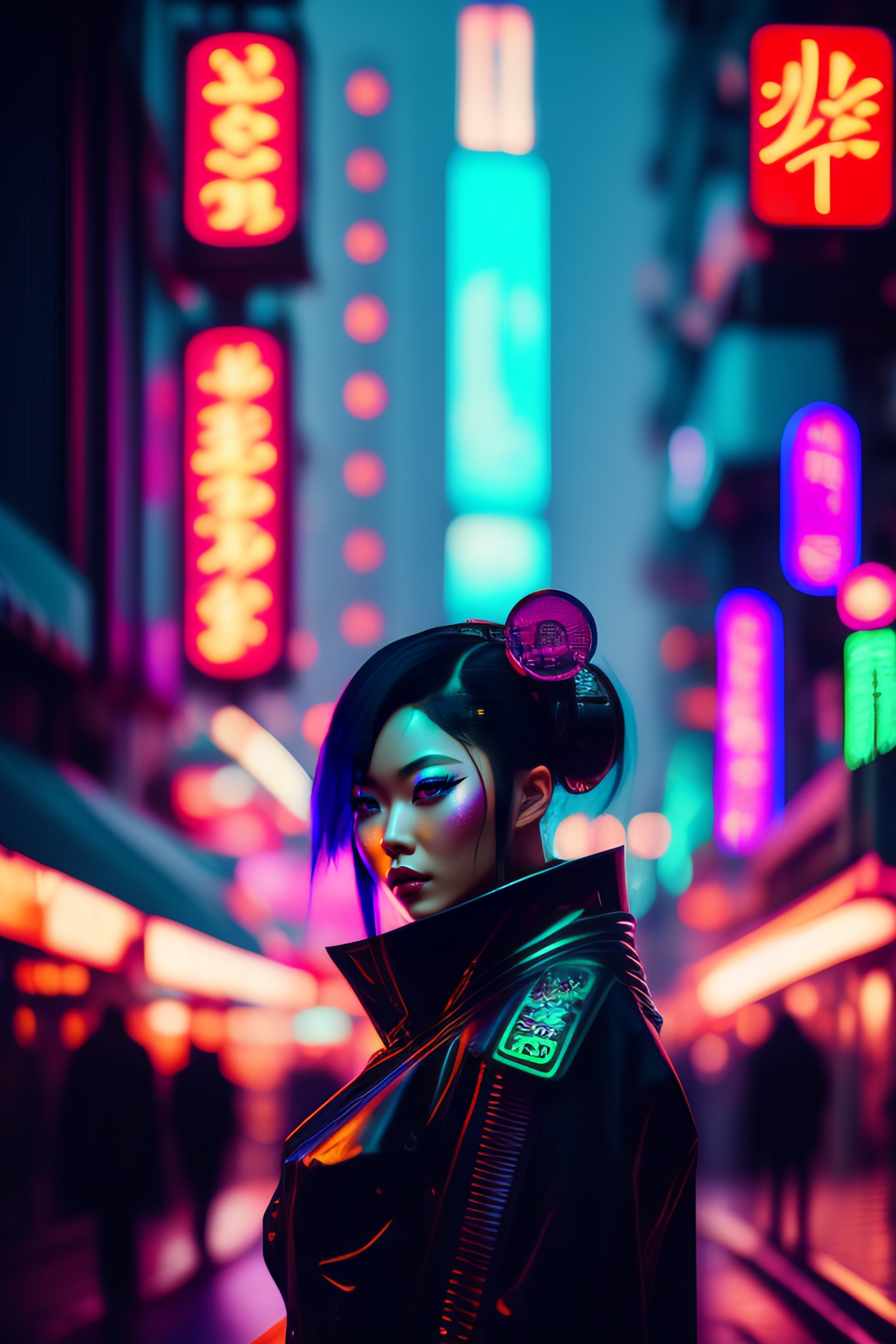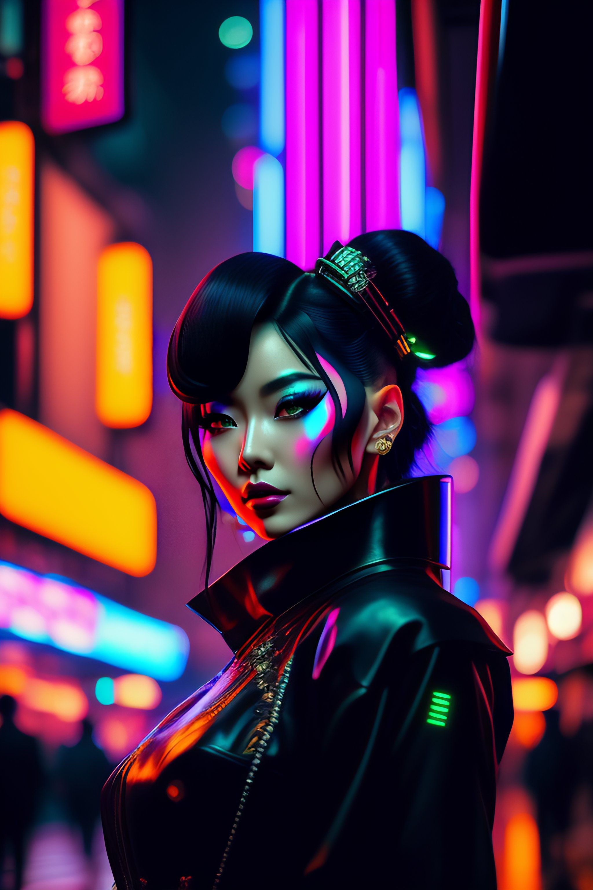 Cyber goth geisha in a tokyo street, pretty face, beautiful eyes, anime, portrait, dark aesthetic, neon sunset background, concept art, digital art, anime art, unreal engine, greg rutkowski, loish, rhads, beeple, makoto shinkai, haruyo morita and lois van baarle, ilya kuvshinov, stylized cyberpunk black tokyo market, indoor in the style of blade runner, stands illuminated by greens neon lights, crowded with cyborgs photorealistic background, 3 5 mm, grainy ruined film, dark color scheme, ray tracing, unreal engine, 4 k long shot