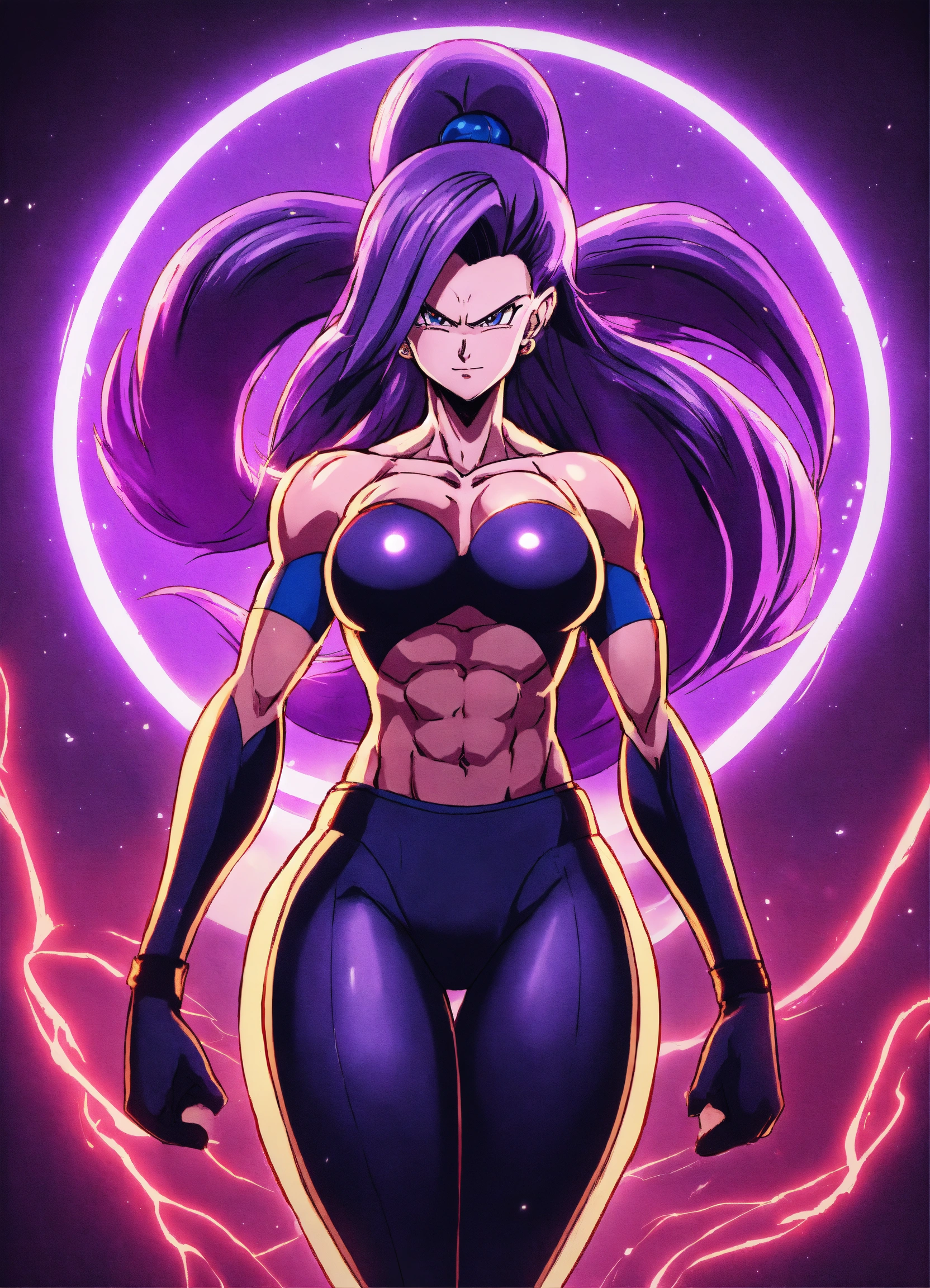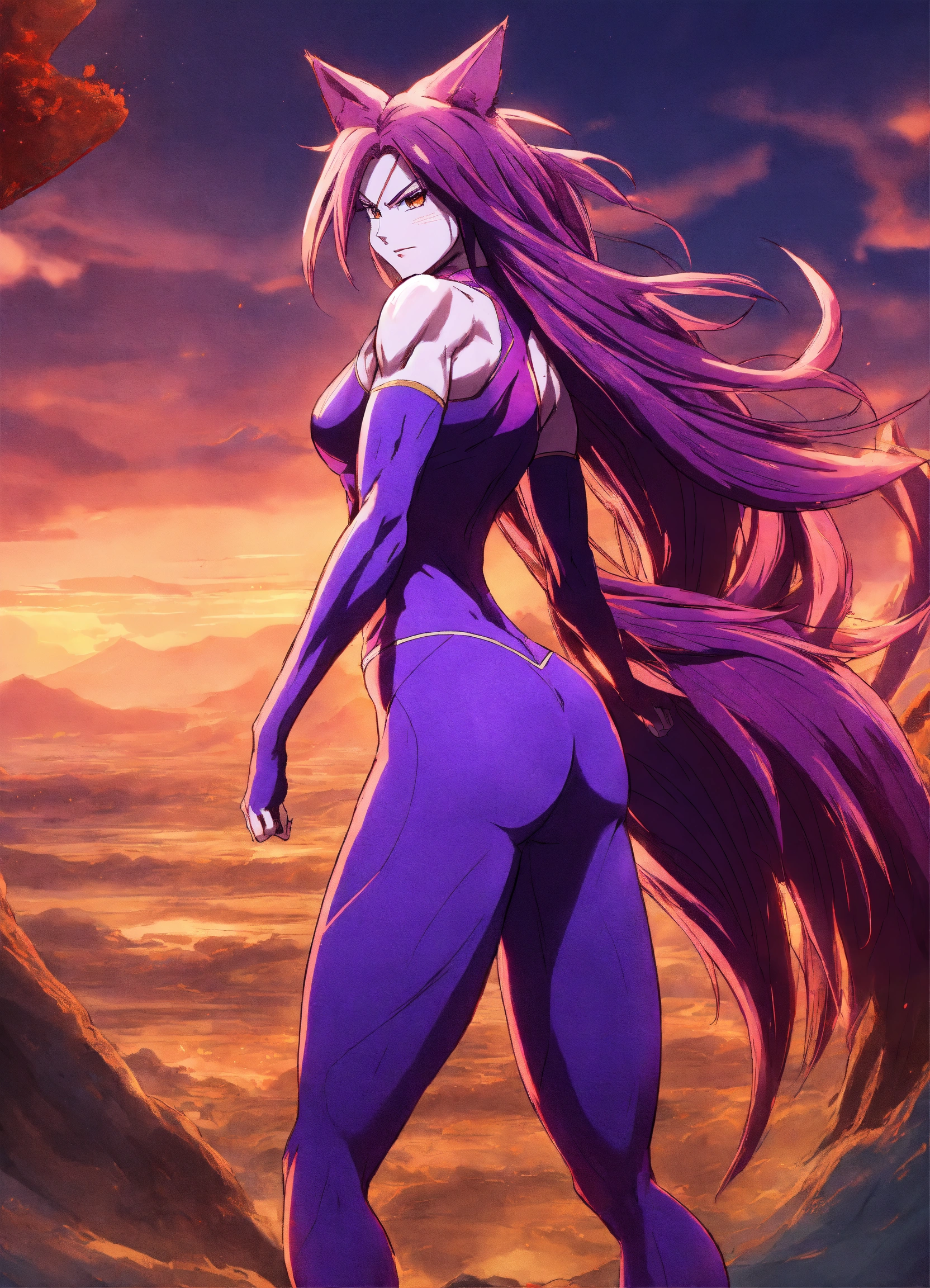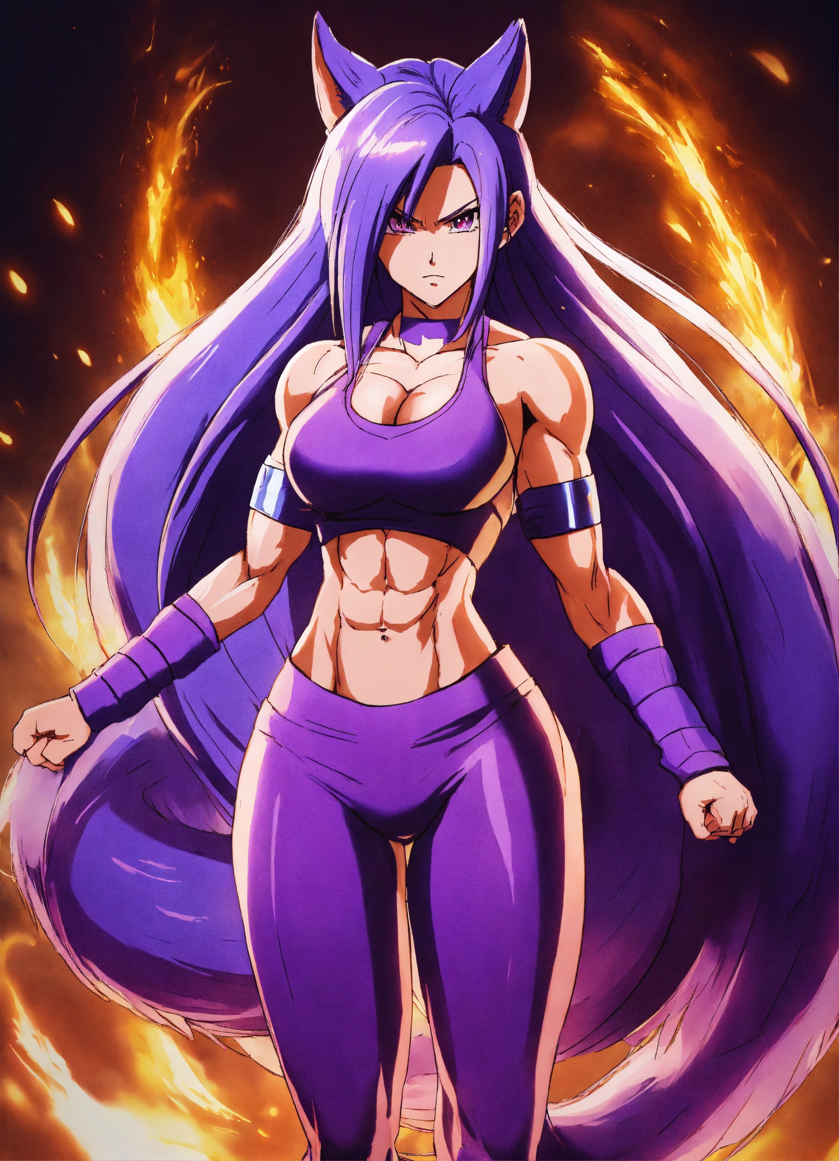Muscular purple slender with long hair and a big dog tail powerful female happy yet strong with aura of power surrounding 8k hi-res in a dragonball super anime style full body big wolf tail