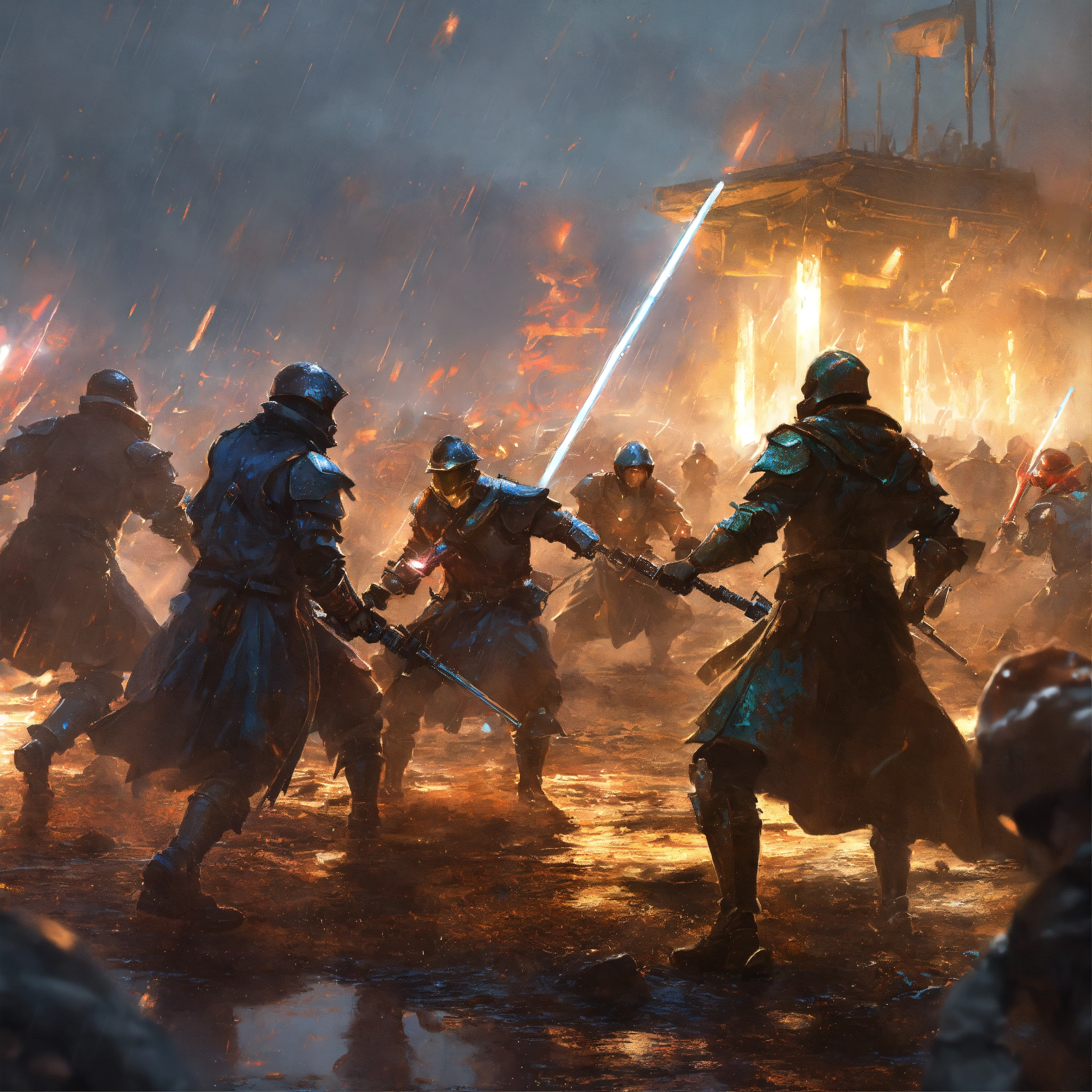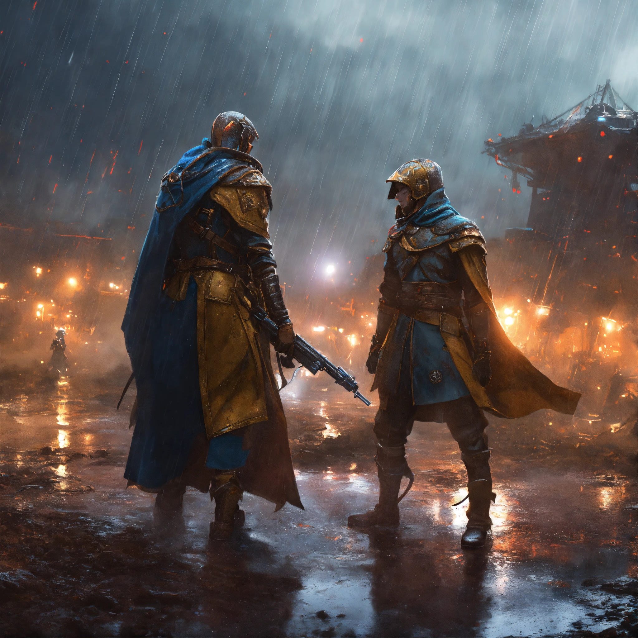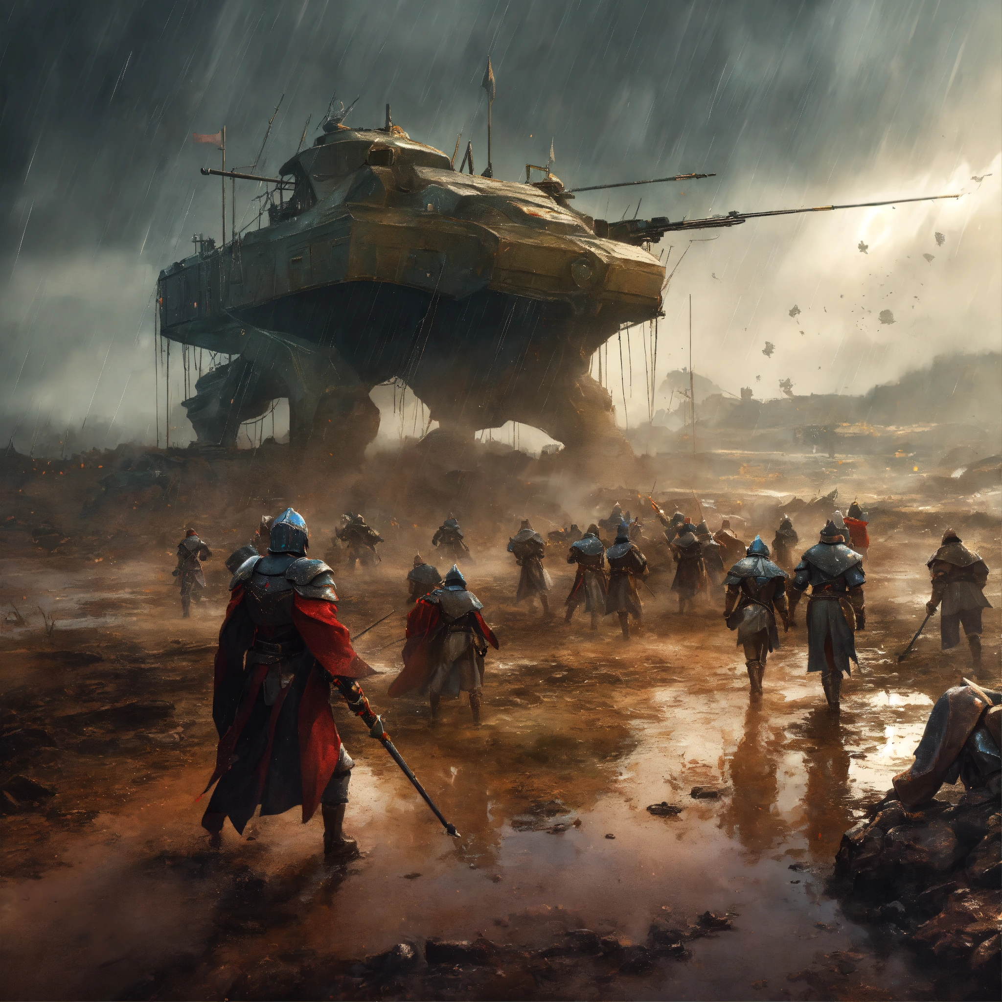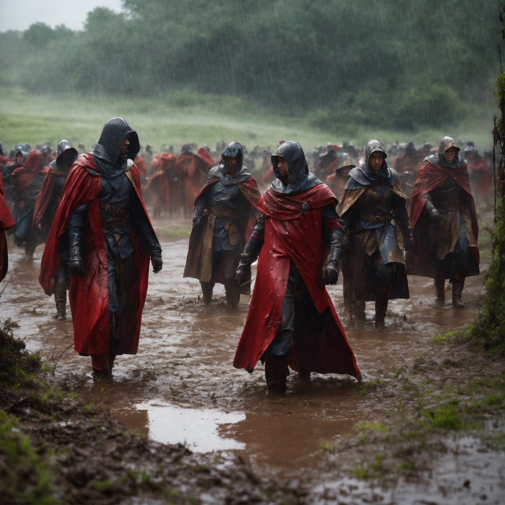 Muddy battlefield in the rain where young futuristic nobles in robes fight each other
