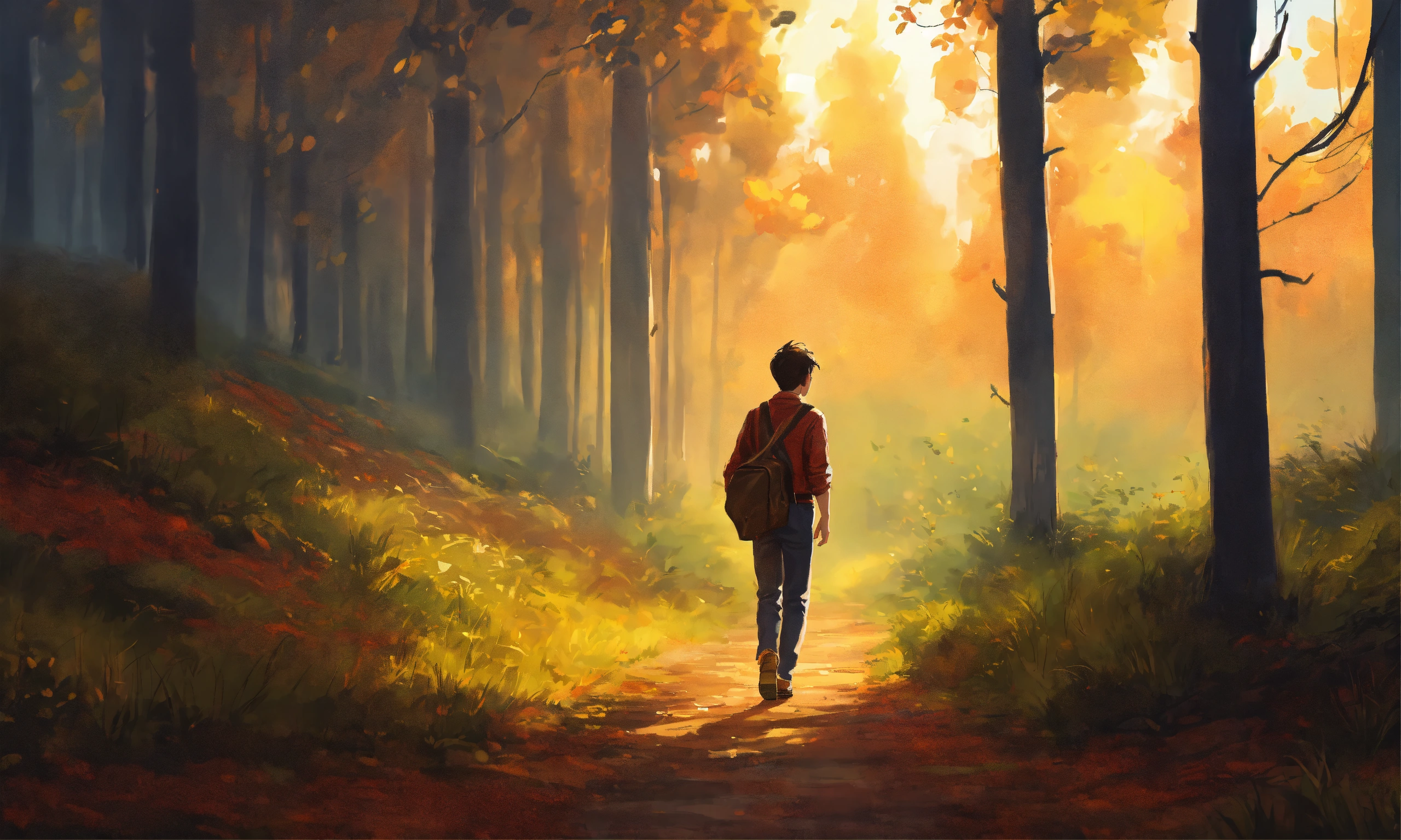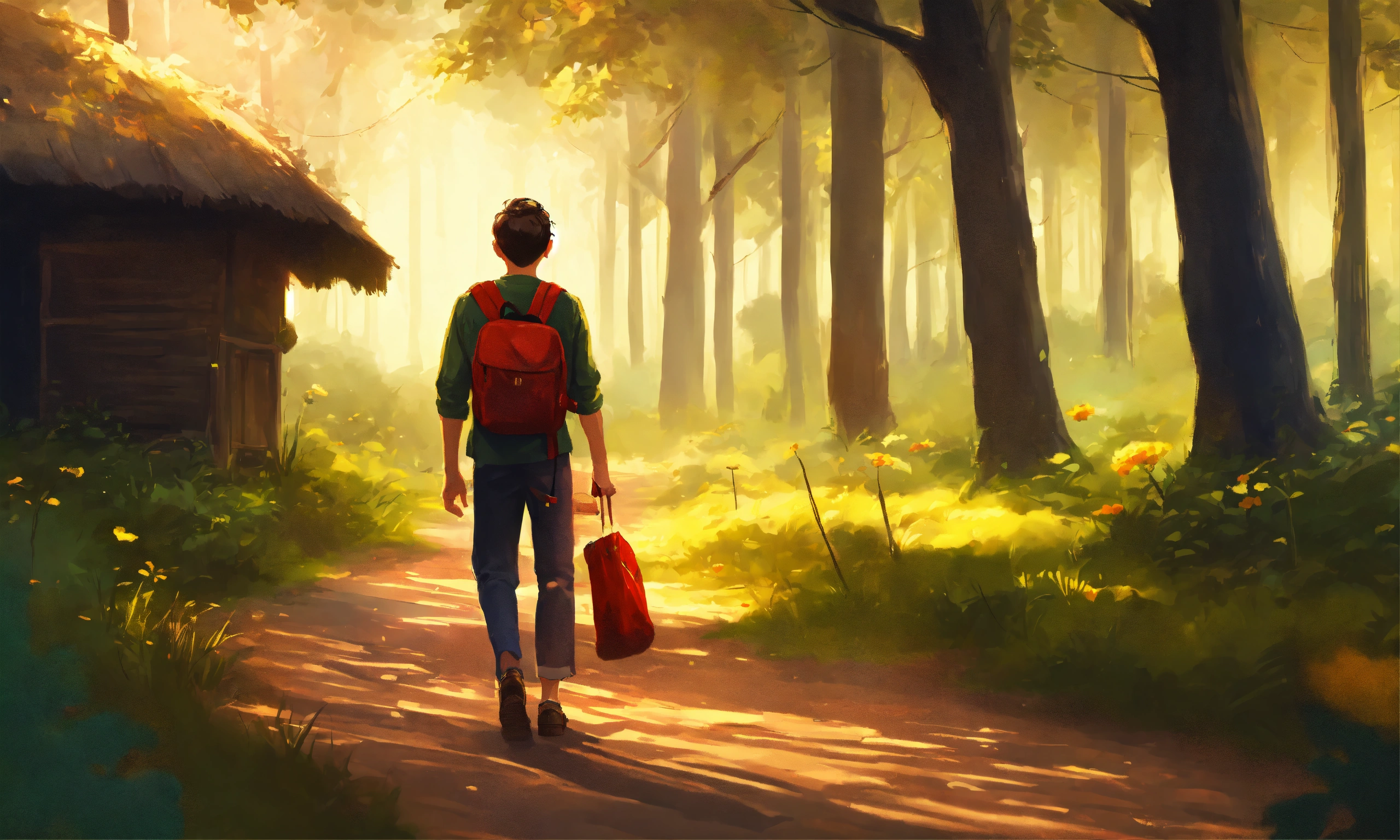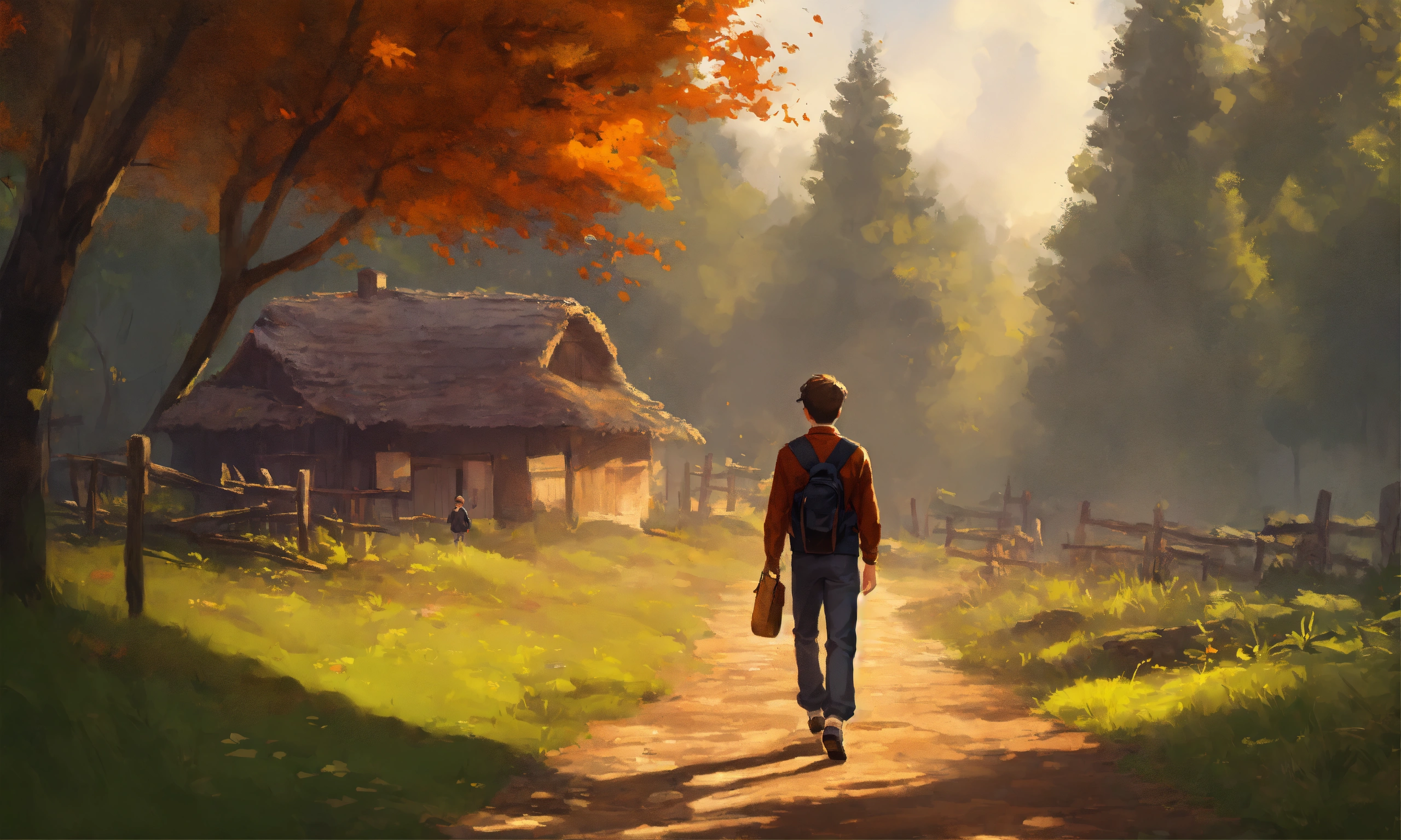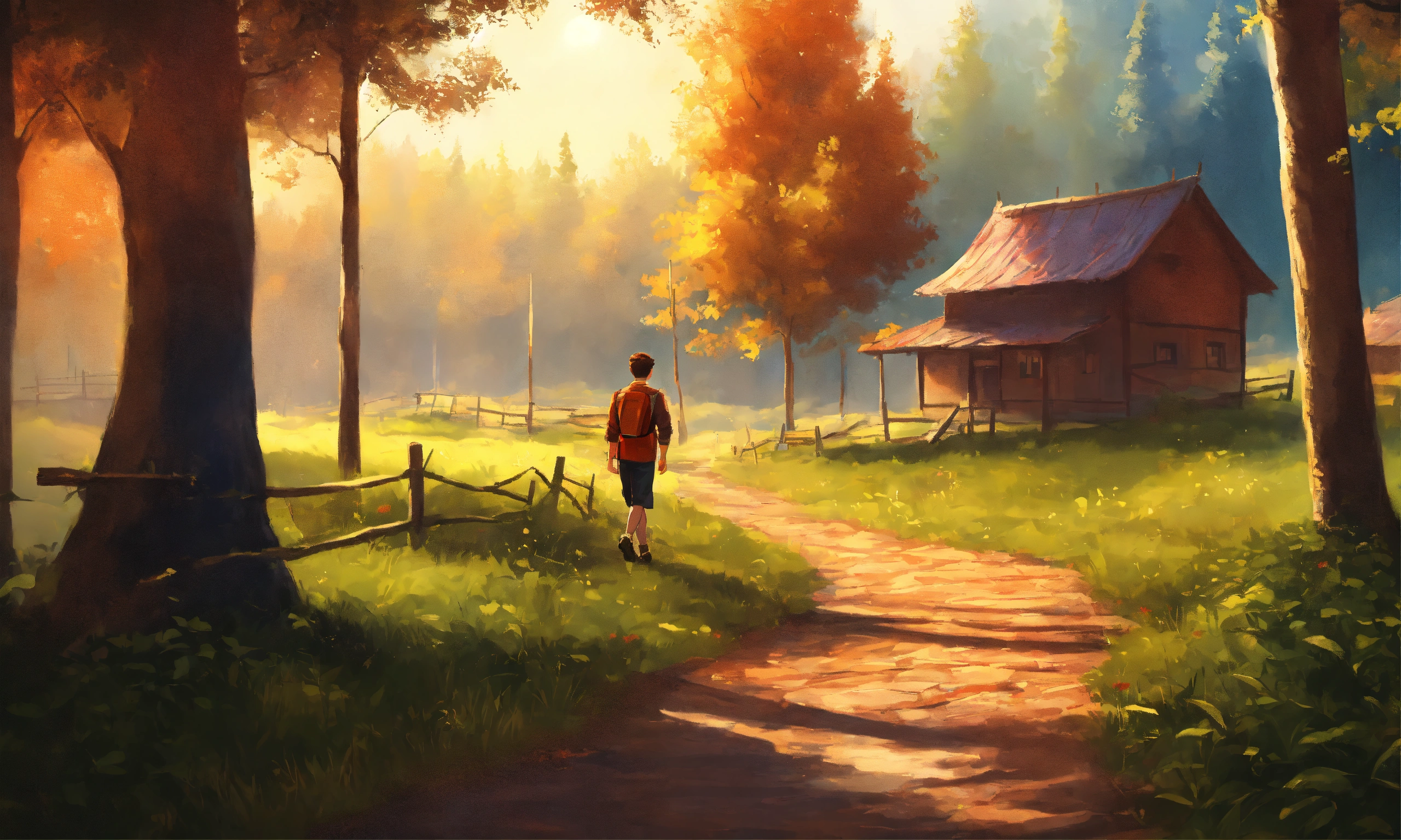 A young man walking in a village in forest in the style of illustrator donald zolan