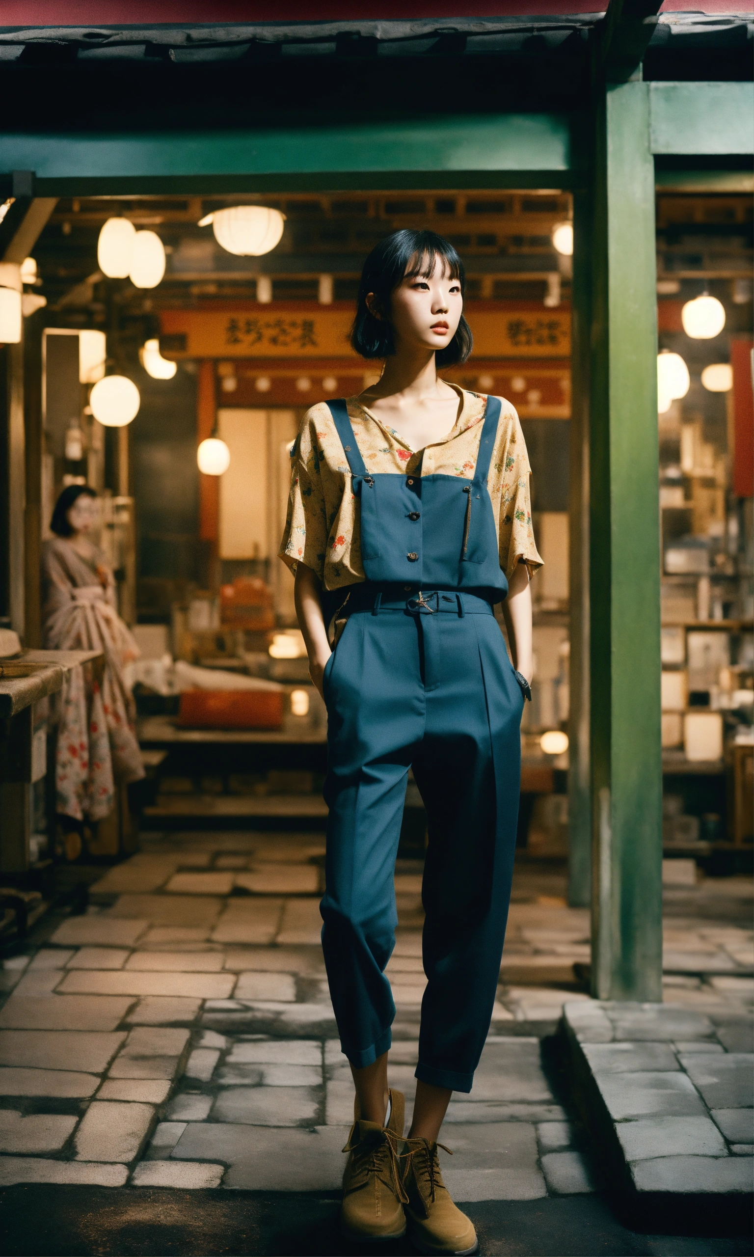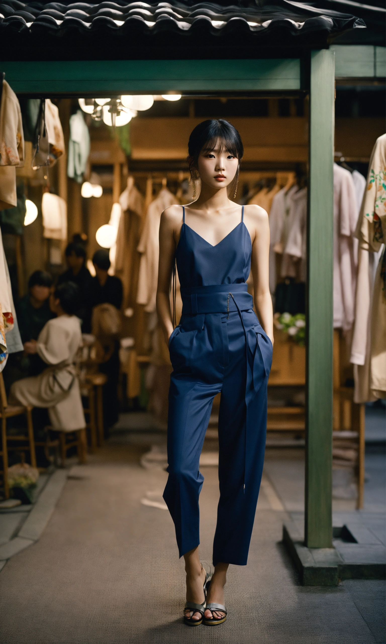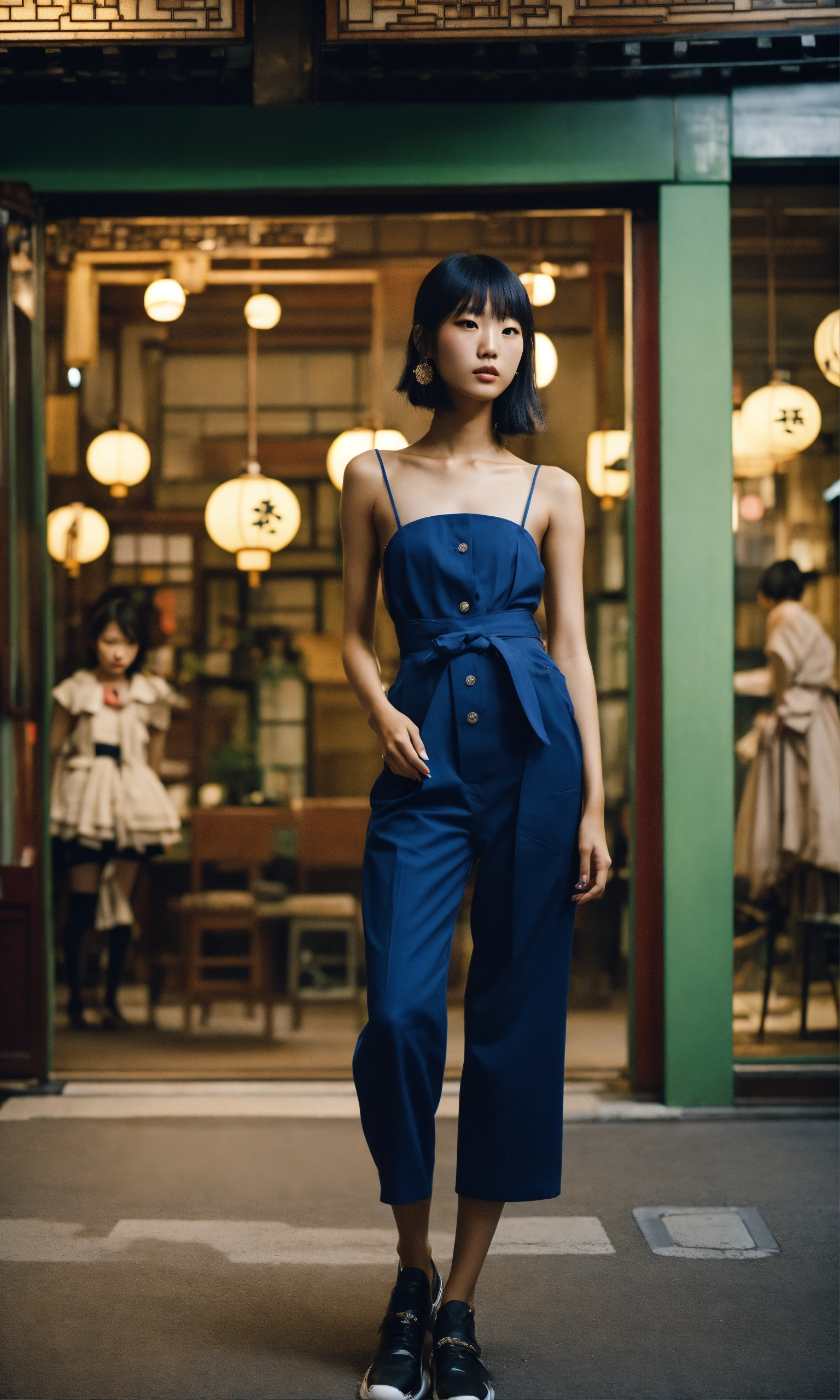 A hyper-realistic film-grained photo of a japanese fashion model in longere, wide-angle shots, modern lighting, 256k, no text.